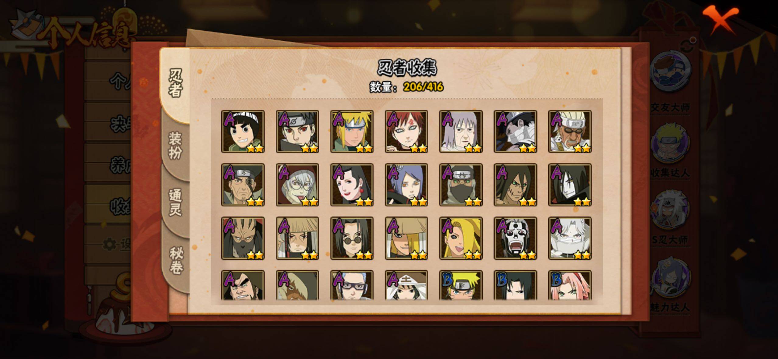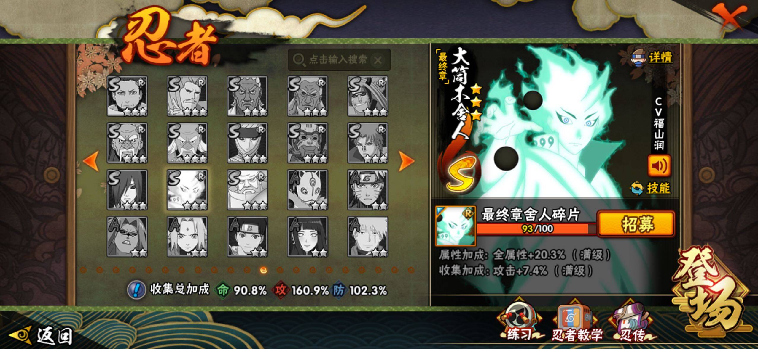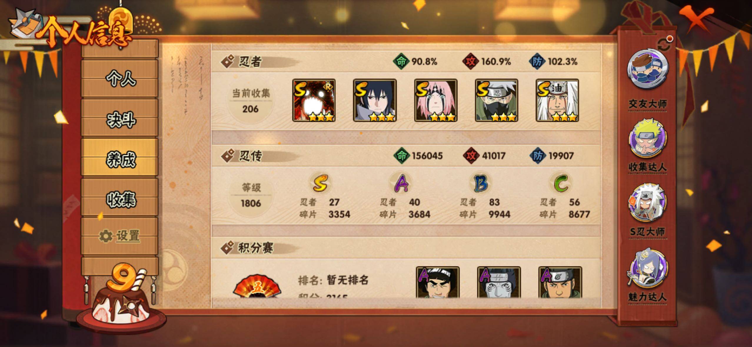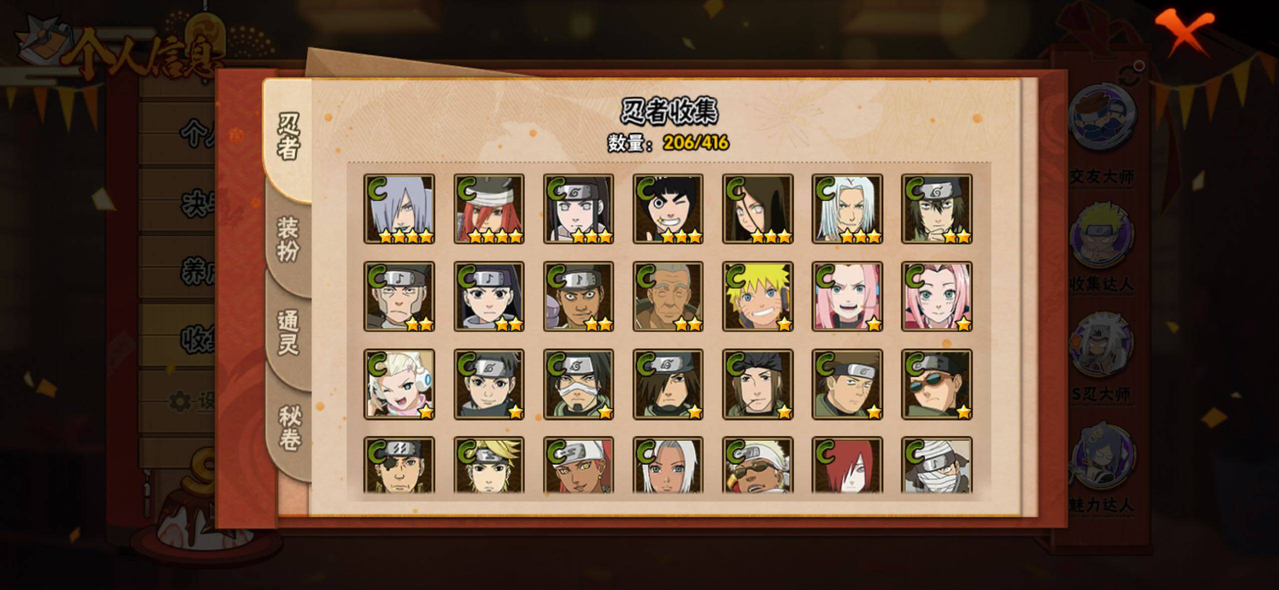 [14371385]v11 27s 40a 1366w战力 死门凯53片 罗砂72片 三代目雷影65片 最终章舍人93片 两个主场景:博人传 木叶周年庆 3307金币 yy1563 【s级忍者】:猿飞日斩「秽土转生」3星,千手扉间「秽土转生」3星,千手柱间「秽土转生」3星,宇智波鼬「秽土转生」3星,宇智波斑「秽土转生」3星,宇智波斑「秽土转生·解」3星,春野樱「忍界大战」3星,宇智波带土「忍界大战」3星,艾「忍界大战」3星,宇智波鼬「须佐能乎」3星,宇智波止水「须佐能乎」3星,旗木卡卡西「须佐能乎」3星,千手柱间「木叶创立」3星,自来也3星,自来也「舞之豪杰」3星,大蛇丸3星,自来也「传说中的三忍」3星,纲手3星,猿飞日斩3星,波风水门3星,药师兜「仙人模式」3星,佩恩「天道」3星,宇智波佐助「永恒万花筒」3星,宇智波斑 「白面具」3星宇智波斑「白面具」,大筒木桃式3星,漩涡鸣人「暴怒·第六尾」3星,波风水门「九喇嘛连结」3星 【a级忍者】:波风水门「青年」2星,达鲁伊「博人传」2星,迪达拉2星,迪达拉「秽土转生」2星,大蛇丸「晓」2星,奇拉比「忍界大战」2星,飞段3星,飞段「死司凭血」2星,干柿鬼鲛5星,漩涡博人「桃式显现」3星,漩涡鸣人「九尾查克拉」2星,机械鸣人「初始形态」2星,迈特凯5星,桃地再不斩「秽土转生」2星,我爱罗「疾风传」4星,我爱罗「忍界大战」2星,蝎4星,蝎「绯流琥」2星,小南2星,角都「地怨虞」2星,角都「秽土转生」2星,猿飞阿斯玛5星,宇智波止水2星,宇智波鼬2星,宇智波鼬「新春限定」2星,宇智波佐助「须佐能乎」2星,宇智波佐助「万花筒写轮眼」2星,宇智波佐助「侠隐江湖」2星,药师兜「半蛇斗篷」2星,日向宁次「忍界大战」2星,长十郎「六代目水影」2星,卑留呼「火之意志继承者」2星,李洛克「忍界大战」2星,黑土「博人传」2星,秋道丁次「忍界大战」2星,千代「近松十人卫」2星,神农「羁绊」2星,土台「忍界大战」2星,不缘2星,宇智波泉奈2星