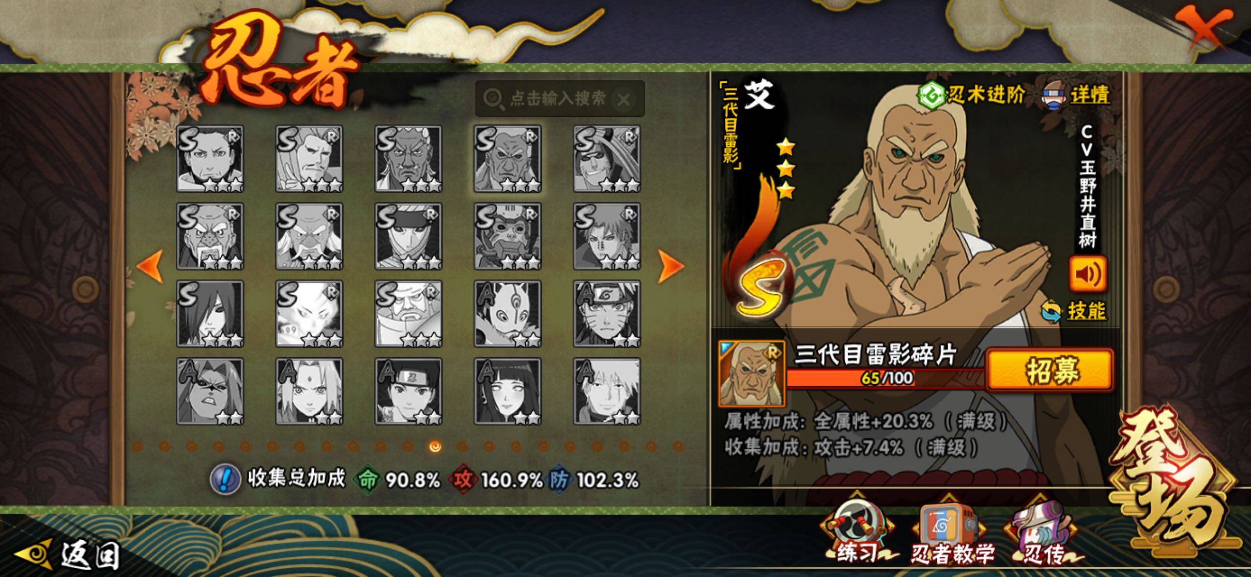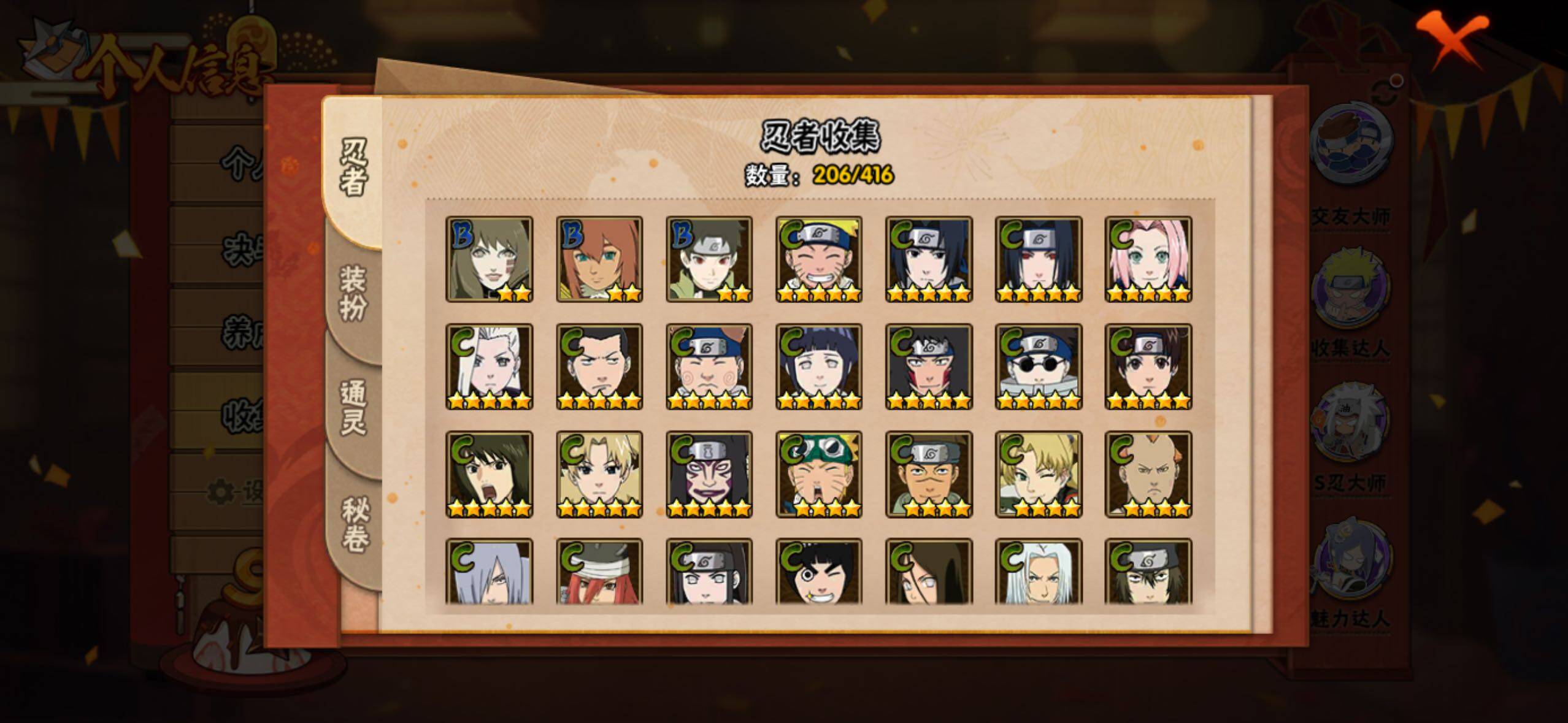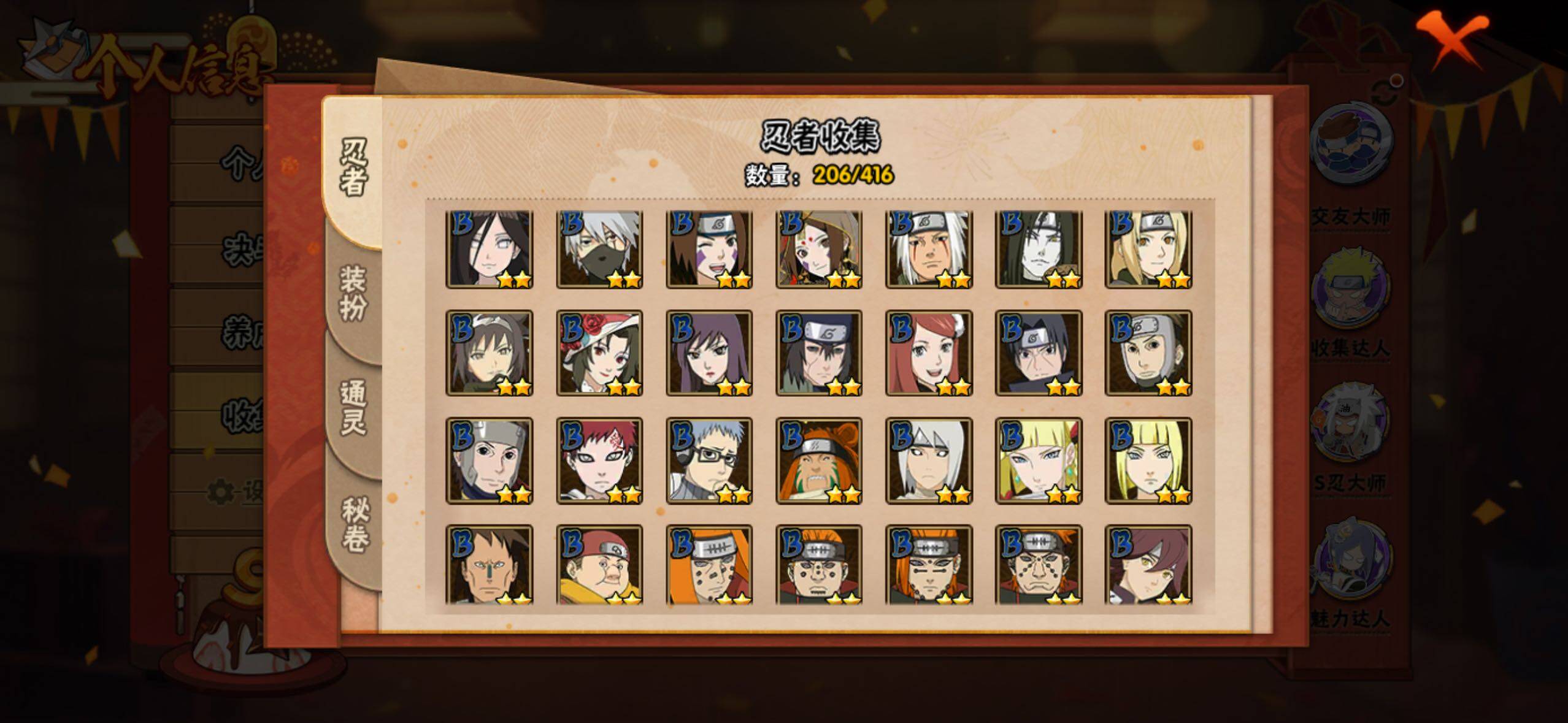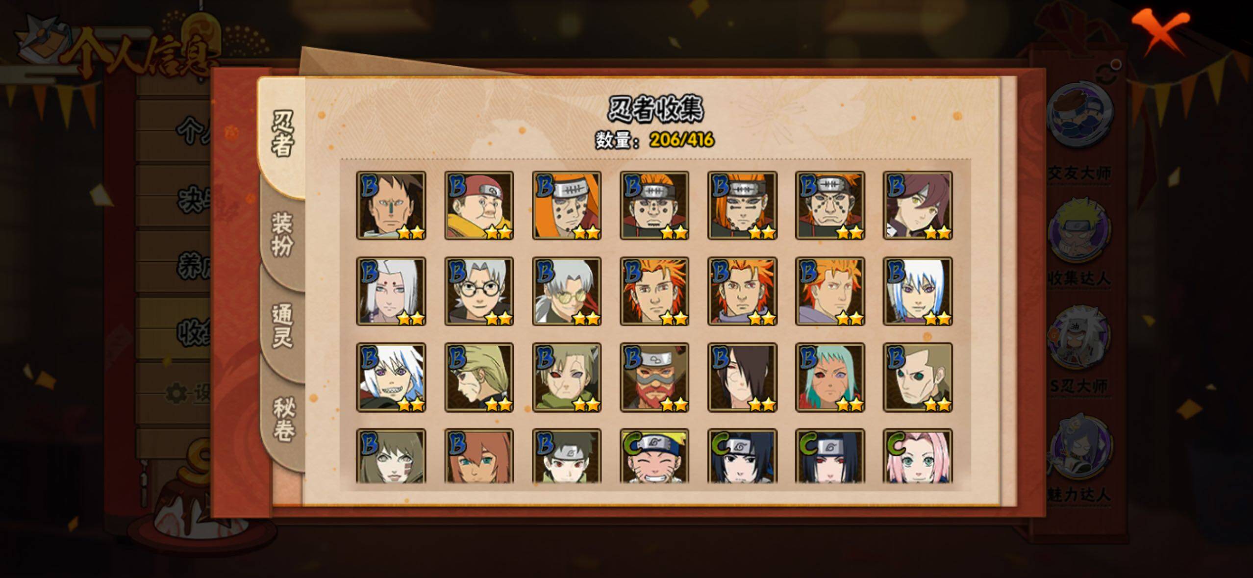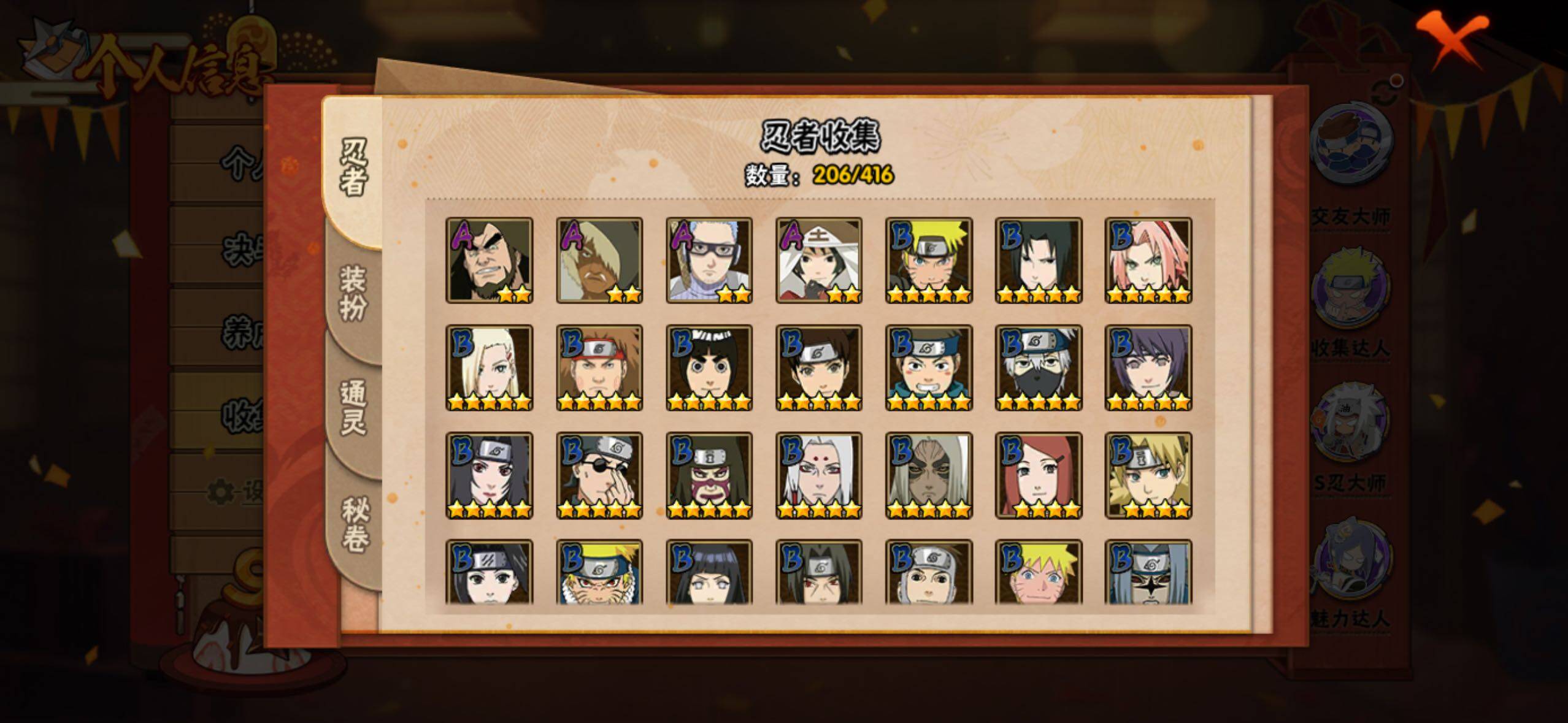 [14371385]v11 27s 40a 1366w战力 死门凯53片 罗砂72片 三代目雷影65片 最终章舍人93片 两个主场景:博人传 木叶周年庆 3307金币 yy1563 【s级忍者】:猿飞日斩「秽土转生」3星,千手扉间「秽土转生」3星,千手柱间「秽土转生」3星,宇智波鼬「秽土转生」3星,宇智波斑「秽土转生」3星,宇智波斑「秽土转生·解」3星,春野樱「忍界大战」3星,宇智波带土「忍界大战」3星,艾「忍界大战」3星,宇智波鼬「须佐能乎」3星,宇智波止水「须佐能乎」3星,旗木卡卡西「须佐能乎」3星,千手柱间「木叶创立」3星,自来也3星,自来也「舞之豪杰」3星,大蛇丸3星,自来也「传说中的三忍」3星,纲手3星,猿飞日斩3星,波风水门3星,药师兜「仙人模式」3星,佩恩「天道」3星,宇智波佐助「永恒万花筒」3星,宇智波斑 「白面具」3星宇智波斑「白面具」,大筒木桃式3星,漩涡鸣人「暴怒·第六尾」3星,波风水门「九喇嘛连结」3星 【a级忍者】:波风水门「青年」2星,达鲁伊「博人传」2星,迪达拉2星,迪达拉「秽土转生」2星,大蛇丸「晓」2星,奇拉比「忍界大战」2星,飞段3星,飞段「死司凭血」2星,干柿鬼鲛5星,漩涡博人「桃式显现」3星,漩涡鸣人「九尾查克拉」2星,机械鸣人「初始形态」2星,迈特凯5星,桃地再不斩「秽土转生」2星,我爱罗「疾风传」4星,我爱罗「忍界大战」2星,蝎4星,蝎「绯流琥」2星,小南2星,角都「地怨虞」2星,角都「秽土转生」2星,猿飞阿斯玛5星,宇智波止水2星,宇智波鼬2星,宇智波鼬「新春限定」2星,宇智波佐助「须佐能乎」2星,宇智波佐助「万花筒写轮眼」2星,宇智波佐助「侠隐江湖」2星,药师兜「半蛇斗篷」2星,日向宁次「忍界大战」2星,长十郎「六代目水影」2星,卑留呼「火之意志继承者」2星,李洛克「忍界大战」2星,黑土「博人传」2星,秋道丁次「忍界大战」2星,千代「近松十人卫」2星,神农「羁绊」2星,土台「忍界大战」2星,不缘2星,宇智波泉奈2星