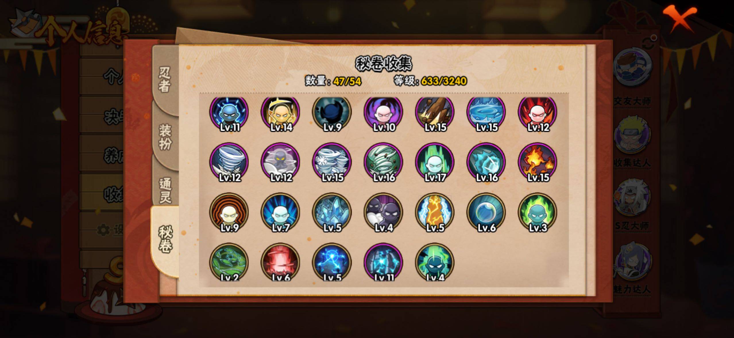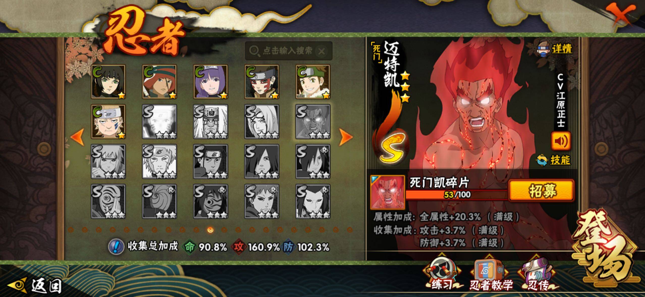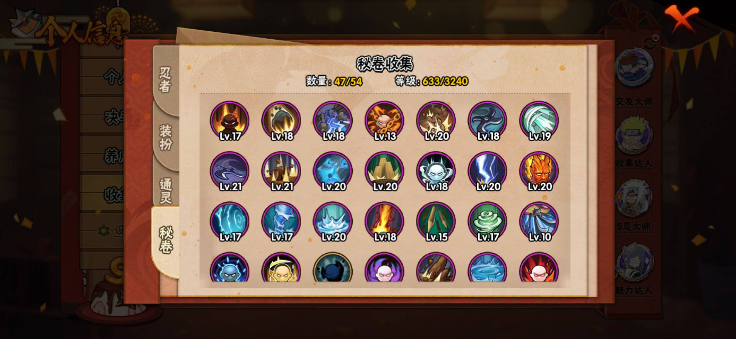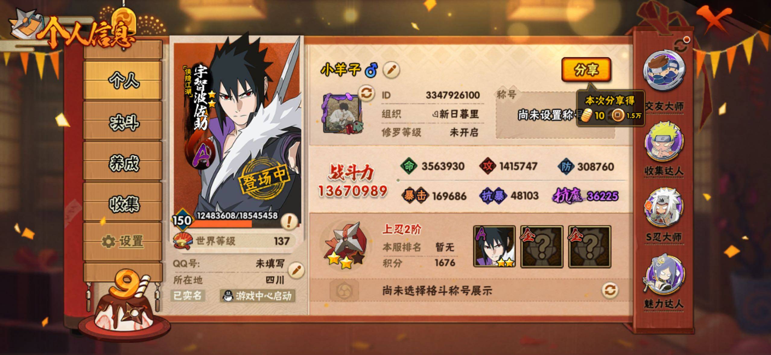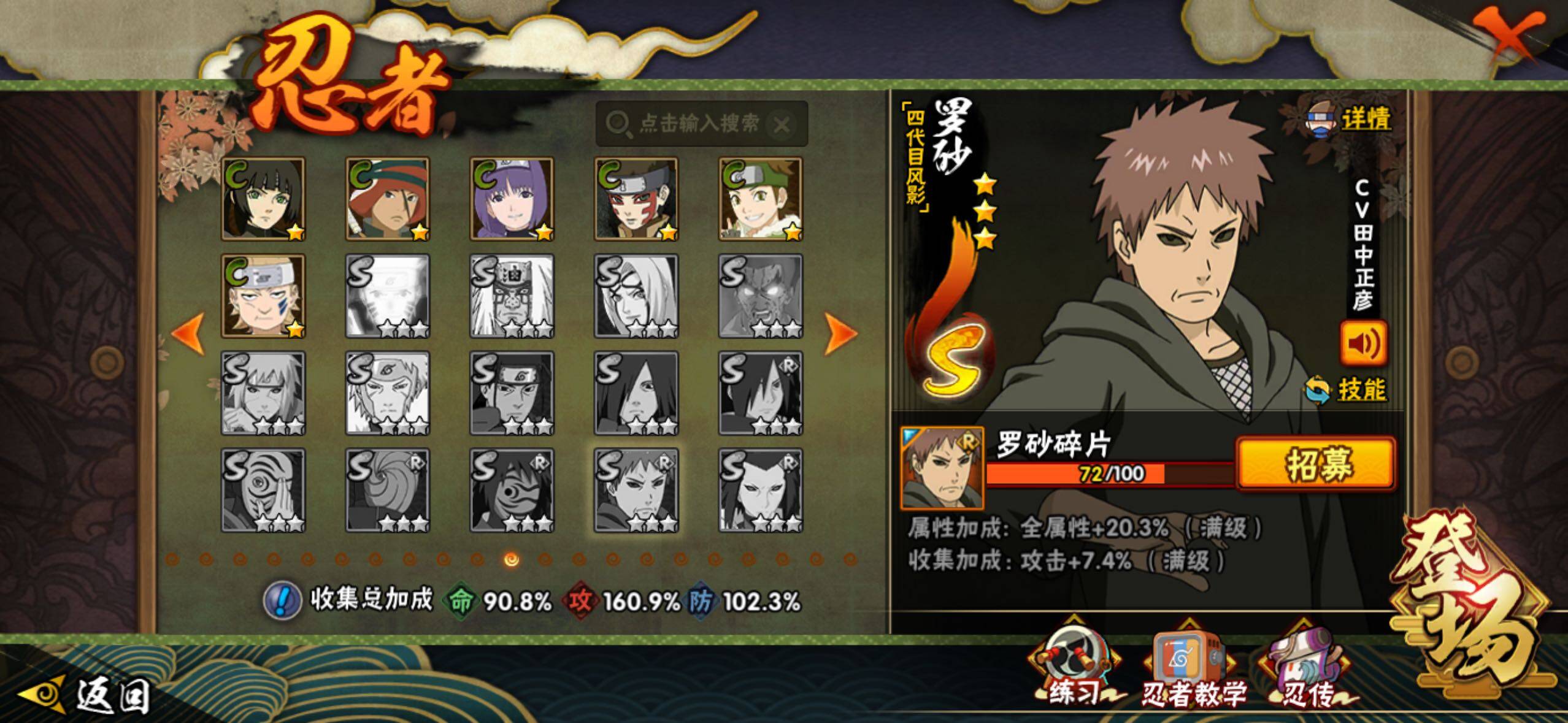[14371385]v11 27s 40a 1366w战力 死门凯53片 罗砂72片 三代目雷影65片 最终章舍人93片 两个主场景:博人传 木叶周年庆 3307金币 yy1563 【s级忍者】:猿飞日斩「秽土转生」3星,千手扉间「秽土转生」3星,千手柱间「秽土转生」3星,宇智波鼬「秽土转生」3星,宇智波斑「秽土转生」3星,宇智波斑「秽土转生·解」3星,春野樱「忍界大战」3星,宇智波带土「忍界大战」3星,艾「忍界大战」3星,宇智波鼬「须佐能乎」3星,宇智波止水「须佐能乎」3星,旗木卡卡西「须佐能乎」3星,千手柱间「木叶创立」3星,自来也3星,自来也「舞之豪杰」3星,大蛇丸3星,自来也「传说中的三忍」3星,纲手3星,猿飞日斩3星,波风水门3星,药师兜「仙人模式」3星,佩恩「天道」3星,宇智波佐助「永恒万花筒」3星,宇智波斑 「白面具」3星宇智波斑「白面具」,大筒木桃式3星,漩涡鸣人「暴怒·第六尾」3星,波风水门「九喇嘛连结」3星 【a级忍者】:波风水门「青年」2星,达鲁伊「博人传」2星,迪达拉2星,迪达拉「秽土转生」2星,大蛇丸「晓」2星,奇拉比「忍界大战」2星,飞段3星,飞段「死司凭血」2星,干柿鬼鲛5星,漩涡博人「桃式显现」3星,漩涡鸣人「九尾查克拉」2星,机械鸣人「初始形态」2星,迈特凯5星,桃地再不斩「秽土转生」2星,我爱罗「疾风传」4星,我爱罗「忍界大战」2星,蝎4星,蝎「绯流琥」2星,小南2星,角都「地怨虞」2星,角都「秽土转生」2星,猿飞阿斯玛5星,宇智波止水2星,宇智波鼬2星,宇智波鼬「新春限定」2星,宇智波佐助「须佐能乎」2星,宇智波佐助「万花筒写轮眼」2星,宇智波佐助「侠隐江湖」2星,药师兜「半蛇斗篷」2星,日向宁次「忍界大战」2星,长十郎「六代目水影」2星,卑留呼「火之意志继承者」2星,李洛克「忍界大战」2星,黑土「博人传」2星,秋道丁次「忍界大战」2星,千代「近松十人卫」2星,神农「羁绊」2星,土台「忍界大战」2星,不缘2星,宇智波泉奈2星