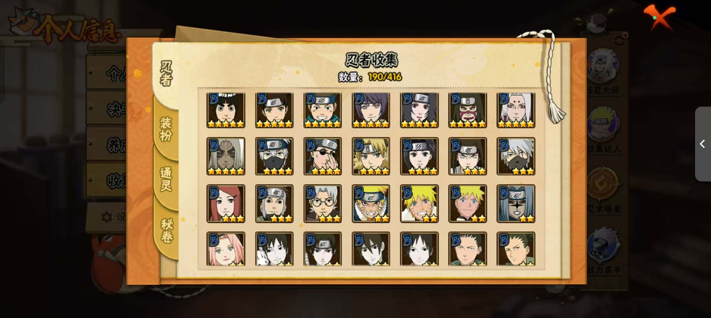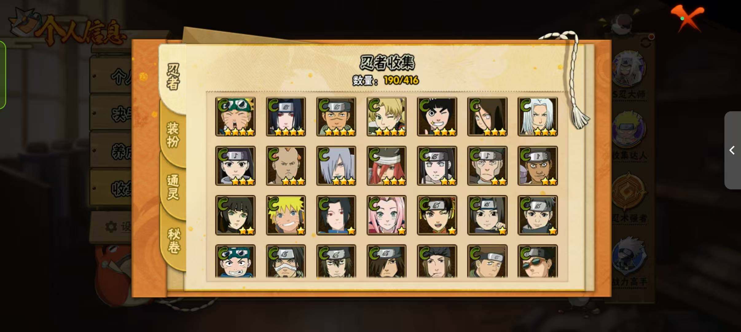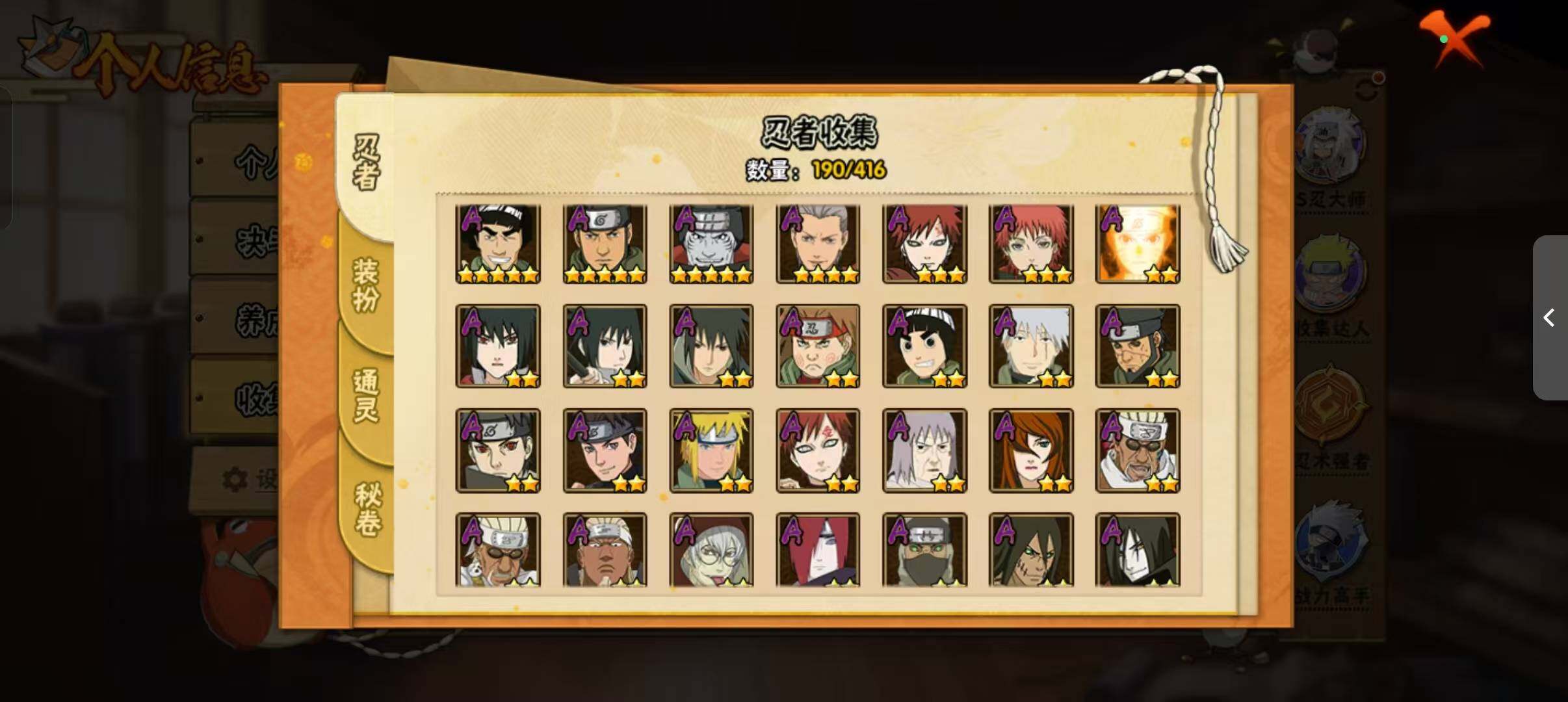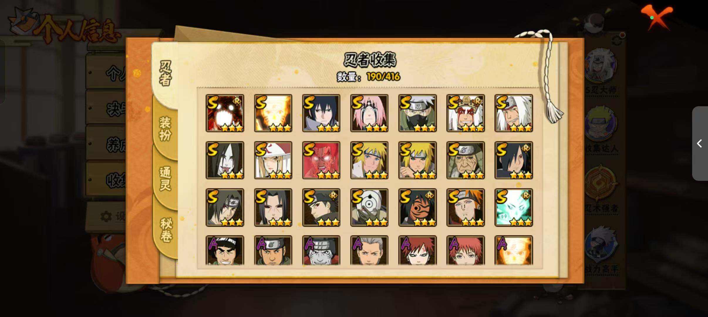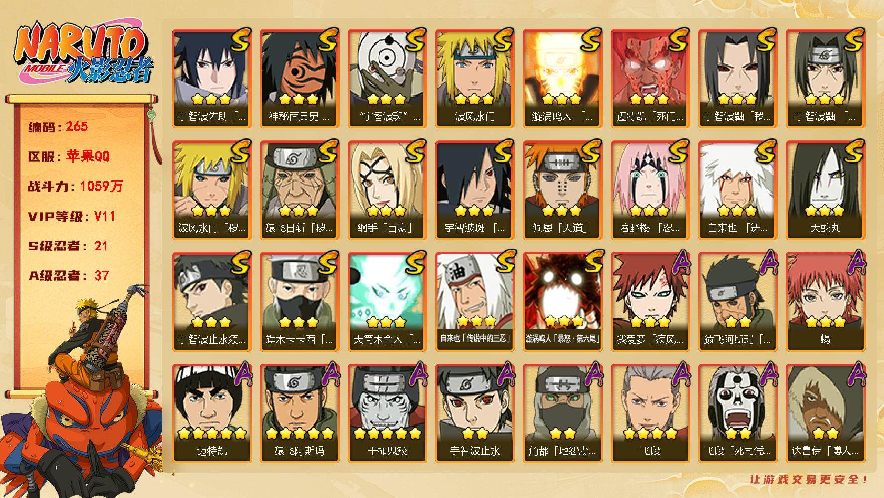 [14372512]v11 1059万战力 21s-37a tt1509 【s级忍者】:猿飞日斩「秽土转生」3星,波风水门「秽土转生」3星,宇智波鼬「秽土转生」3星,春野樱「忍界大战」3星,宇智波鼬「须佐能乎」3星,宇智波止水「须佐能乎」3星,旗木卡卡西「须佐能乎」3星,宇智波斑「木叶创立」3星,自来也「舞之豪杰」3星,大蛇丸3星,自来也「传说中的三忍」3星,纲手「百豪」3星,波风水门3星,神秘面具男「红夜之刃」3星,漩涡鸣人「九喇嘛连结」3星,迈特凯「死门」3星,佩恩「天道」3星,宇智波佐助「永恒万花筒」3星,宇智波斑 「白面具」3星宇智波斑「白面具」,大筒木舍人「最终章」3星,漩涡鸣人「暴怒·第六尾」3星 【a级忍者】:艾「青年」2星,长门「青年」2星,波风水门「青年」2星,达鲁伊「博人传」2星,迪达拉「秽土转生」2星,大蛇丸「晓」2星,奇拉比2星,奇拉比「忍界大战」2星,飞段4星,飞段「死司凭血」2星,干柿鬼鲛5星,漩涡鸣人「九尾查克拉」2星,迈特凯5星,旗木卡卡西「幻之真容」2星,我爱罗「疾风传」3星,我爱罗「忍界大战」2星,蝎3星,蝎「绯流琥」2星,角都「地怨虞」2星,角都「秽土转生」2星,猿飞阿斯玛5星,猿飞阿斯玛「秽土转生」2星,宇智波止水2星,猿飞日斩「火影继承人」2星,宇智波鼬2星,宇智波佐助「须佐能乎」2星,宇智波佐助「万花筒写轮眼」2星,药师兜「半蛇斗篷」2星,照美冥「五代目水影」2星,长十郎「六代目水影」2星,李洛克「忍界大战」2星,猿飞木叶丸「博人传」2星,黑土「博人传」2星,秋道丁次「忍界大战」2星,千代「近松十人卫」2星,神农「羁绊」2星,宇智波泉奈2星