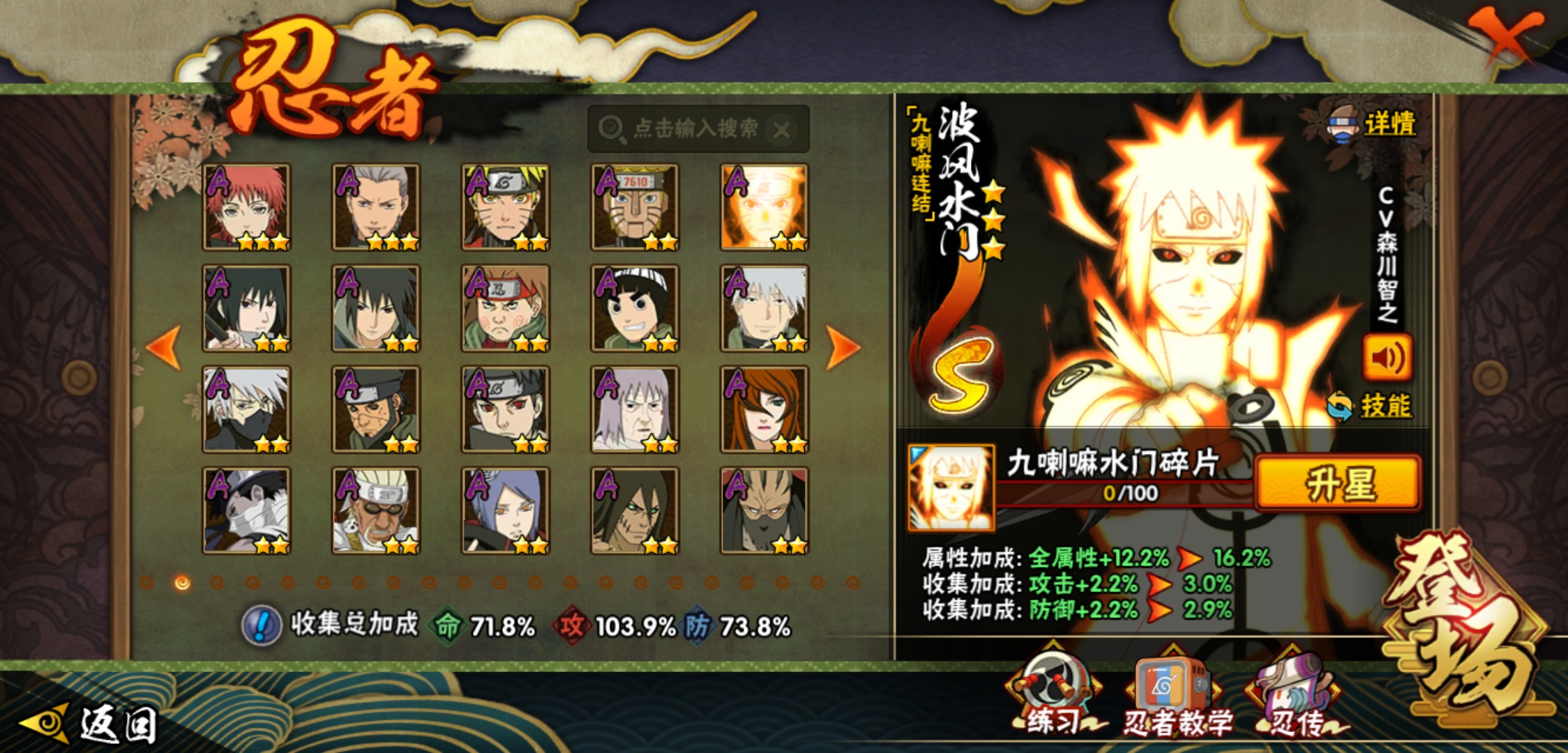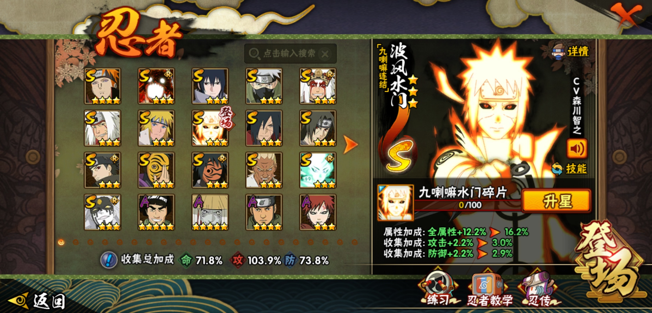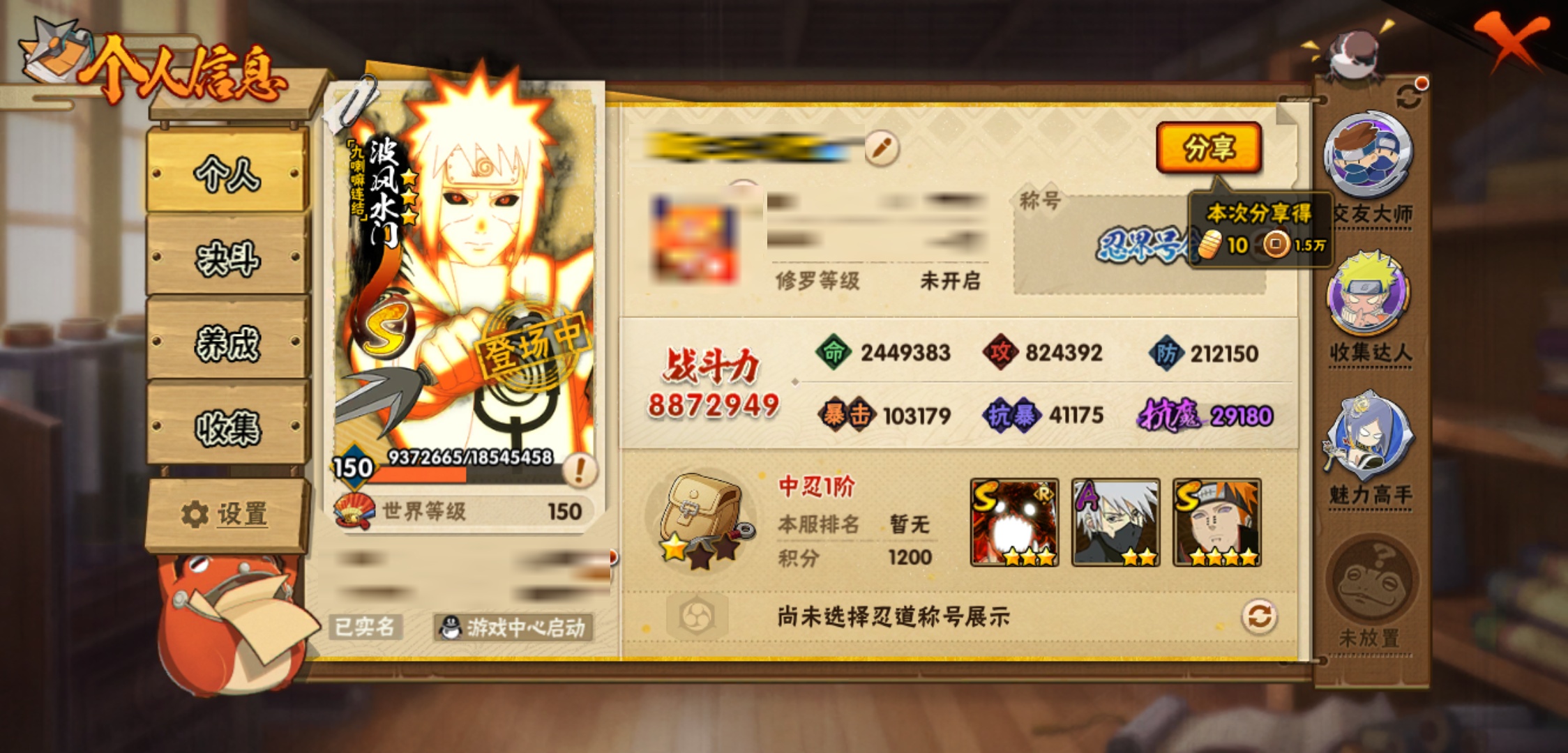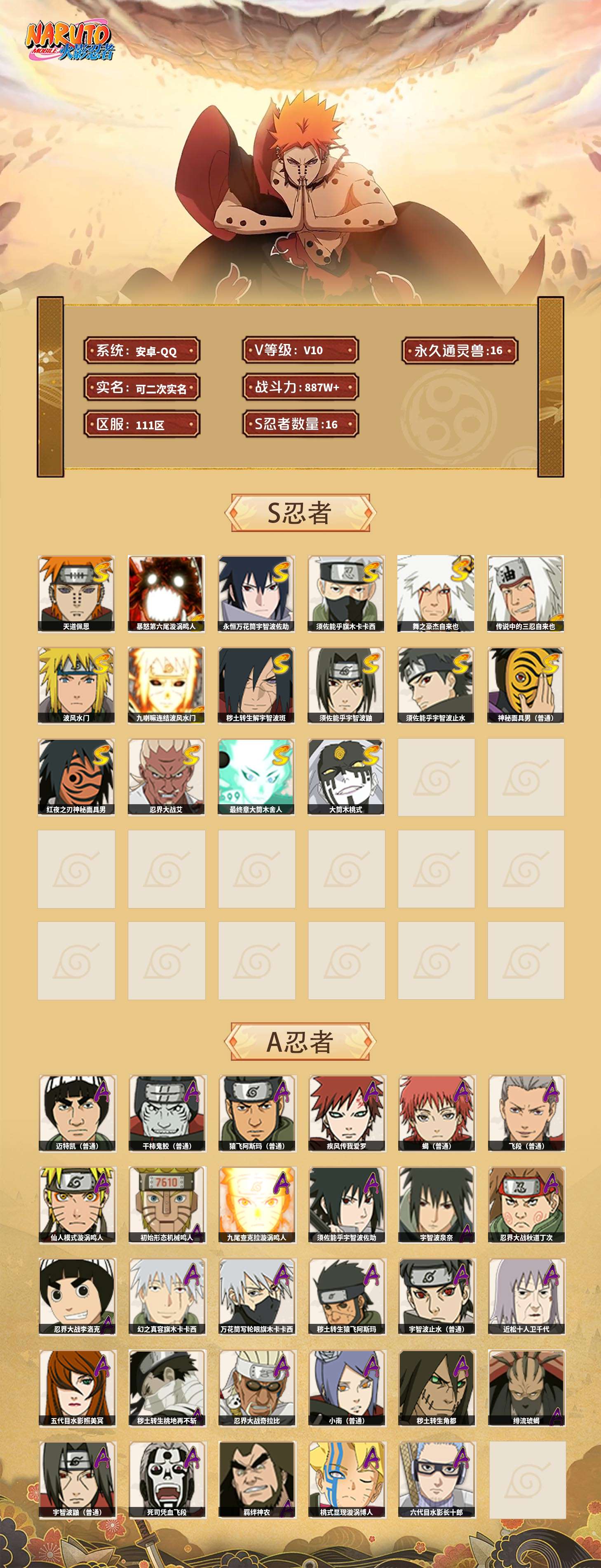 【火影忍者】【lyhy9017】战斗力:887w;段位:中忍1阶;本服排名:1359;vip:v10级;s忍:16个;a忍:29个;通灵兽:16个,s忍:天道佩恩 4星|暴怒第六尾漩涡鸣人|永恒万花筒宇智波佐助|须佐能乎旗木卡卡西|舞之豪杰自来也|传说中的三忍自来也|波风水门|九喇嘛连结波风水门|秽土转生解宇智波斑|须佐能乎宇智波鼬|须佐能乎宇智波止水|神秘面具男(普通)|红夜之刃神秘面具男|忍界大战艾|最终章大筒木舍人|大筒木桃式__a忍:迈特凯(普通) 5星|干柿鬼鲛(普通) 5星|猿飞阿斯玛(普通) 4星|疾风传我爱罗 3星|蝎(普通) 3星|飞段(普通) 3星|仙人模式漩涡鸣人|初始形态机械鸣人|九尾查克拉漩涡鸣人|须佐能乎宇智波佐助|宇智波泉奈|忍界大战秋道丁次|忍界大战李洛克|幻之真容旗木卡卡西|万花筒写轮眼旗木卡卡西|秽土转生猿飞阿斯玛|宇智波止水(普通)|近松十人卫千代|五代目水影照美冥|秽土转生桃地再不斩|忍界大战奇拉比|小南(普通)|秽土转生角都|绯流琥蝎|宇智波鼬(普通)|死司凭血飞段|羁绊神农|桃式显现漩涡博人|六代目水影长十郎__通灵兽:忍犬(普通)|蓝蛇|蛤蟆吉|忍龟|镰鼬|猿魔|山椒鱼|蜃|砂之守鹤|蛤蟆仙人|鲛鲨|蛤蟆健|乌鸦(普通)|蛞蝓(普通)|蛤蟆龙|蛤蟆广