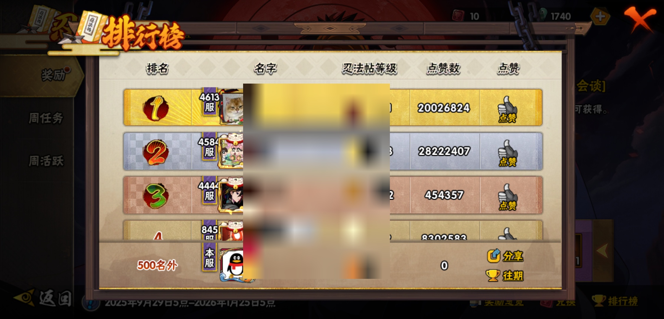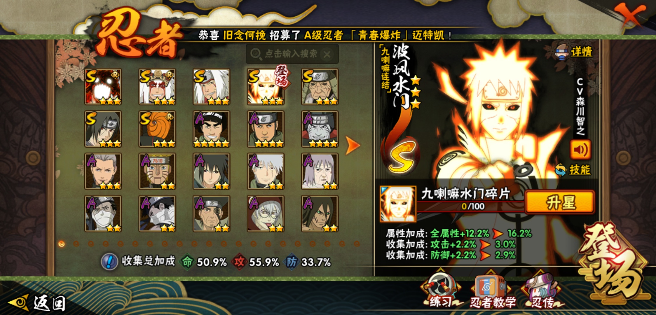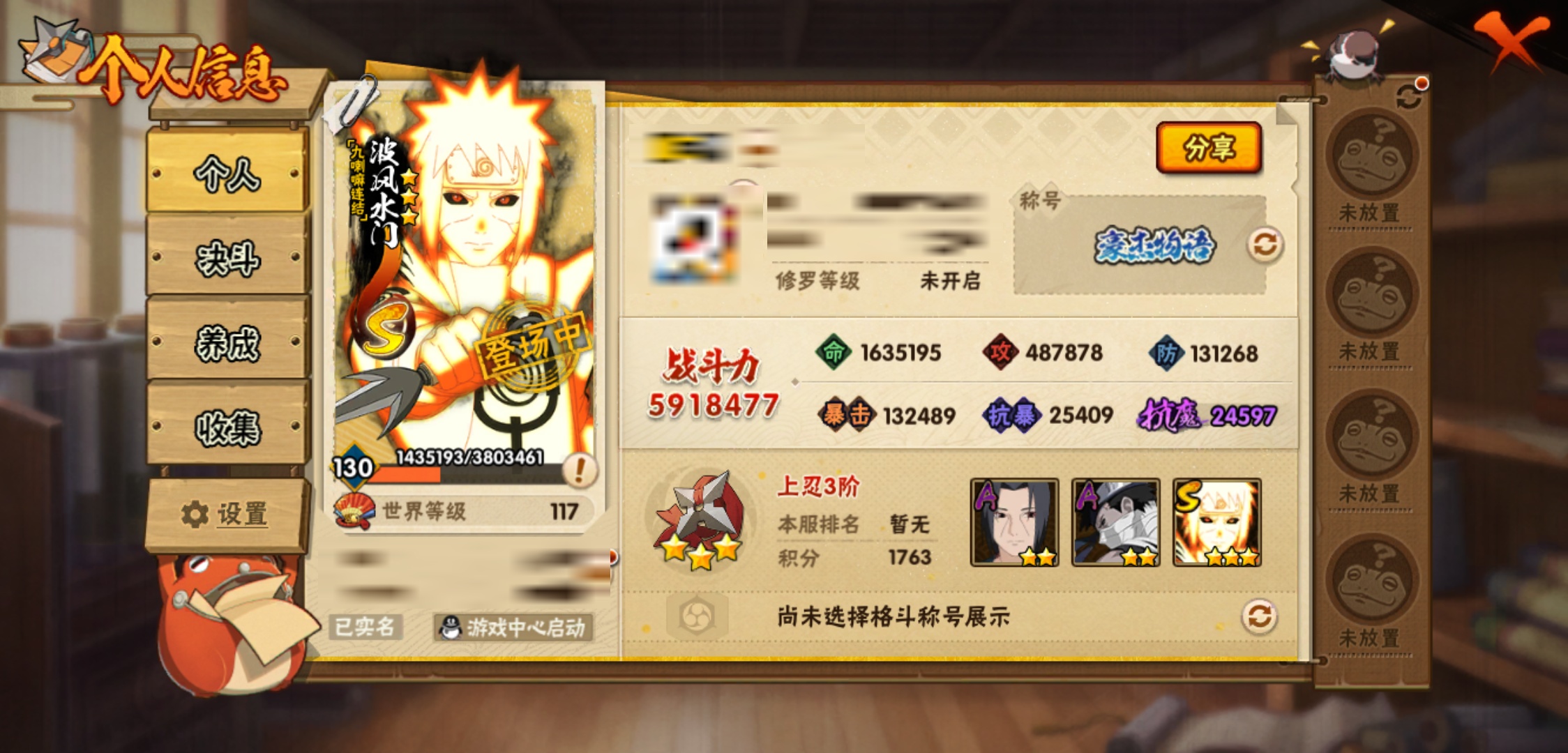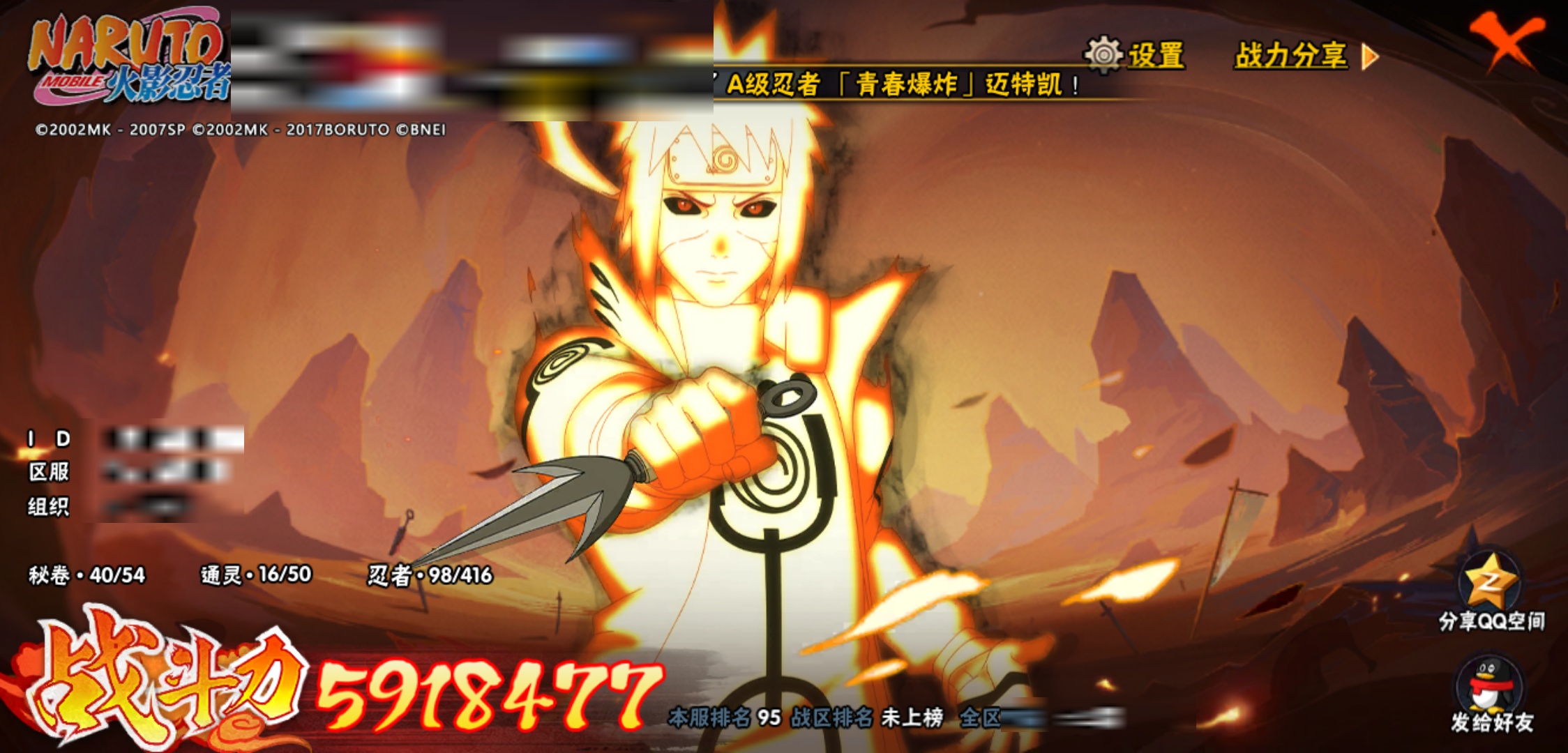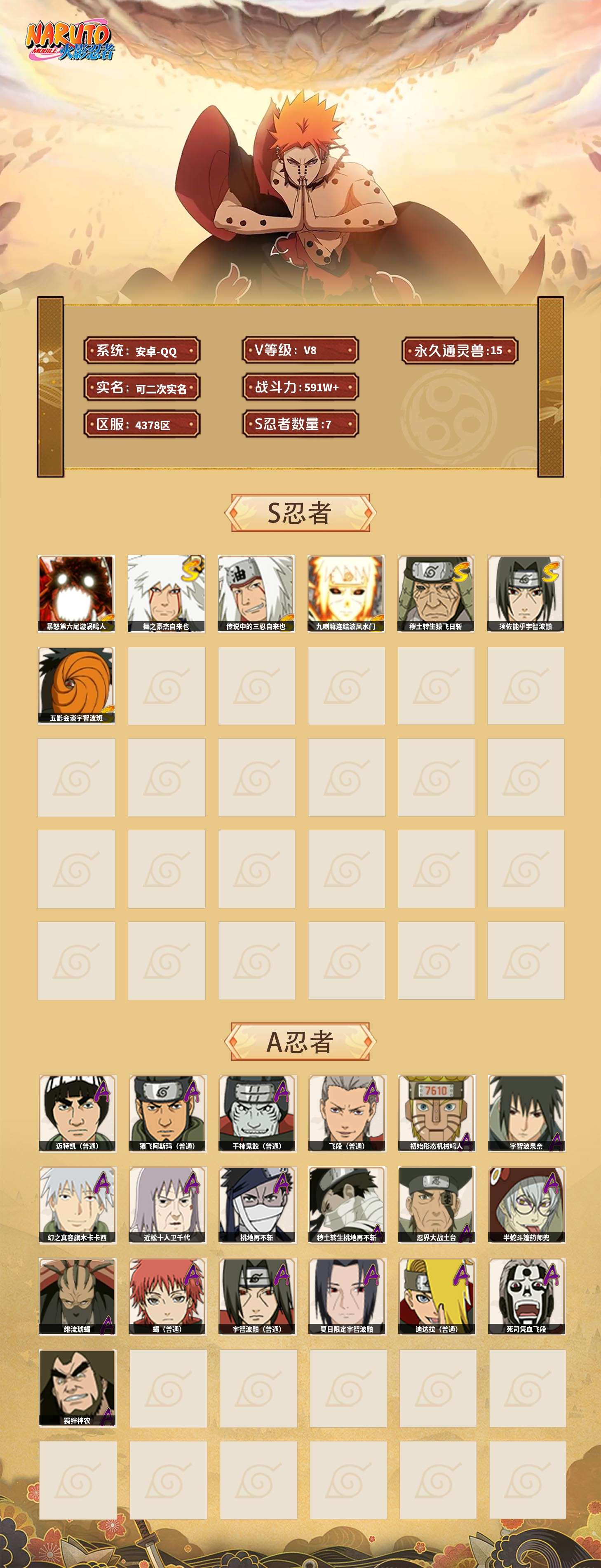【火影忍者】【lyhy8973】战斗力:591w;段位:上忍3阶;本服排名:95;vip:v8级;s忍:7个;a忍:19个;通灵兽:15个,s忍:暴怒第六尾漩涡鸣人|舞之豪杰自来也|传说中的三忍自来也|九喇嘛连结波风水门|秽土转生猿飞日斩|须佐能乎宇智波鼬|五影会谈宇智波斑__a忍:迈特凯(普通) 5星|猿飞阿斯玛(普通) 4星|干柿鬼鲛(普通) 4星|飞段(普通) 3星|初始形态机械鸣人|宇智波泉奈|幻之真容旗木卡卡西|近松十人卫千代|桃地再不斩|秽土转生桃地再不斩|忍界大战土台|半蛇斗篷药师兜|绯流琥蝎|蝎(普通)|宇智波鼬(普通)|夏日限定宇智波鼬|迪达拉(普通)|死司凭血飞段|羁绊神农__通灵兽:忍犬(普通)|蓝蛇|蛤蟆吉|砂之守鹤|忍龟|镰鼬|猿魔|山椒鱼|蜃|蛤蟆仙人|鲛鲨|蛤蟆健|乌鸦(普通)|蛤蟆龙|蛞蝓(普通)