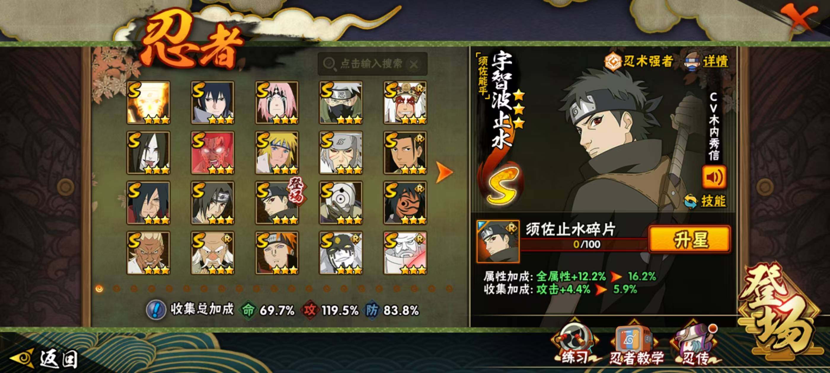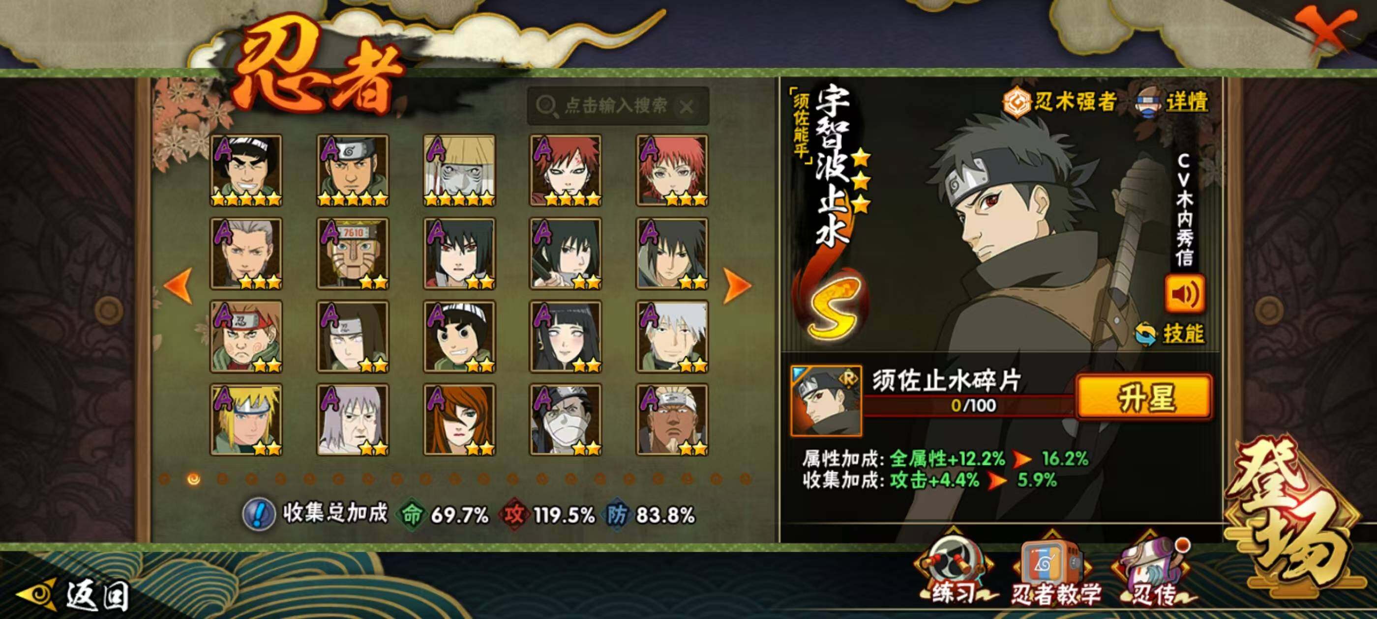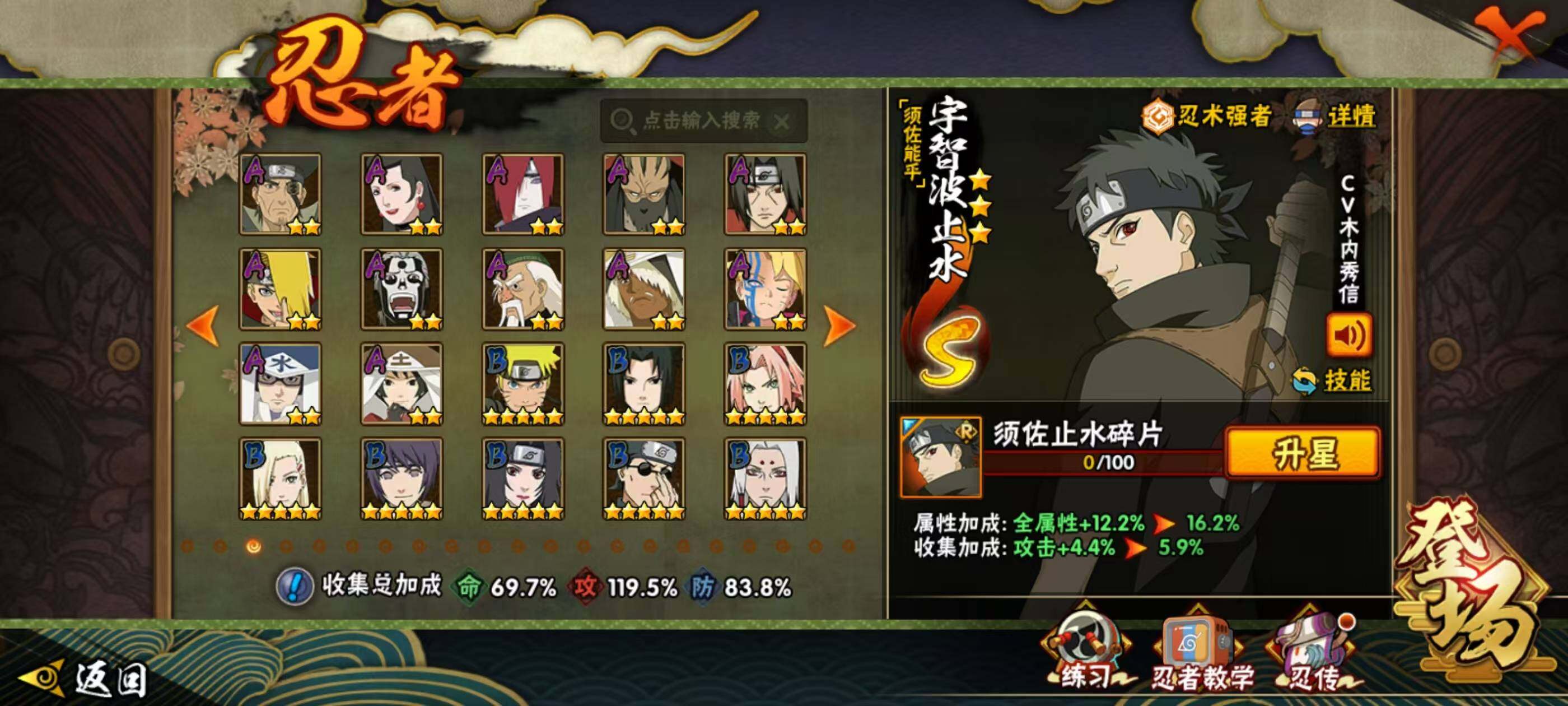 1739288 20s级忍者数-32a级忍者数 【s级忍者】:千手扉间「秽土转生」3星,宇智波斑「秽土转生·解」3星,大野木「忍界大战」3星,春野樱「忍界大战」3星,艾「忍界大战」3星,宇智波鼬「须佐能乎」3星,宇智波止水「须佐能乎」3星,旗木卡卡西「须佐能乎」3星,千手柱间「木叶创立」3星,自来也「舞之豪杰」3星,大蛇丸3星,波风水门3星,神秘