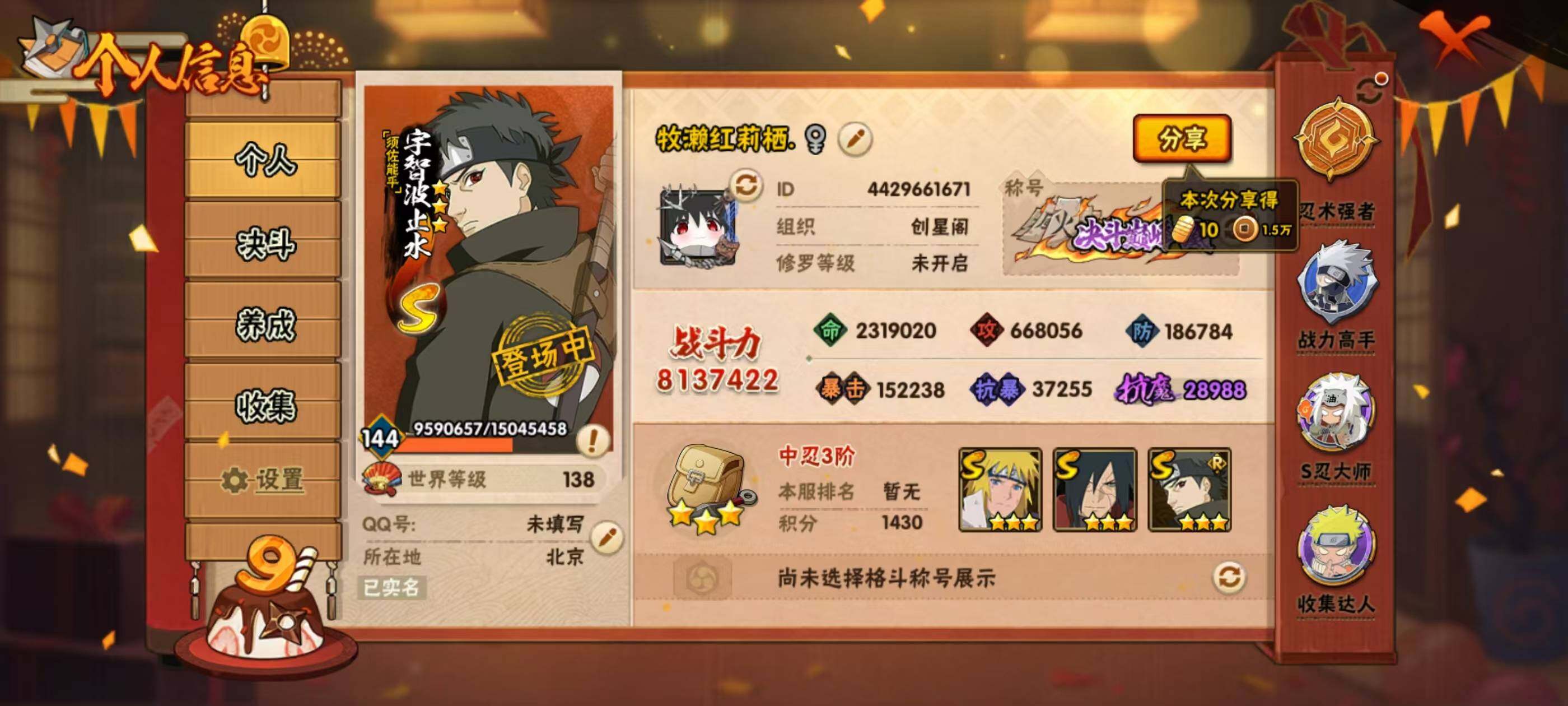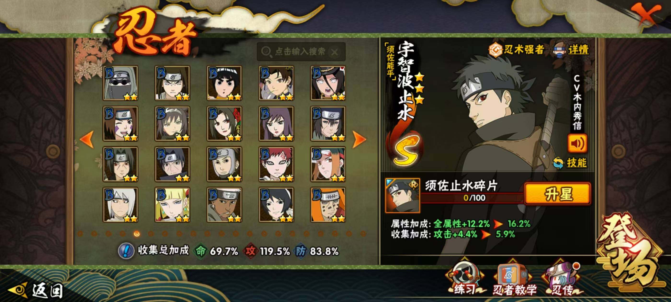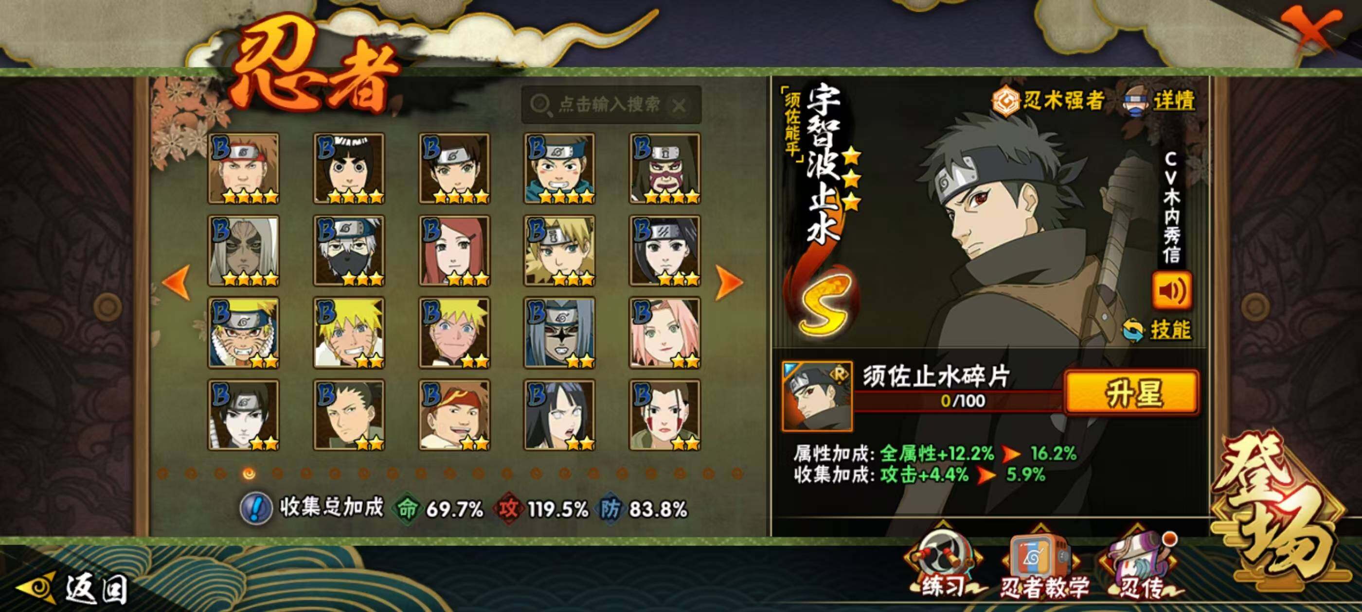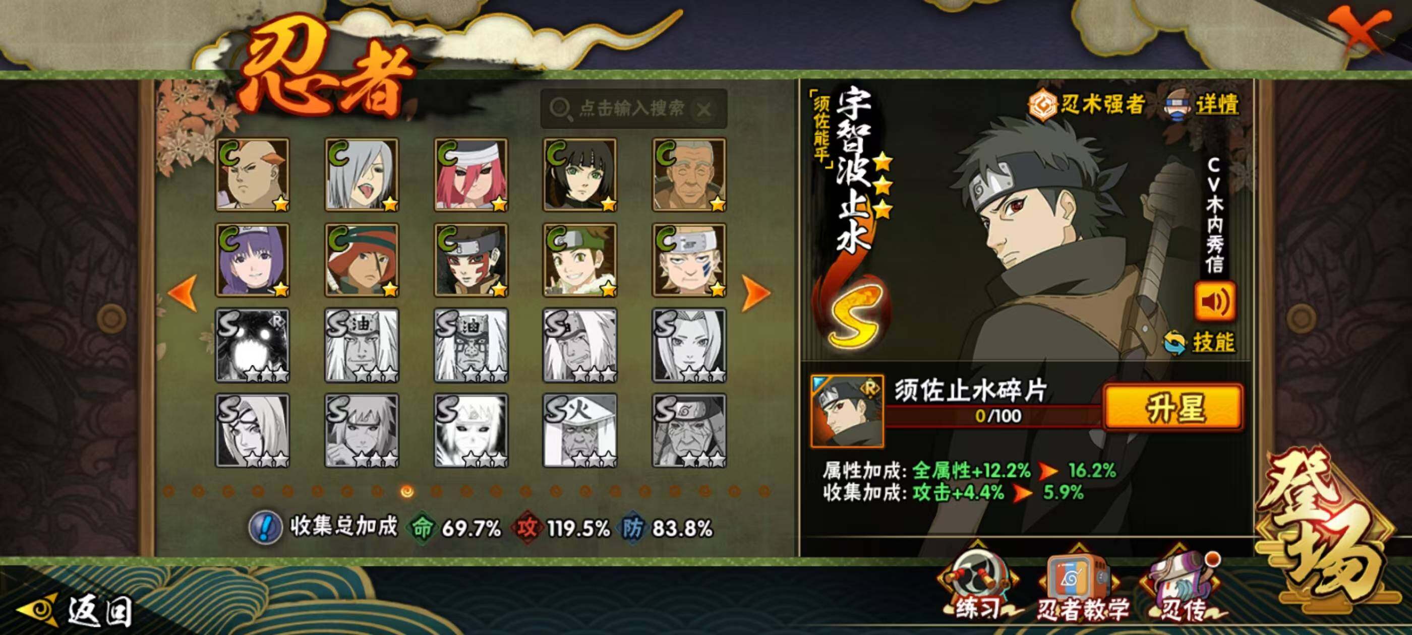 1739288 20s级忍者数-32a级忍者数 【s级忍者】:千手扉间「秽土转生」3星,宇智波斑「秽土转生·解」3星,大野木「忍界大战」3星,春野樱「忍界大战」3星,艾「忍界大战」3星,宇智波鼬「须佐能乎」3星,宇智波止水「须佐能乎」3星,旗木卡卡西「须佐能乎」3星,千手柱间「木叶创立」3星,自来也「舞之豪杰」3星,大蛇丸3星,波风水门3星,神秘