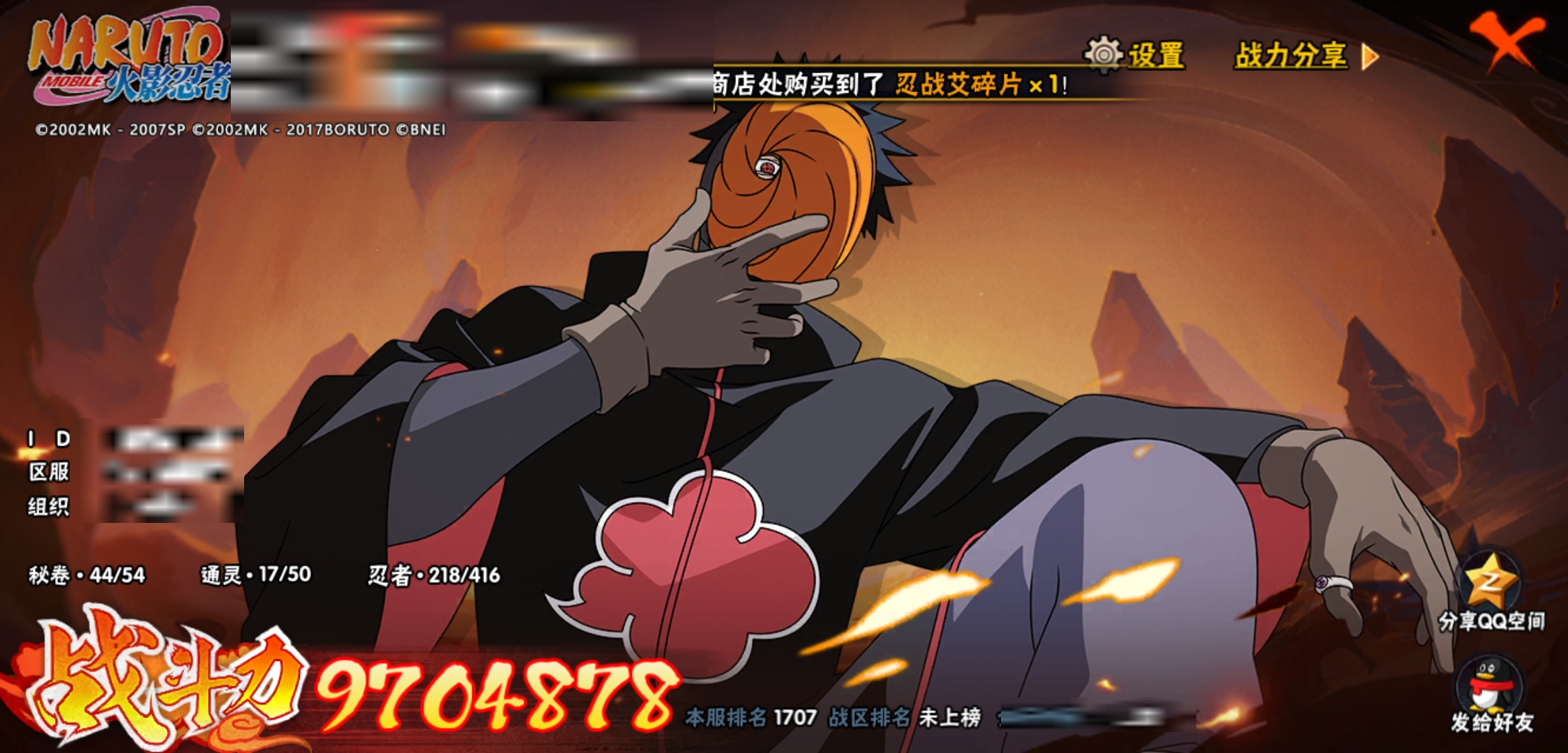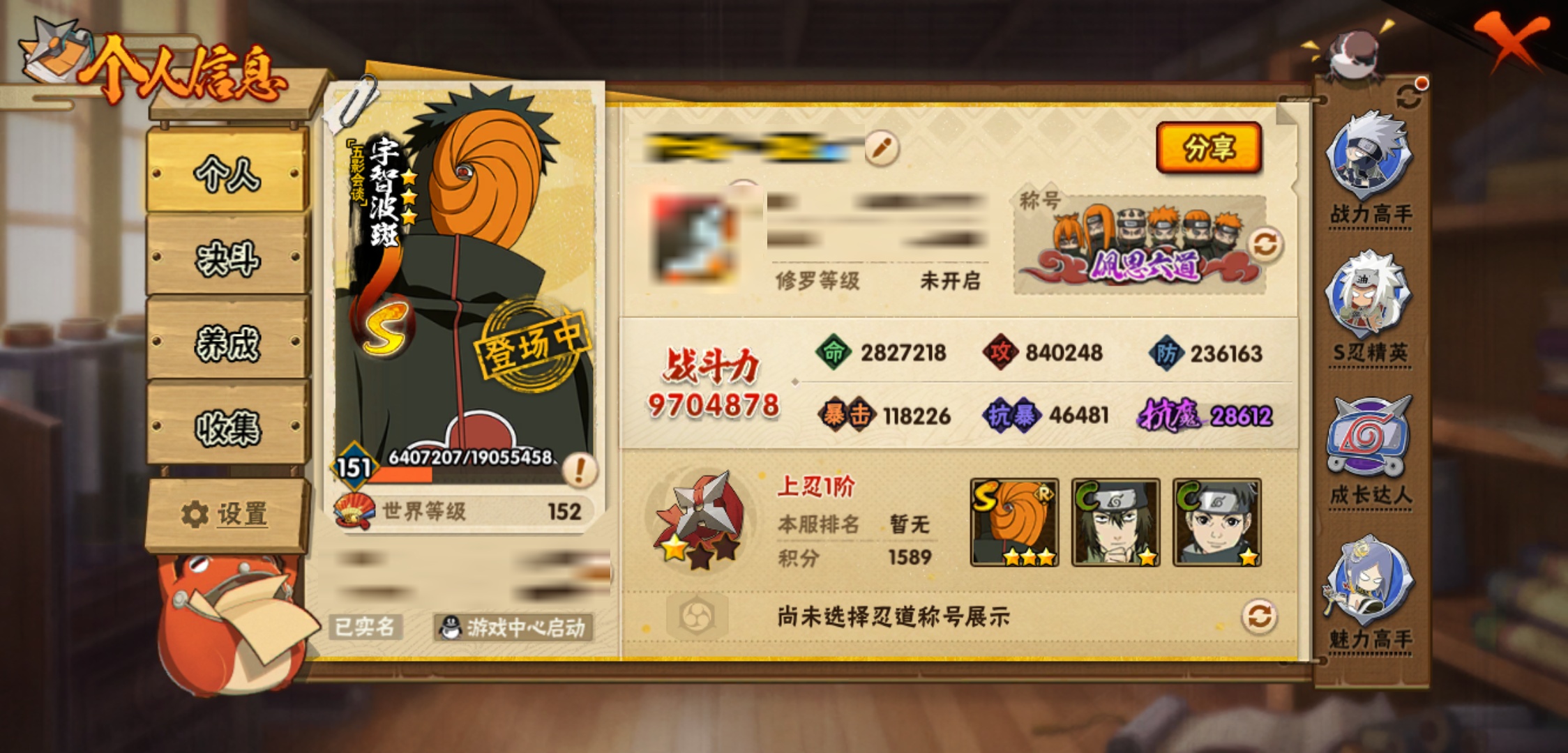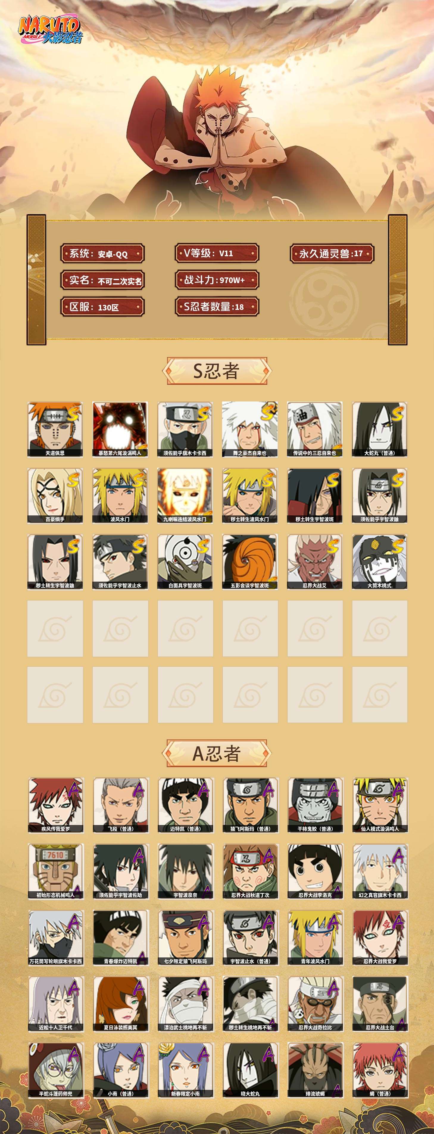 【火影忍者】【lyhy9058】战斗力:970w;段位:上忍1阶;本服排名:1707;vip:v11级;s忍:18个;a忍:40个;通灵兽:17个,s忍:天道佩恩 4星|暴怒第六尾漩涡鸣人|须佐能乎旗木卡卡西|舞之豪杰自来也|传说中的三忍自来也|大蛇丸(普通)|百豪纲手|波风水门|九喇嘛连结波风水门|秽土转生波风水门|秽土转生宇智波斑|须佐能乎宇智波鼬|秽土转生宇智波鼬|须佐能乎宇智波止水|白面具宇智波斑|五影会谈宇智波斑|忍界大战艾|大筒木桃式__a忍:疾风传我爱罗 4星|飞段(普通) 4星|迈特凯(普通) 3星|猿飞阿斯玛(普通) 3星|干柿鬼鲛(普通) 3星|仙人模式漩涡鸣人|初始形态机械鸣人|须佐能乎宇智波佐助|宇智波泉奈|忍界大战秋道丁次|忍界大战李洛克|幻之真容旗木卡卡西|万花筒写轮眼旗木卡卡西|青春爆炸迈特凯|七夕限定猿飞阿斯玛|宇智波止水(普通)|青年波风水门|忍界大战我爱罗|近松十人卫千代|夏日泳装照美冥|漂泊武士桃地再不斩|秽土转生桃地再不斩|忍界大战奇拉比|忍界大战土台|半蛇斗篷药师兜|小南(普通)|新春限定小南|晓大蛇丸|绯流琥蝎|蝎(普通)|宇智波鼬(普通)|夏日限定宇智波鼬|迪达拉(普通)|秽土转生迪达拉|死司凭血飞段|羁绊神农|木叶上忍猿飞木叶丸|桃式显现漩涡博人|仙人模式巳月|四代目土影黑土__通灵兽:忍犬(普通)|蓝蛇|蛤蟆吉|忍龟|镰鼬|猿魔|山椒鱼|蜃|蛞蝓(普通)|蛤蟆仙人|鲛鲨|蛤蟆健|乌鸦(普通)|蛤蟆龙|砂之守鹤|蛤蟆广|梦貘