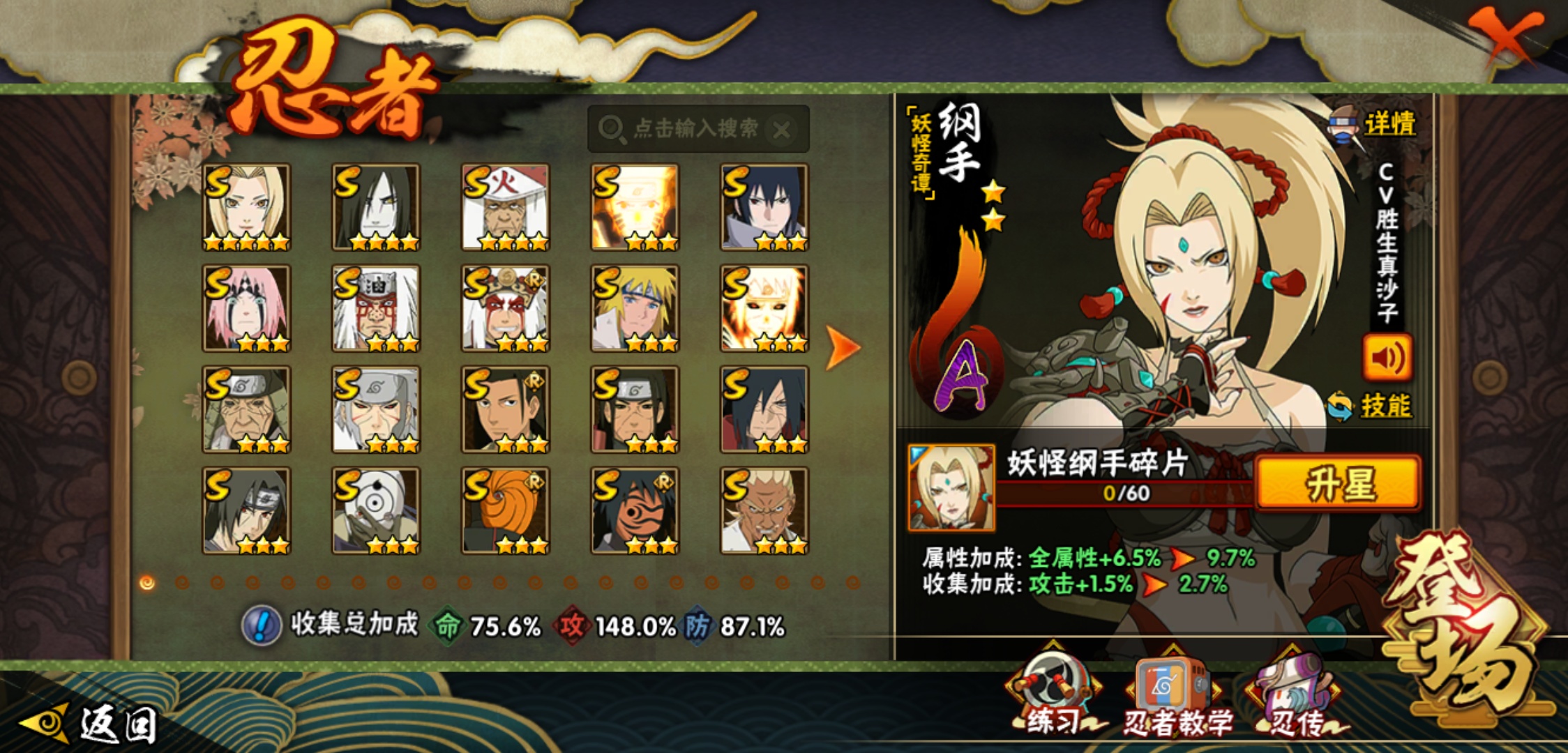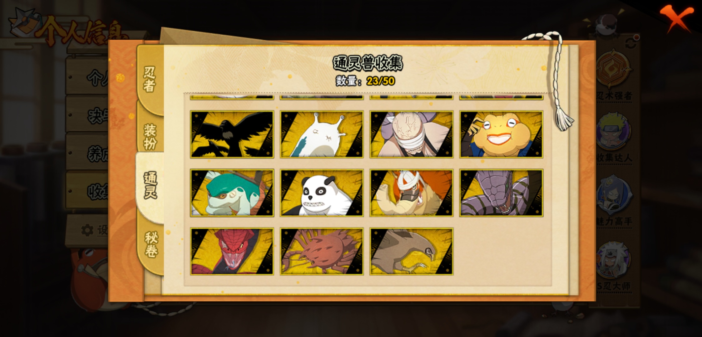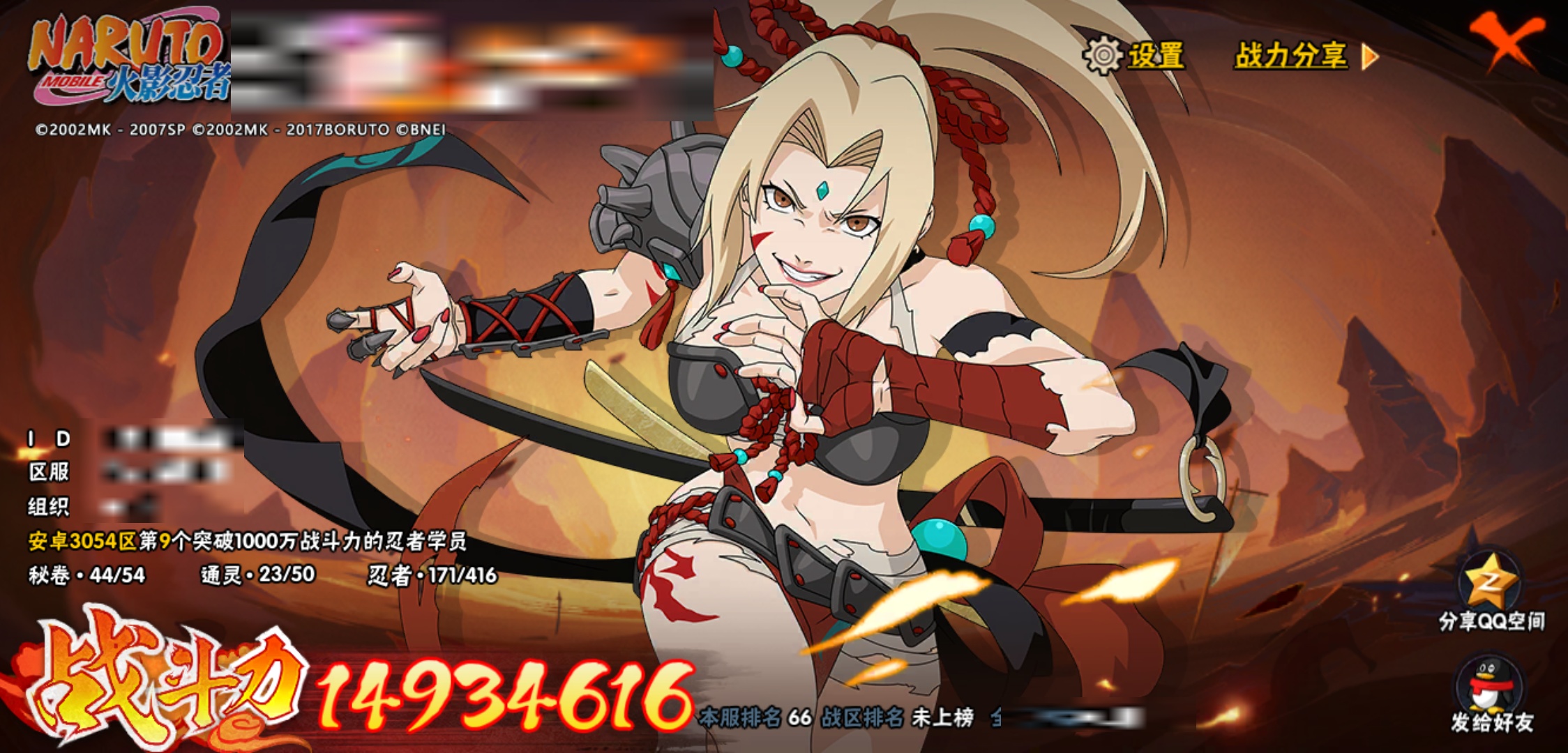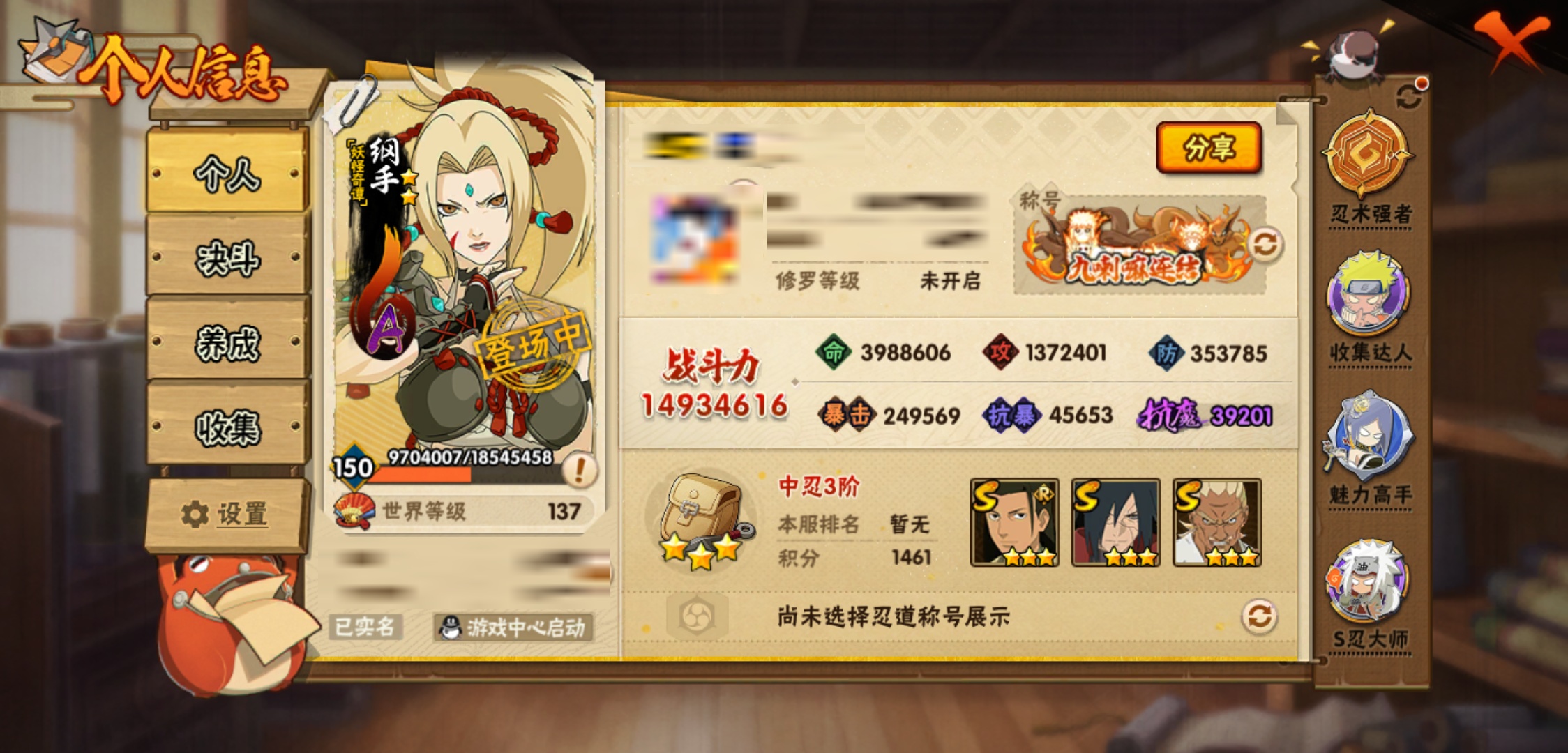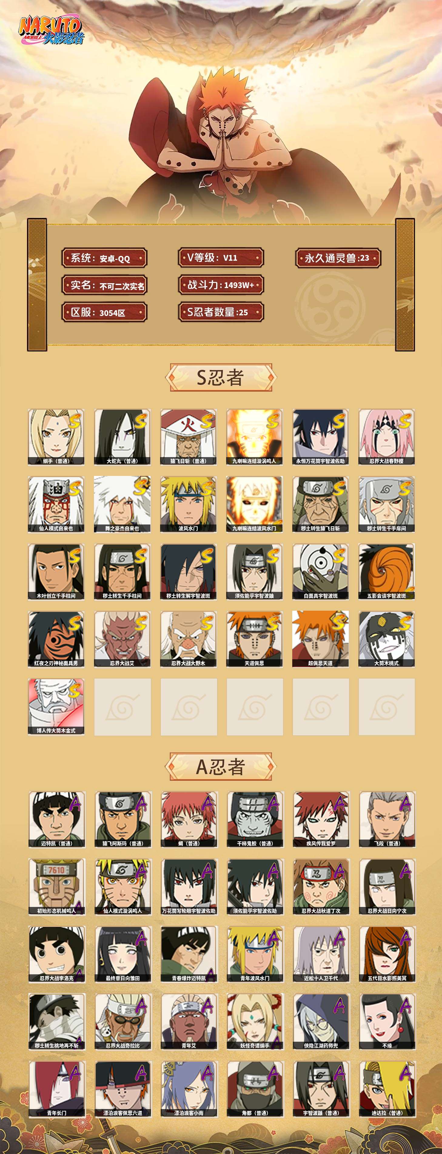 【火影忍者】【lyhy9065】战斗力:1493w;段位:中忍3阶;本服排名:66;vip:v11级;s忍:25个;a忍:35个;通灵兽:23个,s忍:纲手(普通) 5星|大蛇丸(普通) 4星|猿飞日斩(普通) 4星|九喇嘛连结漩涡鸣人|永恒万花筒宇智波佐助|忍界大战春野樱|仙人模式自来也|舞之豪杰自来也|波风水门|九喇嘛连结波风水门|秽土转生猿飞日斩|秽土转生千手扉间|木叶创立千手柱间|秽土转生千手柱间|秽土转生解宇智波斑|须佐能乎宇智波鼬|白面具宇智波斑|五影会谈宇智波斑|红夜之刃神秘面具男|忍界大战艾|忍界大战大野木|天道佩恩|超佩恩天道|大筒木桃式|博人传大筒木金式__a忍:迈特凯(普通) 5星|猿飞阿斯玛(普通) 5星|蝎(普通) 5星|干柿鬼鲛(普通) 5星|疾风传我爱罗 3星|飞段(普通) 3星|初始形态机械鸣人|仙人模式漩涡鸣人|万花筒写轮眼宇智波佐助|须佐能乎宇智波佐助|忍界大战秋道丁次|忍界大战日向宁次|忍界大战李洛克|最终章日向雏田|青春爆炸迈特凯|青年波风水门|近松十人卫千代|五代目水影照美冥|秽土转生桃地再不斩|忍界大战奇拉比|青年艾|妖怪奇谭纲手|侠隐江湖药师兜|不缘|青年长门|漂泊浪客佩恩六道|漂泊浪客小南|角都(普通)|宇智波鼬(普通)|迪达拉(普通)|死司凭血飞段|六代目水影长十郎|桃式显现漩涡博人|仙人模式巳月|四代目土影黑土__通灵兽:忍犬(普通)|蓝蛇|蛤蟆吉|忍龟|砂之守鹤|镰鼬|猿魔|山椒鱼|蜃|蛤蟆仙人|鲛鲨|蛤蟆健|乌鸦(普通)|蛞蝓(普通)|怒鬼爪|蛤蟆龙|蛤蟆广|熊猫|梦貘|万蛇|辛牙|螃蟹|鹰