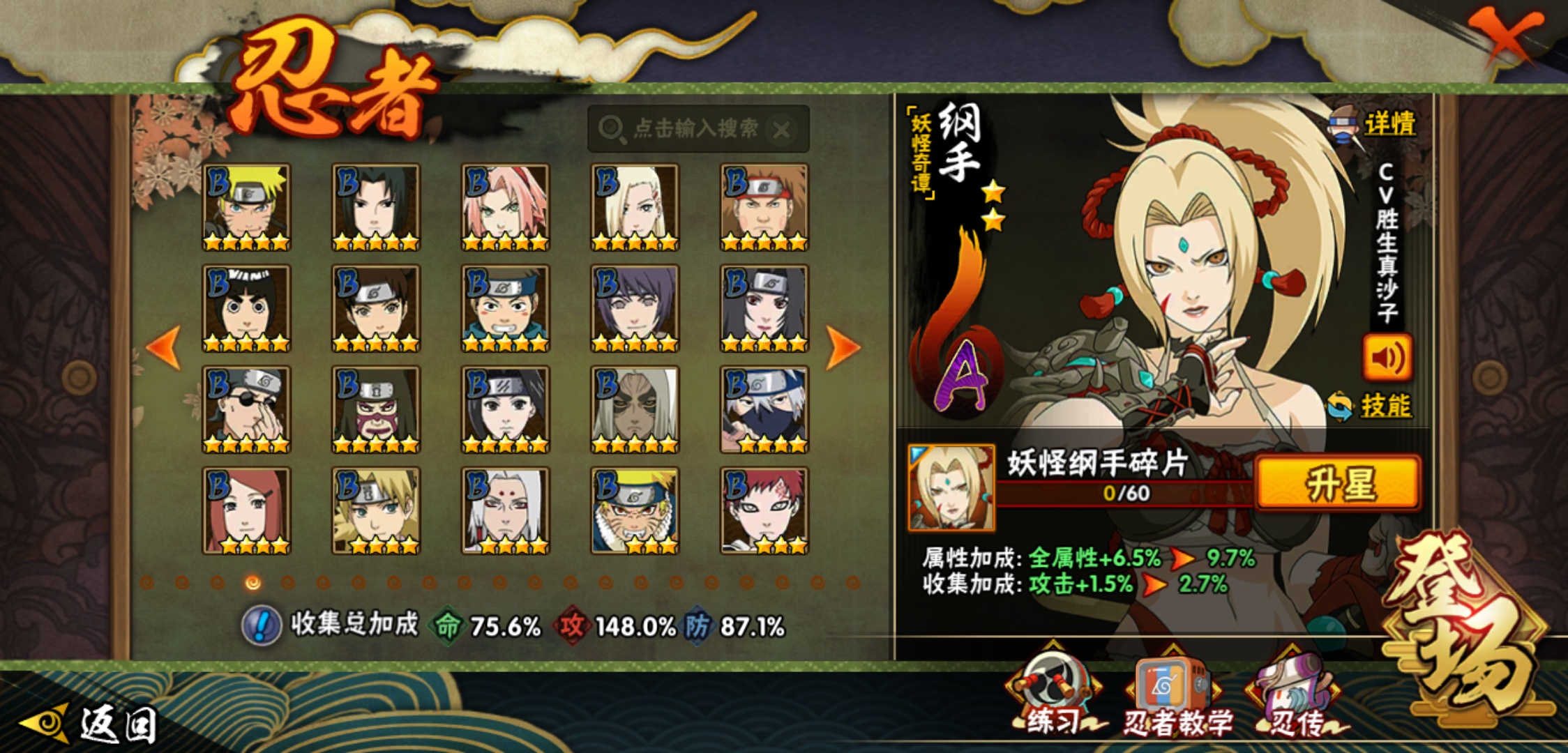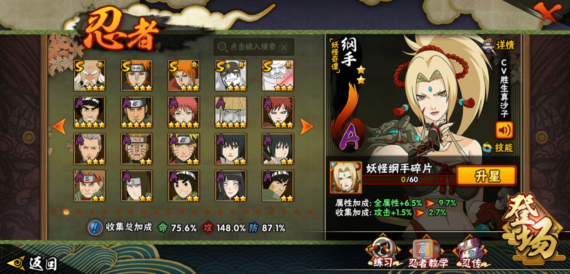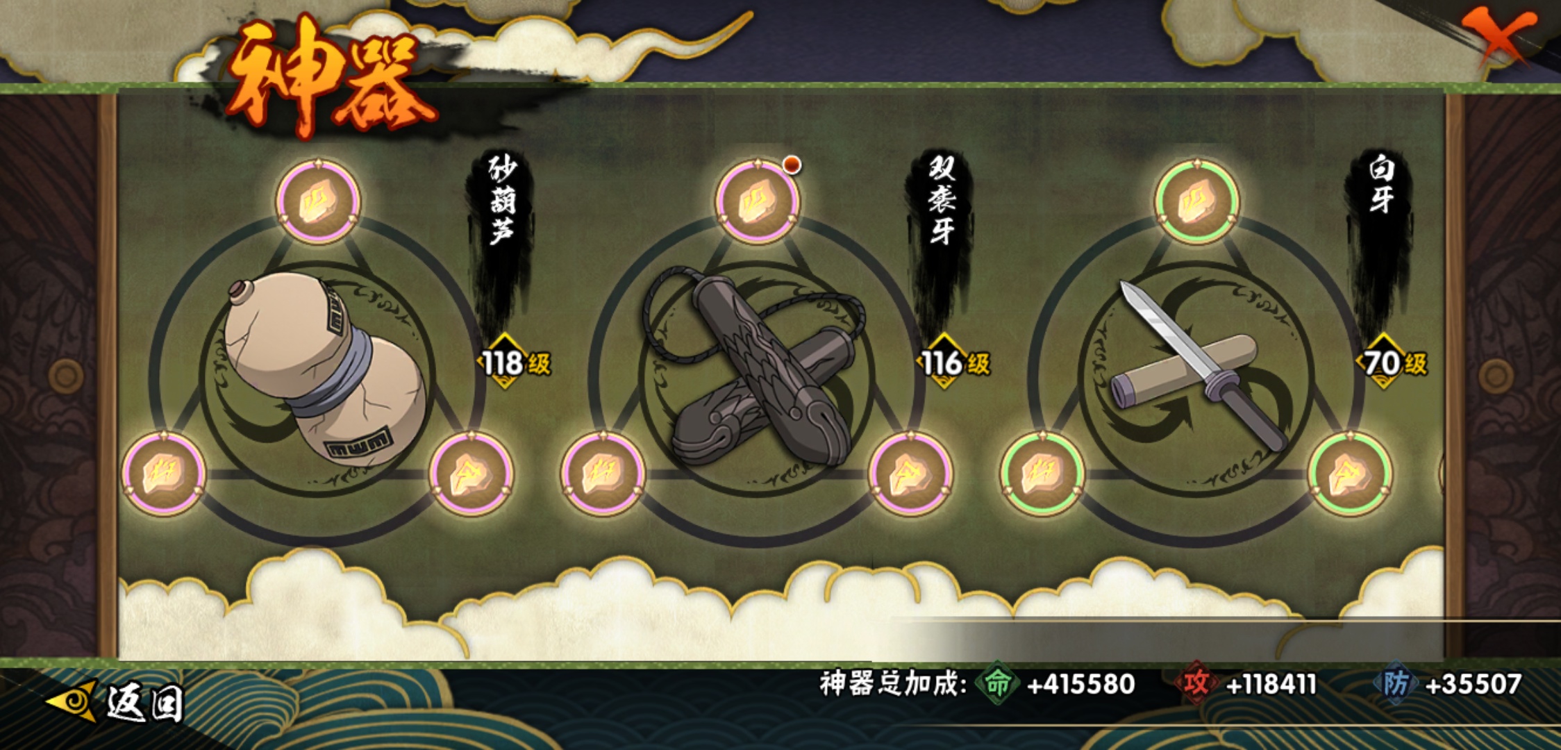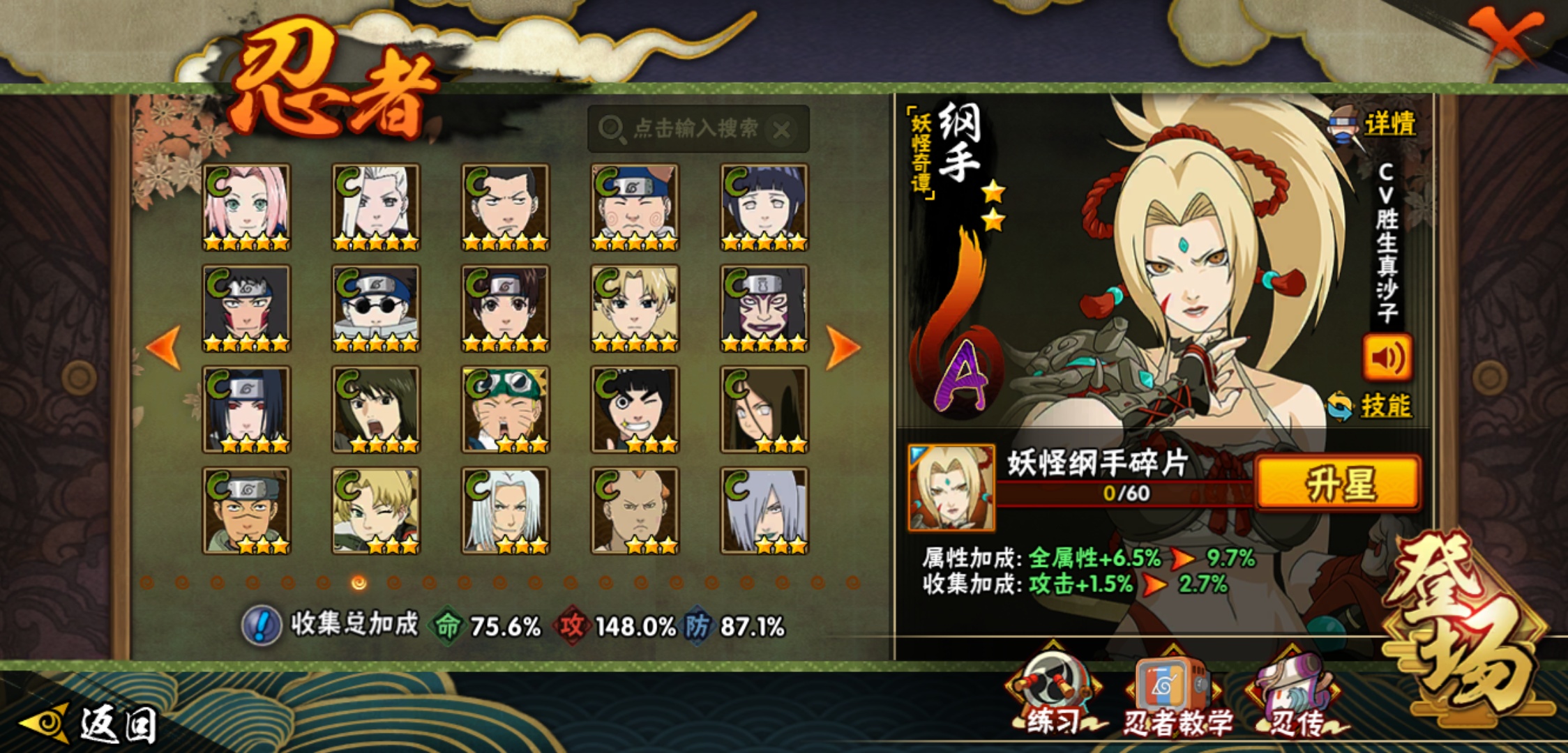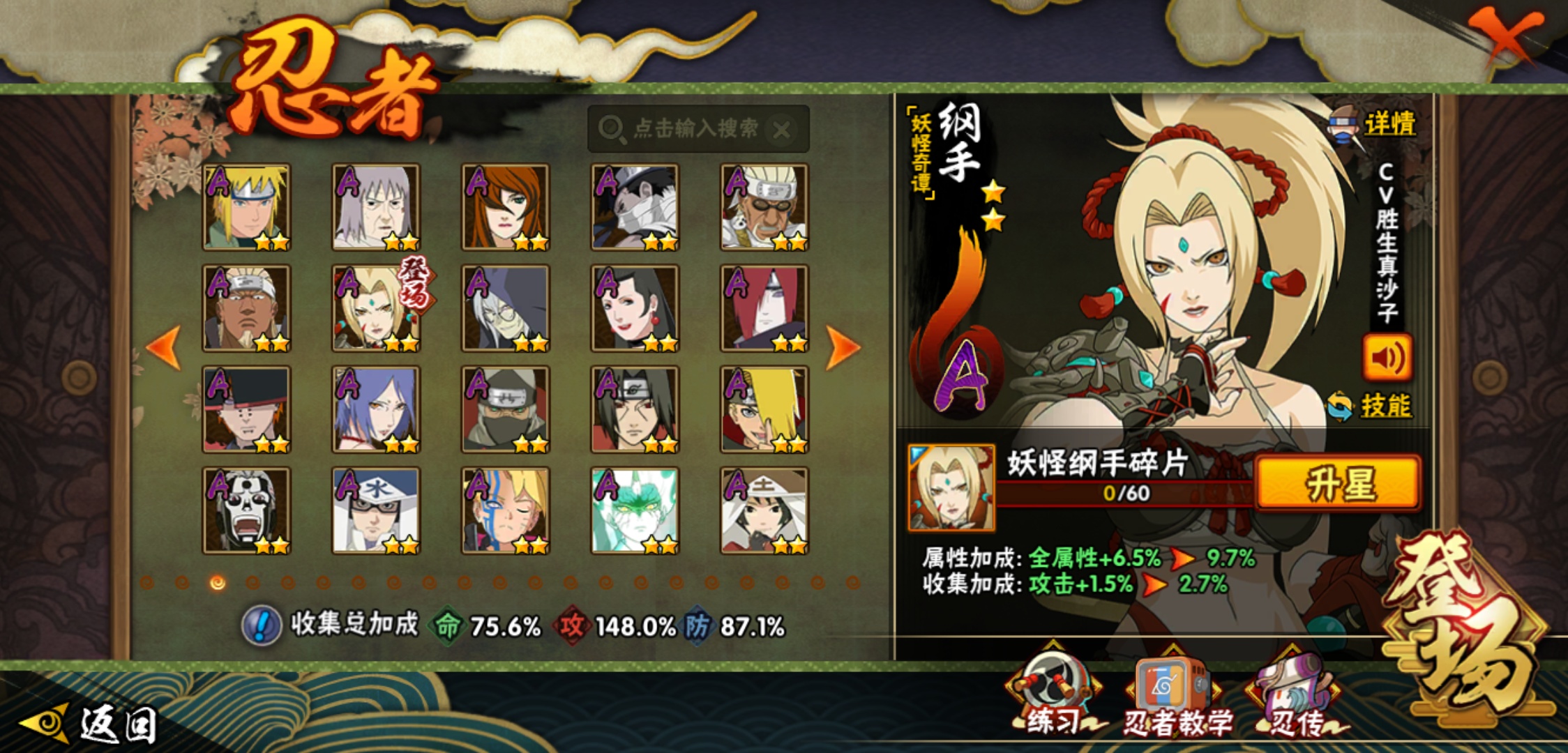 【火影忍者】【lyhy9065】战斗力:1493w;段位:中忍3阶;本服排名:66;vip:v11级;s忍:25个;a忍:35个;通灵兽:23个,s忍:纲手(普通) 5星|大蛇丸(普通) 4星|猿飞日斩(普通) 4星|九喇嘛连结漩涡鸣人|永恒万花筒宇智波佐助|忍界大战春野樱|仙人模式自来也|舞之豪杰自来也|波风水门|九喇嘛连结波风水门|秽土转生猿飞日斩|秽土转生千手扉间|木叶创立千手柱间|秽土转生千手柱间|秽土转生解宇智波斑|须佐能乎宇智波鼬|白面具宇智波斑|五影会谈宇智波斑|红夜之刃神秘面具男|忍界大战艾|忍界大战大野木|天道佩恩|超佩恩天道|大筒木桃式|博人传大筒木金式__a忍:迈特凯(普通) 5星|猿飞阿斯玛(普通) 5星|蝎(普通) 5星|干柿鬼鲛(普通) 5星|疾风传我爱罗 3星|飞段(普通) 3星|初始形态机械鸣人|仙人模式漩涡鸣人|万花筒写轮眼宇智波佐助|须佐能乎宇智波佐助|忍界大战秋道丁次|忍界大战日向宁次|忍界大战李洛克|最终章日向雏田|青春爆炸迈特凯|青年波风水门|近松十人卫千代|五代目水影照美冥|秽土转生桃地再不斩|忍界大战奇拉比|青年艾|妖怪奇谭纲手|侠隐江湖药师兜|不缘|青年长门|漂泊浪客佩恩六道|漂泊浪客小南|角都(普通)|宇智波鼬(普通)|迪达拉(普通)|死司凭血飞段|六代目水影长十郎|桃式显现漩涡博人|仙人模式巳月|四代目土影黑土__通灵兽:忍犬(普通)|蓝蛇|蛤蟆吉|忍龟|砂之守鹤|镰鼬|猿魔|山椒鱼|蜃|蛤蟆仙人|鲛鲨|蛤蟆健|乌鸦(普通)|蛞蝓(普通)|怒鬼爪|蛤蟆龙|蛤蟆广|熊猫|梦貘|万蛇|辛牙|螃蟹|鹰