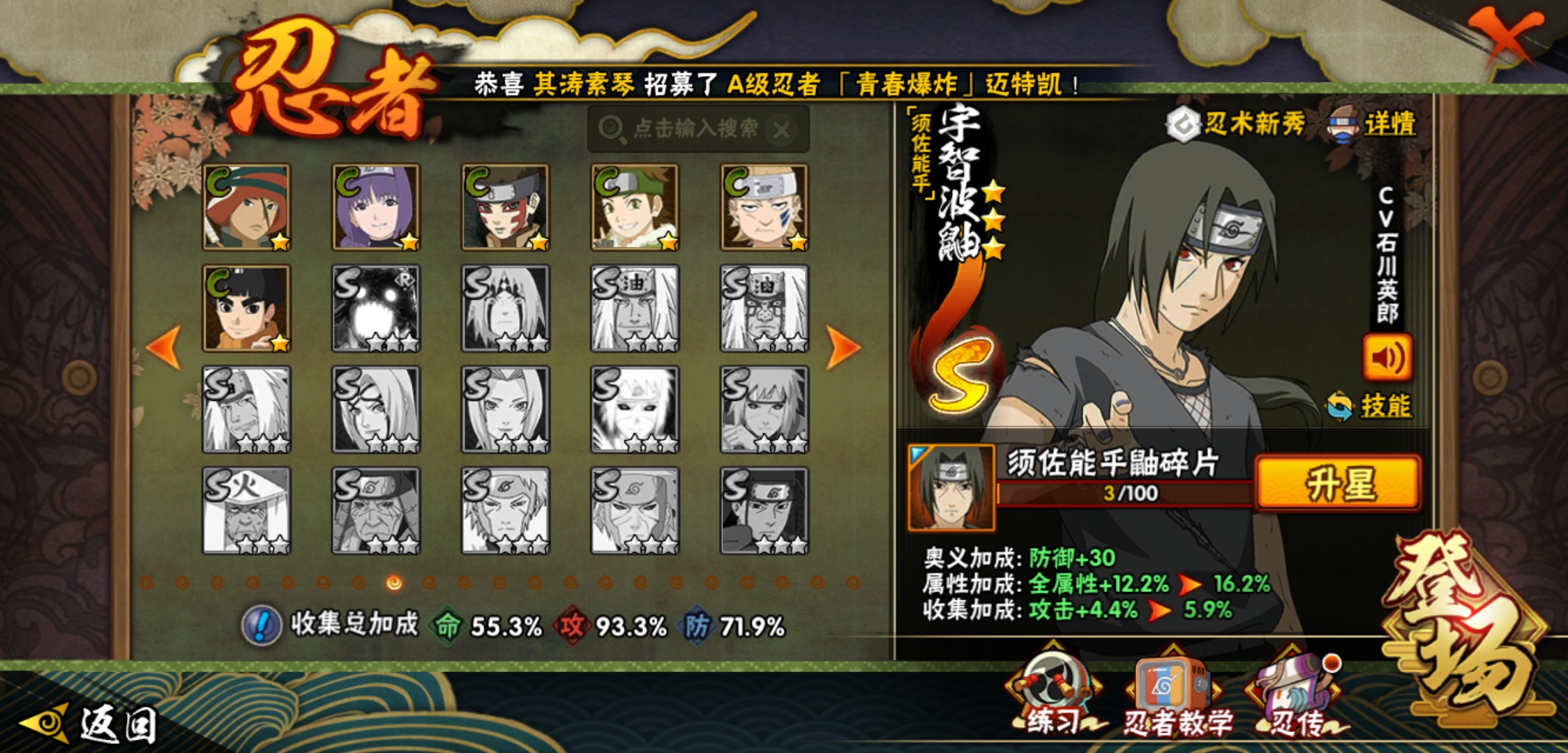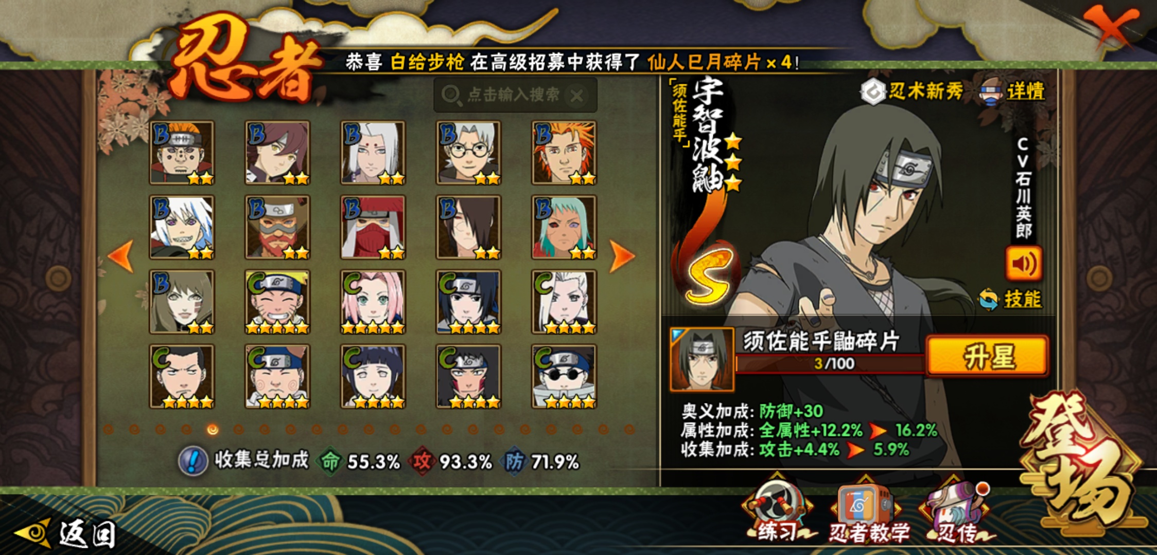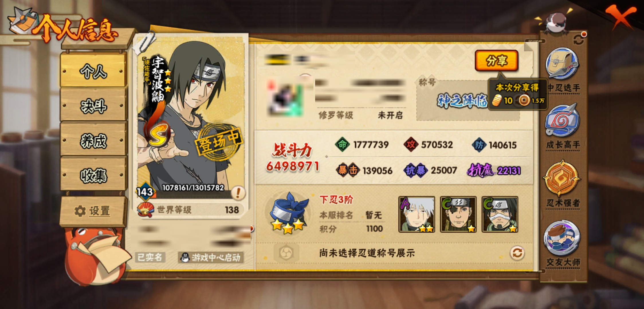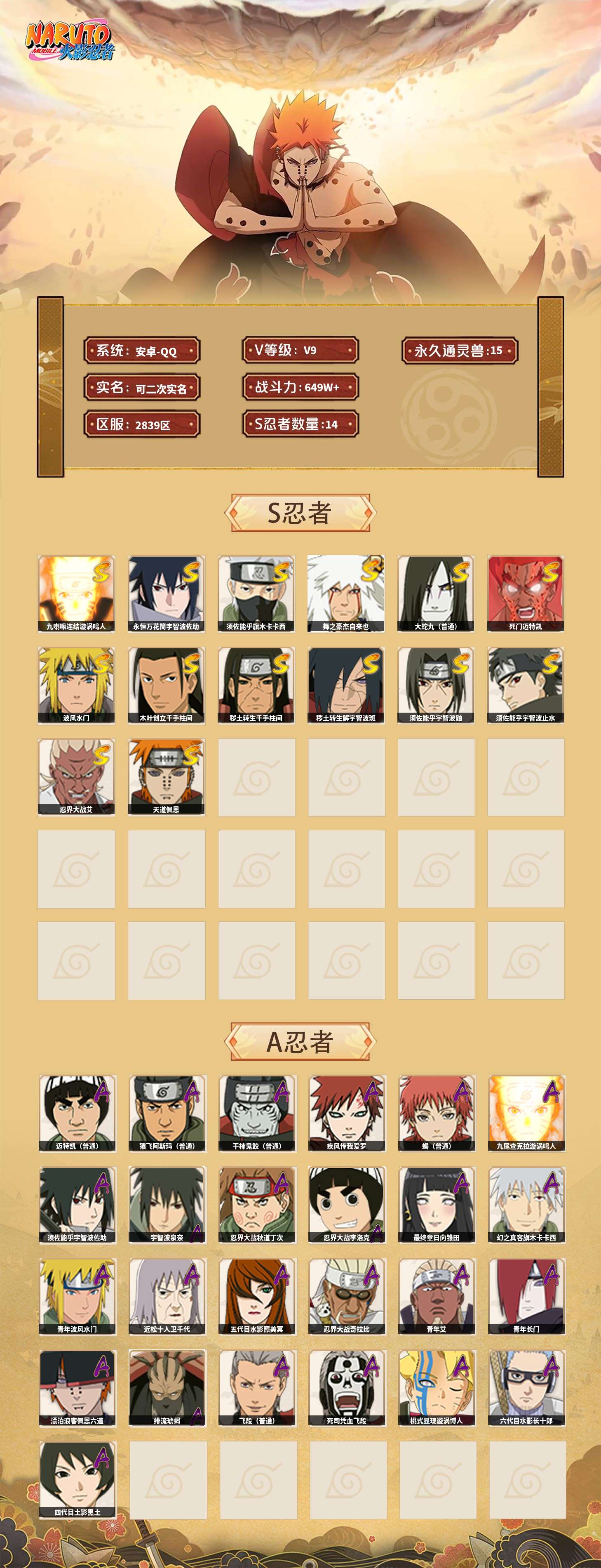 【火影忍者】【lyhy9070】战斗力:649w;段位:下忍3阶;本服排名:1069;vip:v9级;s忍:14个;a忍:25个;通灵兽:15个,s忍:九喇嘛连结漩涡鸣人|永恒万花筒宇智波佐助|须佐能乎旗木卡卡西|舞之豪杰自来也|大蛇丸(普通)|死门迈特凯|波风水门|木叶创立千手柱间|秽土转生千手柱间|秽土转生解宇智波斑|须佐能乎宇智波鼬|须佐能乎宇智波止水|忍界大战艾|天道佩恩__a忍:迈特凯(普通) 5星|猿飞阿斯玛(普通) 5星|干柿鬼鲛(普通) 5星|疾风传我爱罗 3星|蝎(普通) 3星|九尾查克拉漩涡鸣人|须佐能乎宇智波佐助|宇智波泉奈|忍界大战秋道丁次|忍界大战李洛克|最终章日向雏田|幻之真容旗木卡卡西|青年波风水门|近松十人卫千代|五代目水影照美冥|忍界大战奇拉比|青年艾|青年长门|漂泊浪客佩恩六道|绯流琥蝎|飞段(普通)|死司凭血飞段|桃式显现漩涡博人|六代目水影长十郎|四代目土影黑土__通灵兽:忍犬(普通)|蓝蛇|蛤蟆吉|忍龟|砂之守鹤|镰鼬|猿魔|山椒鱼|蜃|蛤蟆仙人|鲛鲨|蛤蟆健|蛞蝓(普通)|乌鸦(普通)|蛤蟆龙