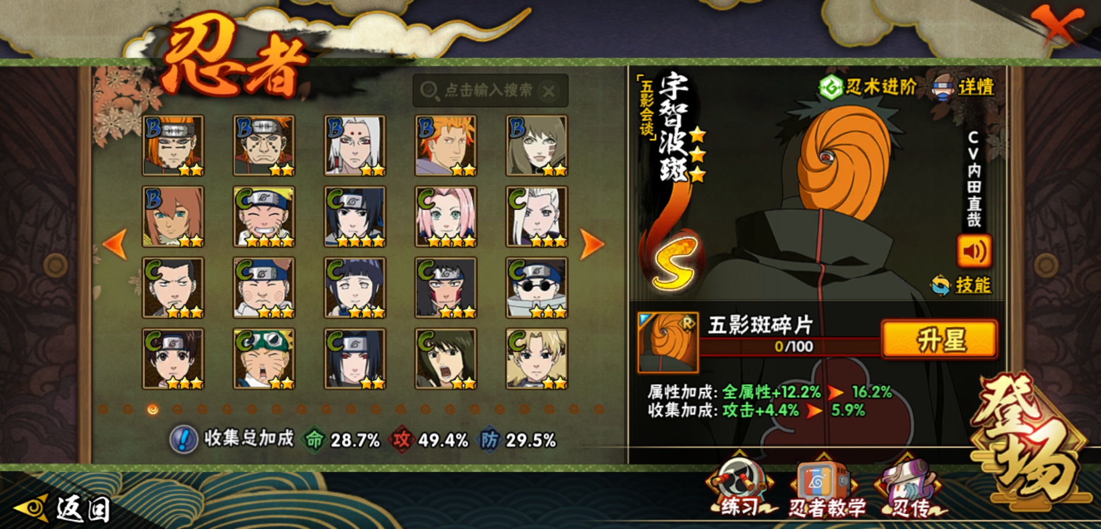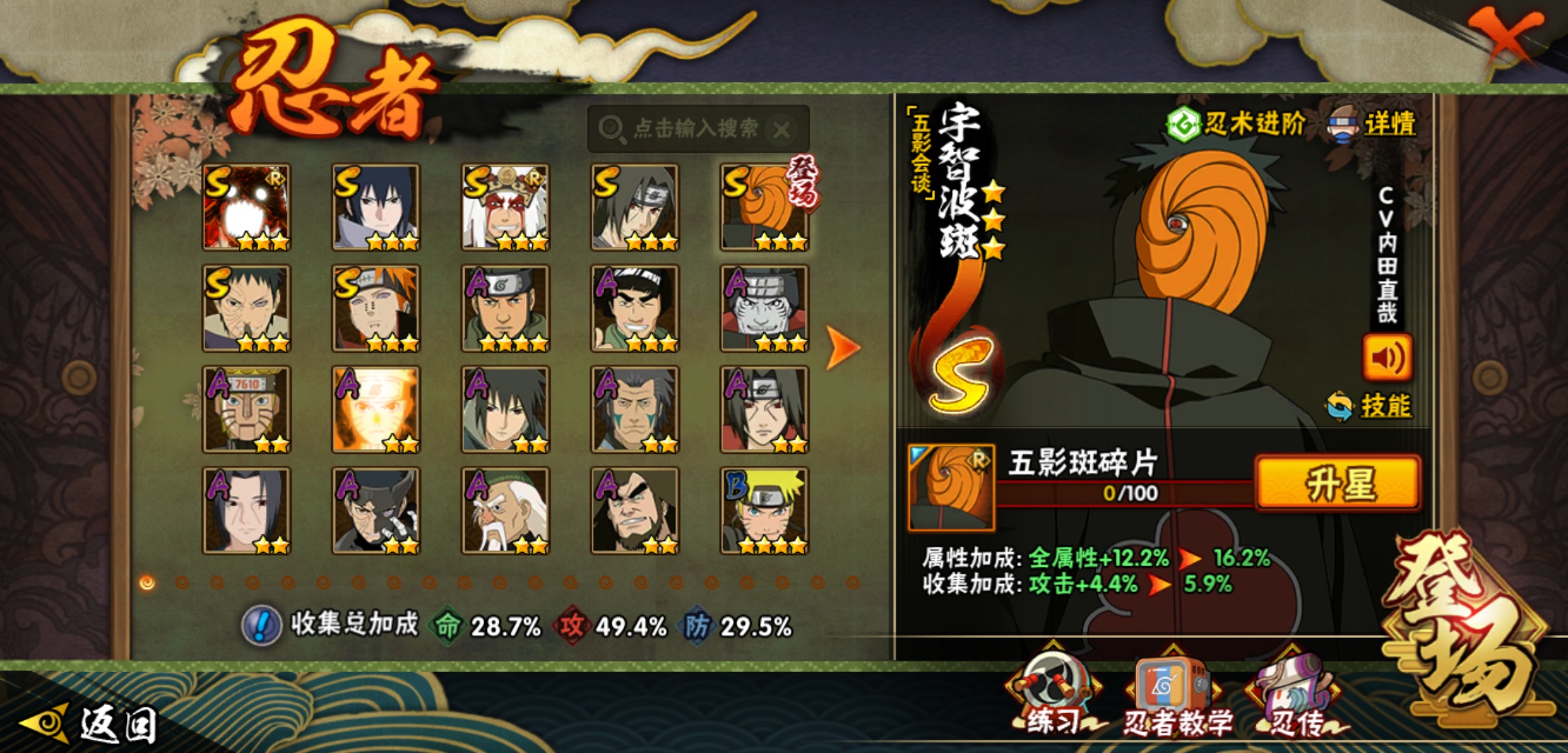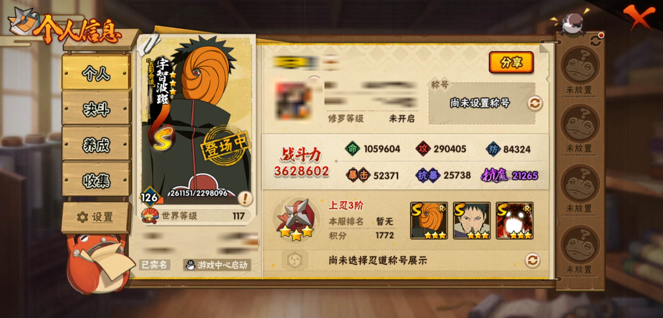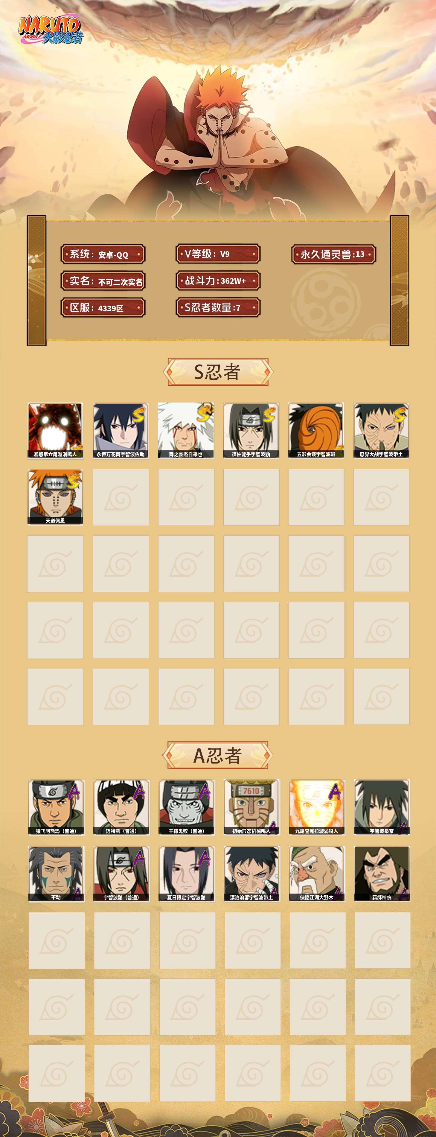 【火影忍者】【lyhy9073】战斗力:362w;段位:上忍3阶;本服排名:480;vip:v9级;s忍:7个;a忍:12个;通灵兽:13个,s忍:暴怒第六尾漩涡鸣人|永恒万花筒宇智波佐助|舞之豪杰自来也|须佐能乎宇智波鼬|五影会谈宇智波斑|忍界大战宇智波带土|天道佩恩__a忍:猿飞阿斯玛(普通) 4星|迈特凯(普通) 3星|干柿鬼鲛(普通) 3星|初始形态机械鸣人|九尾查克拉漩涡鸣人|宇智波泉奈|不动|宇智波鼬(普通)|夏日限定宇智波鼬|漂泊浪客宇智波带土|侠隐江湖大野木|羁绊神农__通灵兽:砂之守鹤|忍犬(普通)|蓝蛇|蛤蟆吉|忍龟|镰鼬|猿魔|山椒鱼|蛞蝓(普通)|蜃|蛤蟆仙人|鲛鲨|蛤蟆健