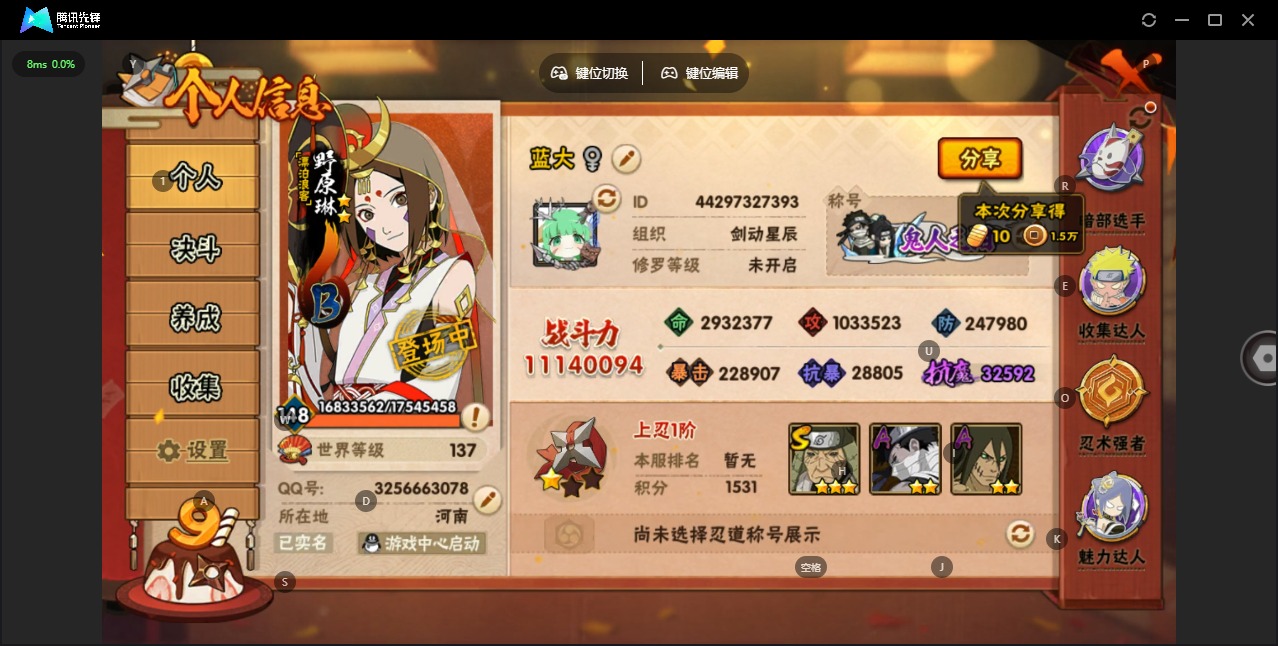 [14398309]v11 18s忍 42a忍 17通灵 1114w战力 可二次 可修改实名 【s级忍者】:宇智波斑「秽土转生·解」宇智波佐助「永恒万花筒」神秘面具男 「红夜之刃」漩涡鸣人 「九喇嘛连结」宇智波斑 「木叶创立」宇智波带土 「忍界大战」自来也 「舞之豪杰」旗木卡卡西「须