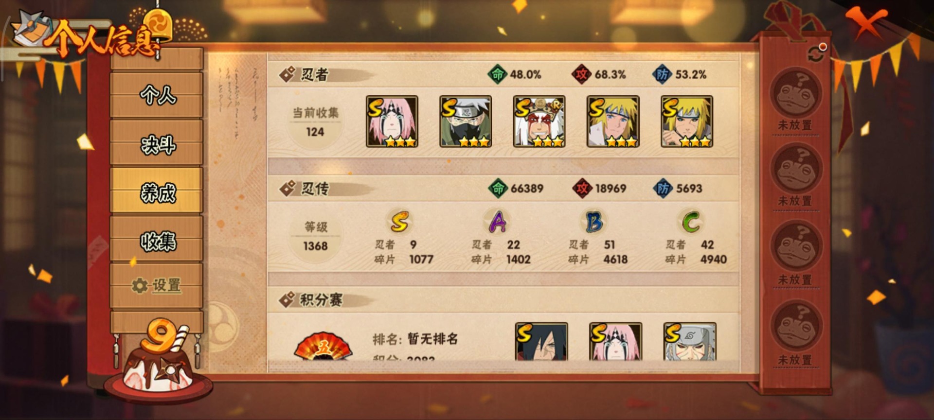 v4 9s忍 22a忍 15通灵 709.5w战力 可二次 可修改实名 【s级忍者】:宇智波斑「秽土转生·解」春野樱 「忍界大战」自来也 「舞之豪杰」旗木卡卡西「须佐能乎」千手扉间「秽土转生」波风水门「秽土转生」宇智波鼬 「须佐能乎」佩恩「天道」波风水门