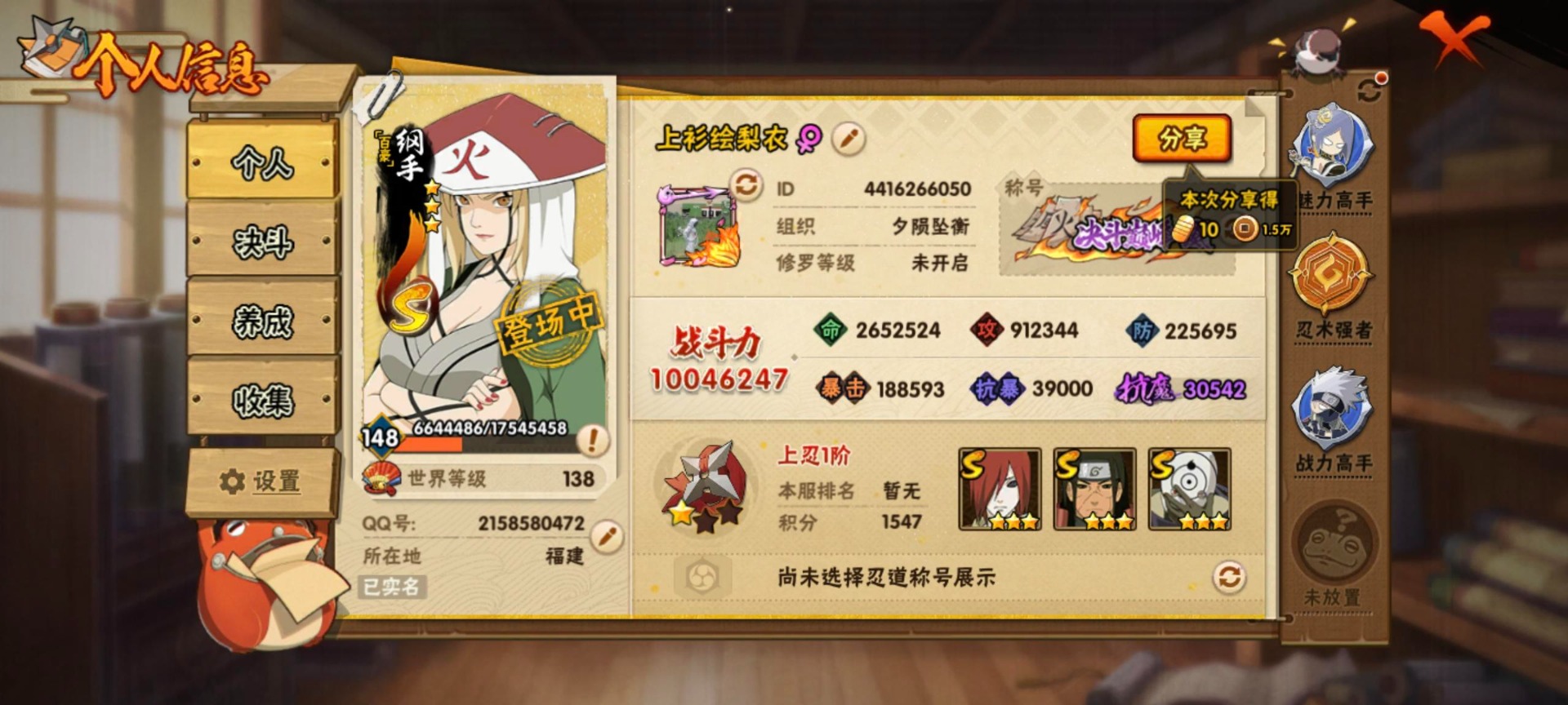 v10 23s忍 28a忍 18通灵 1004.6w战力 可二次 可修改实名 【s级忍者】:宇智波止水「须佐能乎」艾「忍界大战」大筒木桃式宇智波斑「秽土转生·解」千手柱间·木叶创立宇智波佐助「永恒万花筒」神秘面具男 「红夜之刃」春野樱 「忍界大战」漩涡鸣人 「九喇嘛连结」千手柱间