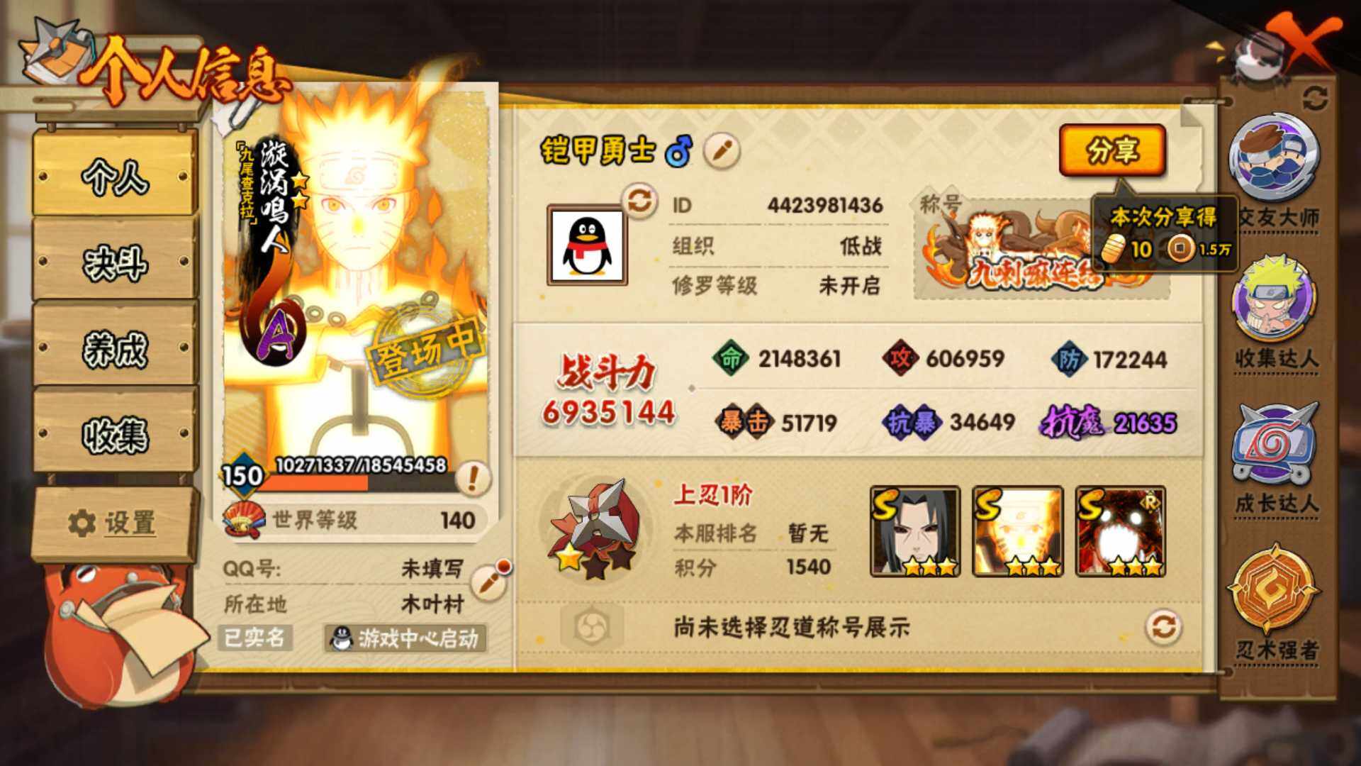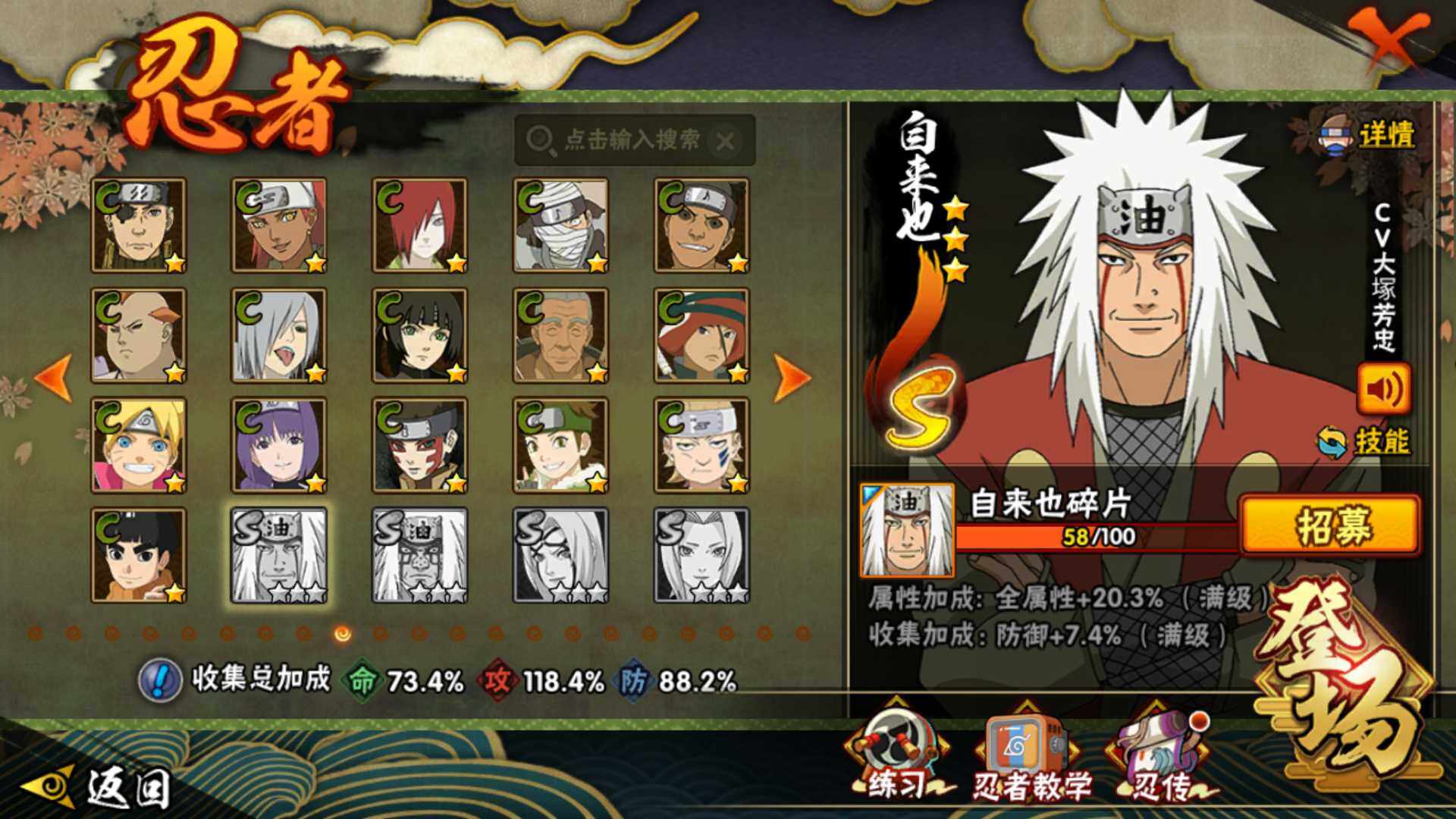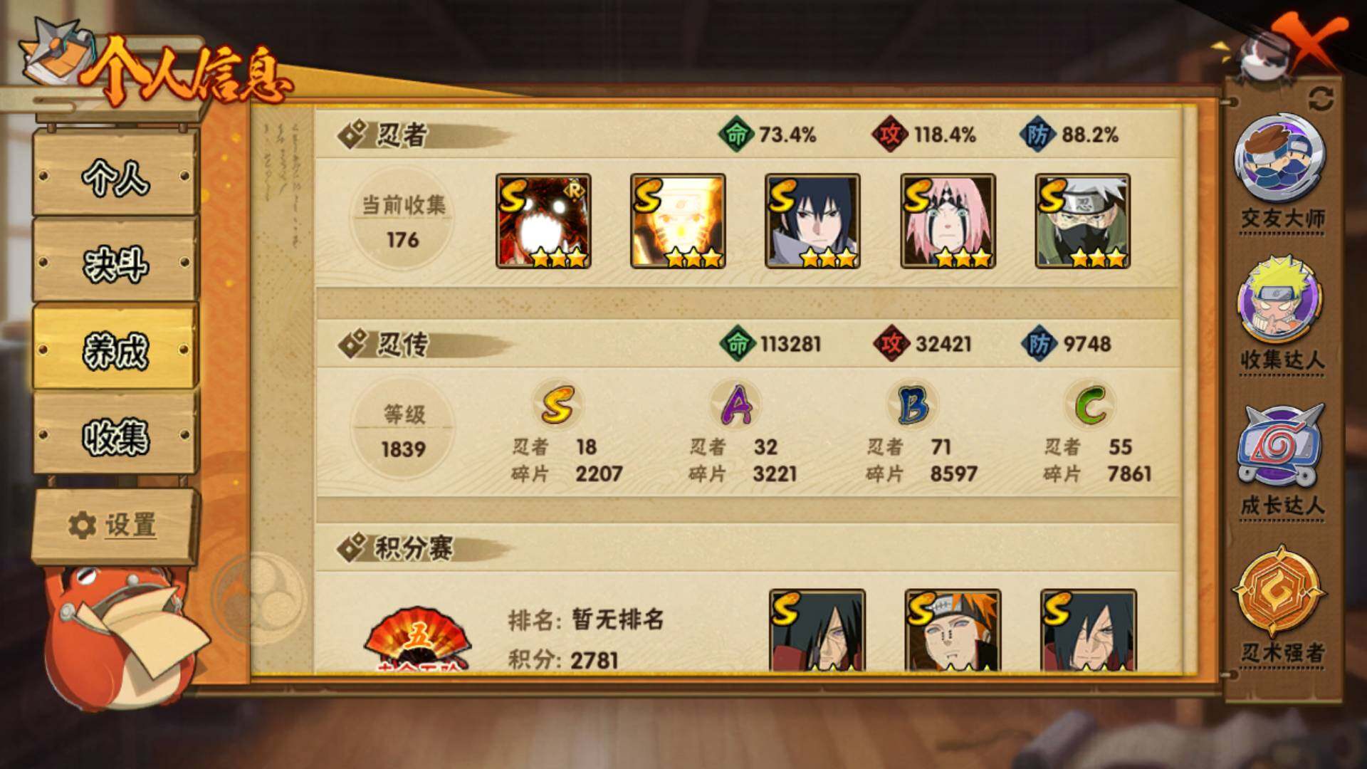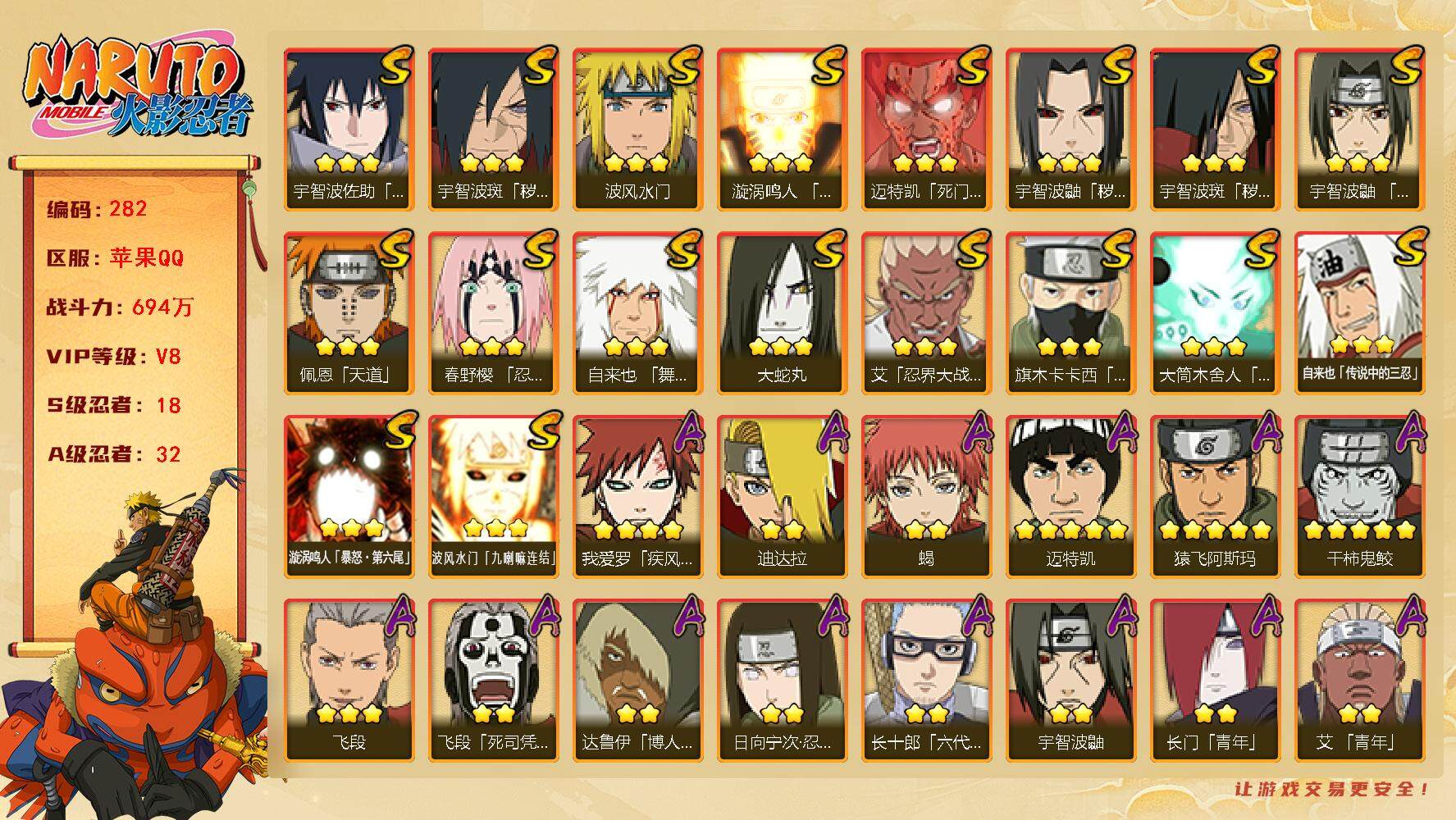 [14405434]v8,18s,32a,,694万战力,4000金币,1000限时点卷,自来也58片,止水87片,五影斑90片,热门a忍有秽土再不斩、真容卡卡西、秽土角都等。(王者连体77皮肤.传说2)yy1537 【s级忍者】:宇智波鼬「秽土转生」3星,宇智波斑「秽土转生」3星,宇智波斑「秽土转生·解」3星,春野樱「忍界大战」3星,艾「忍界大战」3星,宇智波鼬「须佐能乎」3星,旗木卡卡西「须佐能乎」3星,自来也「舞之豪杰」3星,大蛇丸3星,自来也「传说中的三忍」3星,波风水门3星,漩涡鸣人「九喇嘛连结」3星,迈特凯「死门」3星,佩恩「天道」3星,宇智波佐助「永恒万花筒」3星,大筒木舍人「最终章」3星,漩涡鸣人「暴怒·第六尾」3星,波风水门「九喇嘛连结」3星 【a级忍者】:艾「青年」2星,长门「青年」2星,波风水门「青年」2星,达鲁伊「博人传」2星,迪达拉2星,奇拉比2星,奇拉比「忍界大战」2星,飞段3星,飞段「死司凭血」2星,干柿鬼鲛5星,漩涡博人「桃式显现」2星,漩涡鸣人「九尾查克拉」2星,机械鸣人「初始形态」2星,迈特凯5星,旗木卡卡西「幻之真容」2星,桃地再不斩「秽土转生」2星,我爱罗「疾风传」4星,蝎2星,蝎「绯流琥」2星,角都「秽土转生」2星,猿飞阿斯玛5星,宇智波鼬2星,宇智波佐助「须佐能乎」2星,照美冥「五代目水影」2星,日向宁次「忍界大战」2星,长十郎「六代目水影」2星,李洛克「忍界大战」3星,黑土「博人传」2星,秋道丁次「忍界大战」2星,千代「近松十人卫」2星,神农「羁绊」2星,宇智波泉奈2星 【永久主场景】:博人传,木叶周年庆
