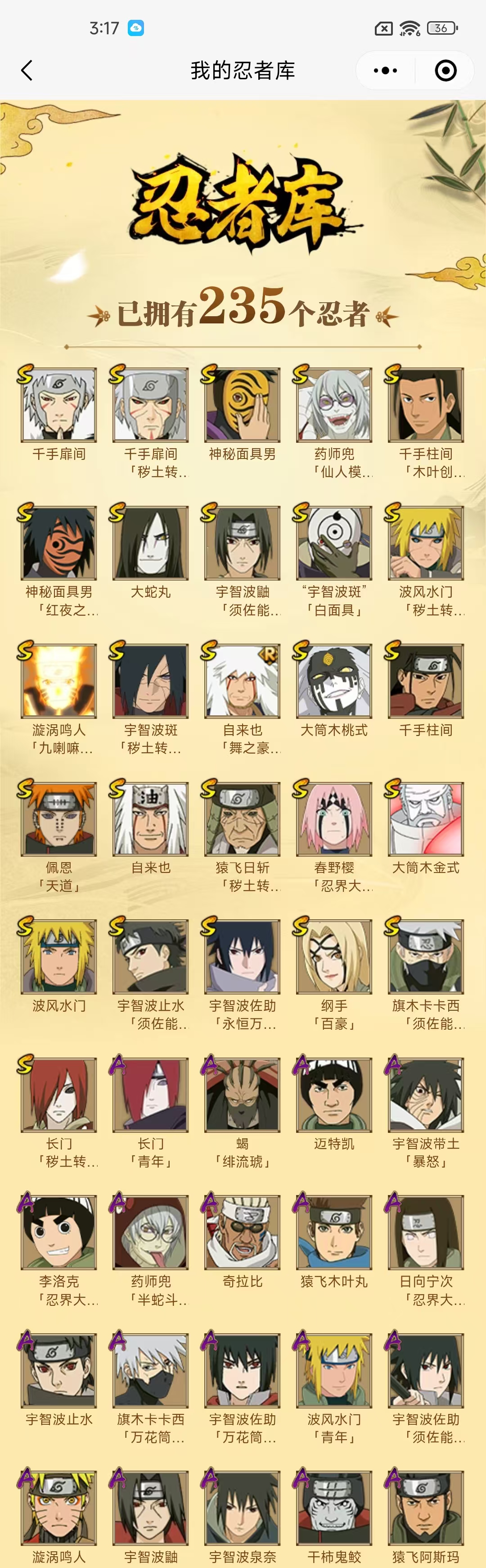 2213683-ios/26s忍/45a忍/战力1301w/v11/区服226 【s忍者】 宇智波止水「须佐能乎」,大筒木桃式,宇智波斑「秽土转生·解」,千手柱间「木叶创立」,宇智波佐助「永恒万花筒」,神秘面具男「红夜之刃」,春野樱「忍界大战」,大筒木金式,漩涡鸣人「九喇嘛连结」,自来也「舞之豪杰」,旗木卡卡西「须佐能乎」,药师兜「仙人模式」,宇智波斑「白面具」,千手扉间「秽土转生」,纲手「