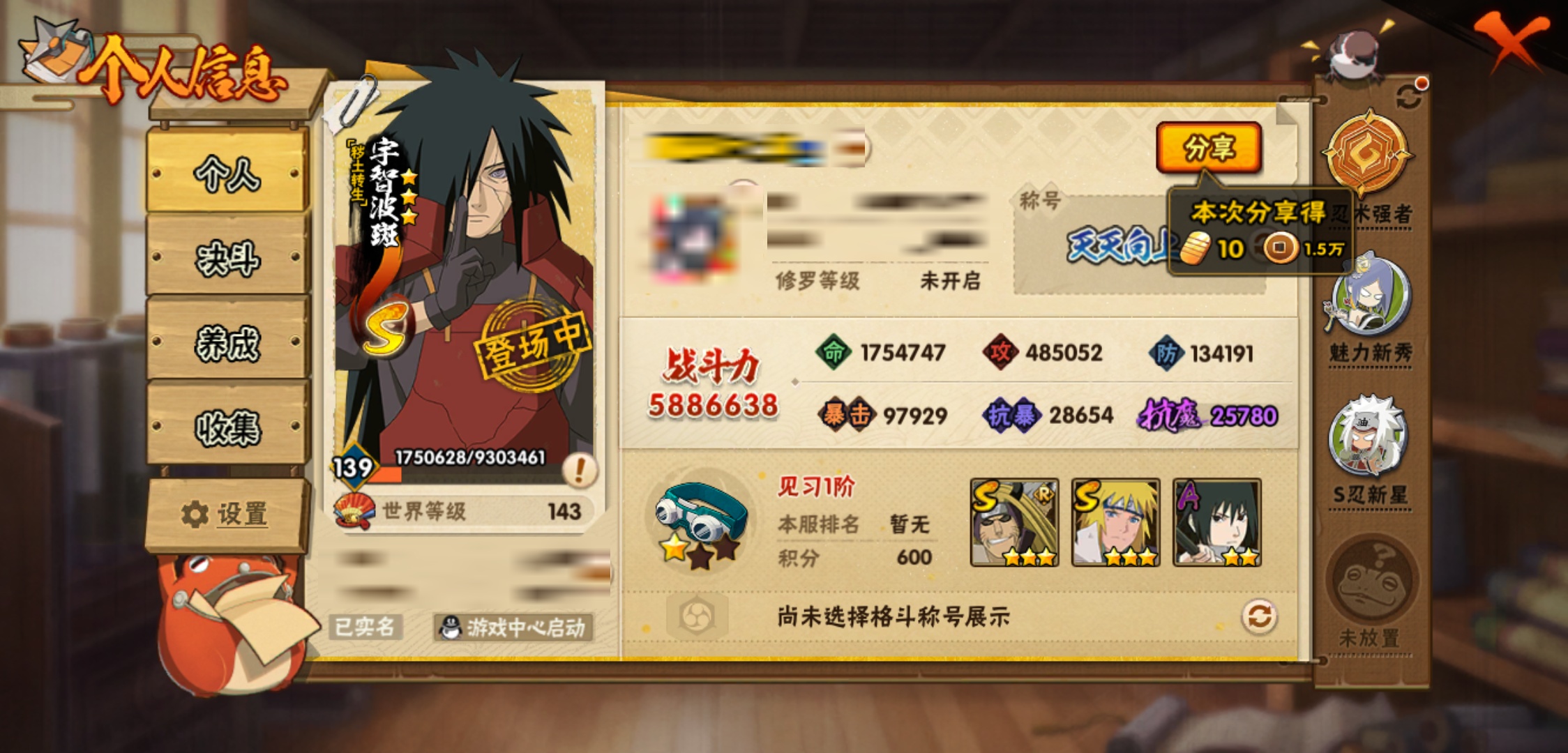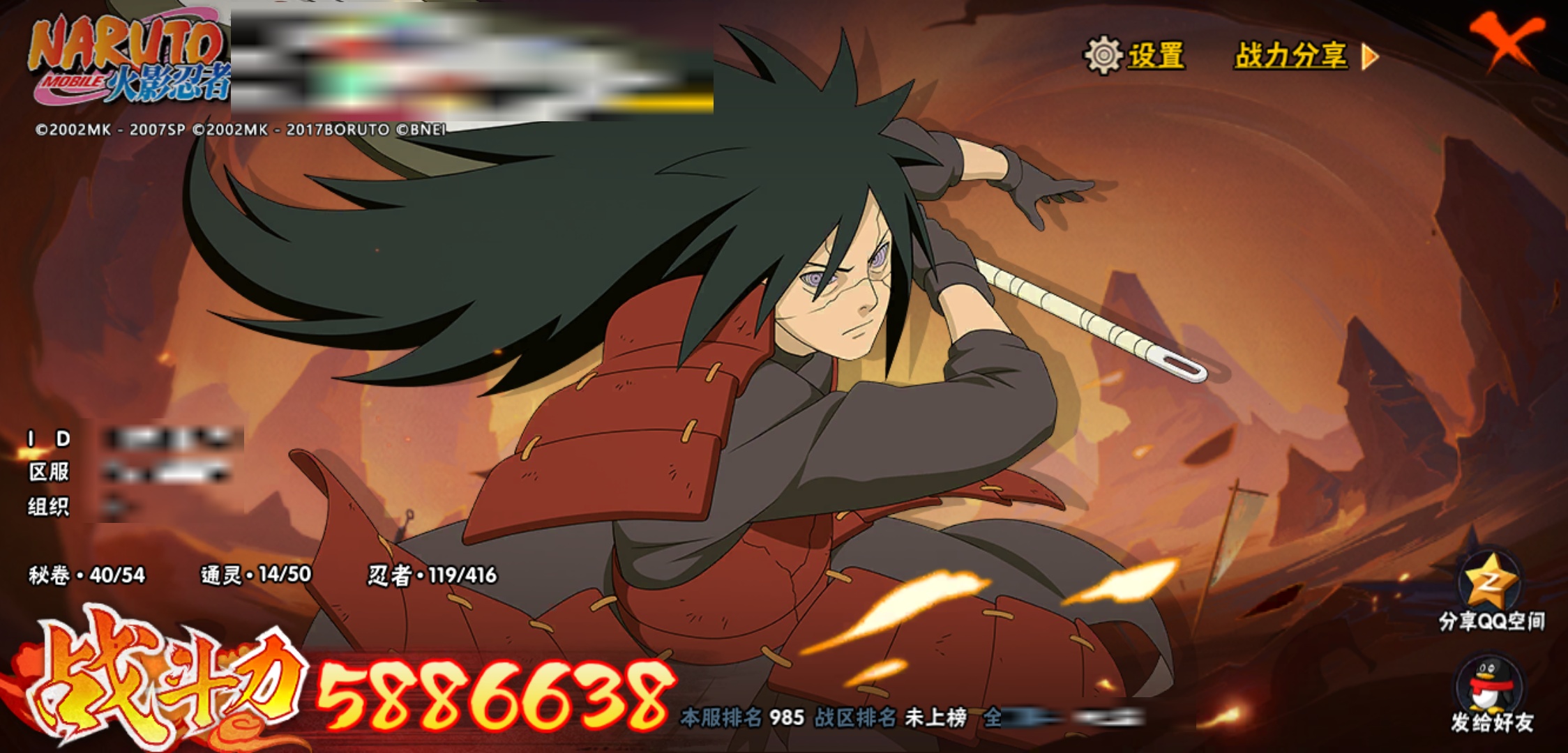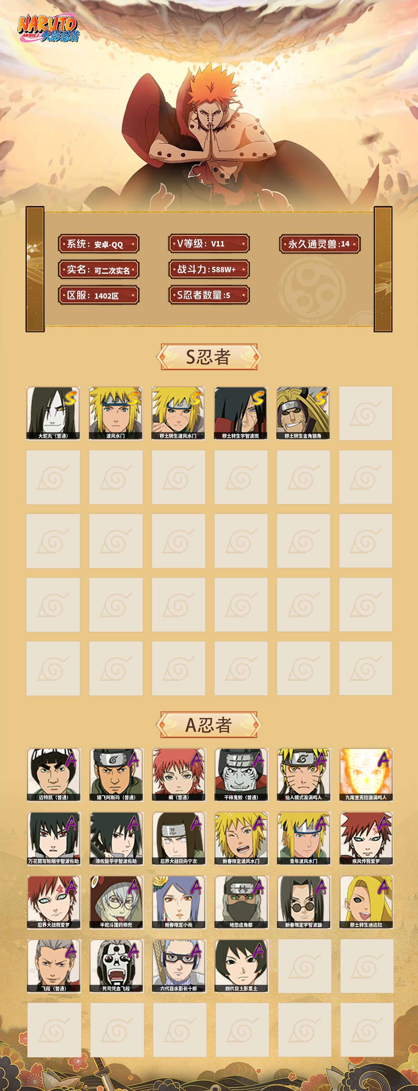 【火影忍者】【lyhy9085】战斗力:588w;段位:见习1阶;本服排名:985;vip:v11级;s忍:5个;a忍:22个;通灵兽:14个,s忍:大蛇丸(普通)|波风水门|秽土转生波风水门|秽土转生宇智波斑|秽土转生金角银角__a忍:迈特凯(普通) 5星|猿飞阿斯玛(普通) 4星|蝎(普通) 3星|干柿鬼鲛(普通) 3星|仙人模式漩涡鸣人|九尾查克拉漩涡鸣人|万花筒写轮眼宇智波佐助|须佐能乎宇智波佐助|忍界大战日向宁次|新春限定波风水门|青年波风水门|疾风传我爱罗|忍界大战我爱罗|半蛇斗篷药师兜|新春限定小南|地怨虞角都|新春限定宇智波鼬|秽土转生迪达拉|飞段(普通)|死司凭血飞段|六代目水影长十郎|四代目土影黑土__通灵兽:忍犬(普通)|蓝蛇|蛤蟆吉|忍龟|镰鼬|猿魔|山椒鱼|蜃|蛞蝓(普通)|蛤蟆仙人|鲛鲨|蛤蟆健|乌鸦(普通)|蛤蟆龙
