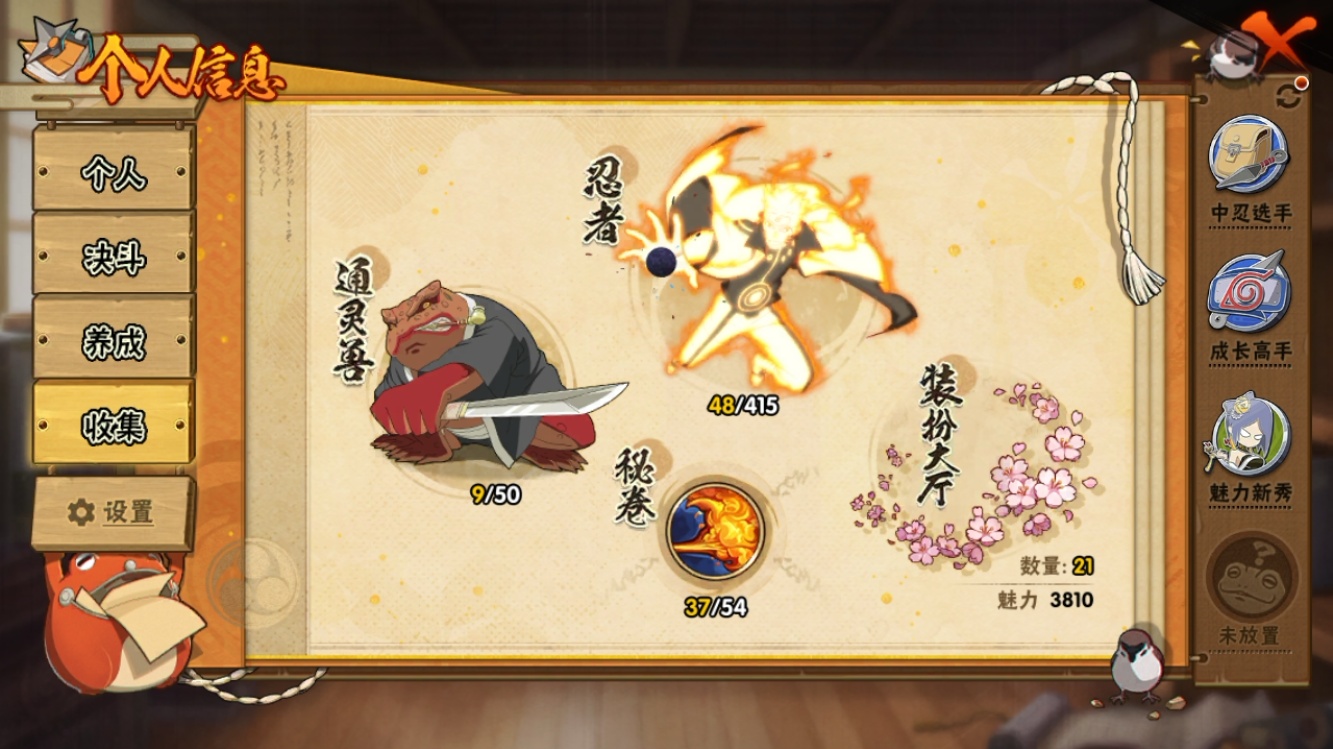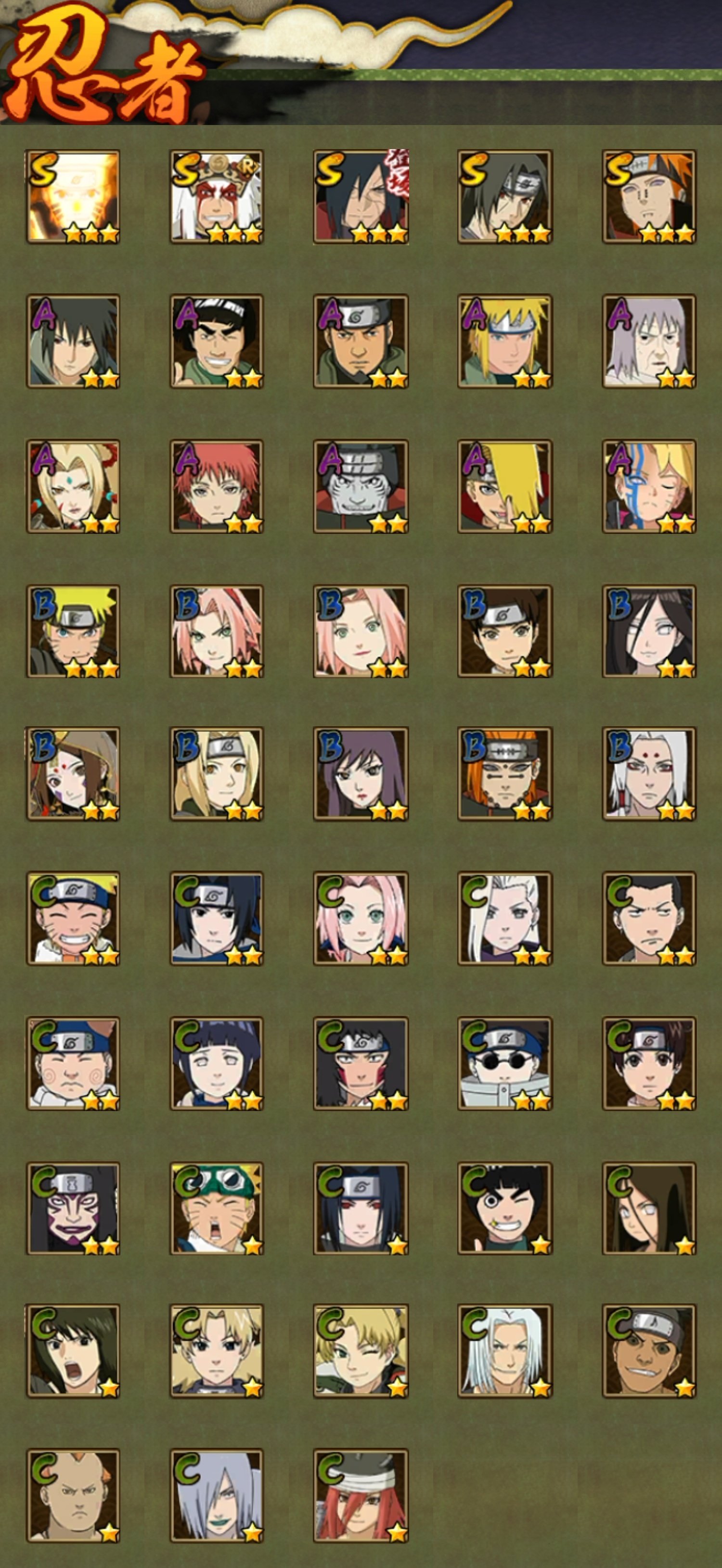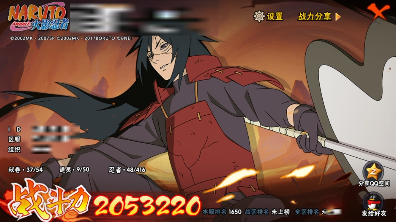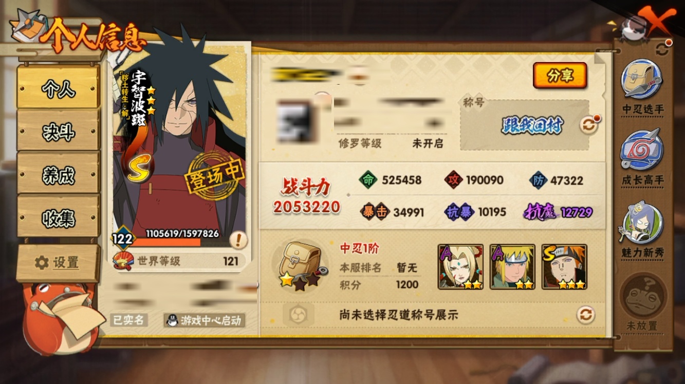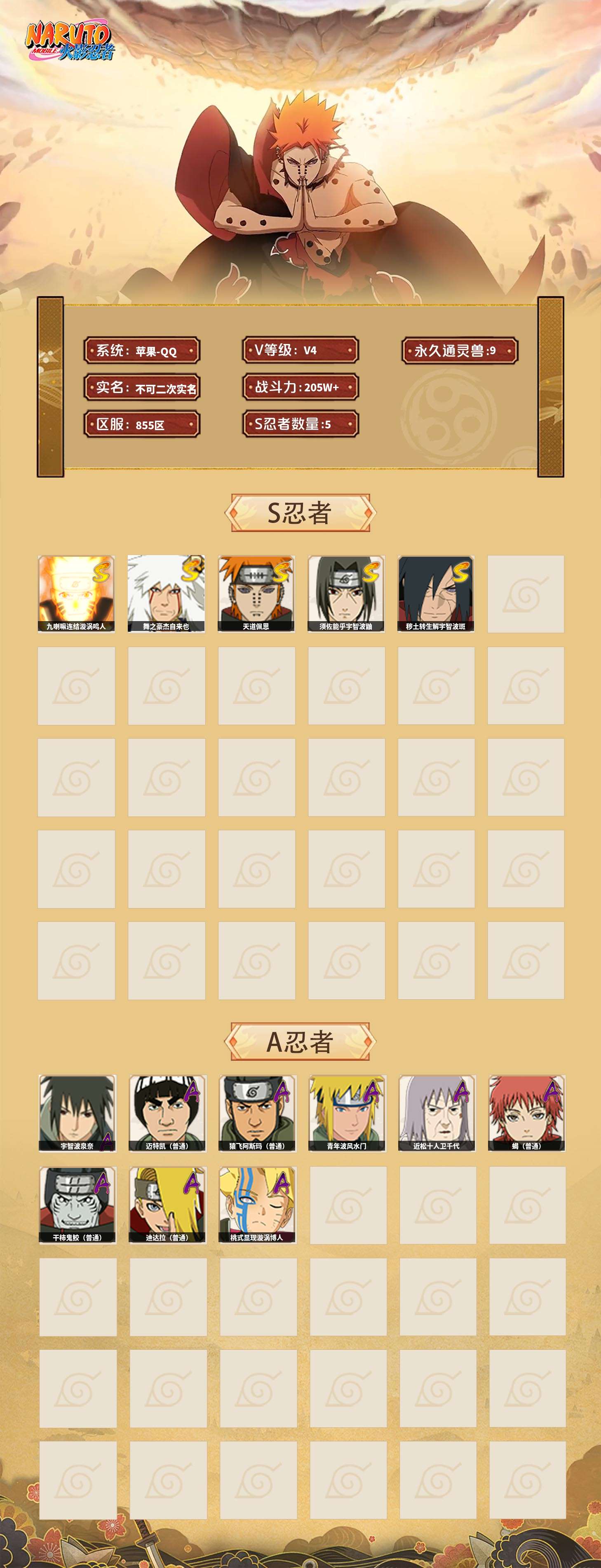 【火影忍者】【lyhy9083】战斗力:205w;段位:中忍1阶;本服排名:1650;vip:v4级;s忍:5个;a忍:9个;通灵兽:9个,s忍:九喇嘛连结漩涡鸣人|舞之豪杰自来也|天道佩恩|须佐能乎宇智波鼬|秽土转生解宇智波斑__a忍:宇智波泉奈|迈特凯(普通)|猿飞阿斯玛(普通)|青年波风水门|近松十人卫千代|蝎(普通)|干柿鬼鲛(普通)|迪达拉(普通)|桃式显现漩涡博人__通灵兽:忍犬(普通)|蓝蛇|蛤蟆吉|忍龟|镰鼬|猿魔|山椒鱼|砂之守鹤|蜃