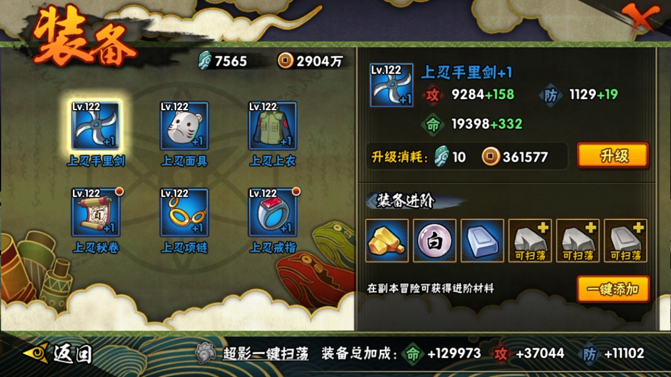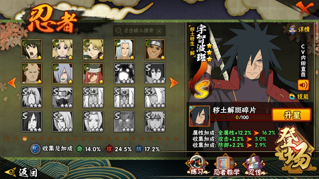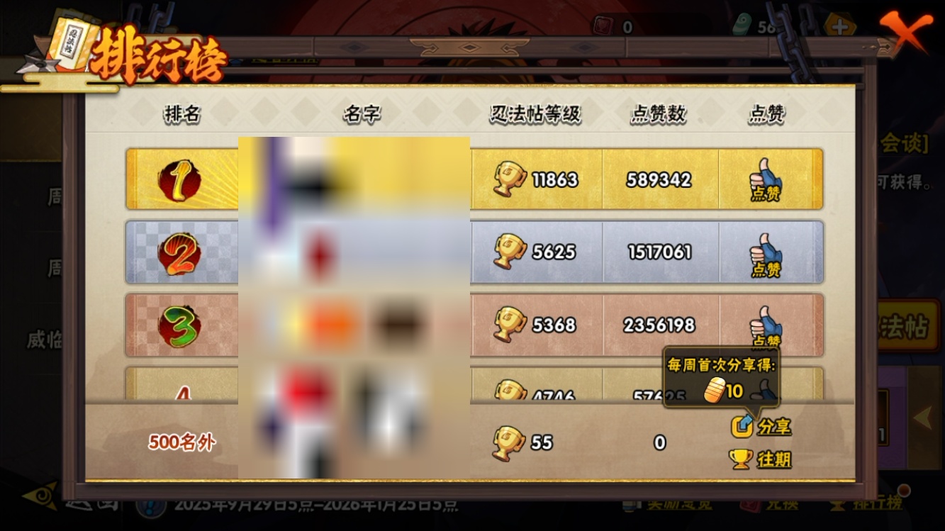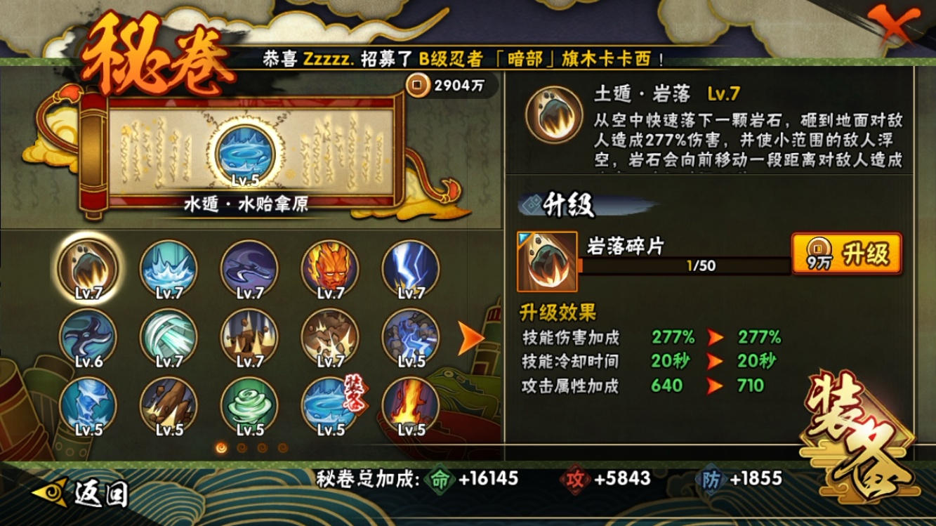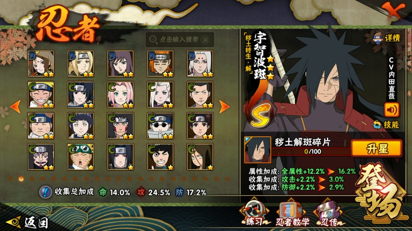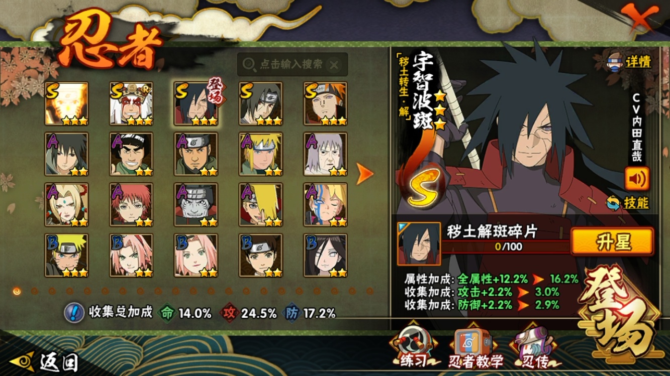 【火影忍者】【lyhy9083】战斗力:205w;段位:中忍1阶;本服排名:1650;vip:v4级;s忍:5个;a忍:9个;通灵兽:9个,s忍:九喇嘛连结漩涡鸣人|舞之豪杰自来也|天道佩恩|须佐能乎宇智波鼬|秽土转生解宇智波斑__a忍:宇智波泉奈|迈特凯(普通)|猿飞阿斯玛(普通)|青年波风水门|近松十人卫千代|蝎(普通)|干柿鬼鲛(普通)|迪达拉(普通)|桃式显现漩涡博人__通灵兽:忍犬(普通)|蓝蛇|蛤蟆吉|忍龟|镰鼬|猿魔|山椒鱼|砂之守鹤|蜃