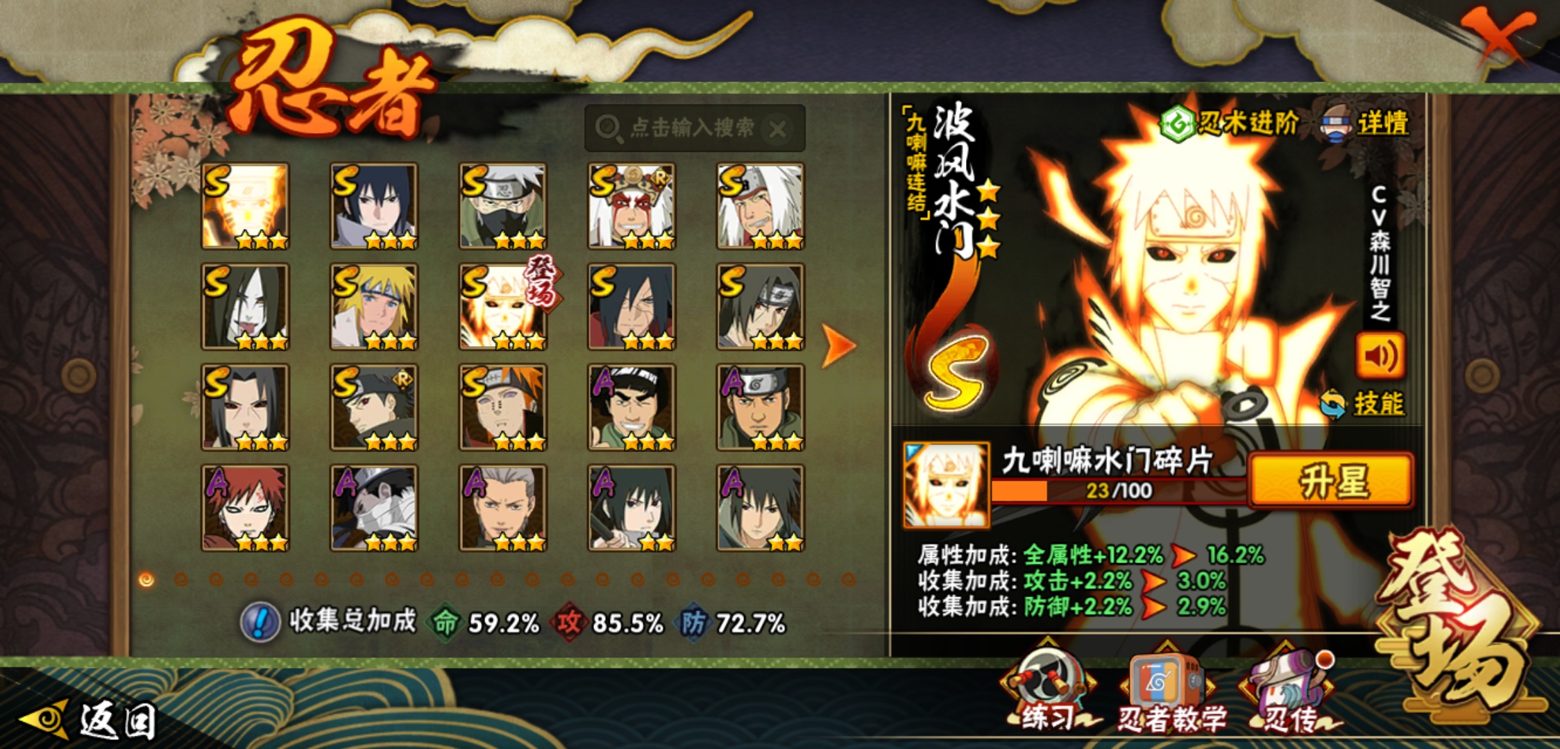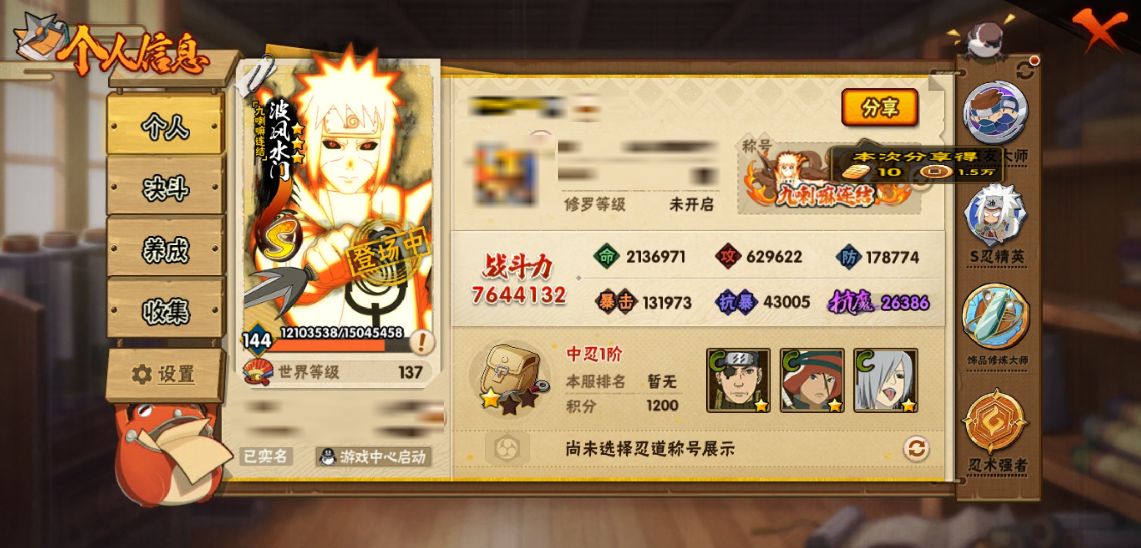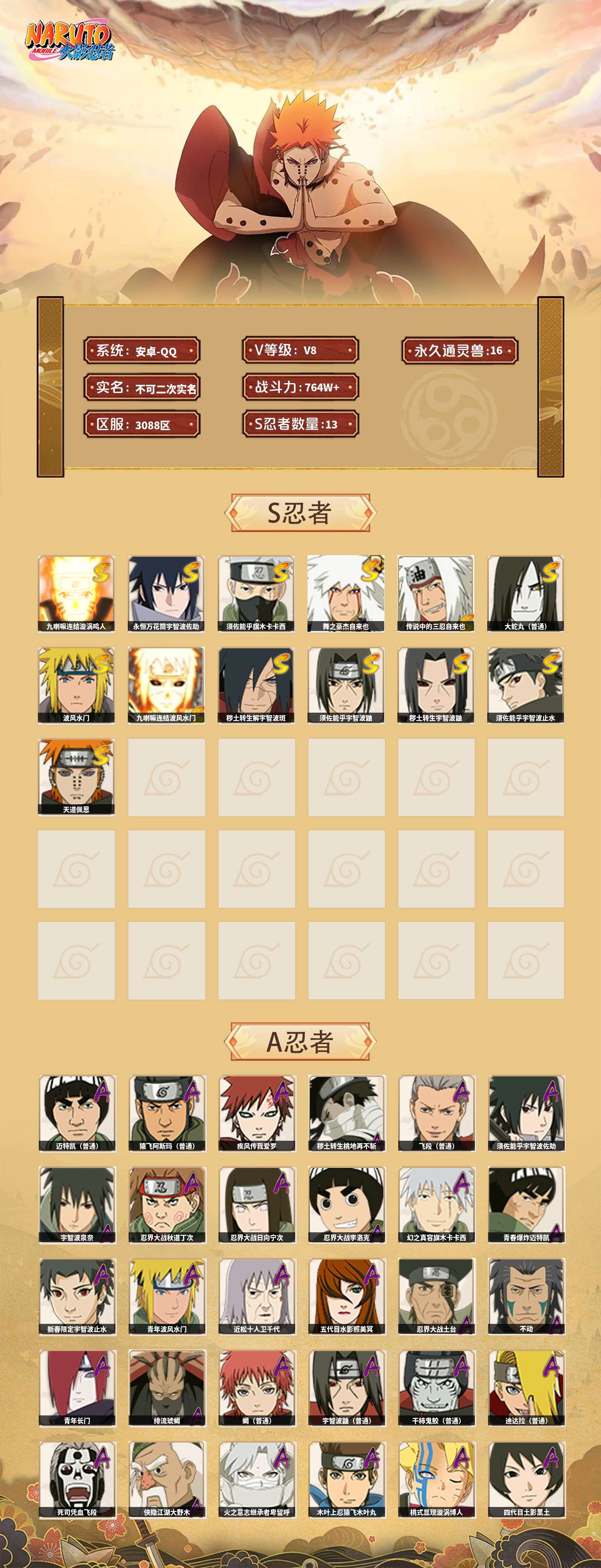 【火影忍者】【lyhy9082】战斗力:764w;段位:中忍1阶;本服排名:780;vip:v8级;s忍:13个;a忍:30个;通灵兽:16个,s忍:九喇嘛连结漩涡鸣人|永恒万花筒宇智波佐助|须佐能乎旗木卡卡西|舞之豪杰自来也|传说中的三忍自来也|大蛇丸(普通)|波风水门|九喇嘛连结波风水门|秽土转生解宇智波斑|须佐能乎宇智波鼬|秽土转生宇智波鼬|须佐能乎宇智波止水|天道佩恩__a忍:迈特凯(普通) 3星|猿飞阿斯玛(普通) 3星|疾风传我爱罗 3星|秽土转生桃地再不斩 3星|飞段(普通) 3星|须佐能乎宇智波佐助|宇智波泉奈|忍界大战秋道丁次|忍界大战日向宁次|忍界大战李洛克|幻之真容旗木卡卡西|青春爆炸迈特凯|新春限定宇智波止水|青年波风水门|近松十人卫千代|五代目水影照美冥|忍界大战土台|不动|青年长门|绯流琥蝎|蝎(普通)|宇智波鼬(普通)|干柿鬼鲛(普通)|迪达拉(普通)|死司凭血飞段|侠隐江湖大野木|火之意志继承者卑留呼|木叶上忍猿飞木叶丸|桃式显现漩涡博人|四代目土影黑土__通灵兽:忍犬(普通)|蓝蛇|蛤蟆吉|砂之守鹤|忍龟|镰鼬|猿魔|山椒鱼|蜃|蛤蟆仙人|鲛鲨|蛤蟆健|乌鸦(普通)|蛞蝓(普通)|蛤蟆龙|蛤蟆广