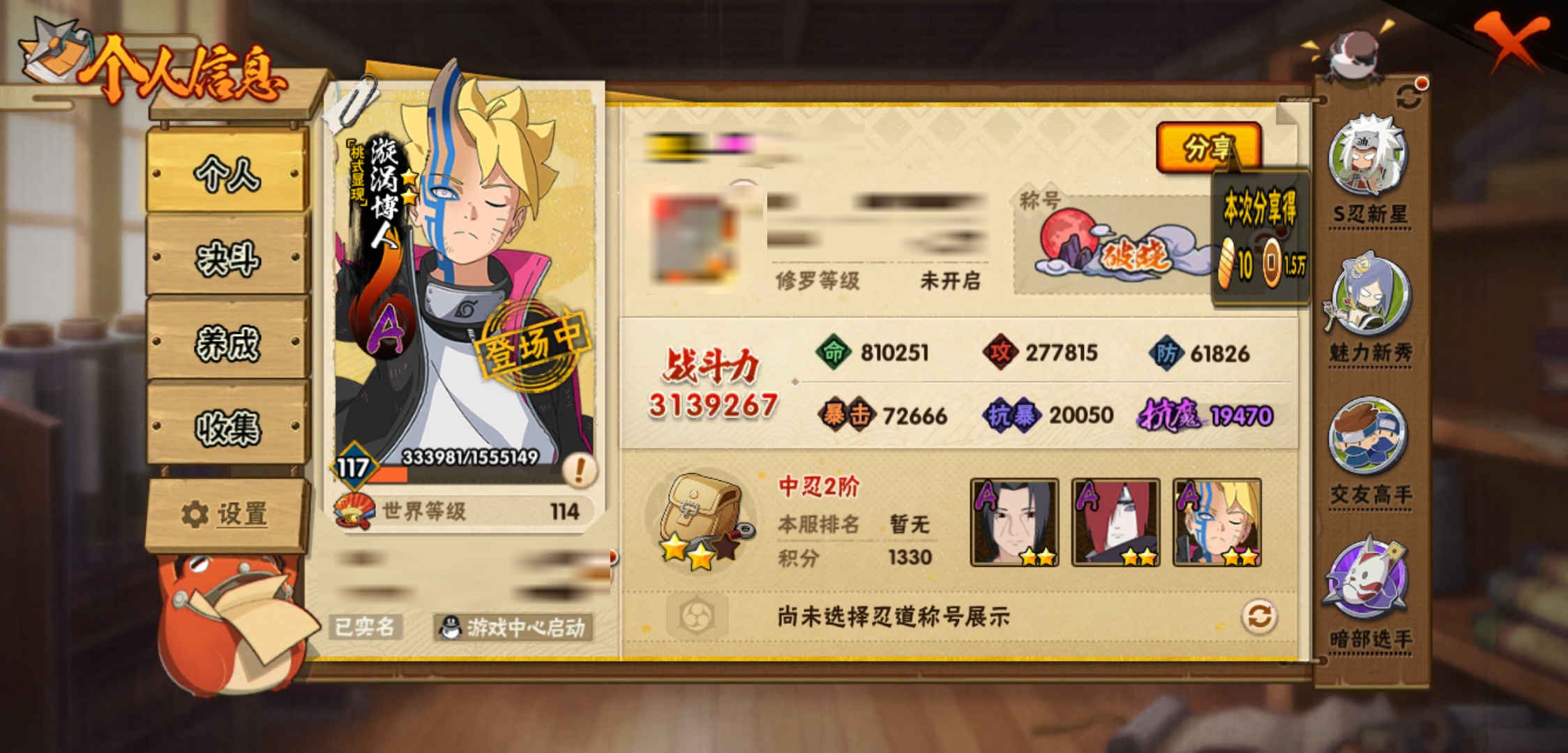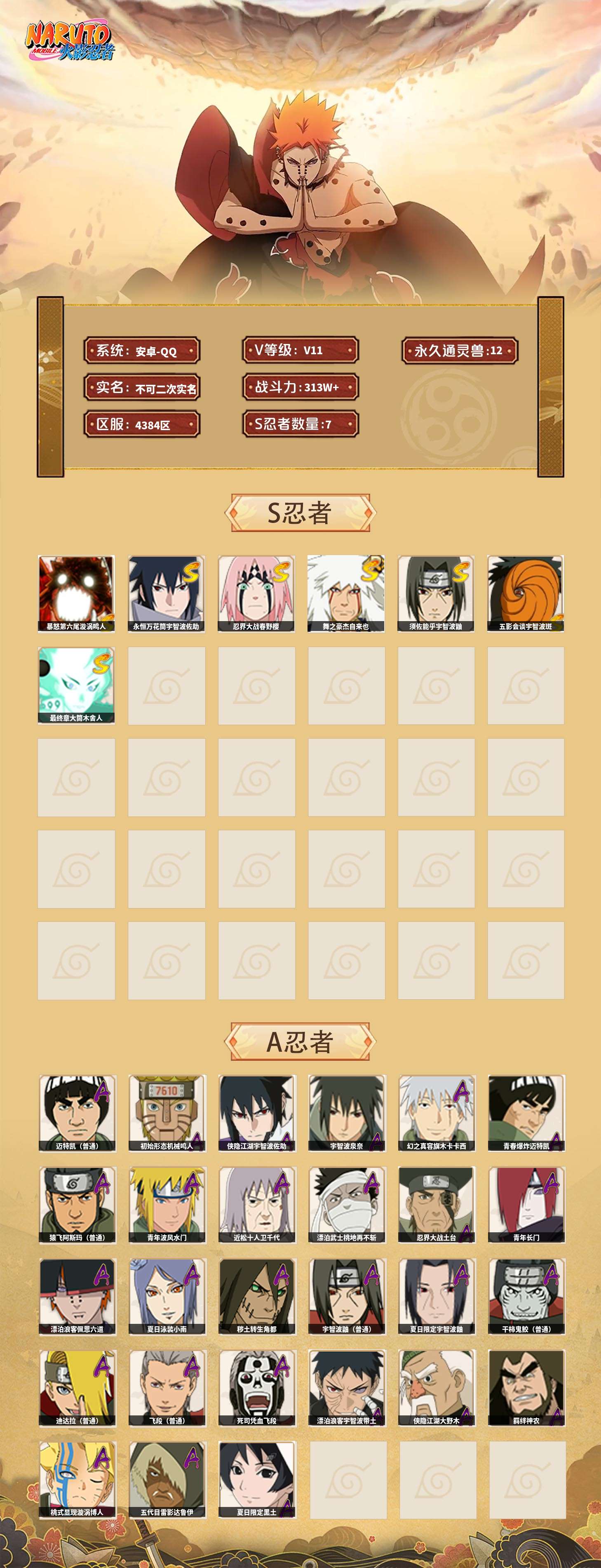 【火影忍者】【lyhy9090】战斗力:313w;段位:中忍2阶;本服排名:500;vip:v11级;s忍:7个;a忍:27个;通灵兽:12个,s忍:暴怒第六尾漩涡鸣人|永恒万花筒宇智波佐助|忍界大战春野樱|舞之豪杰自来也|须佐能乎宇智波鼬|五影会谈宇智波斑|最终章大筒木舍人__a忍:迈特凯(普通) 3星|初始形态机械鸣人|侠隐江湖宇智波佐助|宇智波泉奈|幻之真容旗木卡卡西|青春爆炸迈特凯|猿飞阿斯玛(普通)|青年波风水门|近松十人卫千代|漂泊武士桃地再不斩|忍界大战土台|青年长门|漂泊浪客佩恩六道|夏日泳装小南|秽土转生角都|宇智波鼬(普通)|夏日限定宇智波鼬|干柿鬼鲛(普通)|迪达拉(普通)|飞段(普通)|死司凭血飞段|漂泊浪客宇智波带土|侠隐江湖大野木|羁绊神农|桃式显现漩涡博人|五代目雷影达鲁伊|夏日限定黑土__通灵兽:忍犬(普通)|蓝蛇|蛤蟆吉|砂之守鹤|忍龟|镰鼬|猿魔|山椒鱼|蛞蝓(普通)|蜃|蛤蟆仙人|鲛鲨
