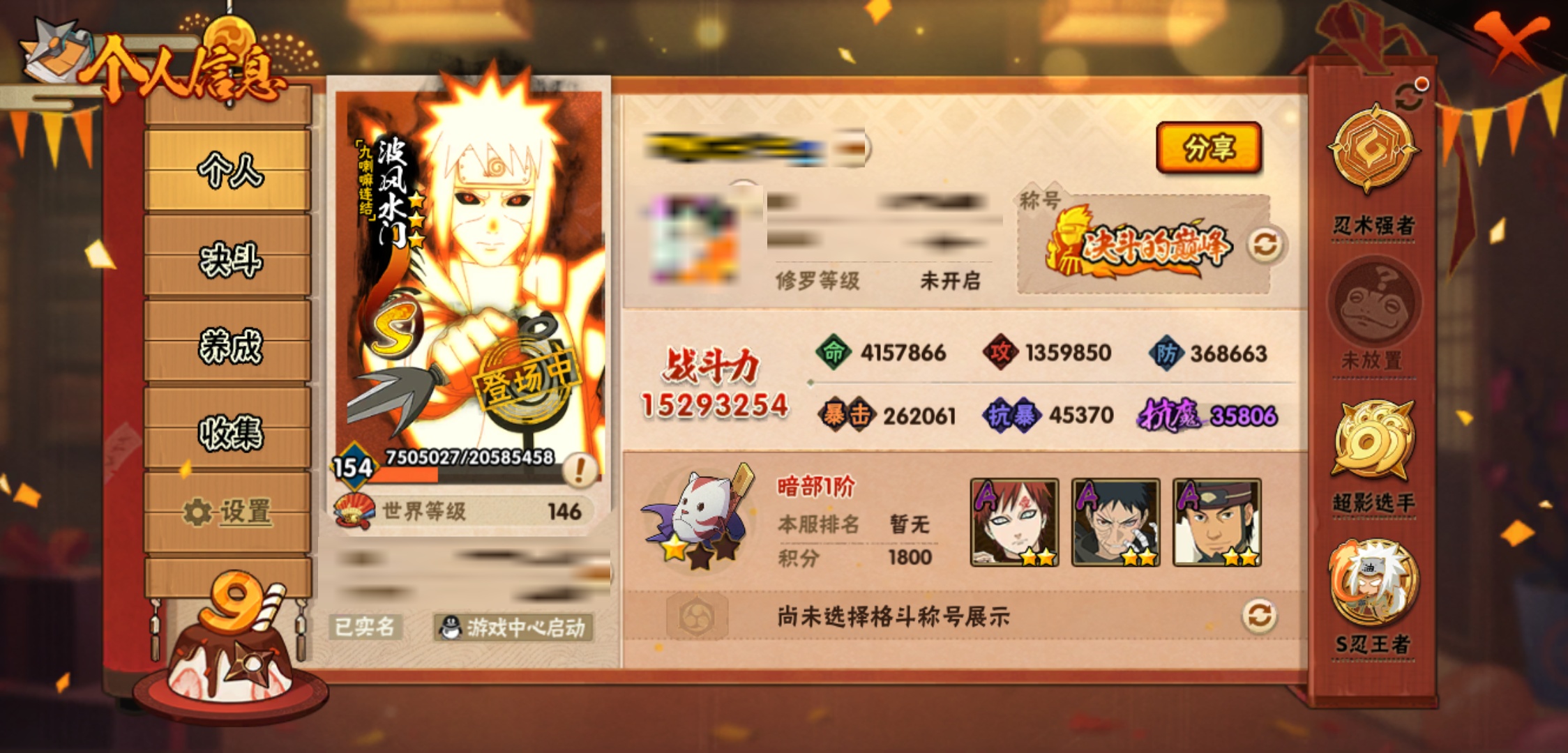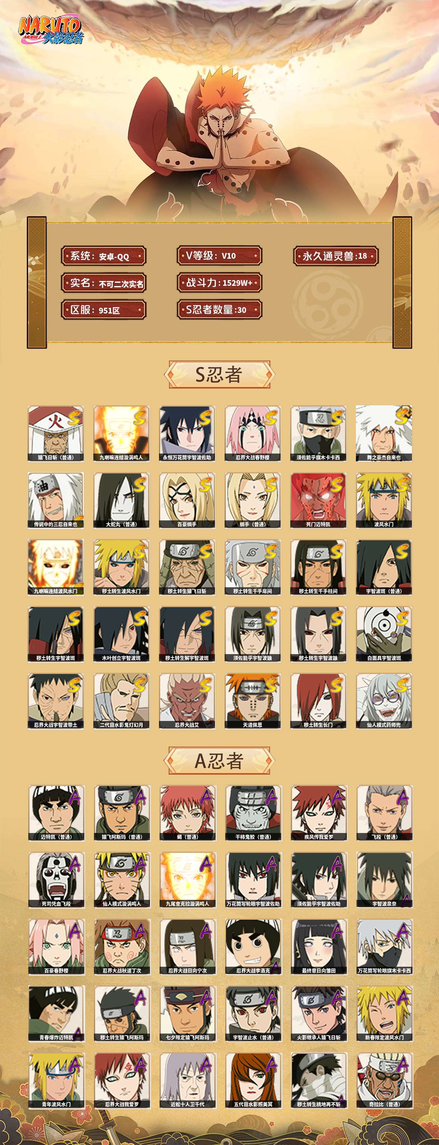 【火影忍者】【lyhy9084】战斗力:1529w;段位:暗部1阶;本服排名:212;vip:v10级;s忍:30个;a忍:49个;通灵兽:18个,s忍:猿飞日斩(普通) 4星|九喇嘛连结漩涡鸣人|永恒万花筒宇智波佐助|忍界大战春野樱|须佐能乎旗木卡卡西|舞之豪杰自来也|传说中的三忍自来也|大蛇丸(普通)|百豪纲手|纲手(普通)|死门迈特凯|波风水门|九喇嘛连结波风水门|秽土转生波风水门|秽土转生猿飞日斩|秽土转生千手扉间|秽土转生千手柱间|宇智波斑(普通)|秽土转生宇智波斑|木叶创立宇智波斑|秽土转生解宇智波斑|须佐能乎宇智波鼬|秽土转生宇智波鼬|白面具宇智波斑|忍界大战宇智波带土|二代目水影鬼灯幻月|忍界大战艾|天道佩恩|秽土转生长门|仙人模式药师兜__a忍:迈特凯(普通) 5星|猿飞阿斯玛(普通) 5星|蝎(普通) 5星|干柿鬼鲛(普通) 5星|疾风传我爱罗 4星|飞段(普通) 4星|死司凭血飞段 4星|仙人模式漩涡鸣人|九尾查克拉漩涡鸣人|万花筒写轮眼宇智波佐助|须佐能乎宇智波佐助|宇智波泉奈|百豪春野樱|忍界大战秋道丁次|忍界大战日向宁次|忍界大战李洛克|最终章日向雏田|万花筒写轮眼旗木卡卡西|青春爆炸迈特凯|秽土转生猿飞阿斯玛|七夕限定猿飞阿斯玛|宇智波止水(普通)|火影继承人猿飞日斩|新春限定波风水门|青年波风水门|忍界大战我爱罗|近松十人卫千代|五代目水影照美冥|秽土转生桃地再不斩|奇拉比(普通)|忍界大战奇拉比|青年艾|半蛇斗篷药师兜|不动|青年长门|小南(普通)|夏日泳装小南|晓大蛇丸|绯流琥蝎|宇智波鼬(普通)|迪达拉(普通)|秽土转生迪达拉|漂泊浪客宇智波带土|侠隐江湖大野木|木叶上忍猿飞木叶丸|五代目雷影达鲁伊|六代目水影长十郎|桃式显现漩涡博人|四代目土影黑土__通灵兽:忍犬(普通)|蓝蛇|蛤蟆吉|忍龟|镰鼬|猿魔|山椒鱼|蜃|蛤蟆仙人|鲛鲨|蛤蟆健|乌鸦(普通)|蛤蟆龙|砂之守鹤|蛤蟆广|蛞蝓(普通)|辛牙|梦貘