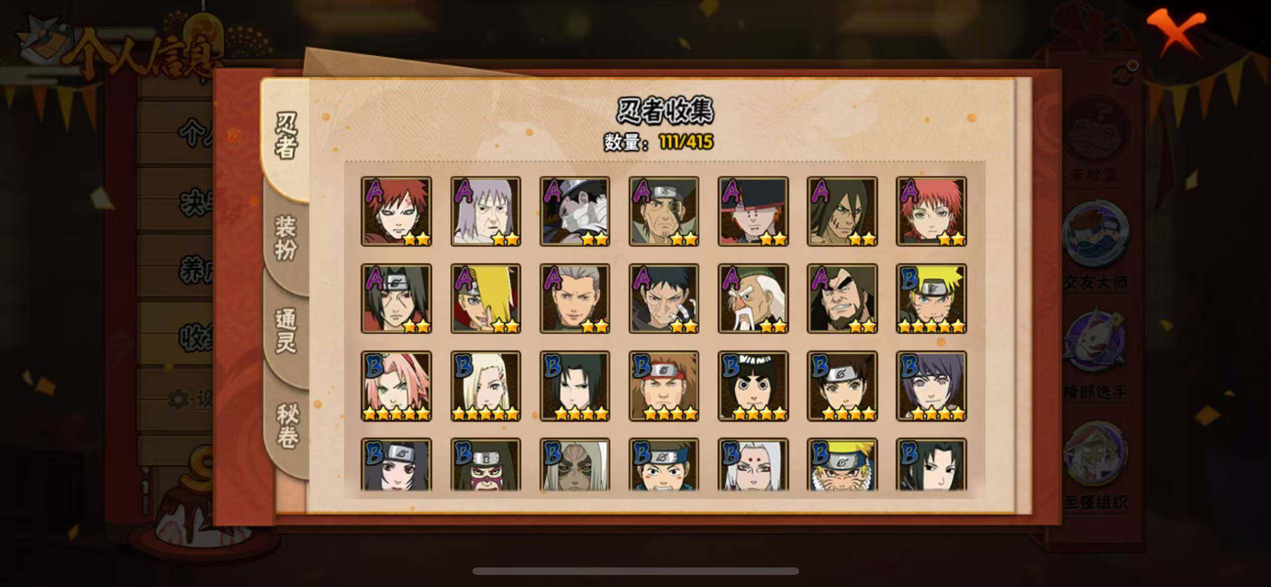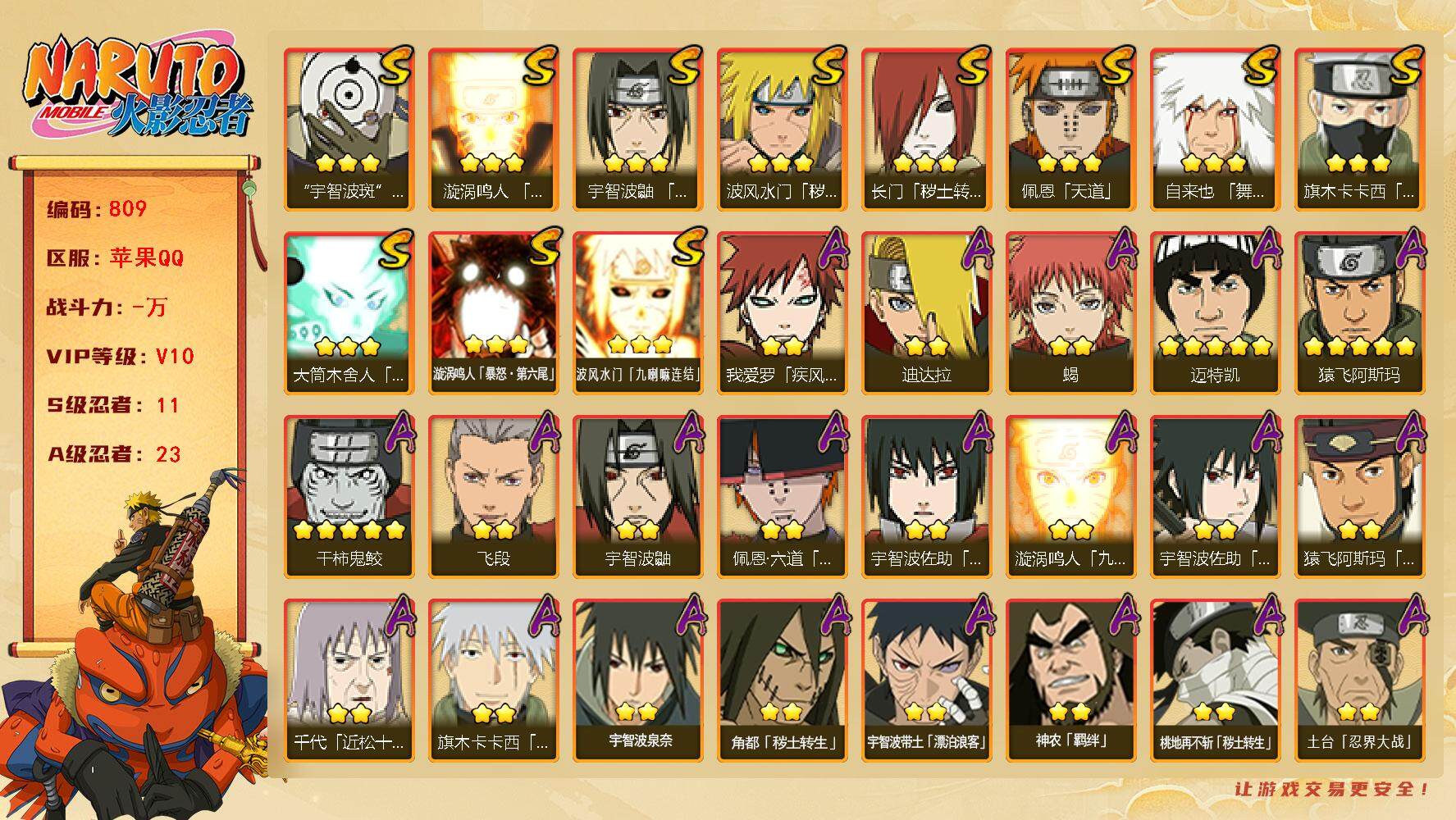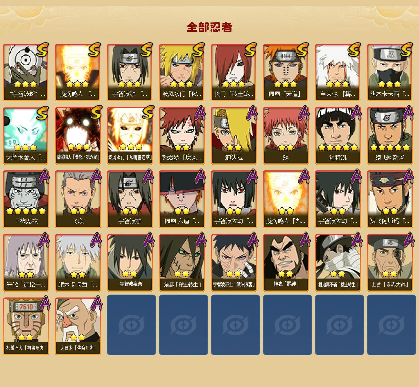[14409004]11s级忍者数-23a级忍者数 战力743万 纲手72片 宇智波斑80片 cc8404 【s级忍者】:长门「秽土转生」3星,波风水门「秽土转生」3星,宇智波鼬「须佐能乎」3星,旗木卡卡西「须佐能乎」3星,自来也「舞之豪杰」3星,漩涡鸣人「九喇嘛连结」3星,佩恩「天道」3星,宇智波斑 「白面具」3星宇智波斑「白面具」,大筒木舍人「最终章」3星,漩涡鸣人「暴怒·第六尾」3星,波风水门「九喇嘛连结」3星 【a级忍者】:迪达拉2星,飞段2星,干柿鬼鲛5星,漩涡鸣人「九尾查克拉」2星,机械鸣人「初始形态」2星,迈特凯5星,旗木卡卡西「幻之真容」2星,桃地再不斩「秽土转生」2星,我爱罗「疾风传」2星,蝎2星,角都「秽土转生」2星,猿飞阿斯玛5星,猿飞阿斯玛「七夕限定」2星,宇智波鼬2星,宇智波佐助「须佐能乎」2星,宇智波佐助「万花筒写轮眼」2星,宇智波带土「漂泊浪客」2星,佩恩·六道「漂泊浪客」2星,千代「近松十人卫」2星,神农「羁绊」2星,土台「忍界大战」2星,宇智波泉奈2星,大野木「侠隐江湖」2星