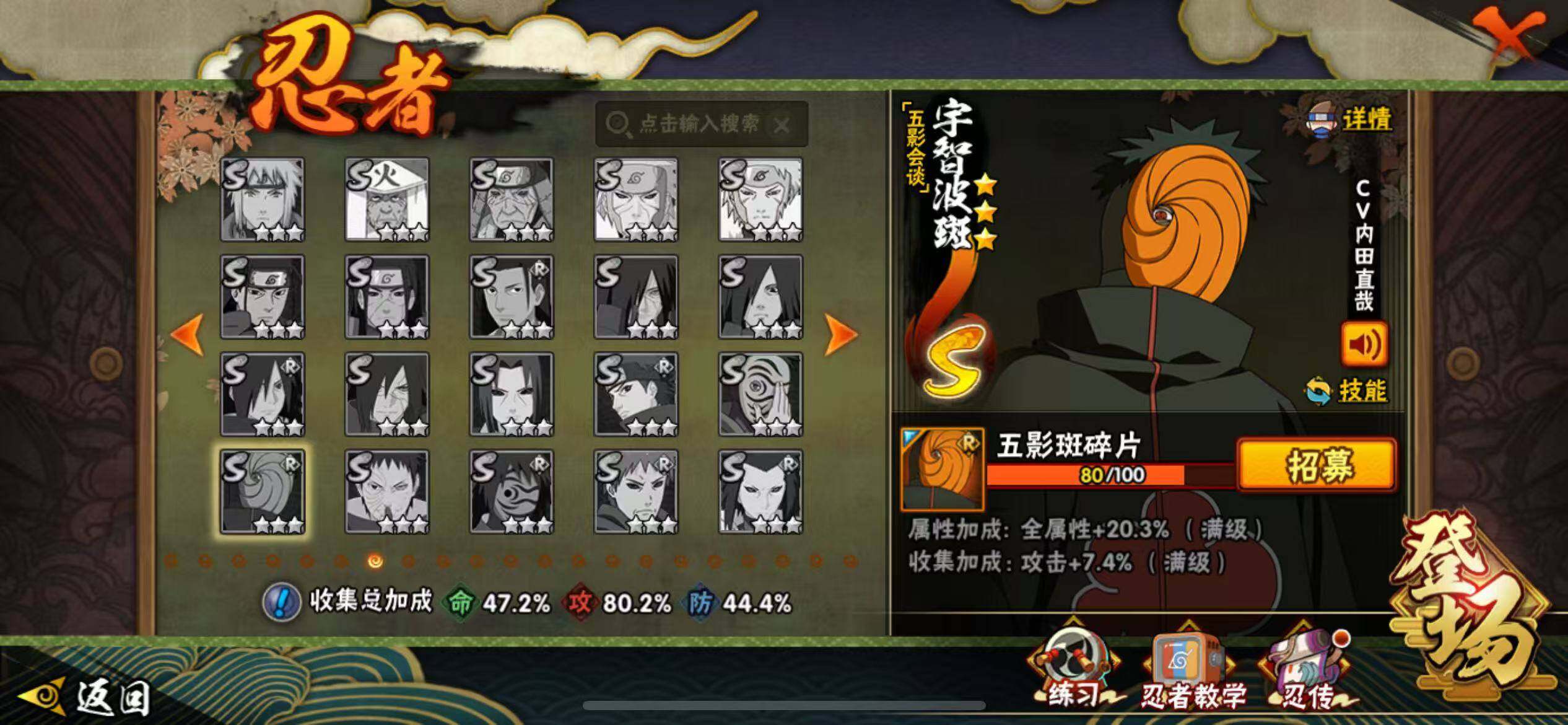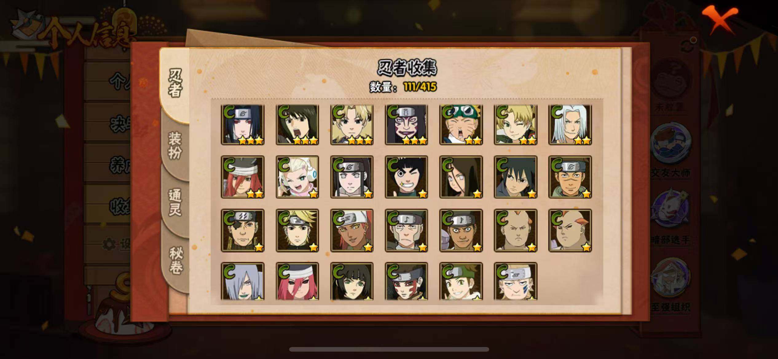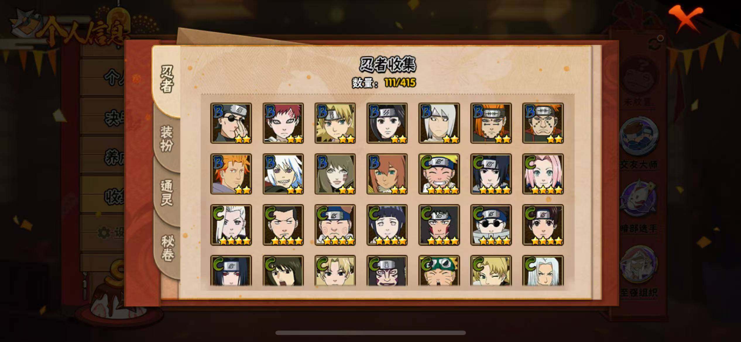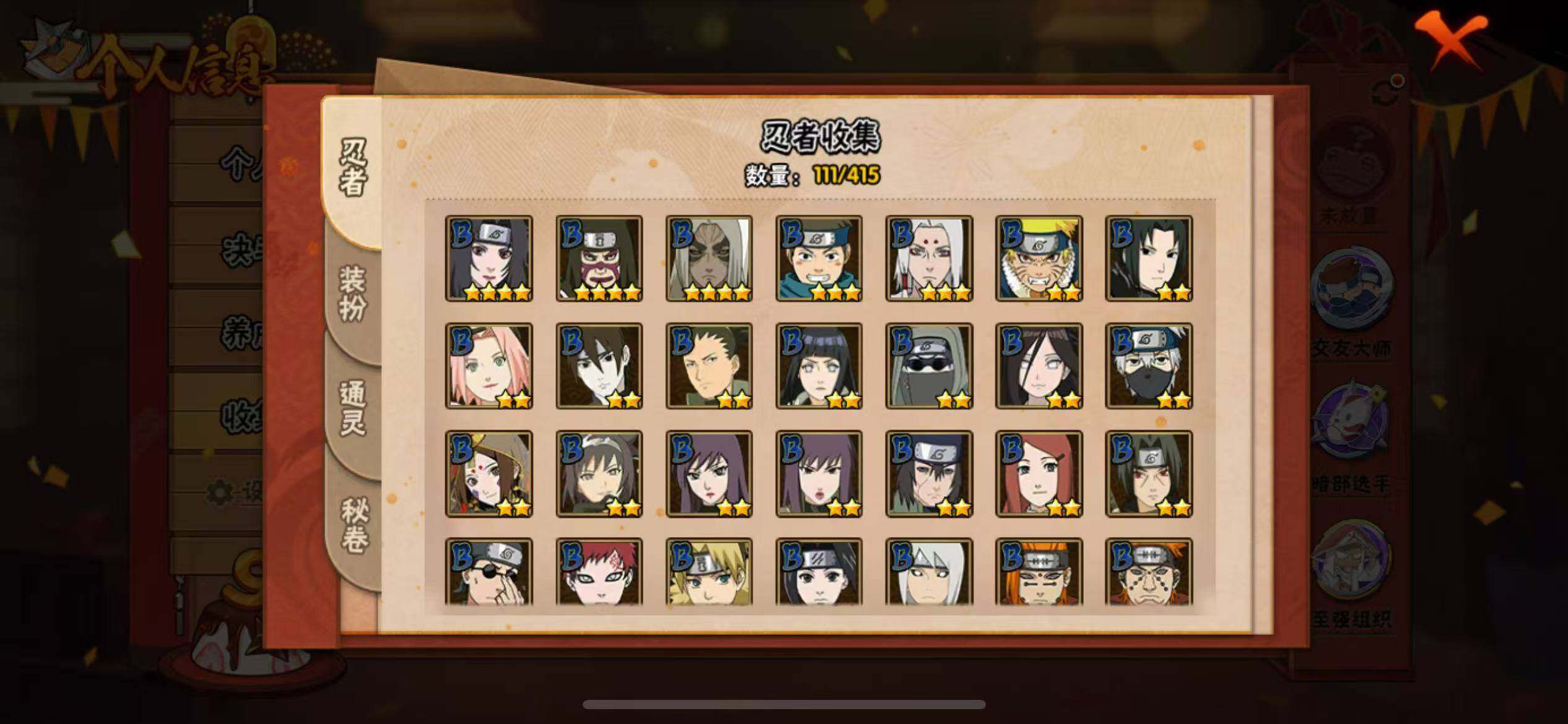 [14409004]11s级忍者数-23a级忍者数 战力743万 纲手72片 宇智波斑80片 cc8404 【s级忍者】:长门「秽土转生」3星,波风水门「秽土转生」3星,宇智波鼬「须佐能乎」3星,旗木卡卡西「须佐能乎」3星,自来也「舞之豪杰」3星,漩涡鸣人「九喇嘛连结」3星,佩恩「天道」3星,宇智波斑 「白面具」3星宇智波斑「白面具」,大筒木舍人「最终章」3星,漩涡鸣人「暴怒·第六尾」3星,波风水门「九喇嘛连结」3星 【a级忍者】:迪达拉2星,飞段2星,干柿鬼鲛5星,漩涡鸣人「九尾查克拉」2星,机械鸣人「初始形态」2星,迈特凯5星,旗木卡卡西「幻之真容」2星,桃地再不斩「秽土转生」2星,我爱罗「疾风传」2星,蝎2星,角都「秽土转生」2星,猿飞阿斯玛5星,猿飞阿斯玛「七夕限定」2星,宇智波鼬2星,宇智波佐助「须佐能乎」2星,宇智波佐助「万花筒写轮眼」2星,宇智波带土「漂泊浪客」2星,佩恩·六道「漂泊浪客」2星,千代「近松十人卫」2星,神农「羁绊」2星,土台「忍界大战」2星,宇智波泉奈2星,大野木「侠隐江湖」2星