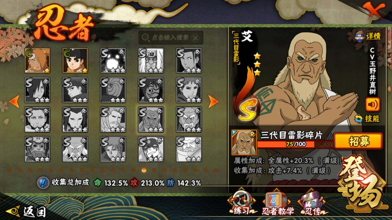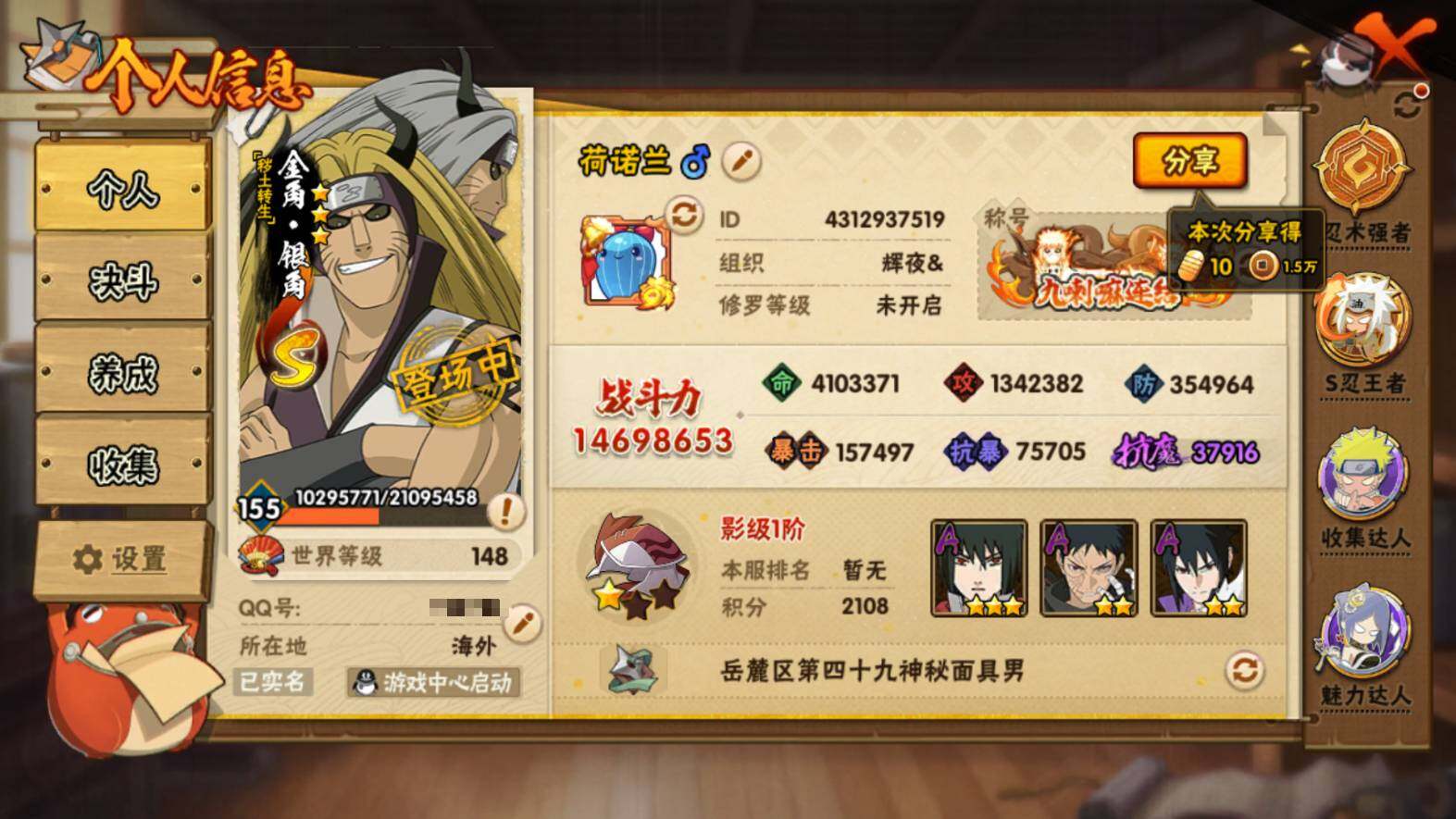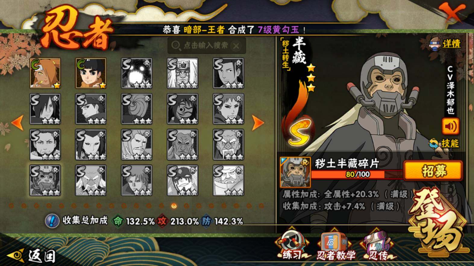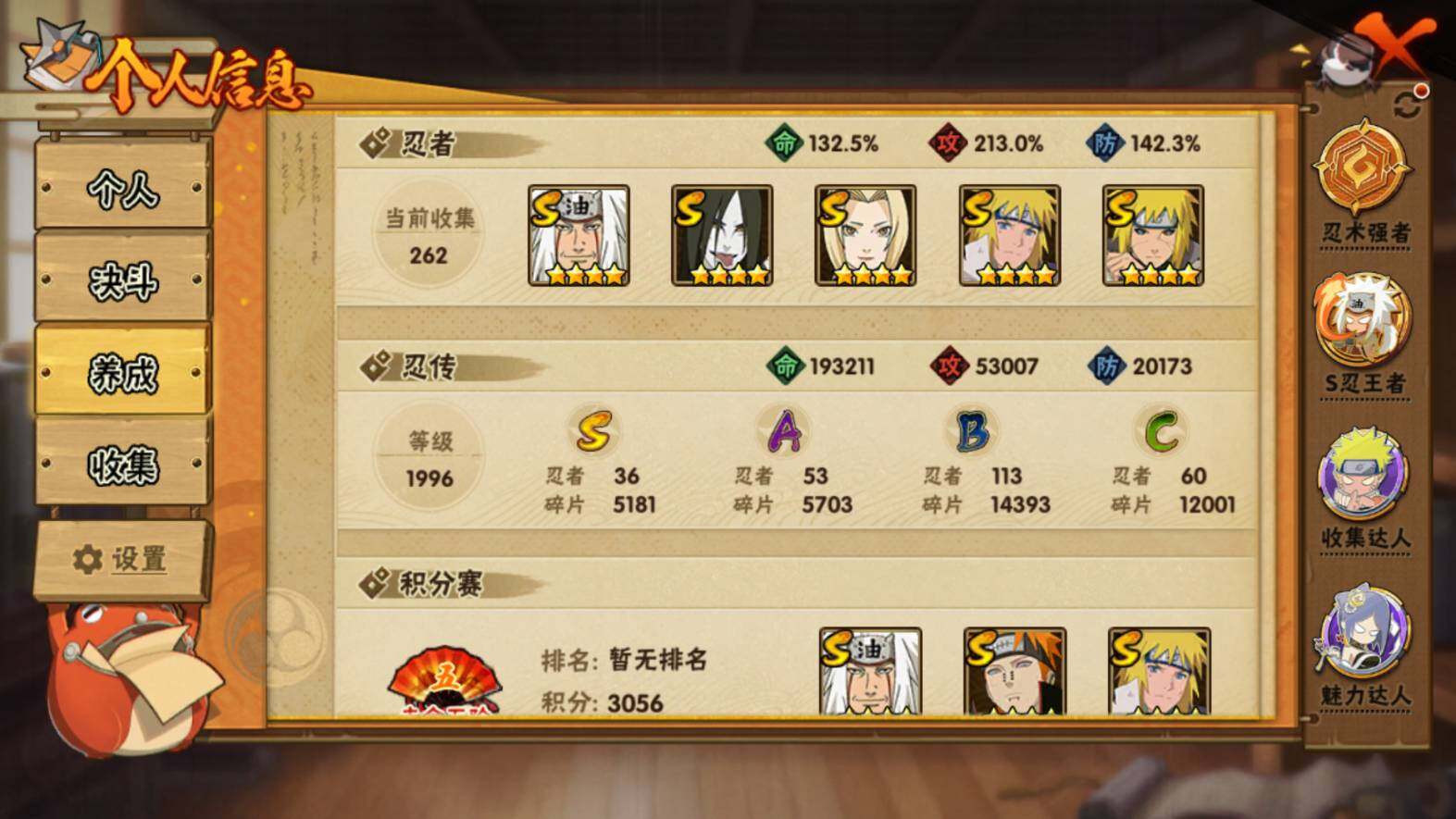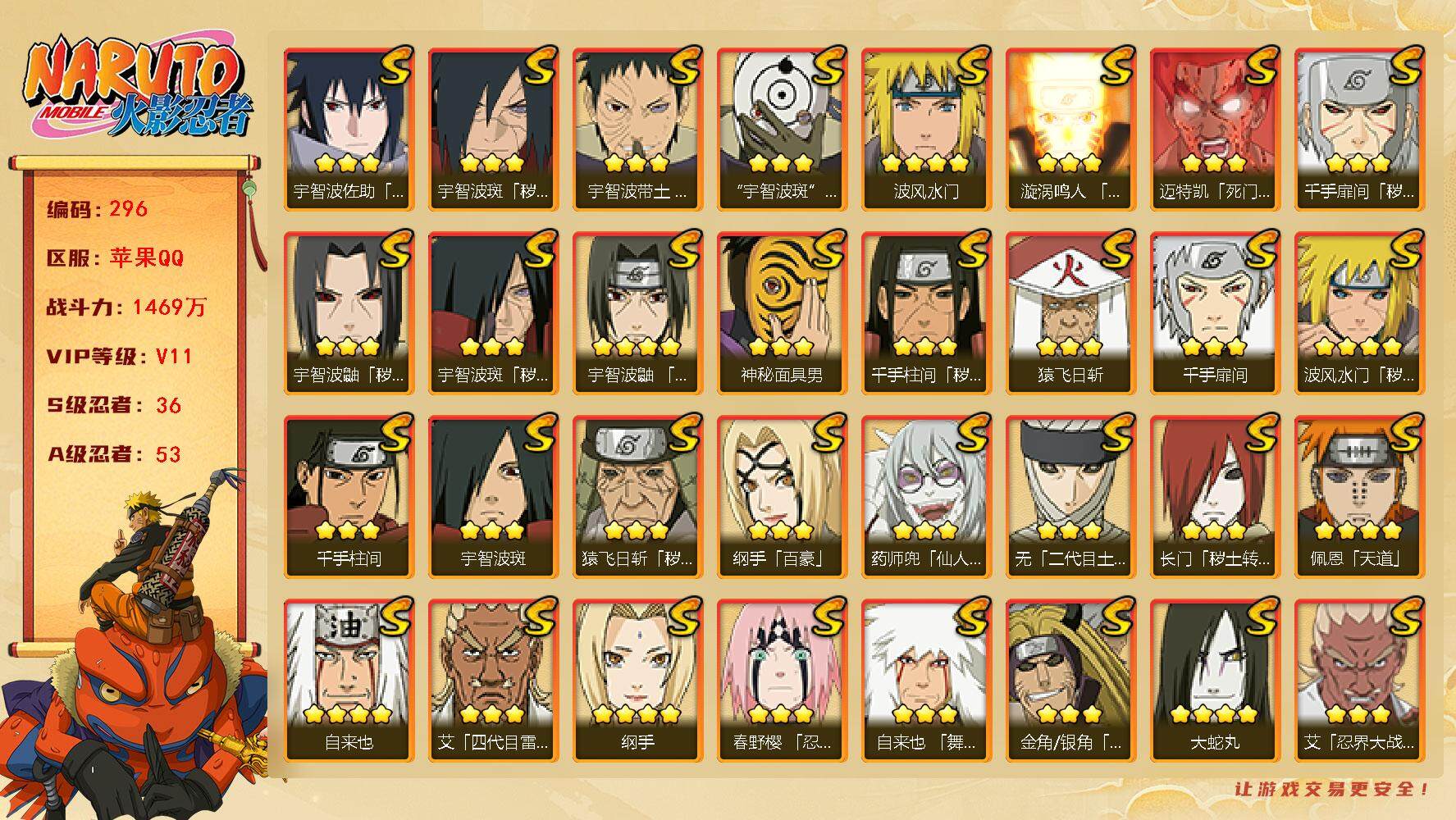 [14409032]v11 1469w战力 36s级忍者数-53a级忍者数 须佐能乎宇智波止水65片 四代目风影罗砂70片 三代目雷影艾75片 秽土转生半藏80片 天道超81片 yh7031 【s级忍者】:长门「秽土转生」3星,金角·银角「秽土转生」3星,猿飞日斩「秽土转生」3星,波风水门「秽土转生」4星,千手扉间「秽土转生」3星,千手柱间「秽土转生」3星,宇智波鼬「秽土转生」3星,宇智波斑「秽土转生」3星,宇智波斑「秽土转生·解」3星,春野樱「忍界大战」3星,宇智波带土「忍界大战」3星,艾「忍界大战」3星,宇智波鼬「须佐能乎」4星,旗木卡卡西「须佐能乎」3星,无「二代目土影」3星,艾「四代目雷影」3星,自来也4星,自来也「舞之豪杰」3星,大蛇丸4星,自来也「传说中的三忍」3星,纲手4星,纲手「百豪」3星,千手柱间3星,千手扉间3星,猿飞日斩3星,宇智波斑3星,波风水门4星,药师兜「仙人模式」3星,神秘面具男3星,漩涡鸣人「九喇嘛连结」3星,迈特凯「死门」3星,佩恩「天道」4星,宇智波佐助「永恒万花筒」3星,宇智波斑 「白面具」3星宇智波斑「白面具」,大筒木舍人「最终章」3星,波风水门「九喇嘛连结」3星 【a级忍者】:艾「青年」2星,长门「青年」2星,波风水门「青年」2星,波风水门「新春限定」2星,达鲁伊「博人传」2星,迪达拉2星,迪达拉「秽土转生」2星,大蛇丸「晓」2星,奇拉比2星,奇拉比「忍界大战」2星,飞段5星,飞段「死司凭血」5星,干柿鬼鲛5星,漩涡博人「桃式显现」2星,漩涡鸣人「仙人模式」2星,漩涡鸣人「九尾查克拉」2星,迈特凯5星,旗木卡卡西「万花筒写轮眼」2星,旗木卡卡西「幻之真容」2星,桃地再不斩2星,桃地再不斩「漂泊武士」2星,桃地再不斩「秽土转生」2星,我爱罗「疾风传」5星,我爱罗「忍界大战」2星,蝎5星,蝎「绯流琥」2星,小南2星,小南「夏日泳装」2星,角都2星,角都「地怨虞」2星,角都「秽土转生」2星,猿飞阿斯玛5星,宇智波止水3星,猿飞日斩「火影继承人」2星,宇智波鼬3星,宇智波