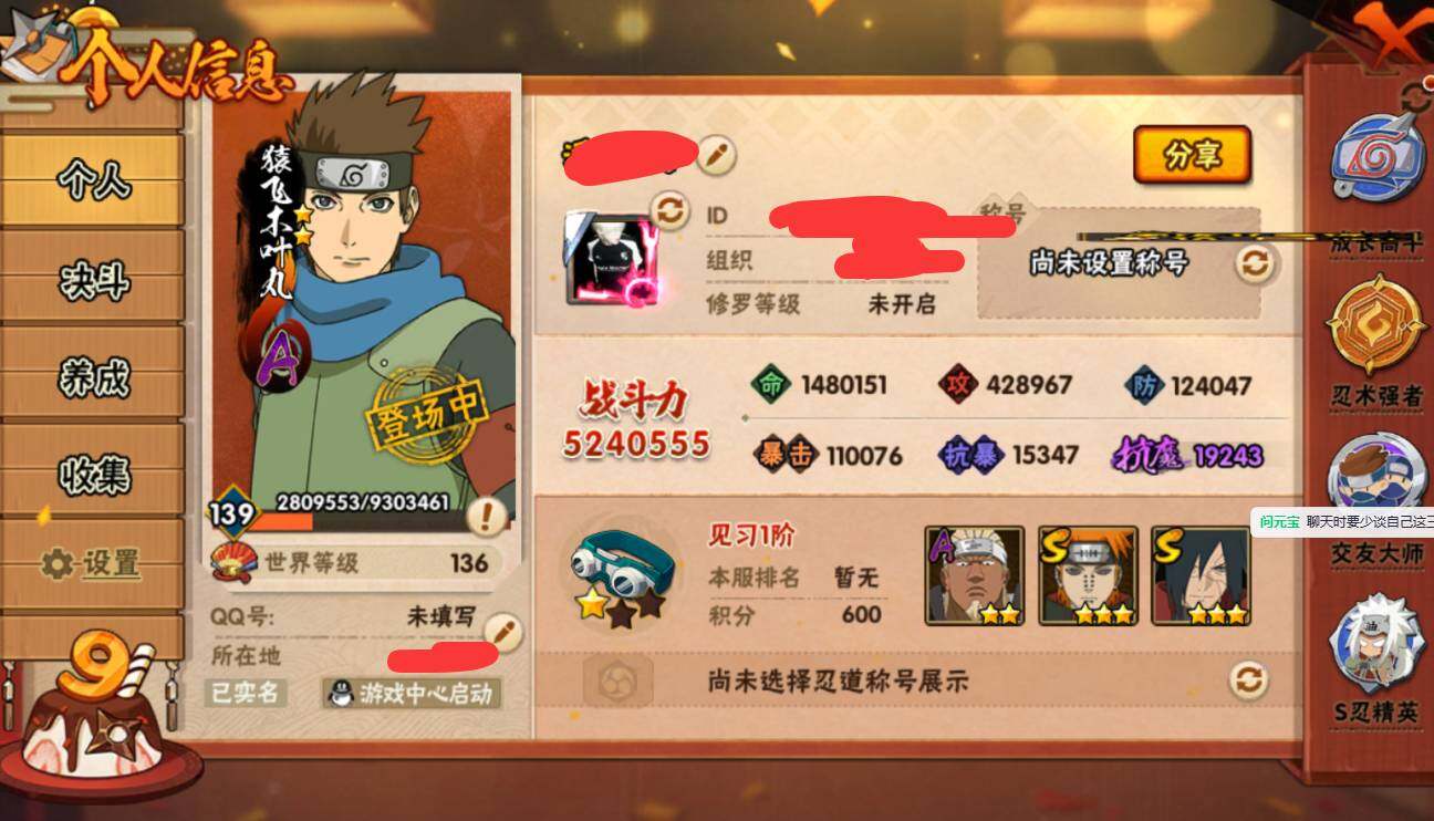 【hyyh721】v9/战力520w/s忍10/a忍24/4星干柿鬼鲛/2星日向宁次「忍界大战」/2星飞段「死司凭血」/2星宇智波鼬/3星宇智波佐助「永恒万花筒」/3星大筒木金式/2星长门「青年」/2星蝎/3星佩恩「天道」/3星波风水门/3星漩涡鸣人「九喇嘛连结」/2星秋道丁次「忍界大战」/2星宇智波鼬「新春限定」/2星漩涡博人「桃式显现」/3星我爱罗「疾风传」/2星李洛克「忍界大战」/3星大筒木桃式/2星长十郎「六代目水影」/2星波风水门「青年」/4星猿飞阿斯玛/3星自来也「舞之豪杰」/4星迈特凯/2星日向雏田「最终章」/2星奇拉比/2星飞段/2星宇智波佐助「万花筒写轮眼」/2星宇智波泉奈/2星迪达拉/3星艾「忍界大战」/3星宇智波斑「秽土转生·解」/2星艾「青年」/2星宇智波佐助「须佐能乎」/2星猿飞木叶丸「博人传」/3星宇智波鼬「须佐能乎」