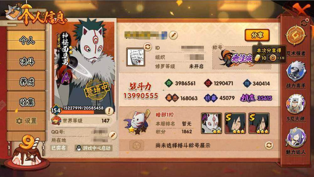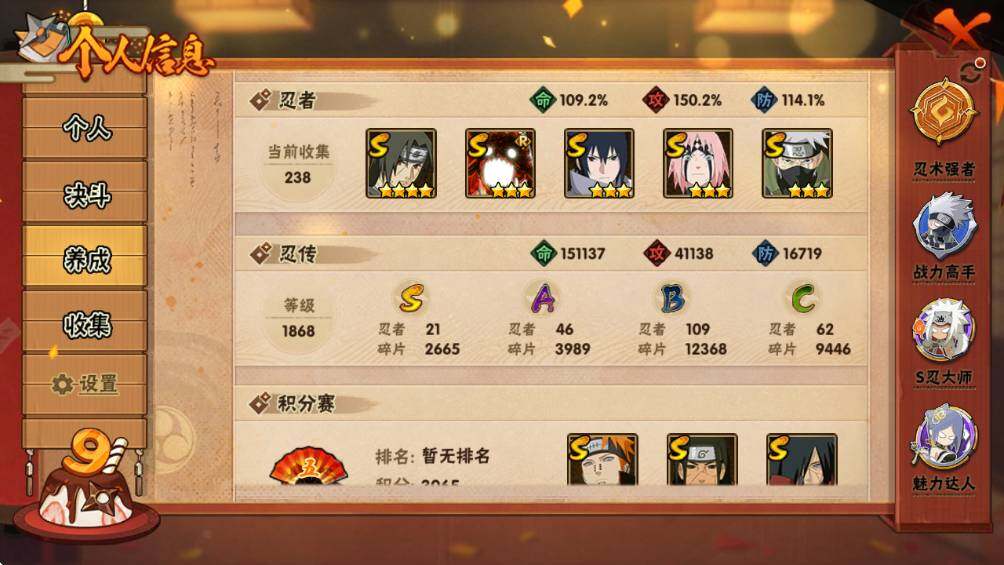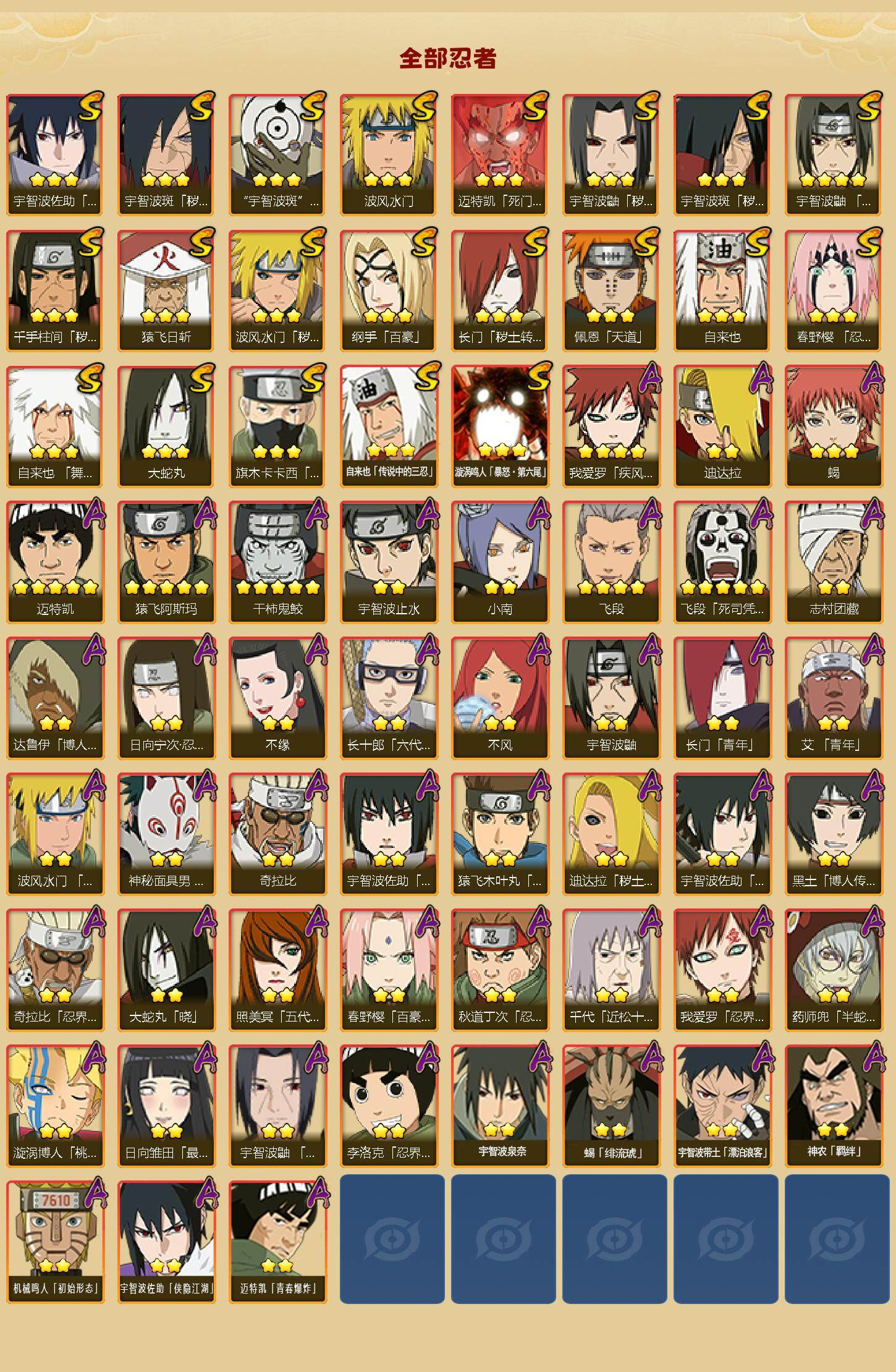 【hyyh717】v10/s忍21/a忍46/秽土斑/百豪纲手/达鲁伊/止水/5星猿飞阿斯玛/须佐能乎旗木卡卡西/2星宇智波佐助「侠隐江湖」/照美冥/3星蝎/5星迈特凯/自来也/忍战奇拉比/忍者之路面具男/长十郎/5星飞段「死司凭血」/蝎「绯流琥」/漩涡鸣人暴怒·第六尾/百豪樱/白面具/死门凯/自来也「传说中的三忍」/猿飞日斩/博人传黑土/秽土迪达拉/斗篷兜/神农「羁绊」/忍战樱/永恒万花筒佐