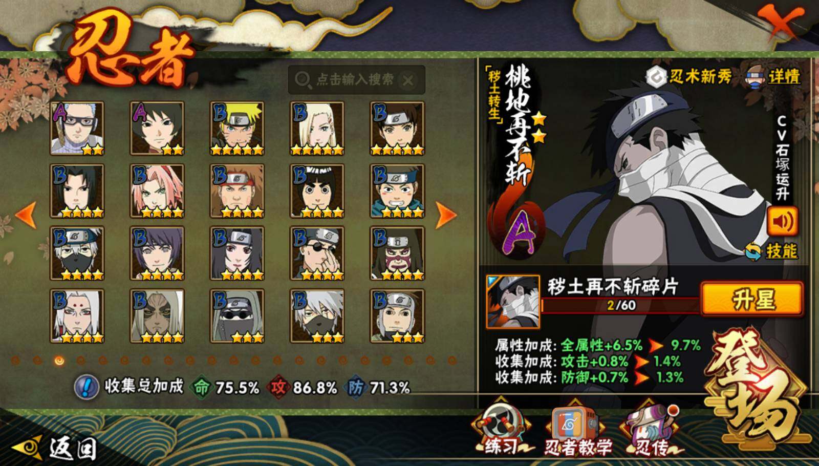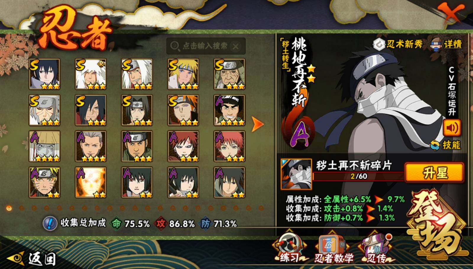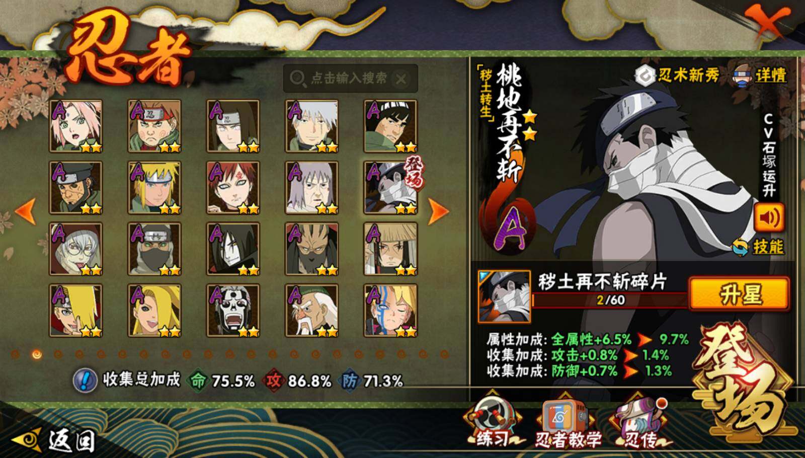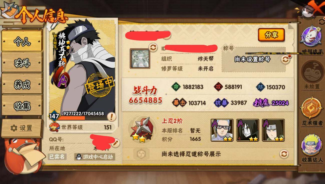 【hyyh723】v6/战力600w/s忍9/a忍33/4星干柿鬼鲛/2星日向宁次「忍界大战」/2星大野木「侠隐江湖」/2星飞段「死司凭血」/2星宇智波鼬/3星宇智波佐助「永恒万花筒」/3星猿飞日斩「秽土转生」/3星佩恩「天道」/2星角都「地怨虞」/3星波风水门/3星蝎/2星秋道丁次「忍界大战」/2星猿飞阿斯玛「秽土转生」/2星漩涡博人「桃式显现」/3星千手扉间「秽土转生」/3星我爱罗「疾风传」/2星长十郎「六代目水影」/2星波风水门「青年」/2星蝎「绯流琥」/3星自来也「舞之豪杰」/2星桃地再不斩「秽土转生」/2星春野樱「百豪」/4星迈特凯/3星自来也「传说中的三忍」/2星黑土「博人传」/4星飞段/2星迪达拉「秽土转生」/2星药师兜「半蛇斗篷」/2星漩涡鸣人「仙人模式」/2星宇智波佐助「万花筒写轮眼」/2星宇智波泉奈/2星我爱罗「忍界大战」/2星迪达拉/2星旗木卡卡西「幻之真容」/3星宇智波斑「秽土转生·解」/2星漩涡鸣人「九尾查克拉」/3星猿飞阿斯玛/2星迈特凯「青春爆炸」/2星宇智波佐助「须佐能乎」/2星千代「近松十人卫」/2星大蛇丸「晓」/3星宇智波鼬「须佐能乎」