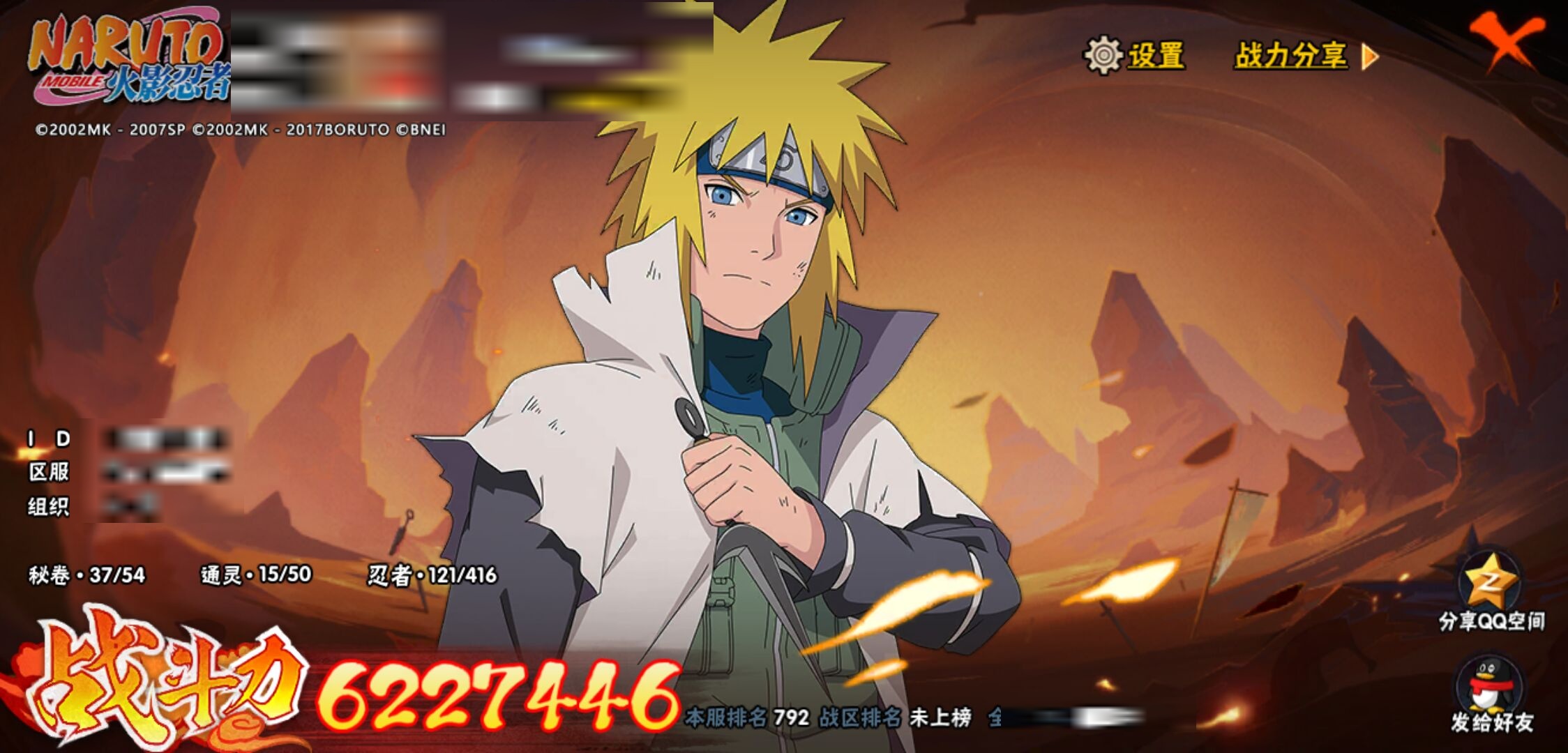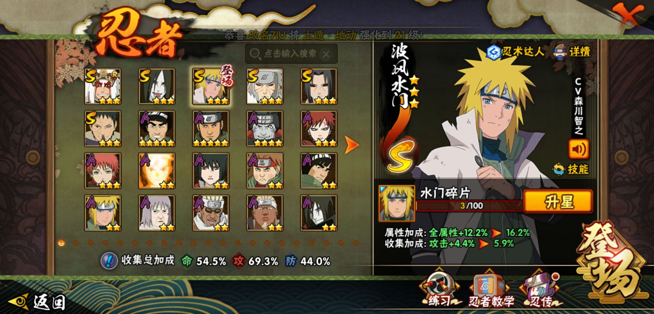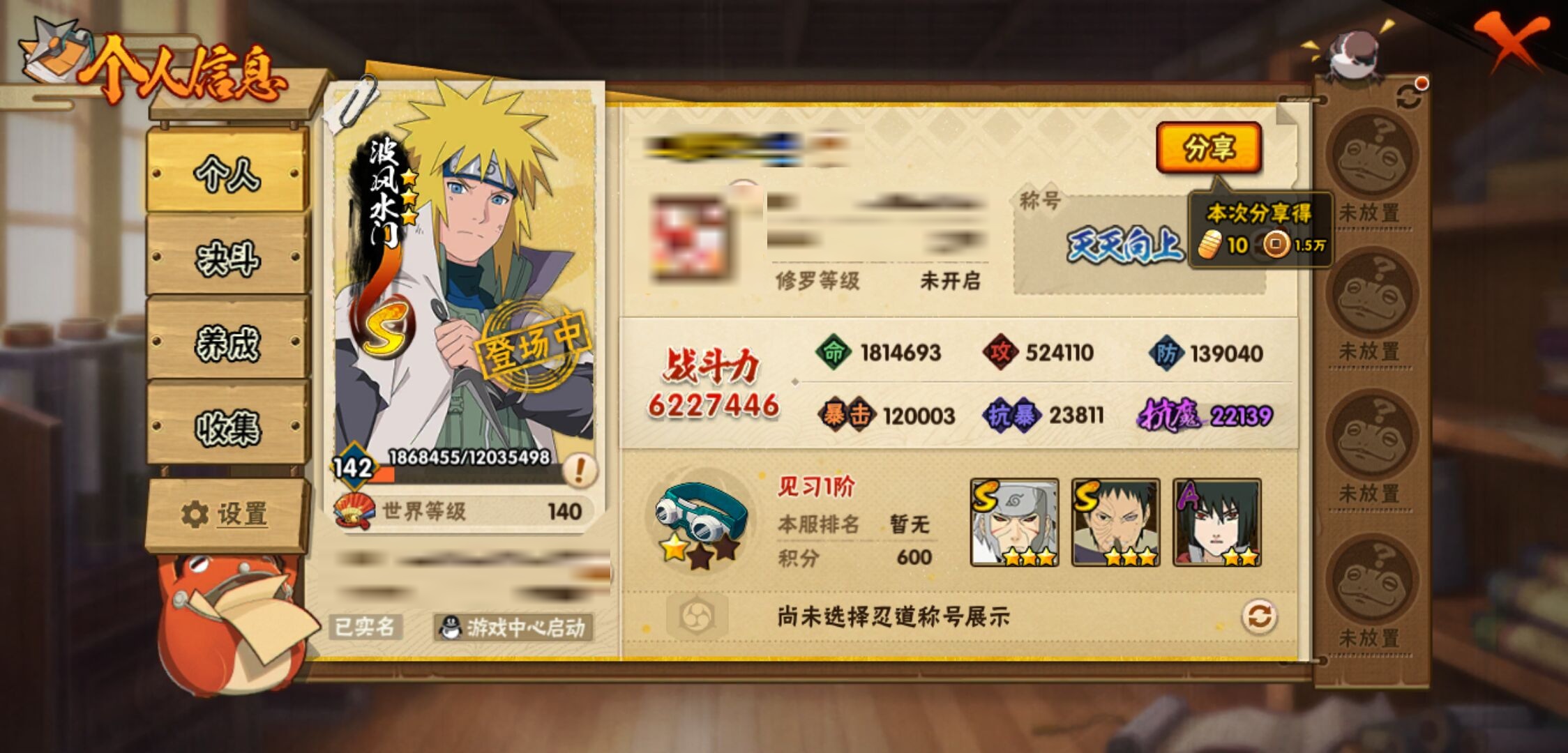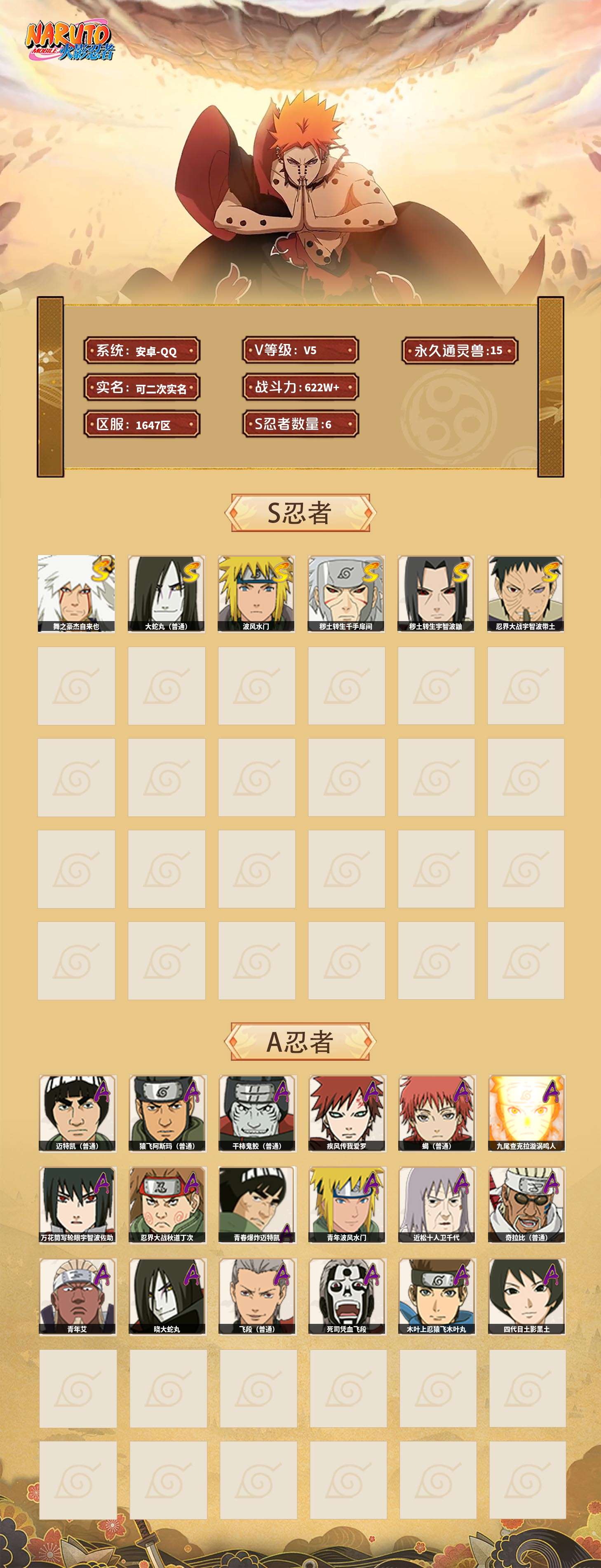 【火影忍者】【lyhy9094】战斗力:622w;段位:见习1阶;本服排名:792;vip:v5级;s忍:6个;a忍:18个;通灵兽:15个,s忍:舞之豪杰自来也|大蛇丸(普通)|波风水门|秽土转生千手扉间|秽土转生宇智波鼬|忍界大战宇智波带土__a忍:迈特凯(普通) 5星|猿飞阿斯玛(普通) 5星|干柿鬼鲛(普通) 4星|疾风传我爱罗 3星|蝎(普通) 3星|九尾查克拉漩涡鸣人 3星|万花筒写轮眼宇智波佐助|忍界大战秋道丁次|青春爆炸迈特凯|青年波风水门|近松十人卫千代|奇拉比(普通)|青年艾|晓大蛇丸|飞段(普通)|死司凭血飞段|木叶上忍猿飞木叶丸|四代目土影黑土__通灵兽:忍犬(普通)|蓝蛇|蛤蟆吉|忍龟|镰鼬|猿魔|山椒鱼|蜃|蛤蟆仙人|鲛鲨|蛤蟆健|乌鸦(普通)|蛤蟆龙|砂之守鹤|蛤蟆广