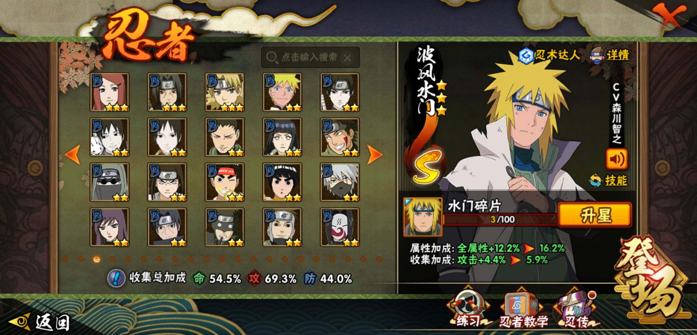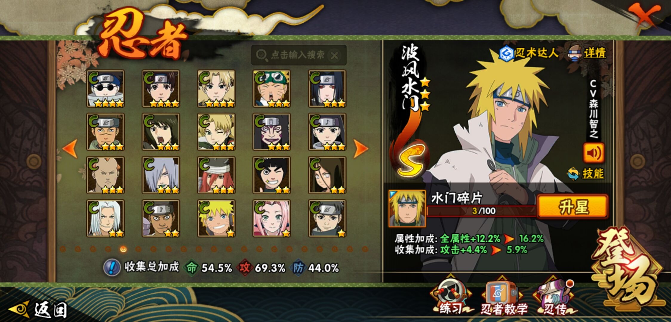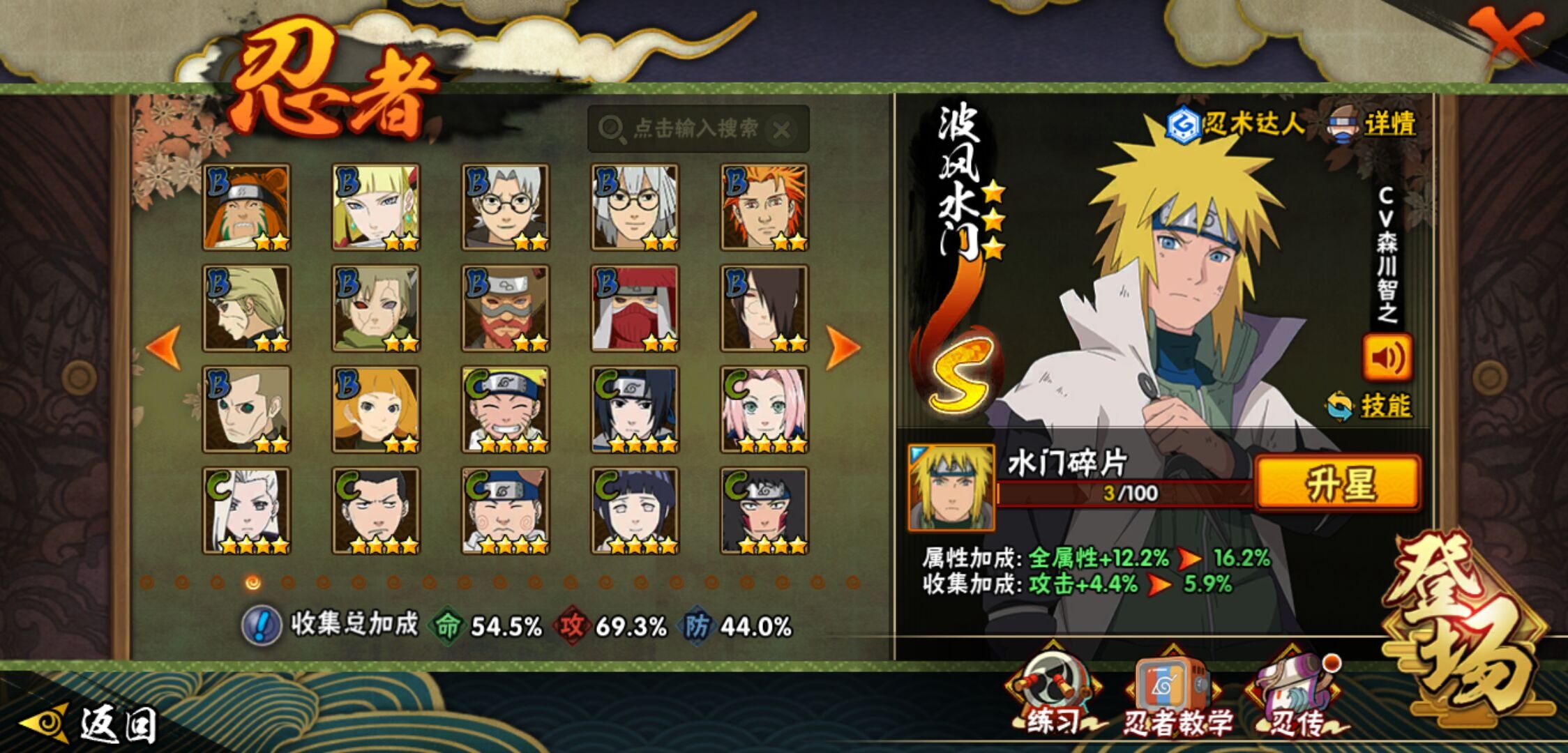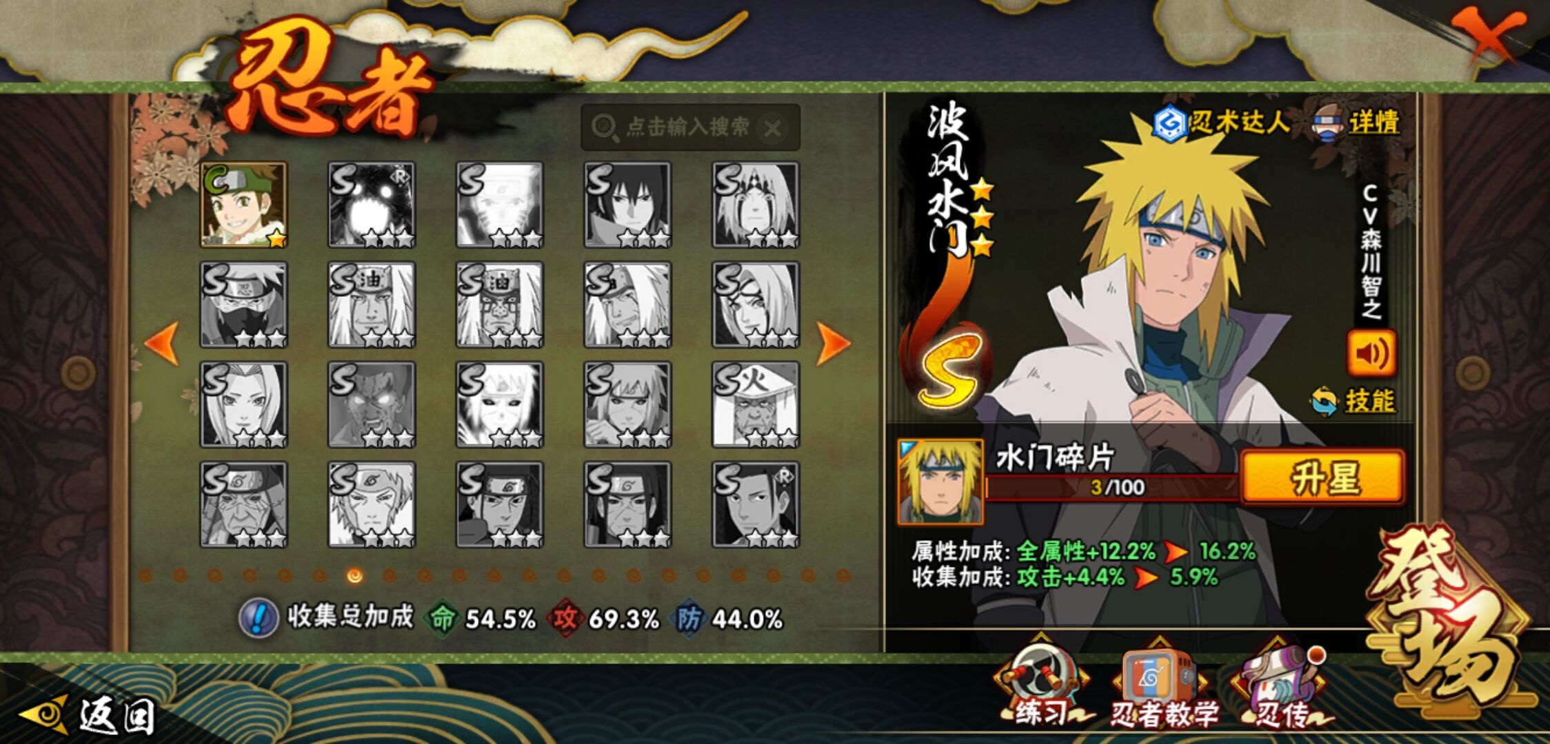 【火影忍者】【lyhy9094】战斗力:622w;段位:见习1阶;本服排名:792;vip:v5级;s忍:6个;a忍:18个;通灵兽:15个,s忍:舞之豪杰自来也|大蛇丸(普通)|波风水门|秽土转生千手扉间|秽土转生宇智波鼬|忍界大战宇智波带土__a忍:迈特凯(普通) 5星|猿飞阿斯玛(普通) 5星|干柿鬼鲛(普通) 4星|疾风传我爱罗 3星|蝎(普通) 3星|九尾查克拉漩涡鸣人 3星|万花筒写轮眼宇智波佐助|忍界大战秋道丁次|青春爆炸迈特凯|青年波风水门|近松十人卫千代|奇拉比(普通)|青年艾|晓大蛇丸|飞段(普通)|死司凭血飞段|木叶上忍猿飞木叶丸|四代目土影黑土__通灵兽:忍犬(普通)|蓝蛇|蛤蟆吉|忍龟|镰鼬|猿魔|山椒鱼|蜃|蛤蟆仙人|鲛鲨|蛤蟆健|乌鸦(普通)|蛤蟆龙|砂之守鹤|蛤蟆广