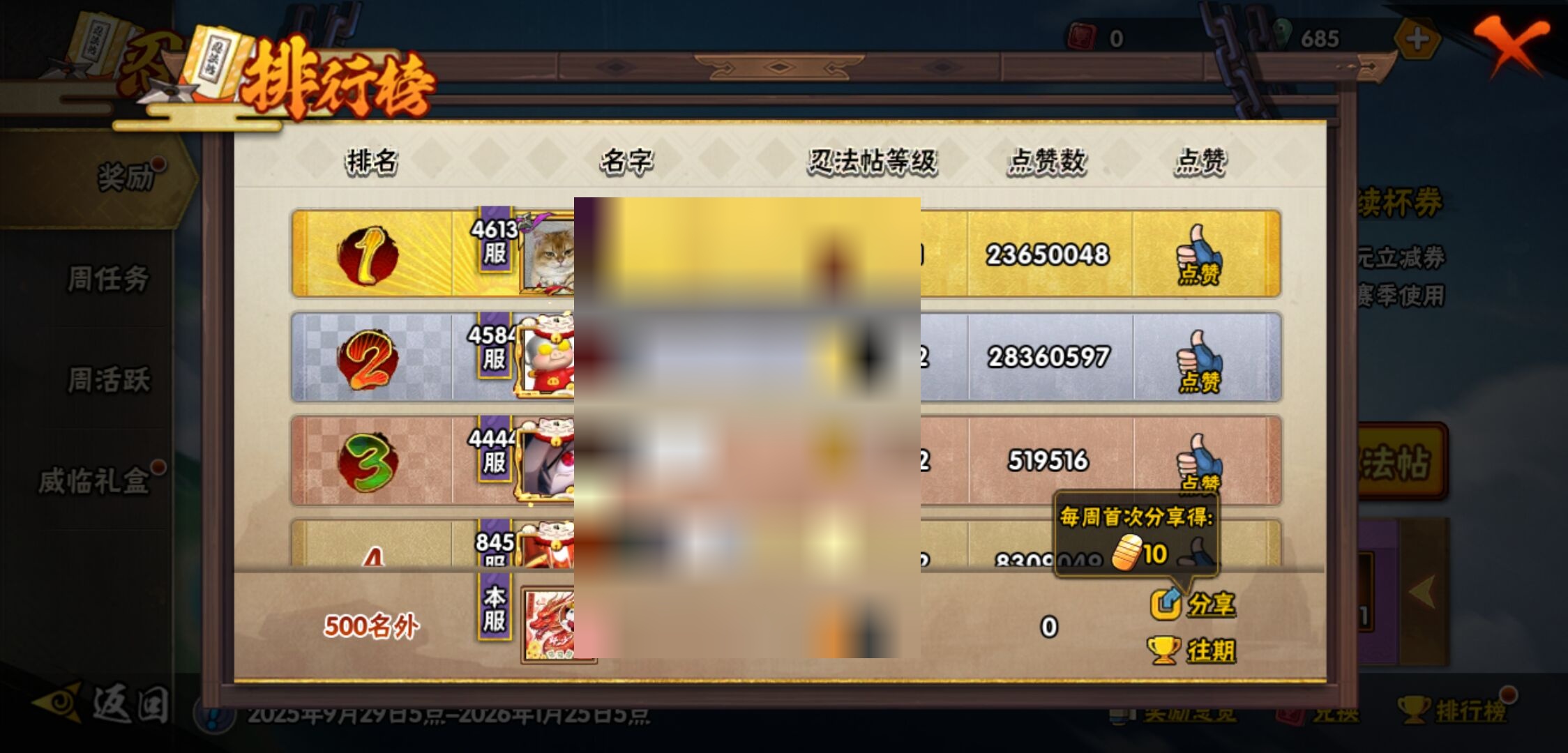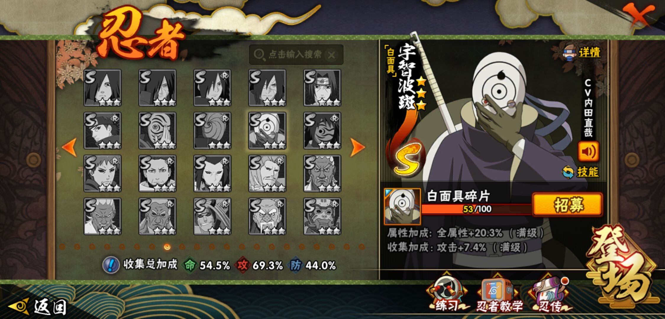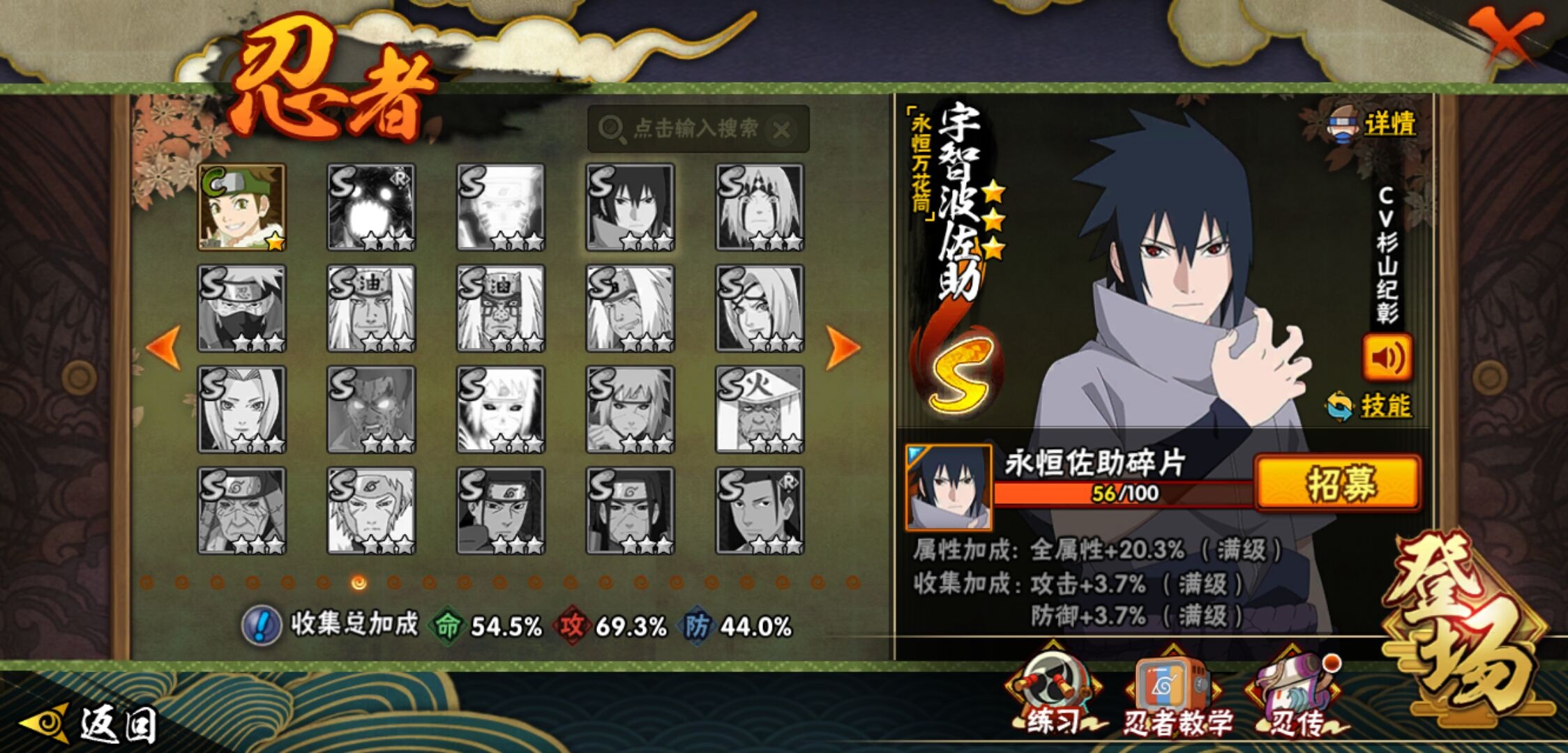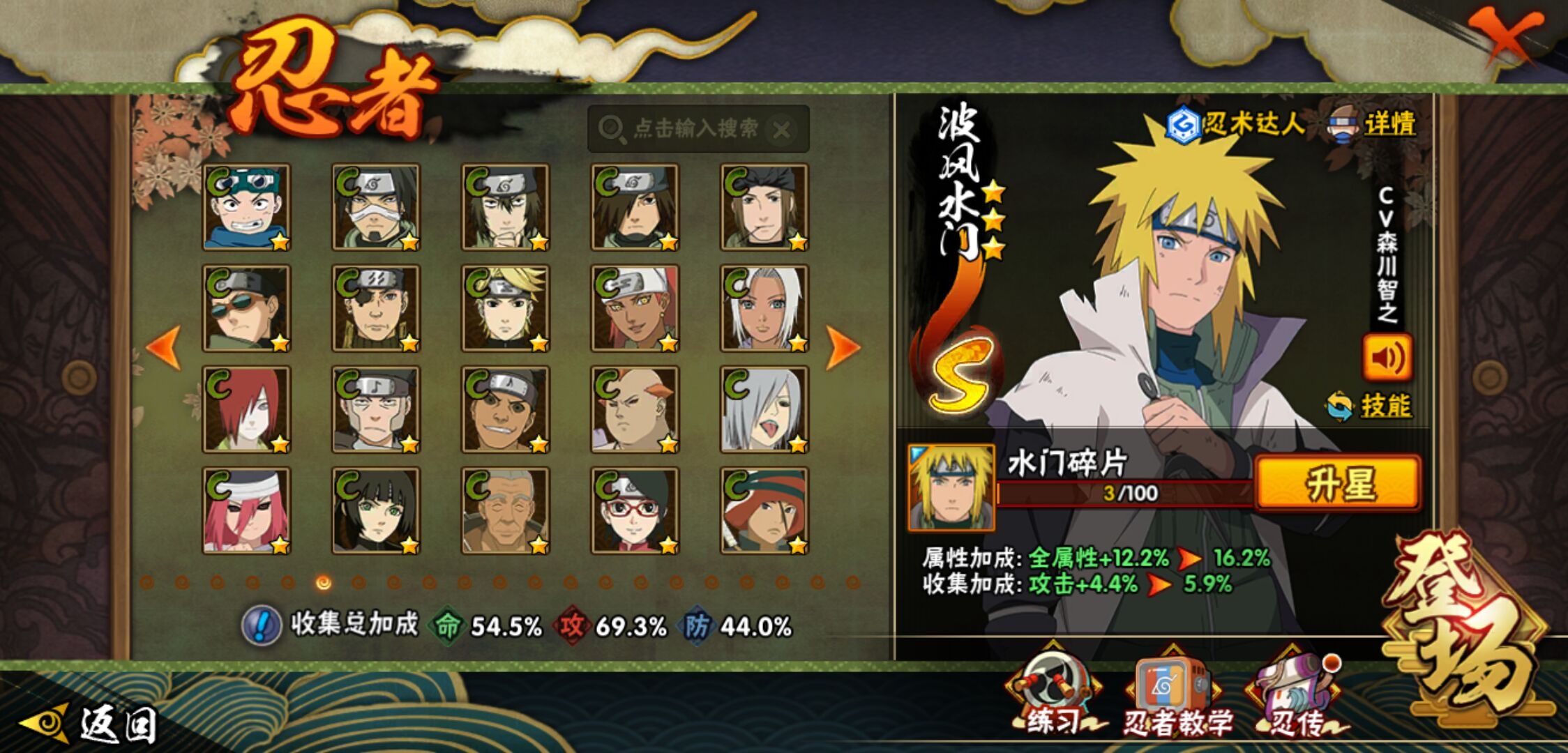 【火影忍者】【lyhy9094】战斗力:622w;段位:见习1阶;本服排名:792;vip:v5级;s忍:6个;a忍:18个;通灵兽:15个,s忍:舞之豪杰自来也|大蛇丸(普通)|波风水门|秽土转生千手扉间|秽土转生宇智波鼬|忍界大战宇智波带土__a忍:迈特凯(普通) 5星|猿飞阿斯玛(普通) 5星|干柿鬼鲛(普通) 4星|疾风传我爱罗 3星|蝎(普通) 3星|九尾查克拉漩涡鸣人 3星|万花筒写轮眼宇智波佐助|忍界大战秋道丁次|青春爆炸迈特凯|青年波风水门|近松十人卫千代|奇拉比(普通)|青年艾|晓大蛇丸|飞段(普通)|死司凭血飞段|木叶上忍猿飞木叶丸|四代目土影黑土__通灵兽:忍犬(普通)|蓝蛇|蛤蟆吉|忍龟|镰鼬|猿魔|山椒鱼|蜃|蛤蟆仙人|鲛鲨|蛤蟆健|乌鸦(普通)|蛤蟆龙|砂之守鹤|蛤蟆广