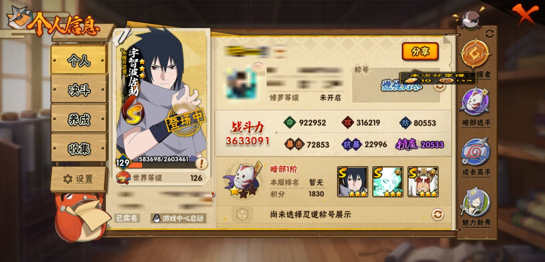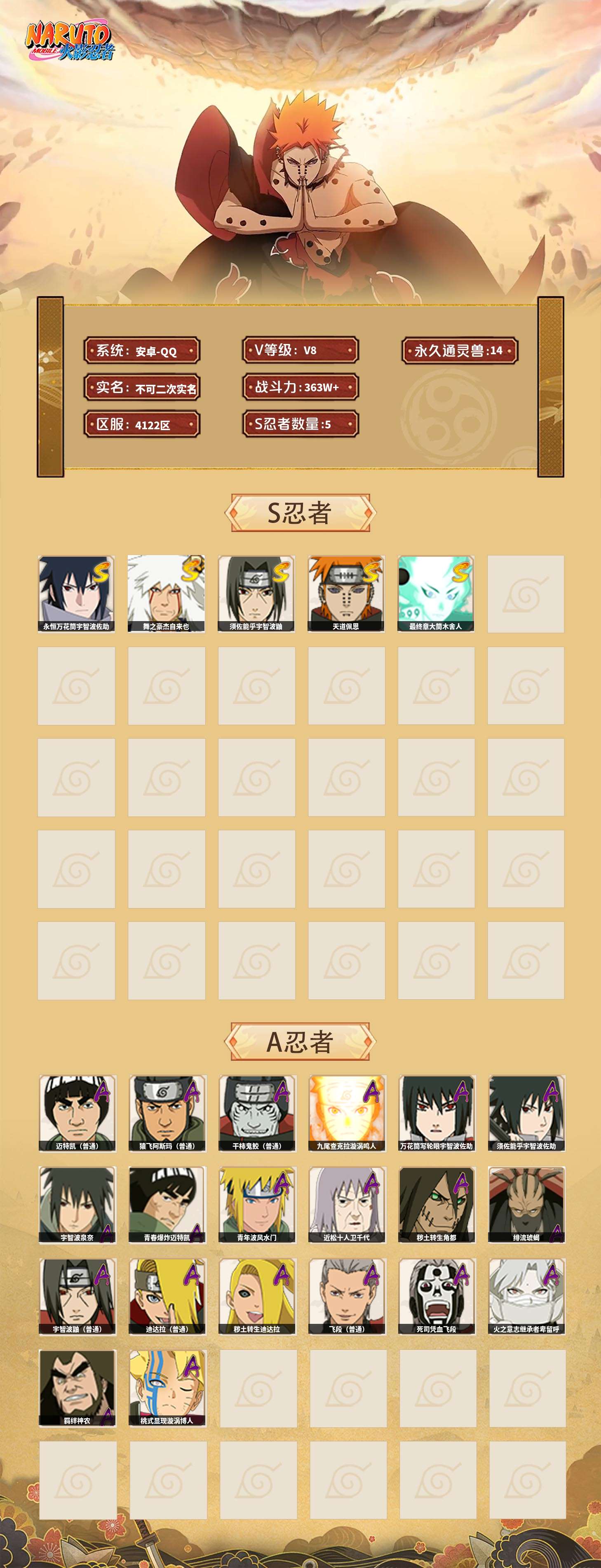 【火影忍者】【lyhy9098】战斗力:363w;段位:暗部1阶;本服排名:1328;vip:v8级;s忍:5个;a忍:20个;通灵兽:14个,s忍:永恒万花筒宇智波佐助|舞之豪杰自来也|须佐能乎宇智波鼬|天道佩恩|最终章大筒木舍人__a忍:迈特凯(普通) 3星|猿飞阿斯玛(普通) 3星|干柿鬼鲛(普通) 3星|九尾查克拉漩涡鸣人|万花筒写轮眼宇智波佐助|须佐能乎宇智波佐助|宇智波泉奈|青春爆炸迈特凯|青年波风水门|近松十人卫千代|秽土转生角都|绯流琥蝎|宇智波鼬(普通)|迪达拉(普通)|秽土转生迪达拉|飞段(普通)|死司凭血飞段|火之意志继承者卑留呼|羁绊神农|桃式显现漩涡博人__通灵兽:忍犬(普通)|蓝蛇|蛤蟆吉|砂之守鹤|忍龟|镰鼬|猿魔|山椒鱼|蜃|蛤蟆仙人|鲛鲨|蛤蟆健|蛞蝓(普通)|乌鸦(普通)