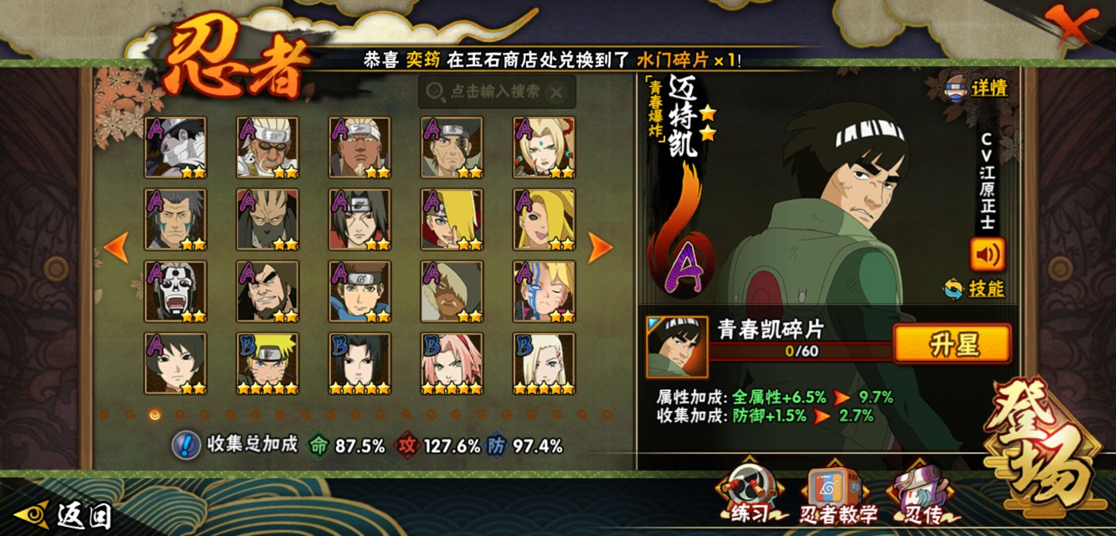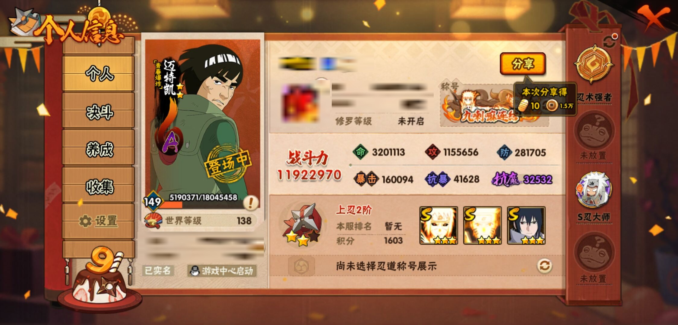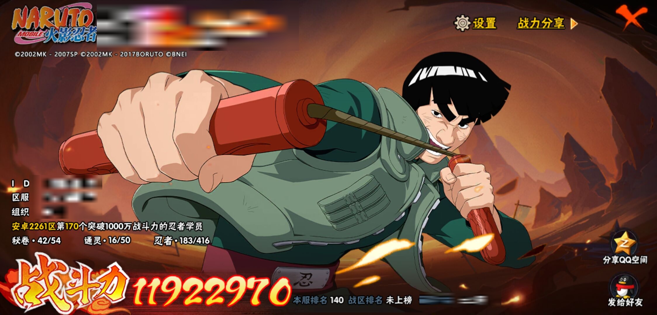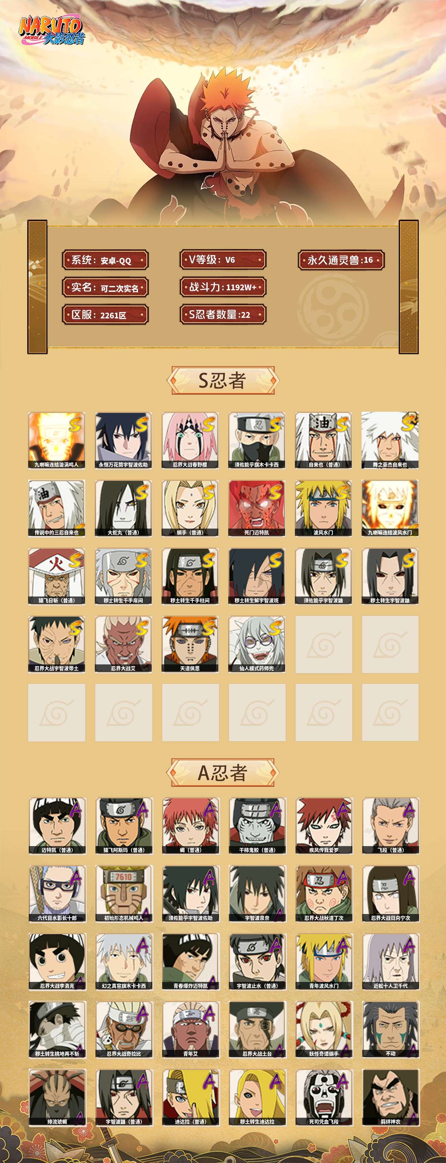 【火影忍者】【lyhy9129】战斗力:1192w;段位:上忍2阶;本服排名:140;vip:v6级;s忍:22个;a忍:34个;通灵兽:16个,s忍:九喇嘛连结漩涡鸣人|永恒万花筒宇智波佐助|忍界大战春野樱|须佐能乎旗木卡卡西|自来也(普通)|舞之豪杰自来也|传说中的三忍自来也|大蛇丸(普通)|纲手(普通)|死门迈特凯|波风水门|九喇嘛连结波风水门|猿飞日斩(普通)|秽土转生千手扉间|秽土转生千手柱间|秽土转生解宇智波斑|须佐能乎宇智波鼬|秽土转生宇智波鼬|忍界大战宇智波带土|忍界大战艾|天道佩恩|仙人模式药师兜__a忍:迈特凯(普通) 5星|猿飞阿斯玛(普通) 5星|蝎(普通) 5星|干柿鬼鲛(普通) 5星|疾风传我爱罗 4星|飞段(普通) 3星|六代目水影长十郎 3星|初始形态机械鸣人|须佐能乎宇智波佐助|宇智波泉奈|忍界大战秋道丁次|忍界大战日向宁次|忍界大战李洛克|幻之真容旗木卡卡西|青春爆炸迈特凯|宇智波止水(普通)|青年波风水门|近松十人卫千代|秽土转生桃地再不斩|忍界大战奇拉比|青年艾|忍界大战土台|妖怪奇谭纲手|不动|绯流琥蝎|宇智波鼬(普通)|迪达拉(普通)|秽土转生迪达拉|死司凭血飞段|羁绊神农|木叶上忍猿飞木叶丸|五代目雷影达鲁伊|桃式显现漩涡博人|四代目土影黑土__通灵兽:忍犬(普通)|蓝蛇|蛤蟆吉|忍龟|镰鼬|猿魔|山椒鱼|砂之守鹤|蜃|蛤蟆仙人|鲛鲨|蛤蟆健|乌鸦(普通)|蛤蟆龙|蛤蟆广|梦貘