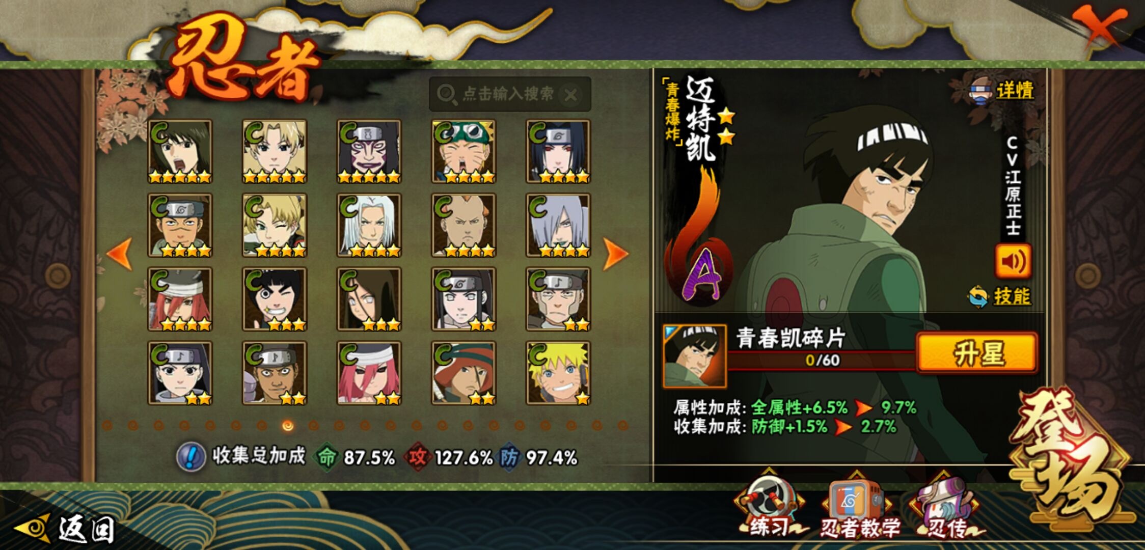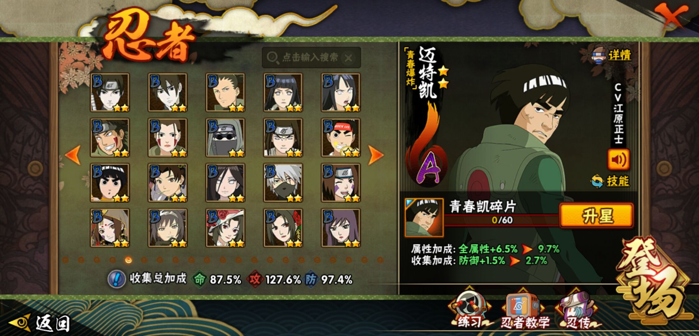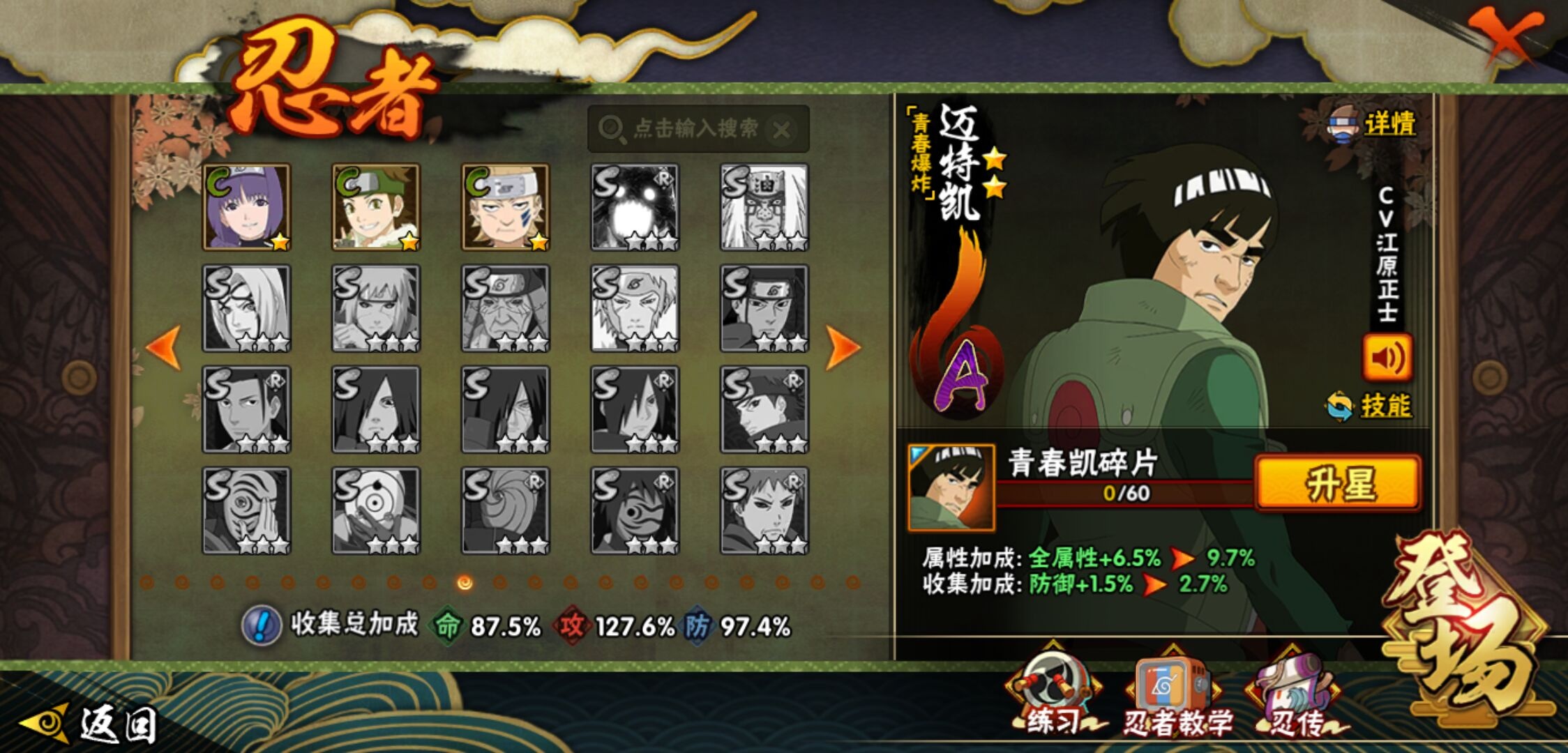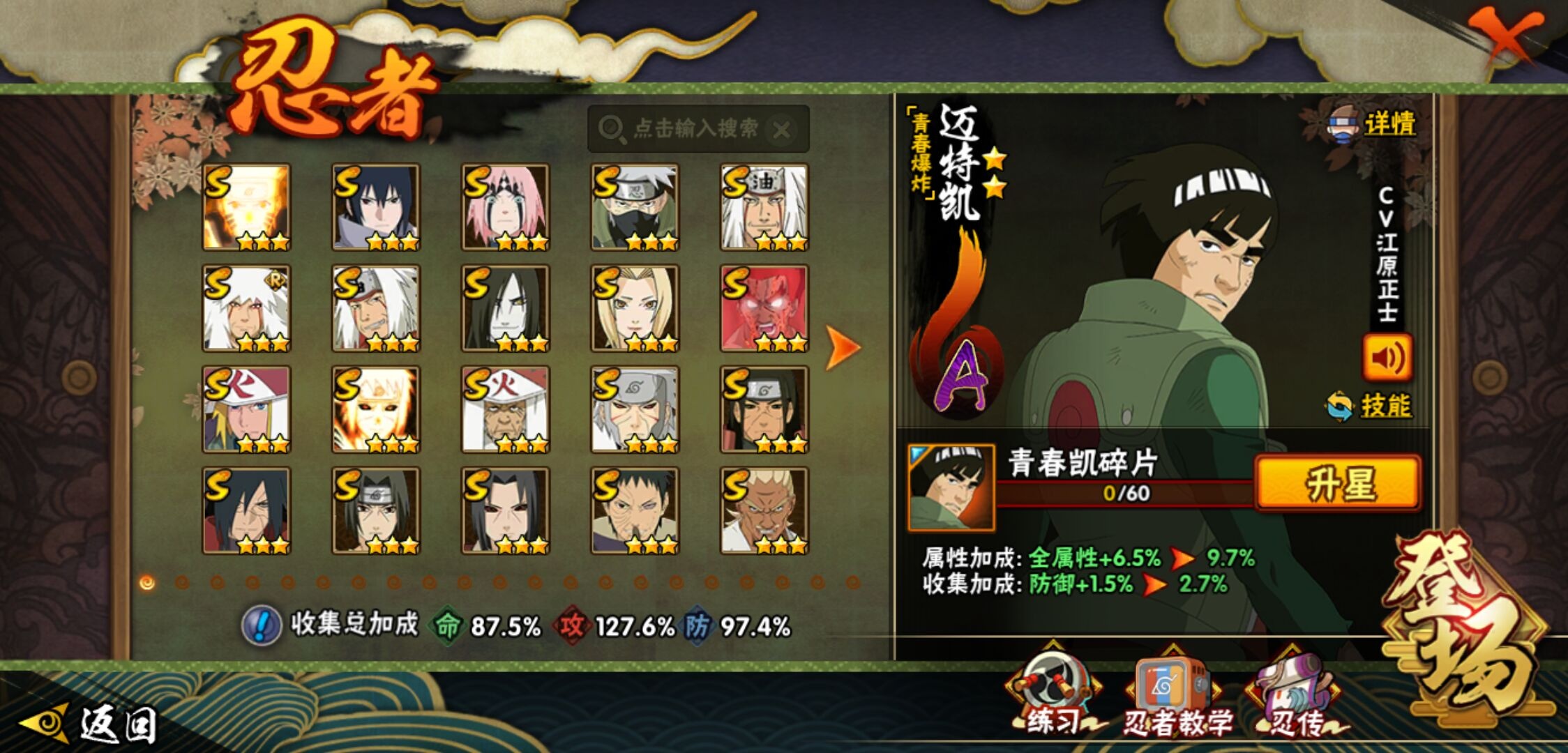 【火影忍者】【lyhy9129】战斗力:1192w;段位:上忍2阶;本服排名:140;vip:v6级;s忍:22个;a忍:34个;通灵兽:16个,s忍:九喇嘛连结漩涡鸣人|永恒万花筒宇智波佐助|忍界大战春野樱|须佐能乎旗木卡卡西|自来也(普通)|舞之豪杰自来也|传说中的三忍自来也|大蛇丸(普通)|纲手(普通)|死门迈特凯|波风水门|九喇嘛连结波风水门|猿飞日斩(普通)|秽土转生千手扉间|秽土转生千手柱间|秽土转生解宇智波斑|须佐能乎宇智波鼬|秽土转生宇智波鼬|忍界大战宇智波带土|忍界大战艾|天道佩恩|仙人模式药师兜__a忍:迈特凯(普通) 5星|猿飞阿斯玛(普通) 5星|蝎(普通) 5星|干柿鬼鲛(普通) 5星|疾风传我爱罗 4星|飞段(普通) 3星|六代目水影长十郎 3星|初始形态机械鸣人|须佐能乎宇智波佐助|宇智波泉奈|忍界大战秋道丁次|忍界大战日向宁次|忍界大战李洛克|幻之真容旗木卡卡西|青春爆炸迈特凯|宇智波止水(普通)|青年波风水门|近松十人卫千代|秽土转生桃地再不斩|忍界大战奇拉比|青年艾|忍界大战土台|妖怪奇谭纲手|不动|绯流琥蝎|宇智波鼬(普通)|迪达拉(普通)|秽土转生迪达拉|死司凭血飞段|羁绊神农|木叶上忍猿飞木叶丸|五代目雷影达鲁伊|桃式显现漩涡博人|四代目土影黑土__通灵兽:忍犬(普通)|蓝蛇|蛤蟆吉|忍龟|镰鼬|猿魔|山椒鱼|砂之守鹤|蜃|蛤蟆仙人|鲛鲨|蛤蟆健|乌鸦(普通)|蛤蟆龙|蛤蟆广|梦貘