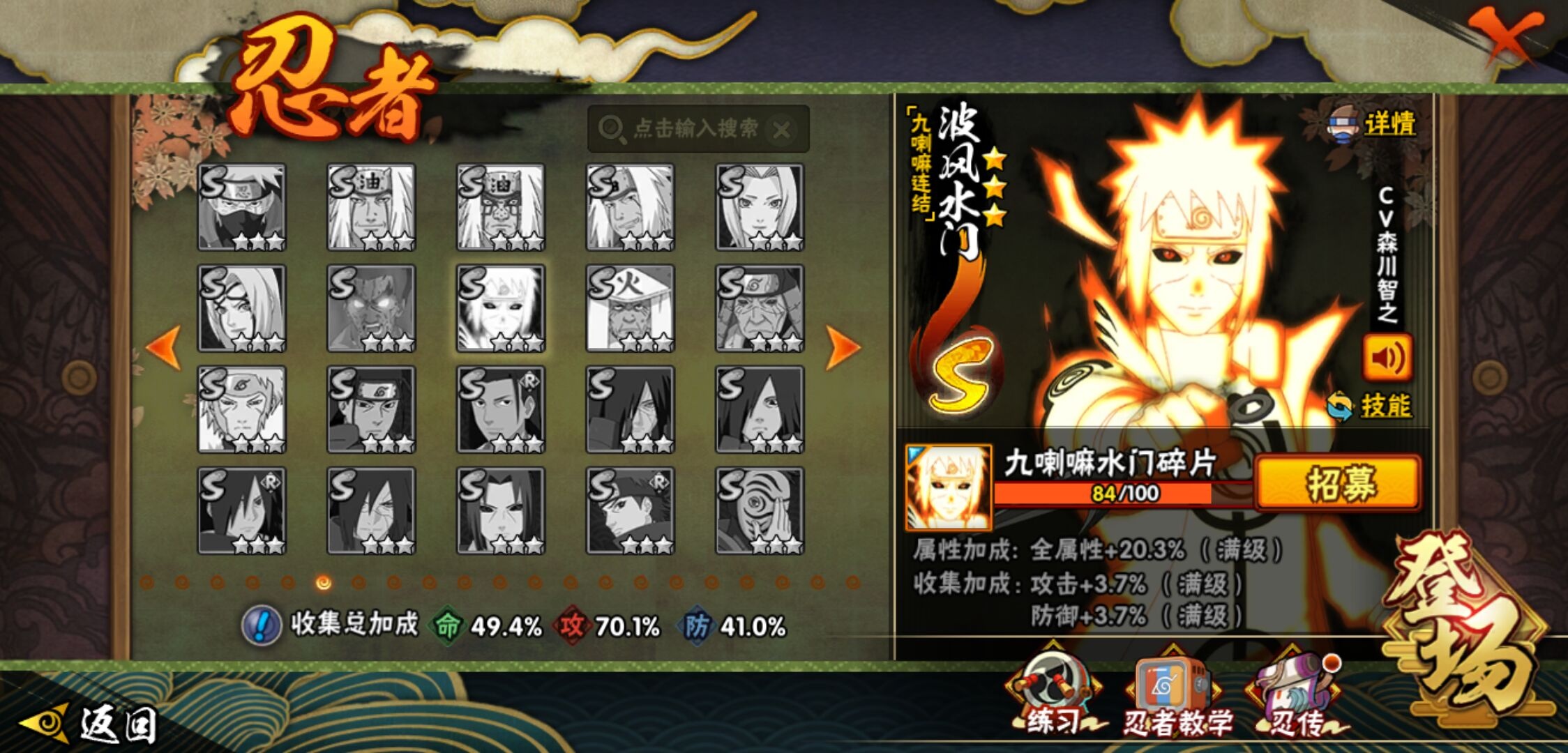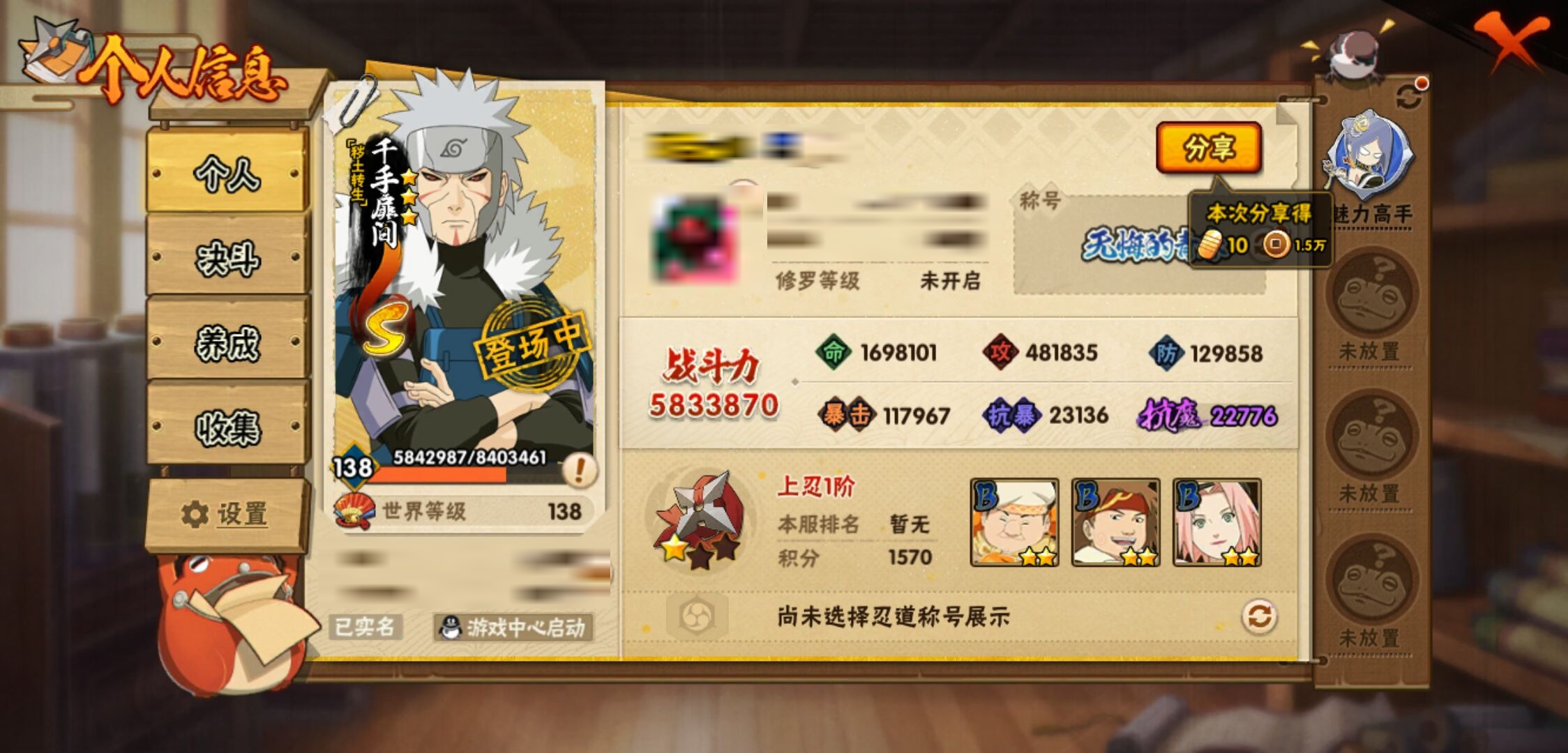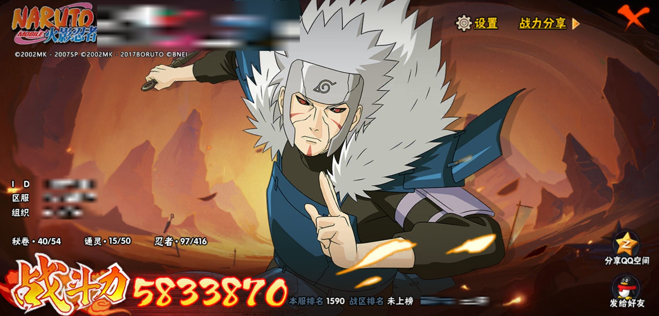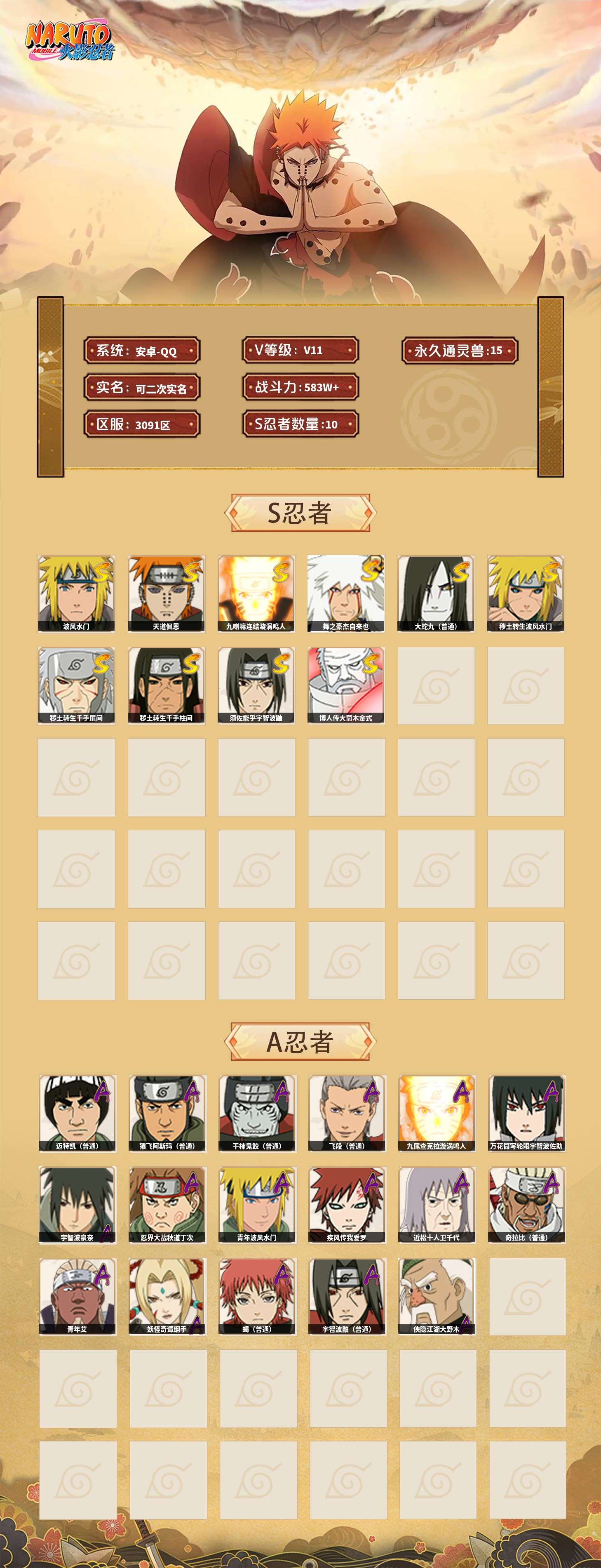 【火影忍者】【lyhy9118】战斗力:583w;段位:上忍1阶;本服排名:1590;vip:v11级;s忍:10个;a忍:17个;通灵兽:15个,s忍:波风水门 4星|天道佩恩 4星|九喇嘛连结漩涡鸣人|舞之豪杰自来也|大蛇丸(普通)|秽土转生波风水门|秽土转生千手扉间|秽土转生千手柱间|须佐能乎宇智波鼬|博人传大筒木金式__a忍:迈特凯(普通) 5星|猿飞阿斯玛(普通) 4星|干柿鬼鲛(普通) 4星|飞段(普通) 3星|九尾查克拉漩涡鸣人|万花筒写轮眼宇智波佐助|宇智波泉奈|忍界大战秋道丁次|青年波风水门|疾风传我爱罗|近松十人卫千代|奇拉比(普通)|青年艾|妖怪奇谭纲手|蝎(普通)|宇智波鼬(普通)|侠隐江湖大野木__通灵兽:忍犬(普通)|蓝蛇|砂之守鹤|蛤蟆吉|忍龟|镰鼬|猿魔|山椒鱼|熊猫|蜃|蛤蟆仙人|鲛鲨|蛤蟆龙|蛤蟆健|乌鸦(普通)
