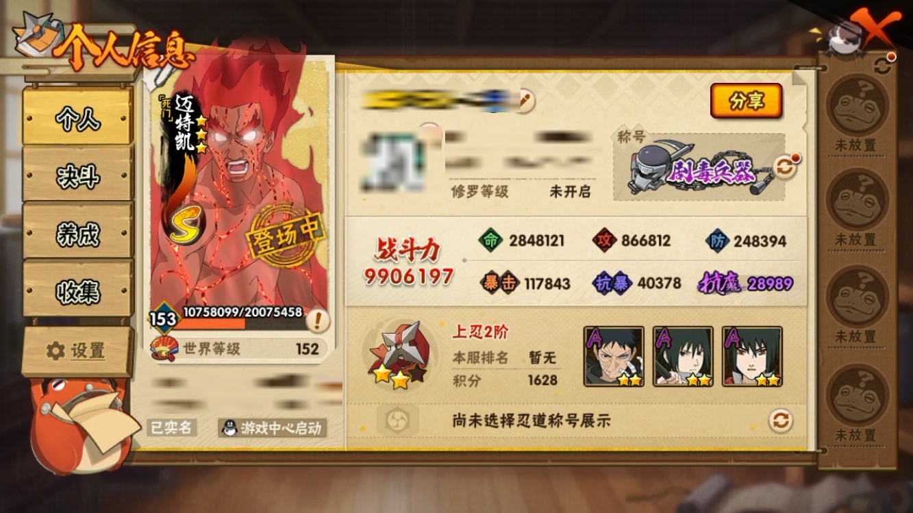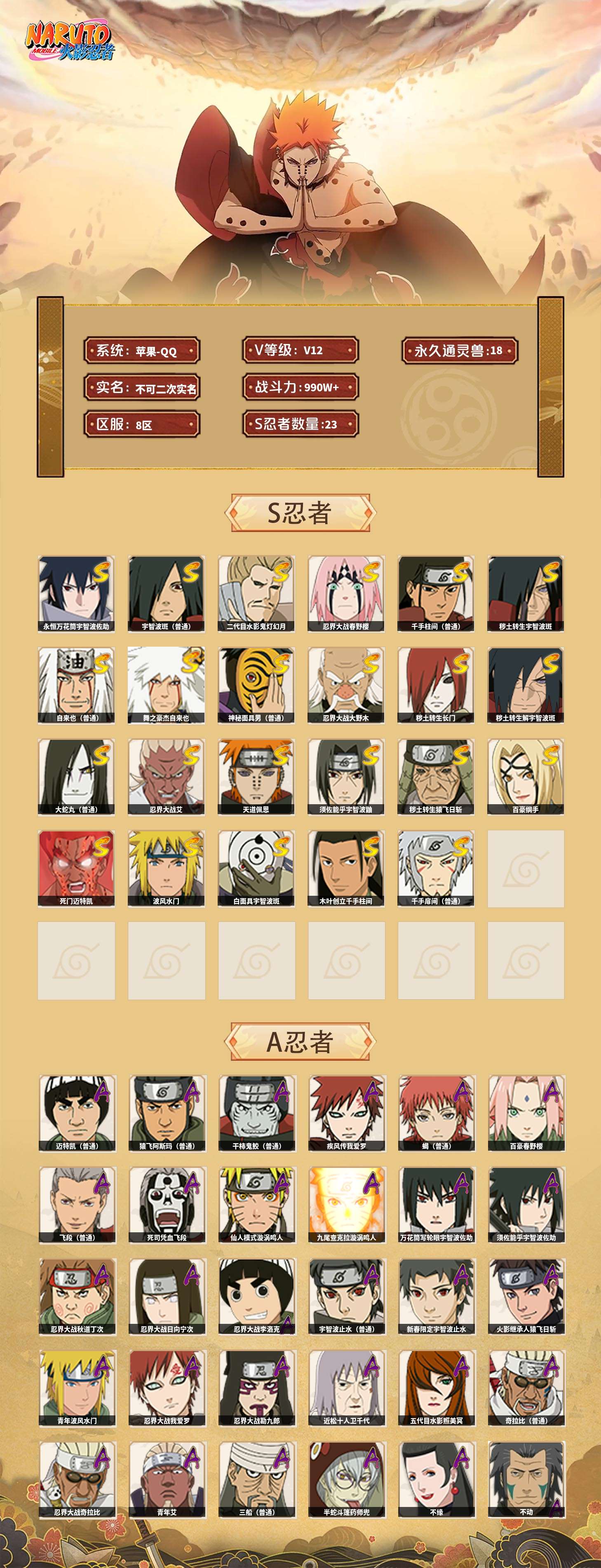 【火影忍者】【lyhy9136】战斗力:990w;段位:上忍2阶;本服排名:1385;vip:v12级;s忍:23个;a忍:44个;通灵兽:18个,s忍:永恒万花筒宇智波佐助|宇智波斑(普通)|二代目水影鬼灯幻月|忍界大战春野樱|千手柱间(普通)|秽土转生宇智波斑|自来也(普通)|舞之豪杰自来也|神秘面具男(普通)|忍界大战大野木|秽土转生长门|秽土转生解宇智波斑|大蛇丸(普通)|忍界大战艾|天道佩恩|须佐能乎宇智波鼬|秽土转生猿飞日斩|百豪纲手|死门迈特凯|波风水门|白面具宇智波斑|木叶创立千手柱间|千手扉间(普通)__a忍:迈特凯(普通)|猿飞阿斯玛(普通)|干柿鬼鲛(普通)|疾风传我爱罗|蝎(普通)|百豪春野樱|飞段(普通)|死司凭血飞段|仙人模式漩涡鸣人|九尾查克拉漩涡鸣人|万花筒写轮眼宇智波佐助|须佐能乎宇智波佐助|忍界大战秋道丁次|忍界大战日向宁次|忍界大战李洛克|宇智波止水(普通)|新春限定宇智波止水|火影继承人猿飞日斩|青年波风水门|忍界大战我爱罗|忍界大战勘九郎|近松十人卫千代|五代目水影照美冥|奇拉比(普通)|忍界大战奇拉比|青年艾|三船(普通)|半蛇斗篷药师兜|不缘|不动|青年长门|漂泊浪客佩恩六道|小南(普通)|绝|角都(普通)|晓大蛇丸|宇智波鼬(普通)|迪达拉(普通)|秽土转生迪达拉|漂泊浪客宇智波带土|木叶上忍猿飞木叶丸|六代目水影长十郎|桃式显现漩涡博人|四代目土影黑土__通灵兽:忍犬(普通)|蓝蛇|蛤蟆吉|忍龟|镰鼬|猿魔|山椒鱼|蜃|蛤蟆仙人|蛞蝓(普通)|鲛鲨|蛤蟆健|乌鸦(普通)|熊猫|蛤蟆龙|砂之守鹤|蛤蟆广|梦貘