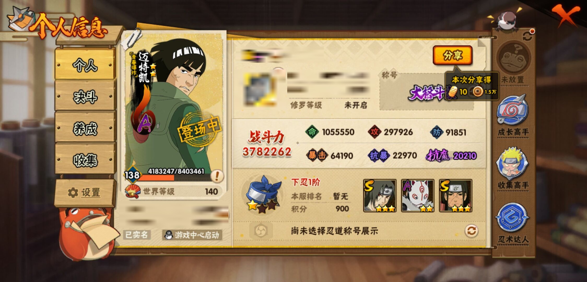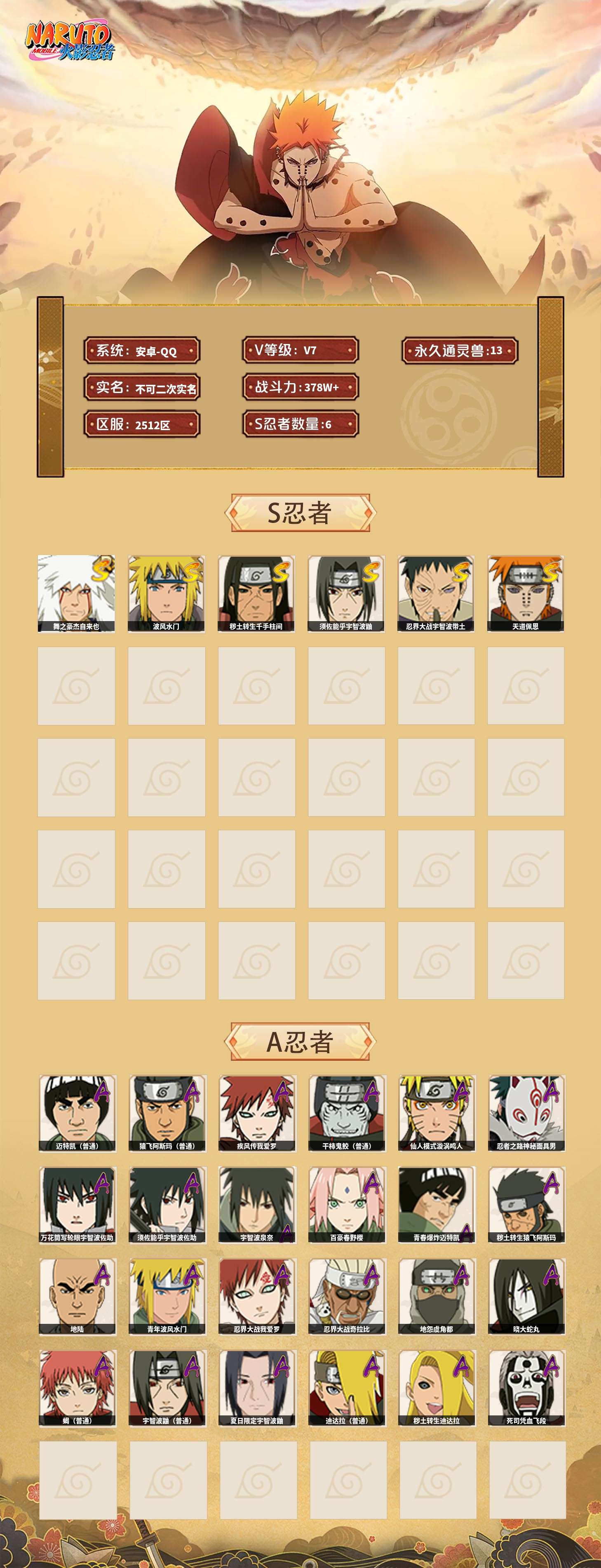 【火影忍者】【lyhy9132】战斗力:378w;段位:下忍1阶;本服排名:2427;vip:v7级;s忍:6个;a忍:24个;通灵兽:13个,s忍:舞之豪杰自来也|波风水门|秽土转生千手柱间|须佐能乎宇智波鼬|忍界大战宇智波带土|天道佩恩__a忍:迈特凯(普通) 3星|猿飞阿斯玛(普通) 3星|疾风传我爱罗 3星|干柿鬼鲛(普通) 3星|仙人模式漩涡鸣人|忍者之路神秘面具男|万花筒写轮眼宇智波佐助|须佐能乎宇智波佐助|宇智波泉奈|百豪春野樱|青春爆炸迈特凯|秽土转生猿飞阿斯玛|地陆|青年波风水门|忍界大战我爱罗|忍界大战奇拉比|地怨虞角都|晓大蛇丸|蝎(普通)|宇智波鼬(普通)|夏日限定宇智波鼬|迪达拉(普通)|秽土转生迪达拉|死司凭血飞段__通灵兽:忍犬(普通)|蓝蛇|蛤蟆吉|砂之守鹤|忍龟|镰鼬|猿魔|山椒鱼|蜃|蛤蟆仙人|鲛鲨|蛤蟆健|乌鸦(普通)