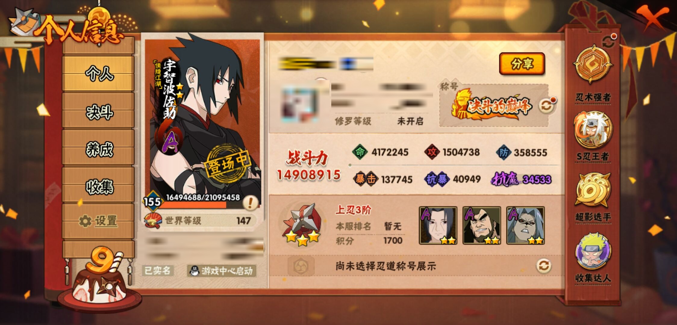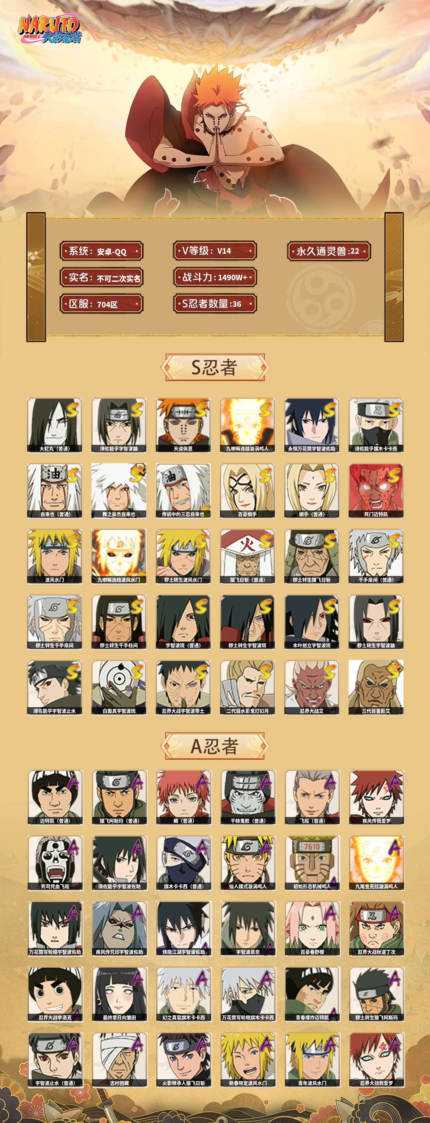 【火影忍者】【lyhy9128】战斗力:1490w;段位:上忍3阶;本服排名:262;vip:v14级;s忍:36个;a忍:67个;通灵兽:22个,s忍:大蛇丸(普通) 4星|须佐能乎宇智波鼬 4星|天道佩恩 4星|九喇嘛连结漩涡鸣人|永恒万花筒宇智波佐助|须佐能乎旗木卡卡西|自来也(普通)|舞之豪杰自来也|传说中的三忍自来也|百豪纲手|纲手(普通)|死门迈特凯|波风水门|九喇嘛连结波风水门|秽土转生波风水门|猿飞日斩(普通)|秽土转生猿飞日斩|千手扉间(普通)|秽土转生千手扉间|秽土转生千手柱间|宇智波斑(普通)|秽土转生宇智波斑|木叶创立宇智波斑|秽土转生宇智波鼬|须佐能乎宇智波止水|白面具宇智波斑|忍界大战宇智波带土|二代目水影鬼灯幻月|忍界大战艾|三代目雷影艾|秽土转生金角银角|二代目土影无|秽土转生半藏|超佩恩天道|秽土转生长门|仙人模式药师兜__a忍:迈特凯(普通) 5星|猿飞阿斯玛(普通) 5星|蝎(普通) 5星|干柿鬼鲛(普通) 5星|飞段(普通) 5星|疾风传我爱罗 4星|死司凭血飞段 4星|须佐能乎宇智波佐助 3星|旗木卡卡西(普通) 3星|仙人模式漩涡鸣人|初始形态机械鸣人|九尾查克拉漩涡鸣人|万花筒写轮眼宇智波佐助|疾风传咒印宇智波佐助|侠隐江湖宇智波佐助|宇智波泉奈|百豪春野樱|忍界大战秋道丁次|忍界大战李洛克|最终章日向雏田|幻之真容旗木卡卡西|万花筒写轮眼旗木卡卡西|青春爆炸迈特凯|秽土转生猿飞阿斯玛|宇智波止水(普通)|志村团藏|火影继承人猿飞日斩|新春限定波风水门|青年波风水门|忍界大战我爱罗|忍界大战勘九郎|近松十人卫千代|五代目水影照美冥|夏日泳装照美冥|秽土转生桃地再不斩|奇拉比(普通)|忍界大战奇拉比|青年艾|达鲁伊(普通)|三船(普通)|半蛇斗篷药师兜|不风|不缘|不动|青年长门|小南(普通)|夏日泳装小南|晓创生角都|角都(普通)|地怨虞角都|秽土转生角都|晓大蛇丸|绯流琥蝎|宇智波鼬(普通)|新春限定宇智波鼬|夏日限定宇智波鼬|迪达拉(普通)|秽土转生迪达拉|漂泊浪客宇智波带土|侠隐江湖大野木|羁绊神农|木叶上忍猿飞木叶丸|桃式显现漩涡博人|六代目水影长十郎|五代目雷影达鲁伊|仙人模式巳月|四代目土影黑土__通灵兽:忍犬(普通)|蓝蛇|蛤蟆吉|忍龟|镰鼬|猿魔|山椒鱼|蜃|蛞蝓(普通)|蛤蟆仙人|鲛鲨|蛤蟆健|乌鸦(普通)|熊猫|蛤蟆龙|蛤蟆广|砂之守鹤|梦貘|鹰|辛牙|螃蟹|蜘蛛