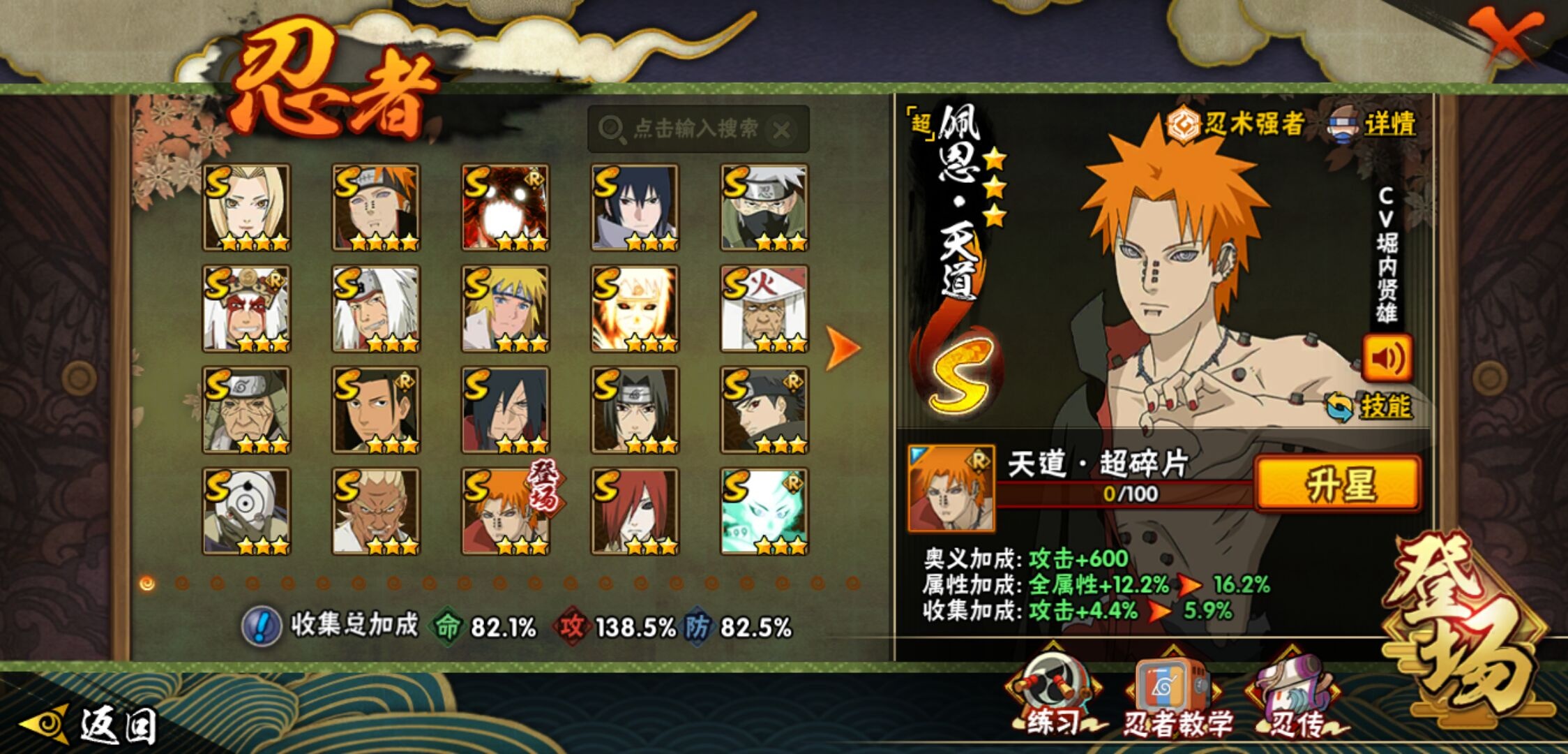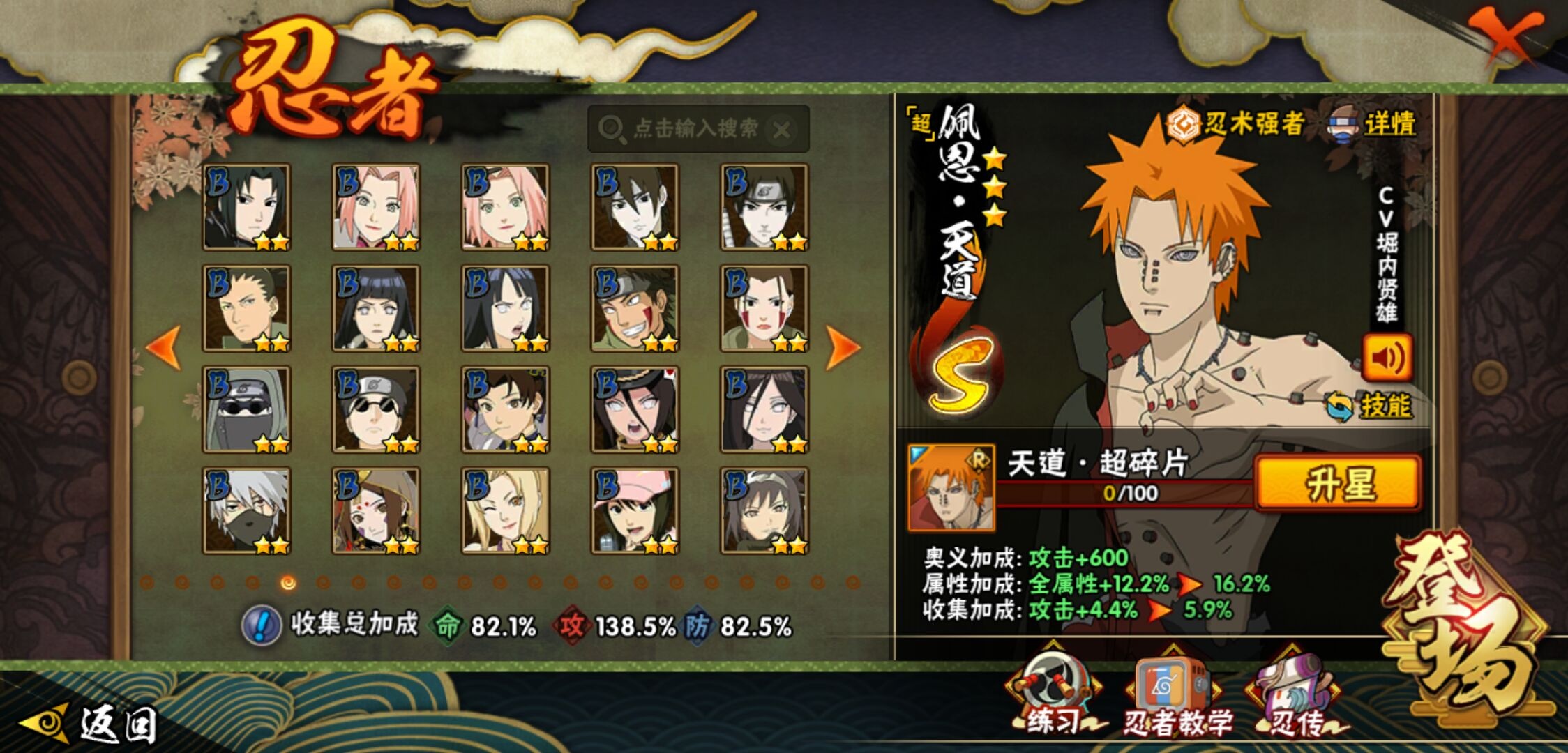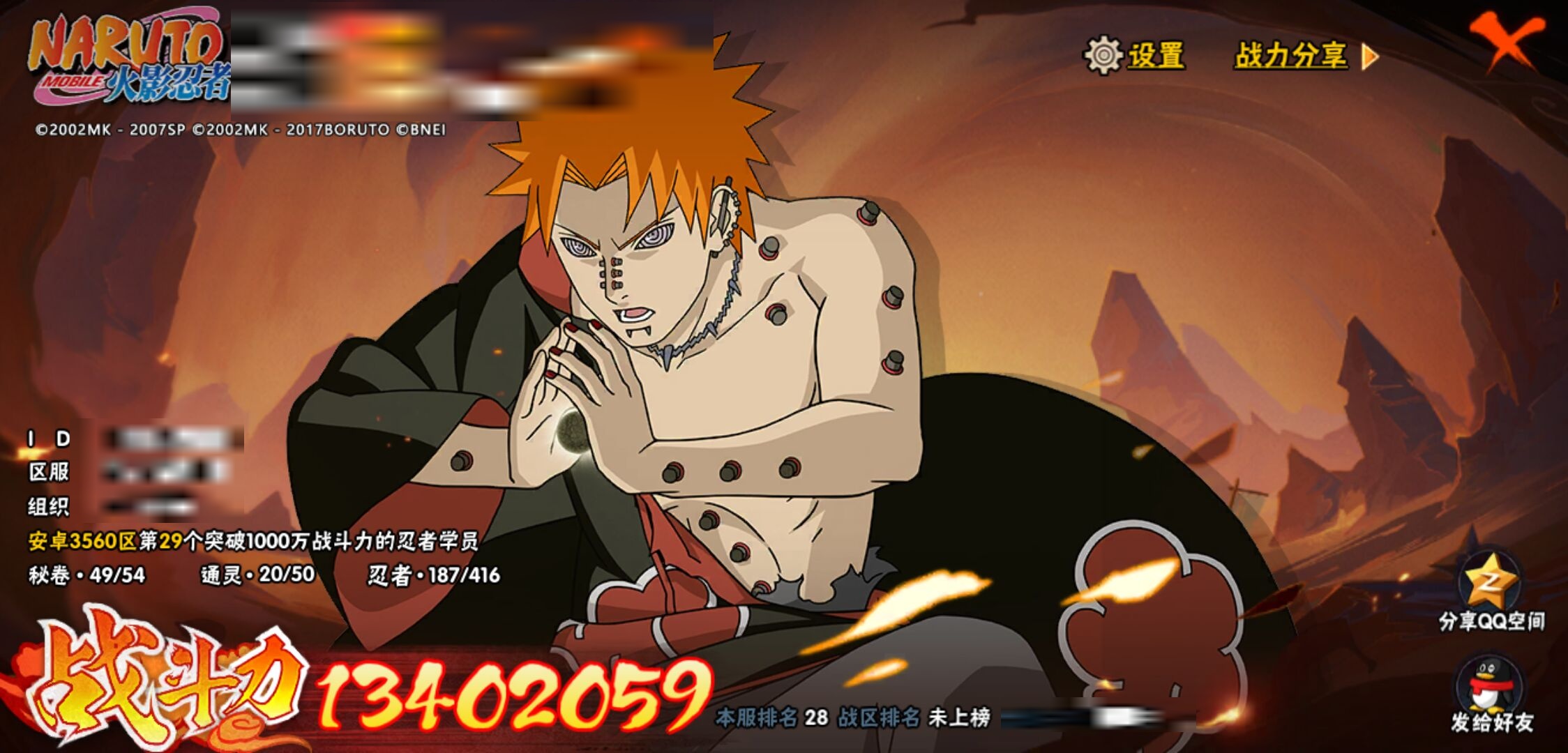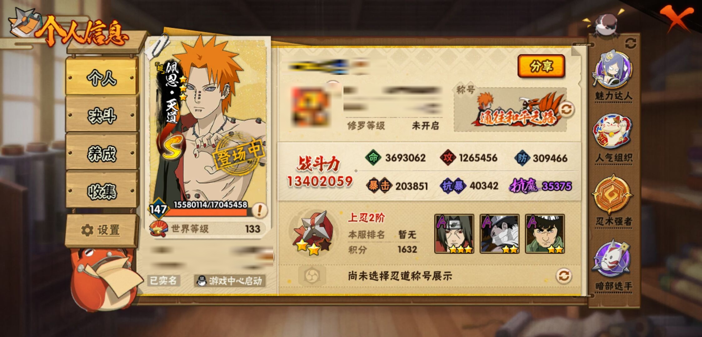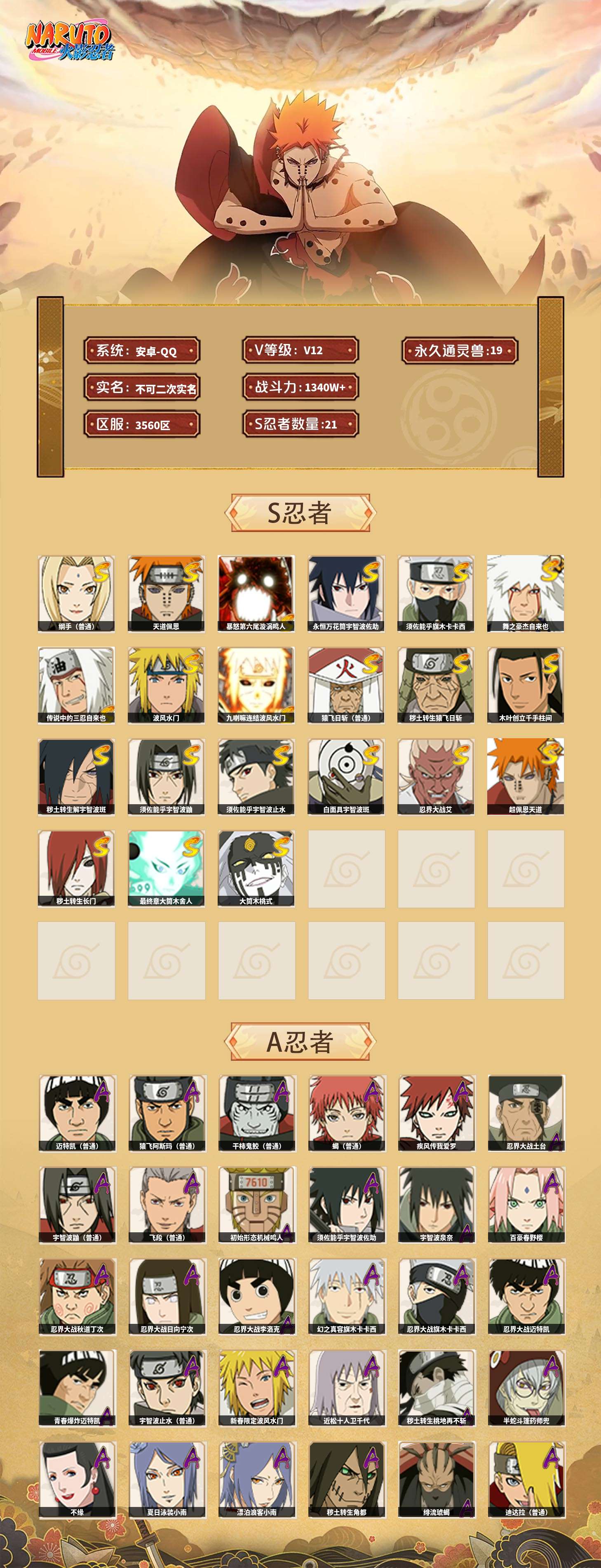 【火影忍者】【lyhy9114】战斗力:1340w;段位:上忍2阶;本服排名:28;vip:v12级;s忍:21个;a忍:38个;通灵兽:19个,s忍:纲手(普通) 4星|天道佩恩 4星|暴怒第六尾漩涡鸣人|永恒万花筒宇智波佐助|须佐能乎旗木卡卡西|舞之豪杰自来也|传说中的三忍自来也|波风水门|九喇嘛连结波风水门|猿飞日斩(普通)|秽土转生猿飞日斩|木叶创立千手柱间|秽土转生解宇智波斑|须佐能乎宇智波鼬|须佐能乎宇智波止水|白面具宇智波斑|忍界大战艾|超佩恩天道|秽土转生长门|最终章大筒木舍人|大筒木桃式__a忍:迈特凯(普通) 5星|猿飞阿斯玛(普通) 5星|干柿鬼鲛(普通) 5星|蝎(普通) 4星|疾风传我爱罗 3星|忍界大战土台 3星|宇智波鼬(普通) 3星|飞段(普通) 3星|初始形态机械鸣人|须佐能乎宇智波佐助|宇智波泉奈|百豪春野樱|忍界大战秋道丁次|忍界大战日向宁次|忍界大战李洛克|幻之真容旗木卡卡西|忍界大战旗木卡卡西|忍界大战迈特凯|青春爆炸迈特凯|宇智波止水(普通)|新春限定波风水门|近松十人卫千代|秽土转生桃地再不斩|半蛇斗篷药师兜|不缘|夏日泳装小南|漂泊浪客小南|秽土转生角都|绯流琥蝎|迪达拉(普通)|死司凭血飞段|恶灵之影飞段|漂泊浪客宇智波带土|侠隐江湖大野木|羁绊神农|六代目水影长十郎|桃式显现漩涡博人|仙人模式巳月__通灵兽:忍犬(普通)|蓝蛇|蛤蟆吉|砂之守鹤|忍龟|镰鼬|猿魔|山椒鱼|蜃|蛤蟆仙人|鲛鲨|蛤蟆健|乌鸦(普通)|蛞蝓(普通)|蛤蟆龙|辛牙|蛤蟆广|梦貘|鹰