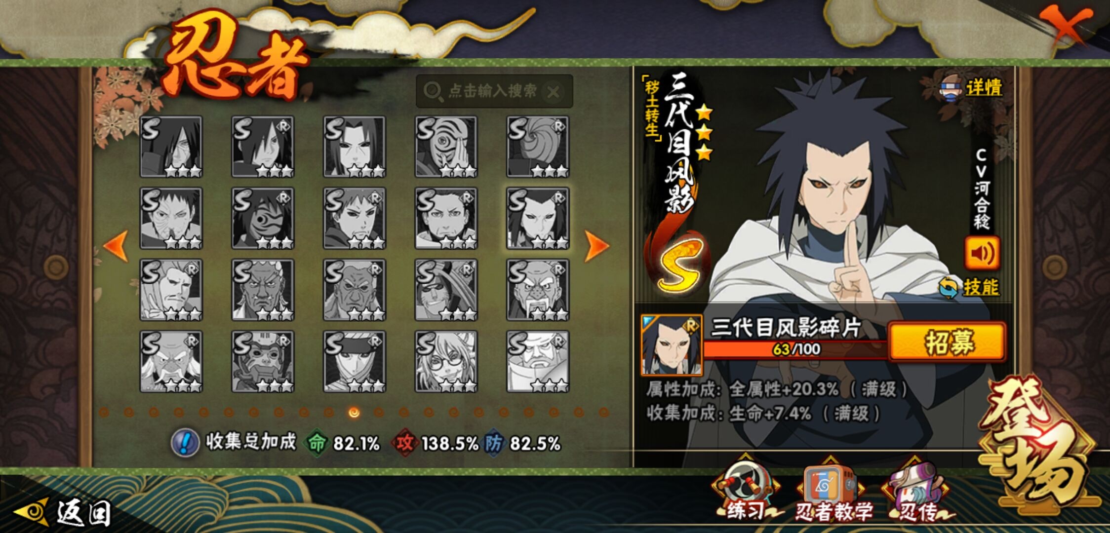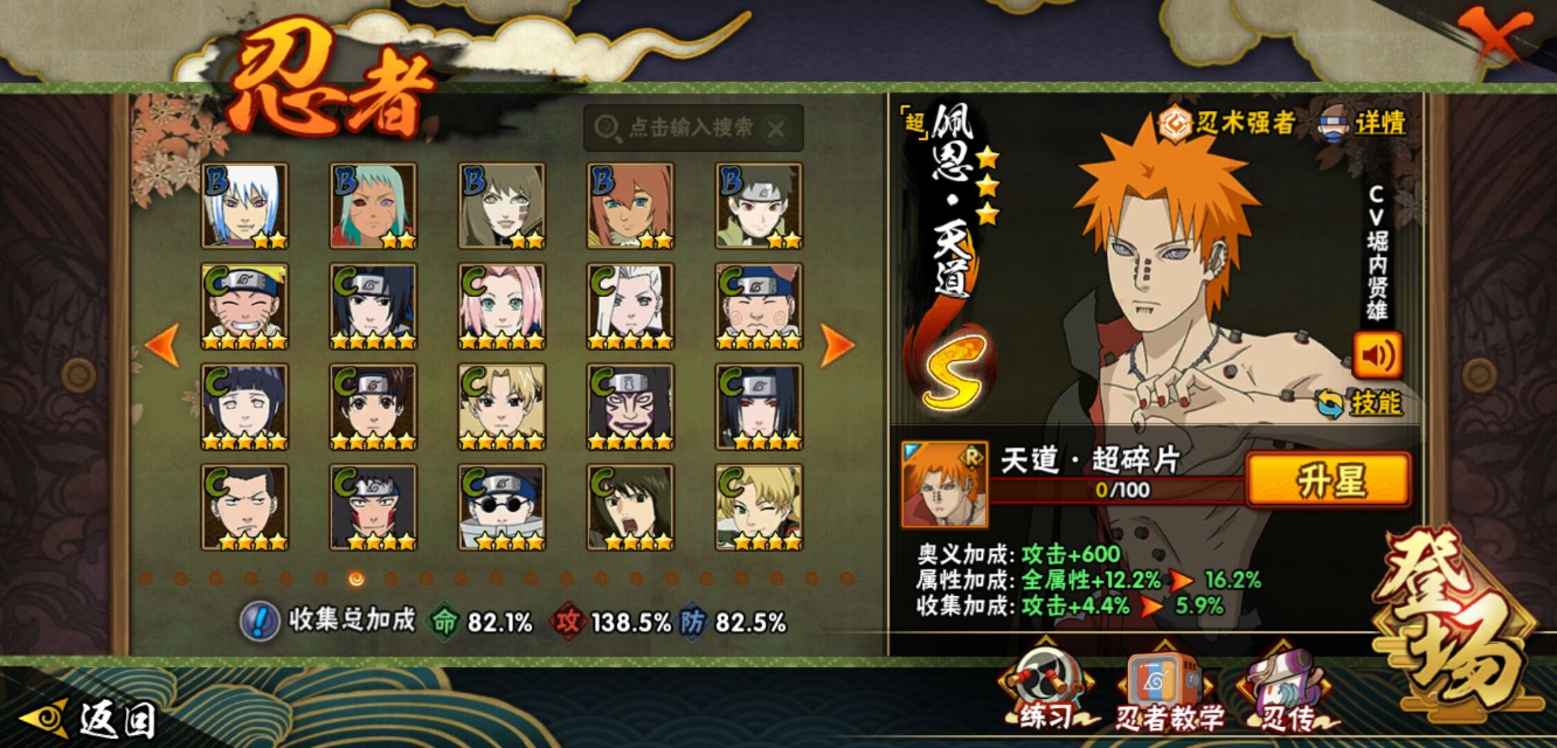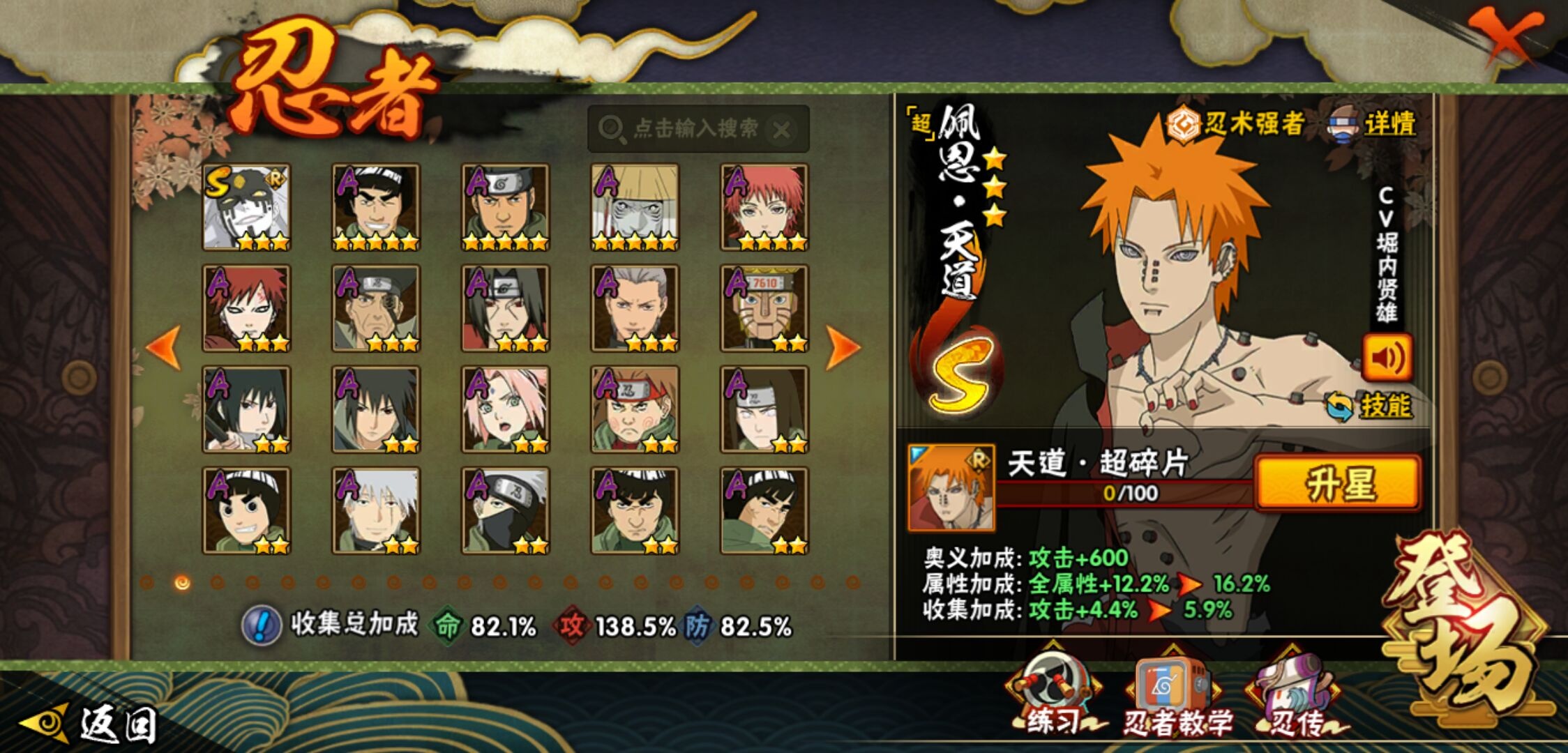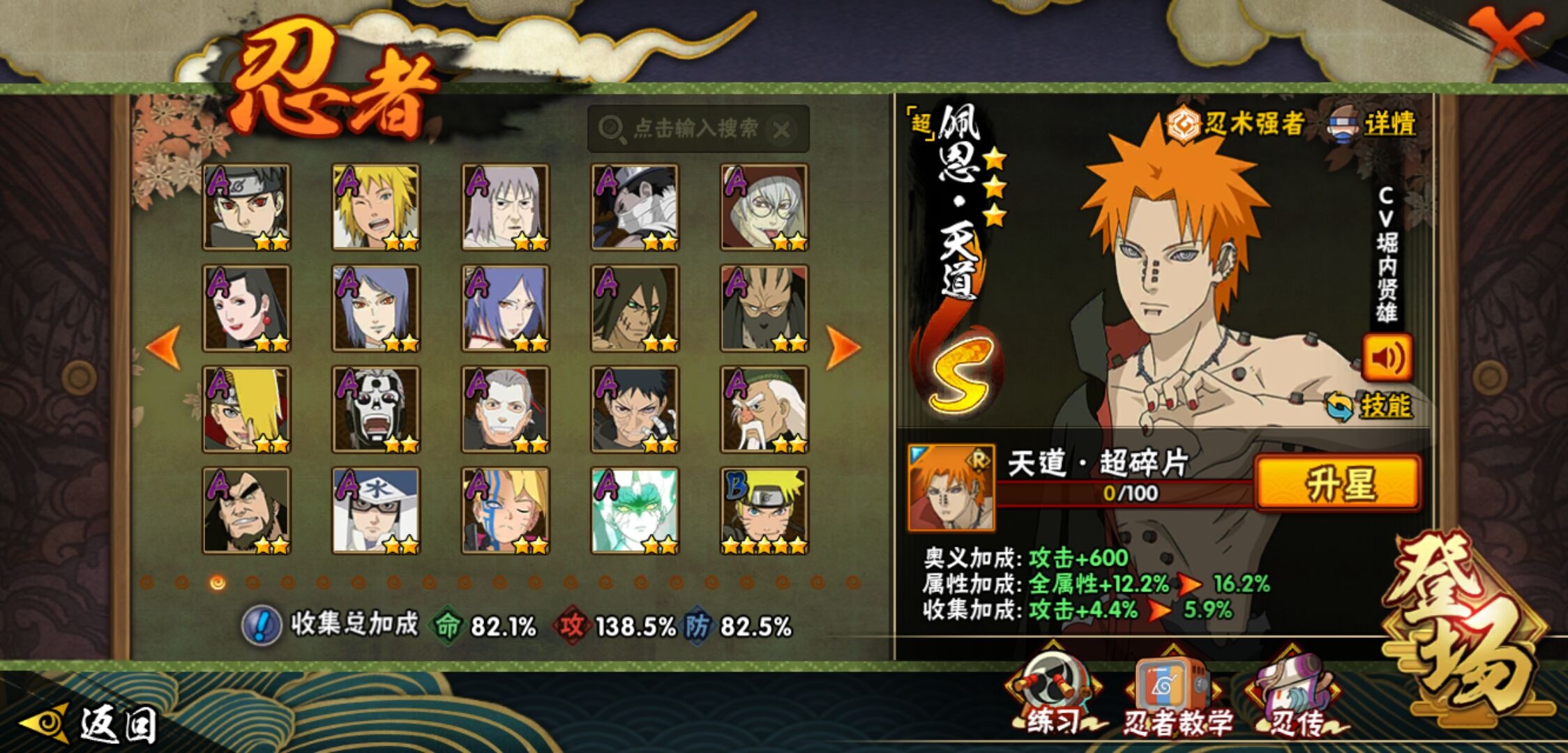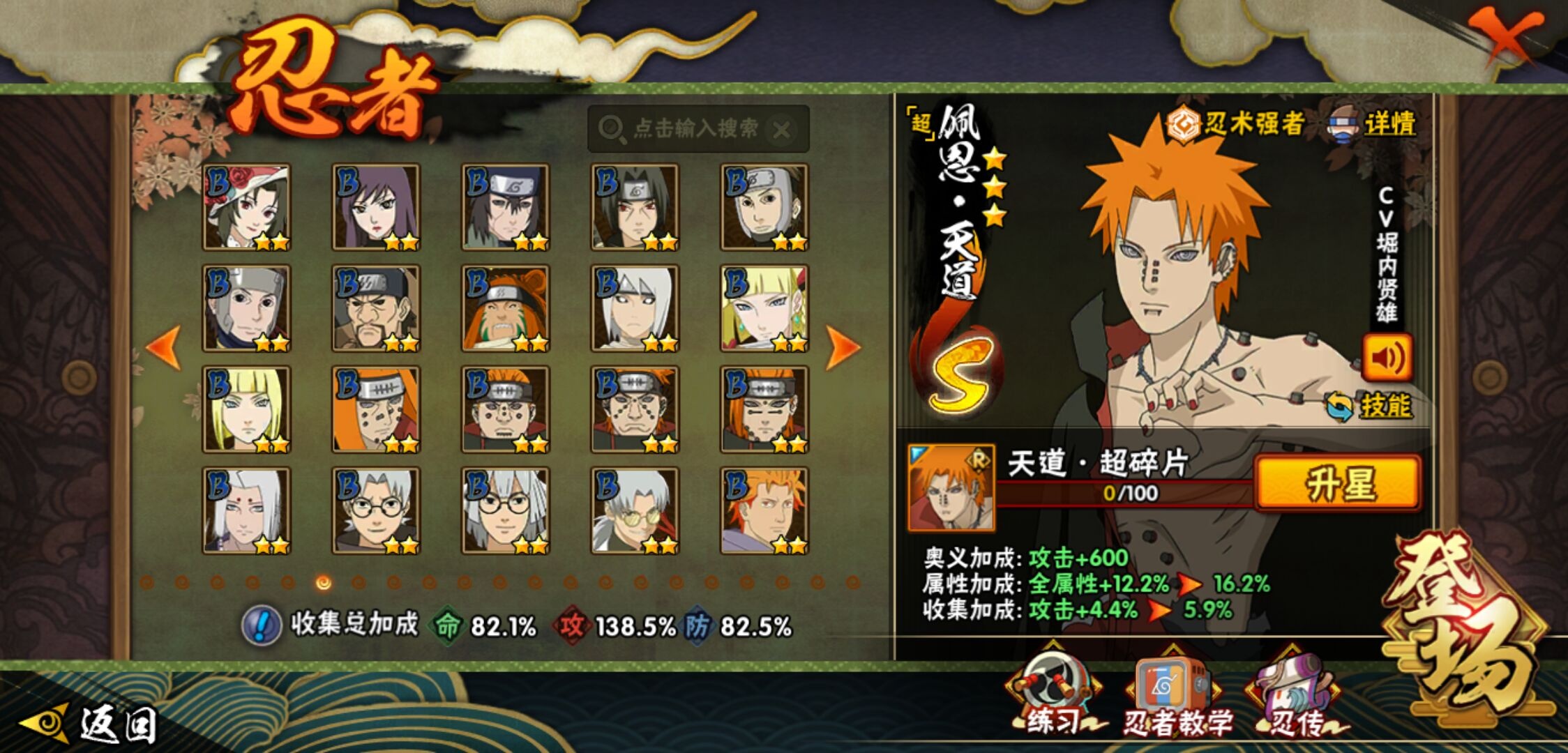 【火影忍者】【lyhy9114】战斗力:1340w;段位:上忍2阶;本服排名:28;vip:v12级;s忍:21个;a忍:38个;通灵兽:19个,s忍:纲手(普通) 4星|天道佩恩 4星|暴怒第六尾漩涡鸣人|永恒万花筒宇智波佐助|须佐能乎旗木卡卡西|舞之豪杰自来也|传说中的三忍自来也|波风水门|九喇嘛连结波风水门|猿飞日斩(普通)|秽土转生猿飞日斩|木叶创立千手柱间|秽土转生解宇智波斑|须佐能乎宇智波鼬|须佐能乎宇智波止水|白面具宇智波斑|忍界大战艾|超佩恩天道|秽土转生长门|最终章大筒木舍人|大筒木桃式__a忍:迈特凯(普通) 5星|猿飞阿斯玛(普通) 5星|干柿鬼鲛(普通) 5星|蝎(普通) 4星|疾风传我爱罗 3星|忍界大战土台 3星|宇智波鼬(普通) 3星|飞段(普通) 3星|初始形态机械鸣人|须佐能乎宇智波佐助|宇智波泉奈|百豪春野樱|忍界大战秋道丁次|忍界大战日向宁次|忍界大战李洛克|幻之真容旗木卡卡西|忍界大战旗木卡卡西|忍界大战迈特凯|青春爆炸迈特凯|宇智波止水(普通)|新春限定波风水门|近松十人卫千代|秽土转生桃地再不斩|半蛇斗篷药师兜|不缘|夏日泳装小南|漂泊浪客小南|秽土转生角都|绯流琥蝎|迪达拉(普通)|死司凭血飞段|恶灵之影飞段|漂泊浪客宇智波带土|侠隐江湖大野木|羁绊神农|六代目水影长十郎|桃式显现漩涡博人|仙人模式巳月__通灵兽:忍犬(普通)|蓝蛇|蛤蟆吉|砂之守鹤|忍龟|镰鼬|猿魔|山椒鱼|蜃|蛤蟆仙人|鲛鲨|蛤蟆健|乌鸦(普通)|蛞蝓(普通)|蛤蟆龙|辛牙|蛤蟆广|梦貘|鹰
