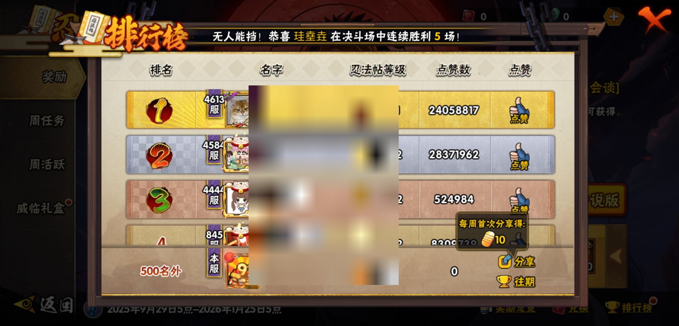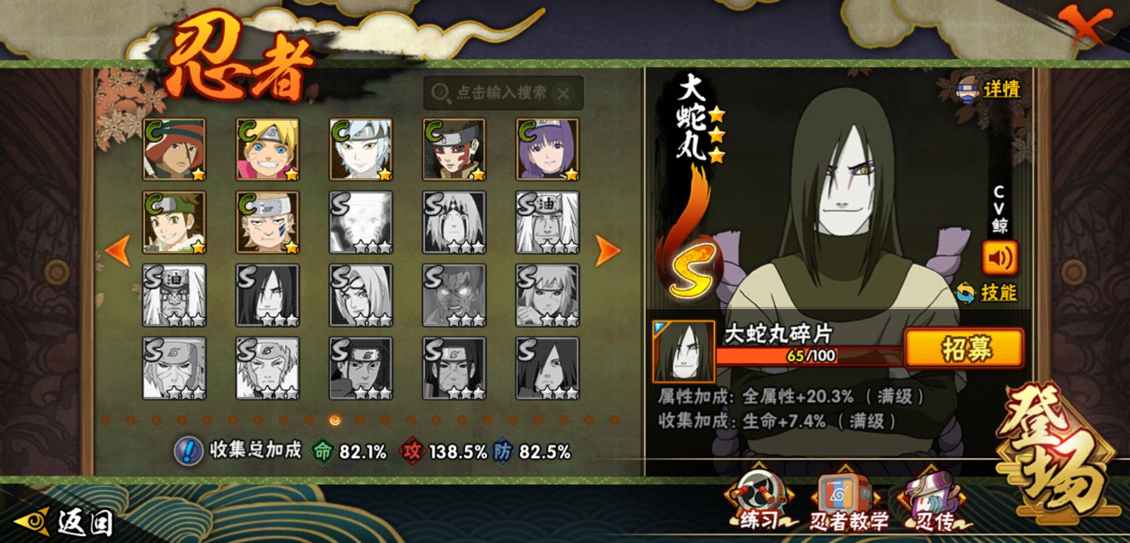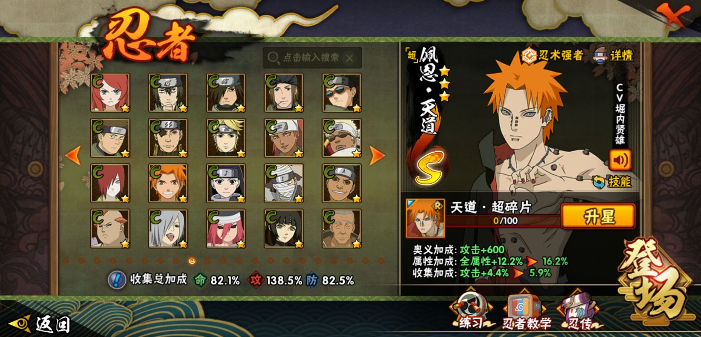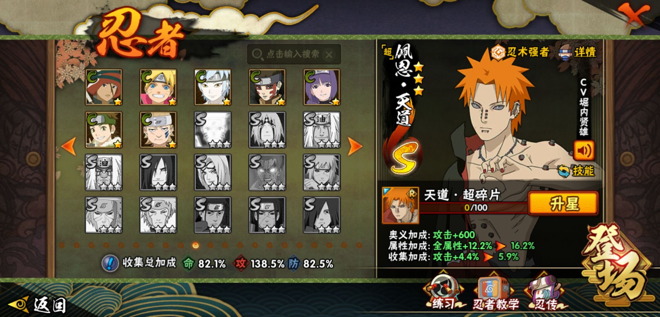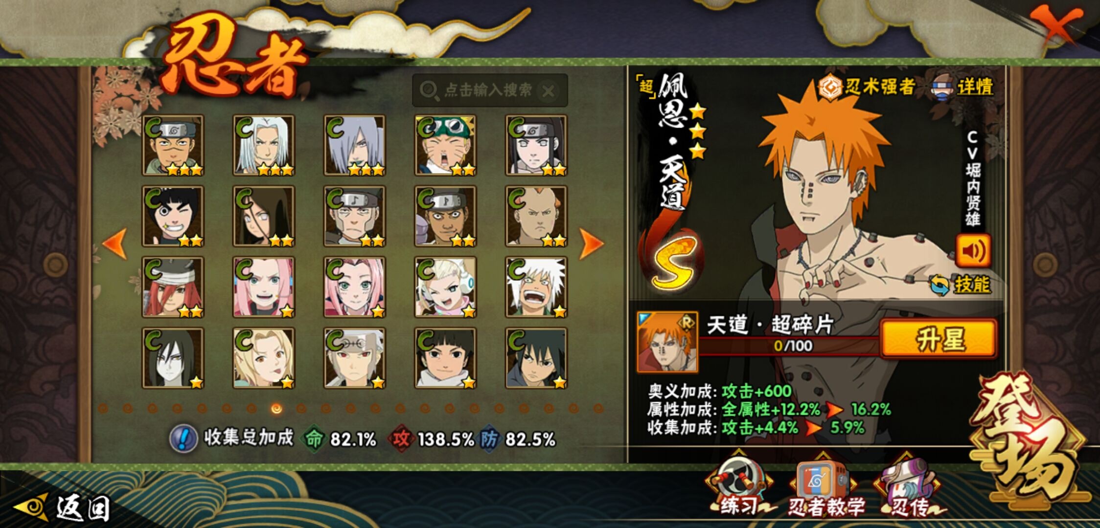 【火影忍者】【lyhy9114】战斗力:1340w;段位:上忍2阶;本服排名:28;vip:v12级;s忍:21个;a忍:38个;通灵兽:19个,s忍:纲手(普通) 4星|天道佩恩 4星|暴怒第六尾漩涡鸣人|永恒万花筒宇智波佐助|须佐能乎旗木卡卡西|舞之豪杰自来也|传说中的三忍自来也|波风水门|九喇嘛连结波风水门|猿飞日斩(普通)|秽土转生猿飞日斩|木叶创立千手柱间|秽土转生解宇智波斑|须佐能乎宇智波鼬|须佐能乎宇智波止水|白面具宇智波斑|忍界大战艾|超佩恩天道|秽土转生长门|最终章大筒木舍人|大筒木桃式__a忍:迈特凯(普通) 5星|猿飞阿斯玛(普通) 5星|干柿鬼鲛(普通) 5星|蝎(普通) 4星|疾风传我爱罗 3星|忍界大战土台 3星|宇智波鼬(普通) 3星|飞段(普通) 3星|初始形态机械鸣人|须佐能乎宇智波佐助|宇智波泉奈|百豪春野樱|忍界大战秋道丁次|忍界大战日向宁次|忍界大战李洛克|幻之真容旗木卡卡西|忍界大战旗木卡卡西|忍界大战迈特凯|青春爆炸迈特凯|宇智波止水(普通)|新春限定波风水门|近松十人卫千代|秽土转生桃地再不斩|半蛇斗篷药师兜|不缘|夏日泳装小南|漂泊浪客小南|秽土转生角都|绯流琥蝎|迪达拉(普通)|死司凭血飞段|恶灵之影飞段|漂泊浪客宇智波带土|侠隐江湖大野木|羁绊神农|六代目水影长十郎|桃式显现漩涡博人|仙人模式巳月__通灵兽:忍犬(普通)|蓝蛇|蛤蟆吉|砂之守鹤|忍龟|镰鼬|猿魔|山椒鱼|蜃|蛤蟆仙人|鲛鲨|蛤蟆健|乌鸦(普通)|蛞蝓(普通)|蛤蟆龙|辛牙|蛤蟆广|梦貘|鹰