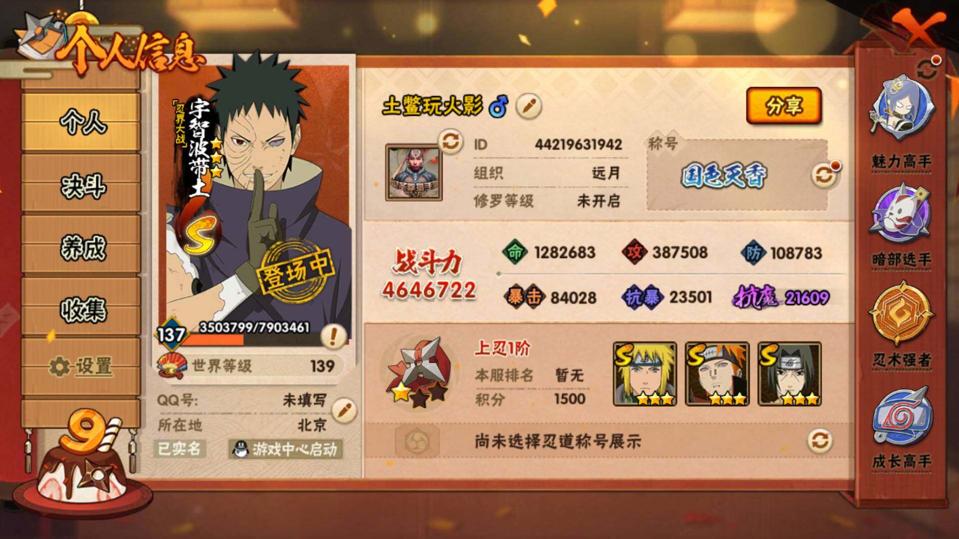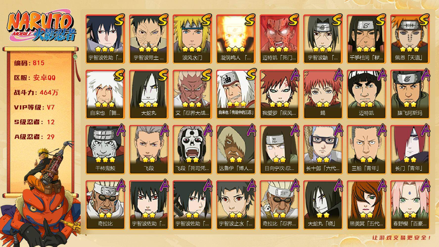 [14443790]v7 12s 29a 464玩战力 有熊猫 zp3285 【s级忍者】:千手柱间「秽土转生」3星,宇智波带土「忍界大战」3星,艾「忍界大战」3星,宇智波鼬「须佐能乎」3星,自来也「舞之豪杰」3星,大蛇丸3星,自来也「传说中的三忍」3星,波风水门3星,漩涡鸣人「九喇嘛连结」3星,迈特凯「死门」3星,佩恩「天道」3星,宇智波佐助「永恒万花筒」3星 【a级忍者】:三船「青年」2星,长门「青年」2星,达鲁伊「博人传」2星,大蛇丸「晓」2星,奇拉比2星,奇拉比「忍界大战」2星,飞段2星,飞段「死司凭血」2星,干柿鬼鲛3星,漩涡博人「桃式显现」2星,迈特凯2星,旗木卡卡西「幻之真容」2星,桃地再不斩「秽土转生」2星,我爱罗「疾风传」3星,蝎2星,猿飞阿斯玛2星,宇智波止水「新春限定」2星,宇智波佐助「须佐能乎」2星,宇智波佐助「万花筒写轮眼」2星,照美冥「五代目水影」2星,日向宁次「忍界大战」2星,日向雏田「最终章」2星,长十郎「六代目水影」2星,李洛克「忍界大战」2星,春野樱「百豪」2星,秋道丁次「忍界大战」2星,千代「近松十人卫」2星,宇智波泉奈2星,大野木「侠隐江湖」2星