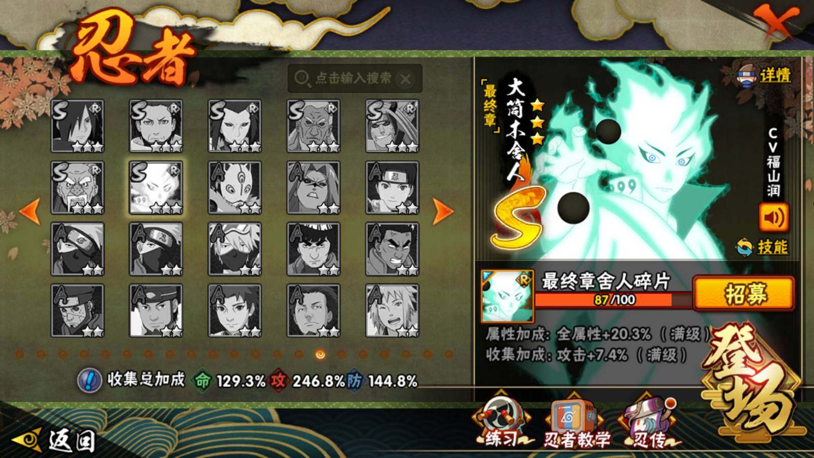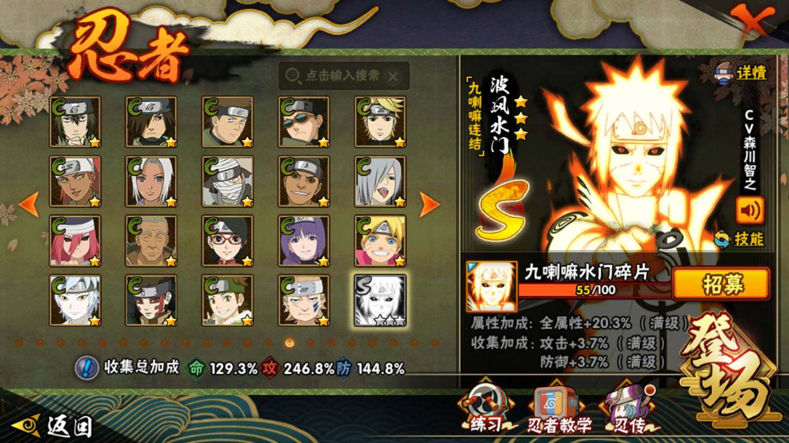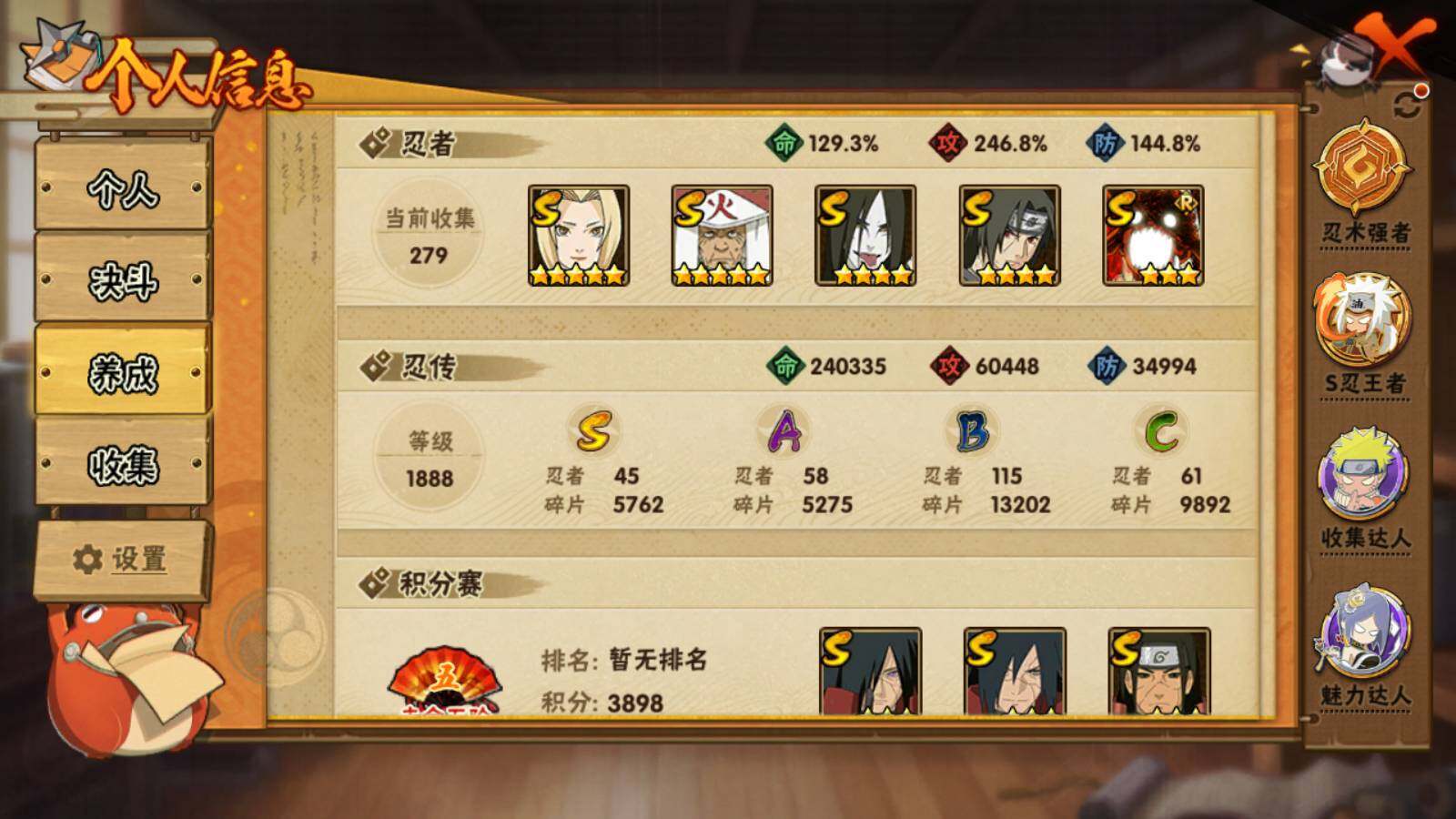 [14448636]v12 1924万战力 45s级忍者数-58a级忍者数 九喇嘛水门55片 最终章舍人87片 1885点券 sr4074 【s级忍者】:长门「秽土转生」3星,半藏「秽土转生」3星,猿飞日斩「秽土转生」3星,波风水门「秽土转生」3星,千手扉间「秽土转生」3星,千手柱间「秽土转生」3星,宇智波鼬「秽土转生」3星,宇智波斑「秽土转生」3星,宇智波斑「秽土转生·解」3星,大野木「忍界大战」3星,春野樱「忍界大战」3星,宇智波带土「忍界大战」3星,艾「忍界大战」3星,宇智波鼬「须佐能乎」4星,宇智波止水「须佐能乎」3星,旗木卡卡西「须佐能乎」3星,千手柱间「木叶创立」3星,无「二代目土影」3星,艾「四代目雷影」3星,罗砂「四代目风影」3星,鬼灯幻月「二代目水影」3星,自来也3星,自来也「仙人模式」3星,自来也「舞之豪杰」3星,大蛇丸4星,自来也「传说中的三忍」3星,纲手5星,纲手「百豪」3星,千手柱间3星,千手扉间3星,猿飞日斩5星,宇智波斑3星,波风水门3星,药师兜「仙人模式」3星,神秘面具男3星,神秘面具男「红夜之刃」3星,漩涡鸣人「九喇嘛连结」3星,迈特凯「死门」3星,佩恩「天道」3星,佩恩·天道「超」3星,宇智波佐助「永恒万花筒」3星,宇智波斑 「白面具」3星宇智波斑「白面具」,大筒木金式3星,大筒木桃式3星,漩涡鸣人「暴怒·第六尾」3星 【a级忍者】:艾「青年」2星,长门「青年」2星,波风水门「青年」2星,达鲁伊「博人传」2星,迪达拉2星,迪达拉「秽土转生」2星,大蛇丸「晓」2星,奇拉比2星,奇拉比「忍界大战」2星,飞段4星,飞段「死司凭血」5星,干柿鬼鲛5星,漩涡博人「桃式显现」2星,漩涡鸣人「仙人模式」2星,漩涡鸣人「九尾查克拉」2星,迈特凯5星,旗木卡卡西「万花筒写轮眼」2星,旗木卡卡西「幻之真容」2星,桃地再不斩「秽土转生」2星,我爱罗「疾风传」4星,我爱罗「忍界大战」2星,蝎5星,蝎「绯流琥」2星,小南2星,小南「夏日泳装」2星,小南「漂泊浪客」2星,角都「秽土转生」2