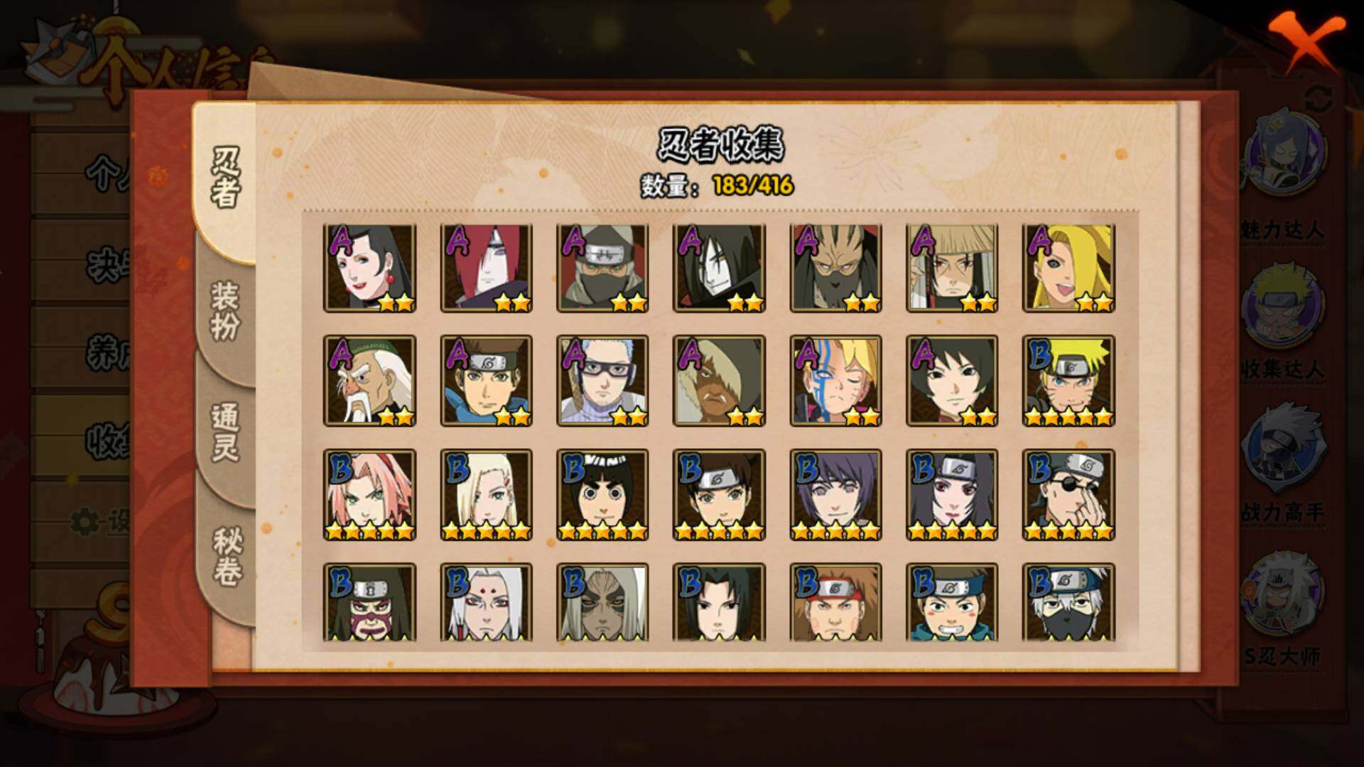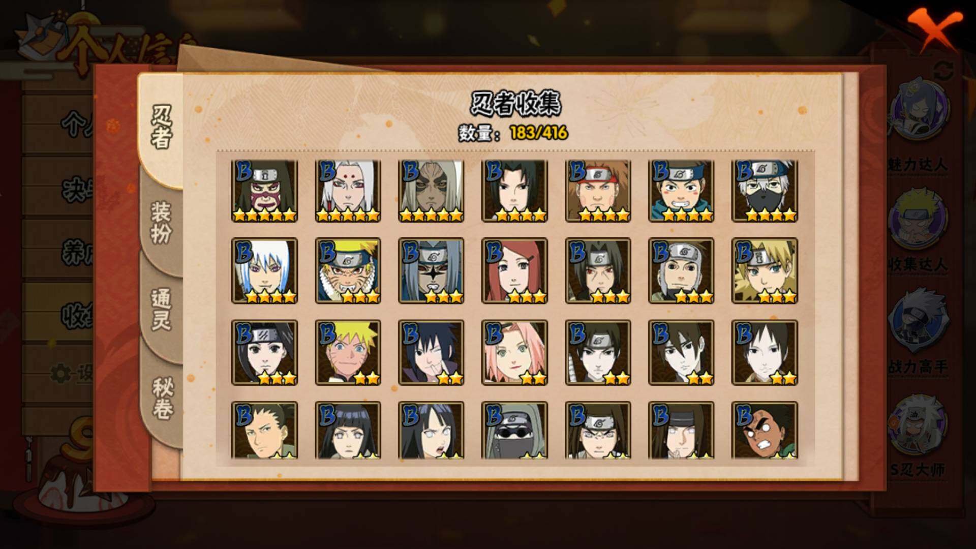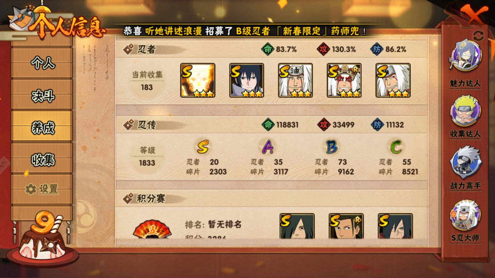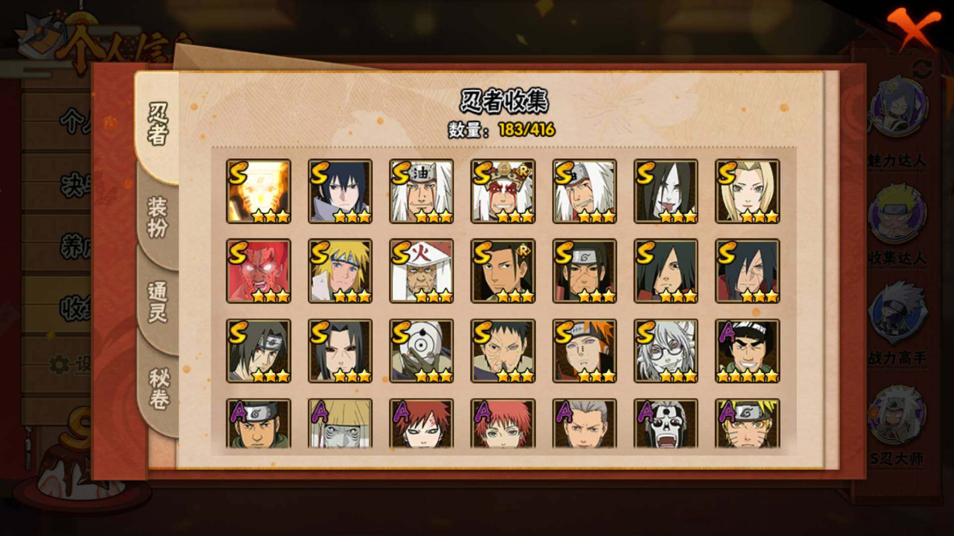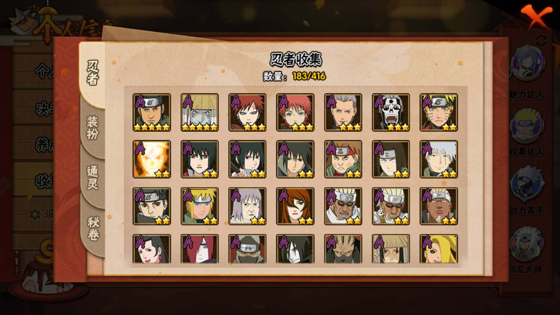 [14454220]v7 959万战力 20s-35a tt1527 【s级忍者】:千手柱间「秽土转生」3星,宇智波鼬「秽土转生」3星,宇智波斑「秽土转生·解」3星,宇智波带土「忍界大战」3星,宇智波鼬「须佐能乎」3星,千手柱间「木叶创立」3星,自来也3星,自来也「舞之豪杰」3星,大蛇丸3星,自来也「传说中的三忍」3星,纲手3星,猿飞日斩3星,宇智波斑3星,波风水门3星,药师兜「仙人模式」3星,漩涡鸣人「九喇嘛连结」3星,迈特凯「死门」3星,佩恩「天道」3星,宇智波佐助「永恒万花筒」3星,宇智波斑 「白面具」3星宇智波斑「白面具」 【a级忍者】:艾「青年」2星,长门「青年」2星,波风水门「青年」2星,达鲁伊「博人传」2星,迪达拉「秽土转生」2星,大蛇丸「晓」2星,奇拉比2星,奇拉比「忍界大战」2星,飞段3星,飞段「死司凭血」3星,干柿鬼鲛5星,漩涡博人「桃式显现」2星,漩涡鸣人「仙人模式」2星,漩涡鸣人「九尾查克拉」2星,迈特凯5星,旗木卡卡西「幻之真容」2星,我爱罗「疾风传」3星,蝎3星,蝎「绯流琥」2星,角都2星,猿飞阿斯玛5星,宇智波止水2星,宇智波鼬2星,宇智波佐助「须佐能乎」2星,宇智波佐助「万花筒写轮眼」2星,照美冥「五代目水影」2星,日向宁次「忍界大战」2星,长十郎「六代目水影」2星,猿飞木叶丸「博人传」2星,黑土「博人传」2星,秋道丁次「忍界大战」2星,千代「近松十人卫」2星,不缘2星,宇智波泉奈2星,大野木「侠隐江湖」2星