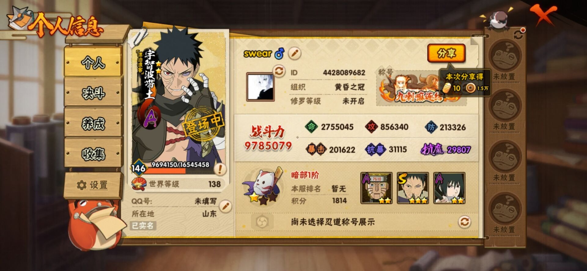 [14455723]v7 14s忍 33a忍 16通灵 978.5w战力 可二次 可修改实名 【s级忍者】:艾「忍界大战」宇智波佐助「永恒万花筒」漩涡鸣人 「九喇嘛连结」宇智波带土 「忍界大战」自来也 「舞之豪杰」大筒木舍人 「最终章」波风水门「九喇嘛连结」宇智波鼬「秽土转生」猿飞日斩「秽土转生」宇智波鼬 「须佐能乎」佩恩「天道」波风水门大蛇丸自来也