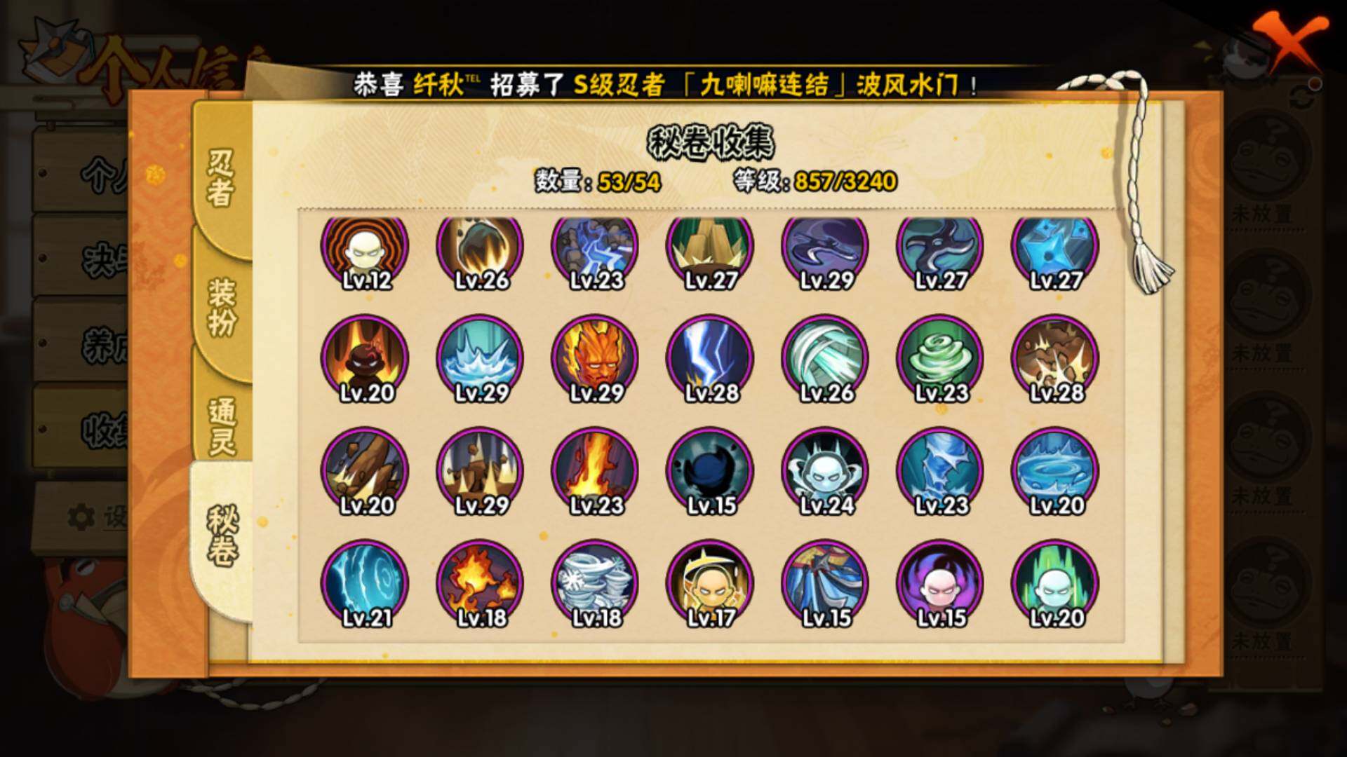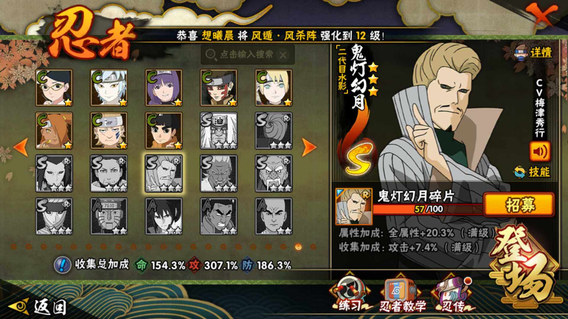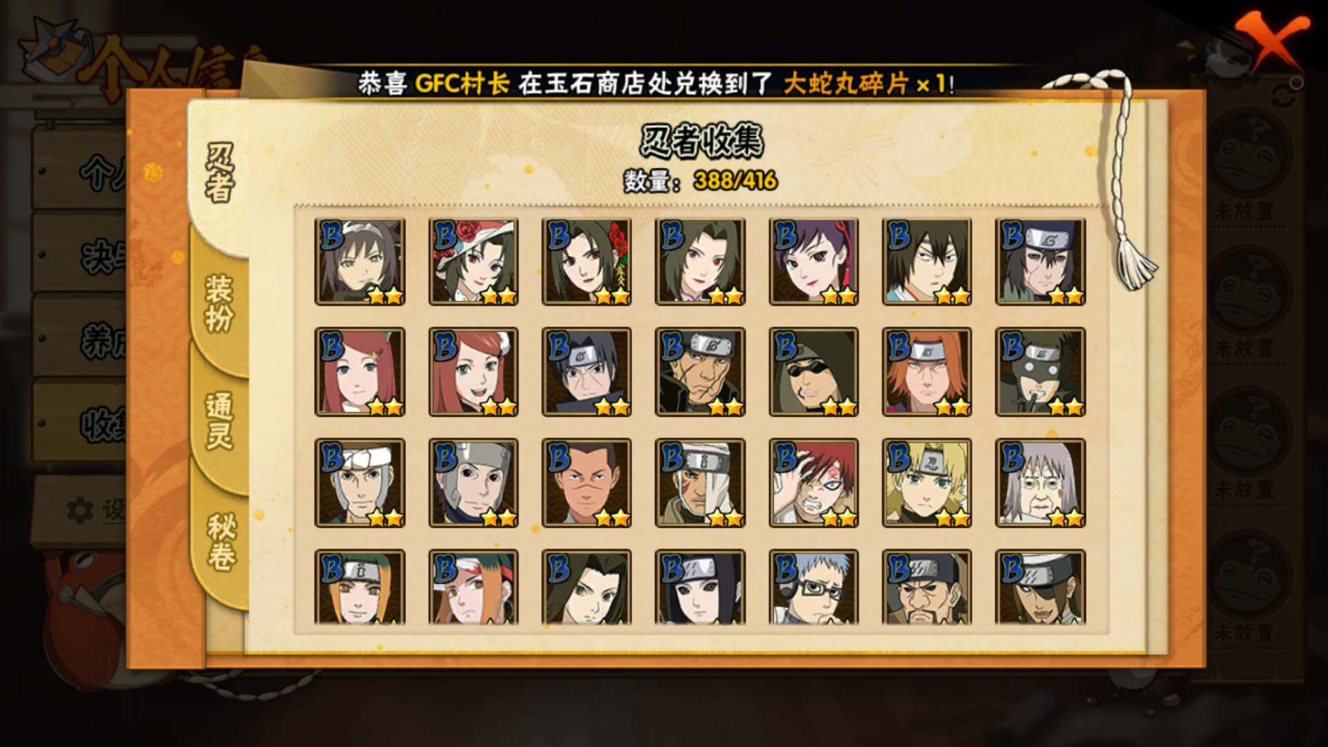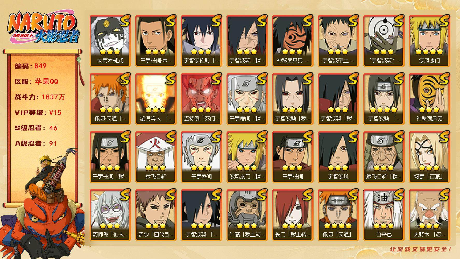 [14456307]v15 1837万战力 46s-91a 有7个传承奥义图 金币1.27万 有熊猫 鬼灯幻月57片 tt1531 【s级忍者】:长门「秽土转生」3星,半藏「秽土转生」3星,金角·银角「秽土转生」3星,猿飞日斩「秽土转生」3星,波风水门「秽土转生」3星,千手扉间「秽土转生」3星,千手柱间「秽土转生」3星,宇智波鼬「秽土转生」3星,宇智波斑「秽土转生」3星,宇智波斑「秽土转生·解」3星,大野木「忍界大战」3星,春野樱「忍界大战」3星,宇智波带土「忍界大战」3星,宇智波鼬「须佐能乎」4星,宇智波止水「须佐能乎」3星,旗木卡卡西「须佐能乎」3星,宇智波斑「木叶创立」3星,千手柱间「木叶创立」3星,艾「四代目雷影」3星,罗砂「四代目风影」3星,艾「三代目雷影」3星,自来也3星,自来也「舞之豪杰」3星,大蛇丸4星,自来也「传说中的三忍」3星,纲手3星,纲手「百豪」3星,千手柱间3星,千手扉间3星,猿飞日斩3星,宇智波斑3星,波风水门4星,药师兜「仙人模式」3星,神秘面具男3星,神秘面具男「红夜之刃」3星,漩涡鸣人「九喇嘛连结」3星,迈特凯「死门」3星,佩恩「天道」4星,佩恩·天道「超」3星,宇智波佐助「永恒万花筒」3星,宇智波斑 「白面具」3星宇智波斑「白面具」,大筒木金式3星,大筒木桃式3星,大筒木舍人「最终章」3星,漩涡鸣人「暴怒·第六尾」3星,波风水门「九喇嘛连结」3星 【a级忍者】:艾「青年」2星,三船「青年」2星,长门「青年」2星,波风水门「青年」2星,波风水门「新春限定」2星,达鲁伊「博人传」2星,达鲁伊2星,迪达拉2星,迪达拉「新春限定」2星,迪达拉「秽土转生」2星,大蛇丸「晓」2星,奇拉比2星,奇拉比「忍界大战」2星,飞段5星,飞段「死司凭血」4星,飞段「恶灵之影」2星,干柿鬼鲛5星,干柿鬼鲛「鲛肌融合」2星,漩涡博人「桃式显现」2星,漩涡鸣人「仙人模式」2星,漩涡鸣人「九尾查克拉」2星,迈特凯5星,迈特凯「忍界大战」2星,旗木卡卡西3星,旗木卡卡西「忍界大战」2星,旗木卡卡西「元