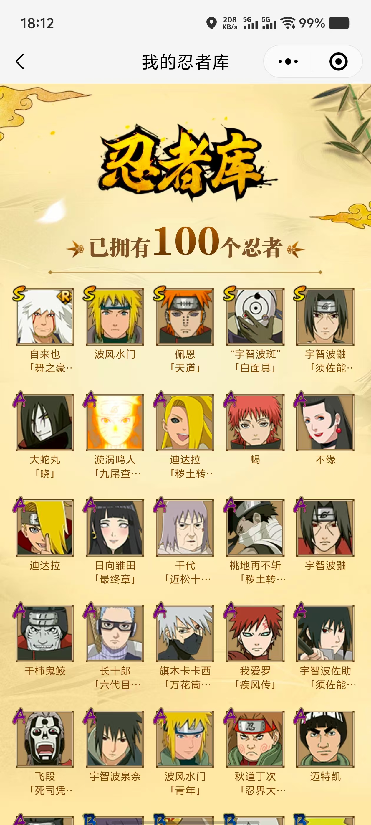 2156312-5s忍/21a忍/战力313w/v5/区服3380 【s忍者】 自来也「舞之豪杰」,宇智波斑「白面具」,宇智波鼬「须佐能乎」,佩恩「天道」,波风水门, 【a忍者】 长十郎「六代目水影」,不缘,日向雏田「最终章」,宇智波泉奈,桃地再不斩「秽土转生」,波风水门「青年」,宇智波佐助「须佐能乎」,迪达拉「秽土转生」,漩涡鸣人「九尾查克拉」,千代「近松十人卫」,秋道丁次「忍界大战」,大