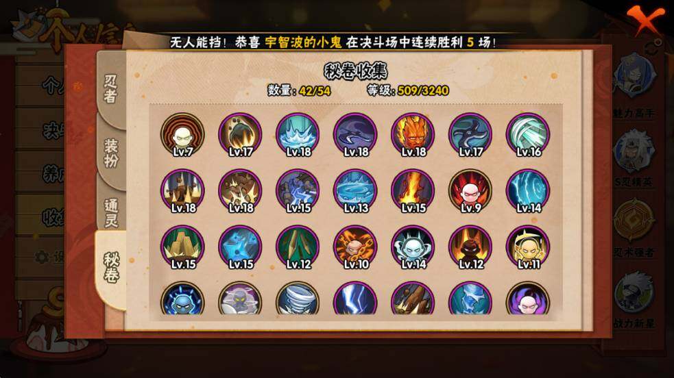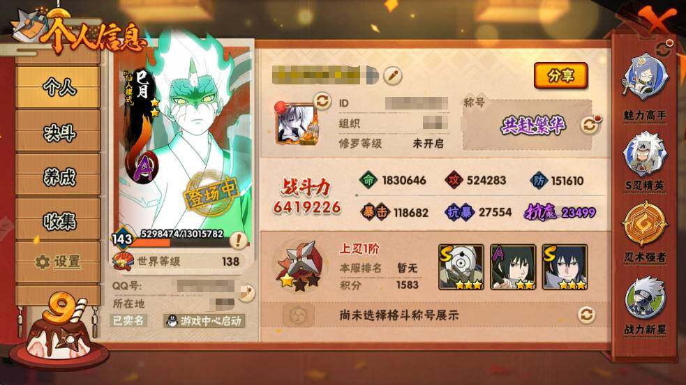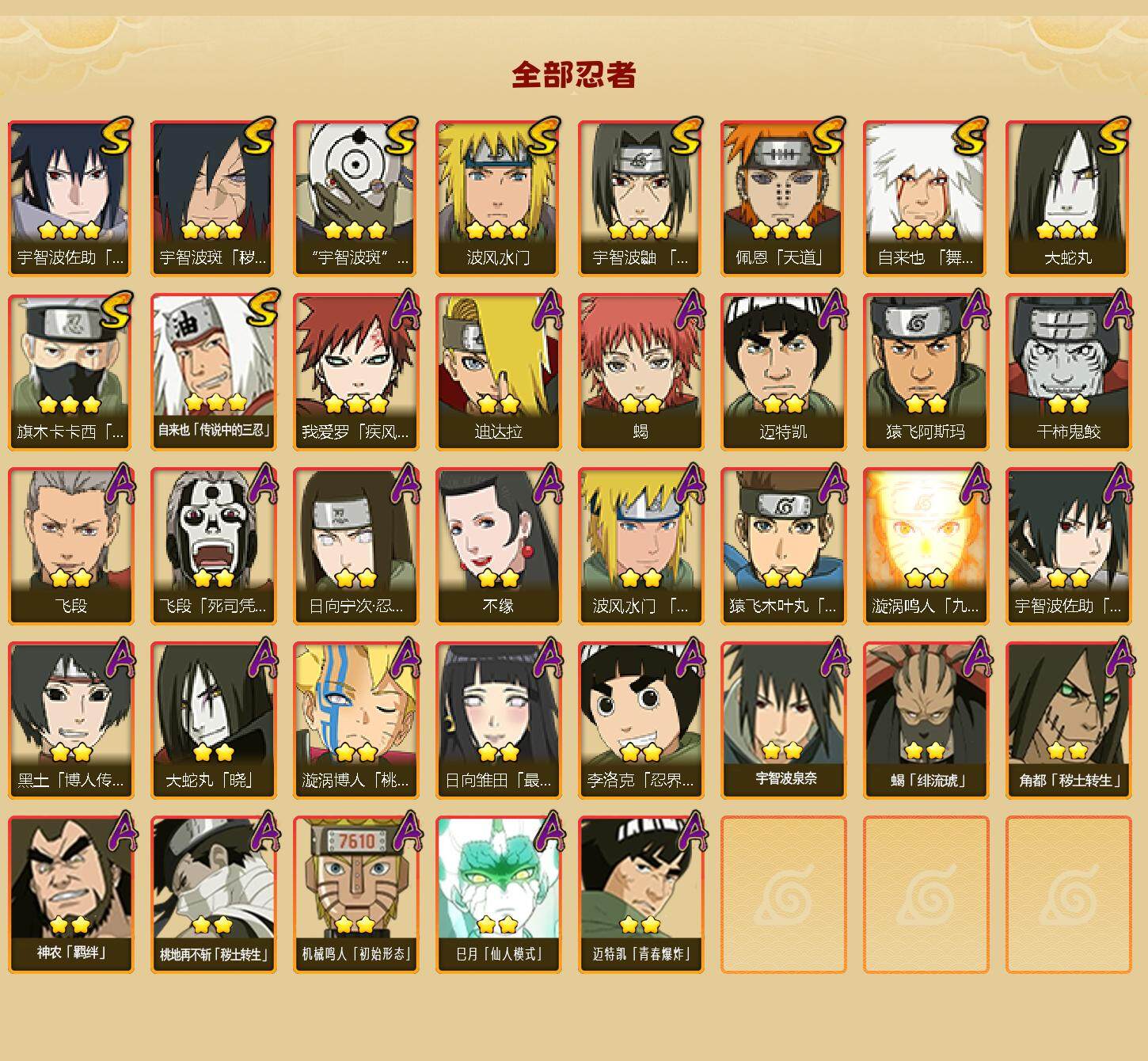 【hyyh735】v5/战力641w/s忍10/a忍27/日向宁次「忍界大战」/死司飞段/永恒万花筒佐助/须佐能乎旗木卡卡西/凯/蝎/佩恩/波风水门/秽土角都/博人桃式显现/3星我爱罗「疾风传」/忍战小李/青年水门/蝎「绯流琥」/豪杰自来也/2星桃地再不斩「秽土转生」/白面具/自来也「传说中的三忍」/博人传黑土/日向雏田「最终章」/飞段/神农「羁绊」/猿飞阿斯玛/宇智波泉奈/迪达拉/2星巳月「